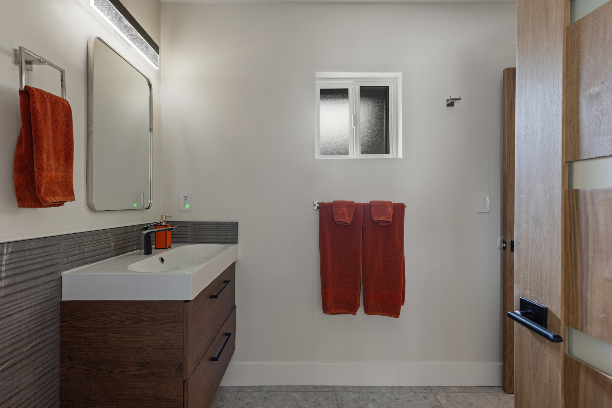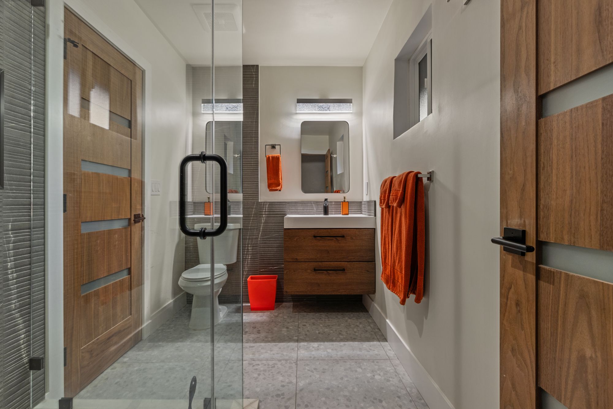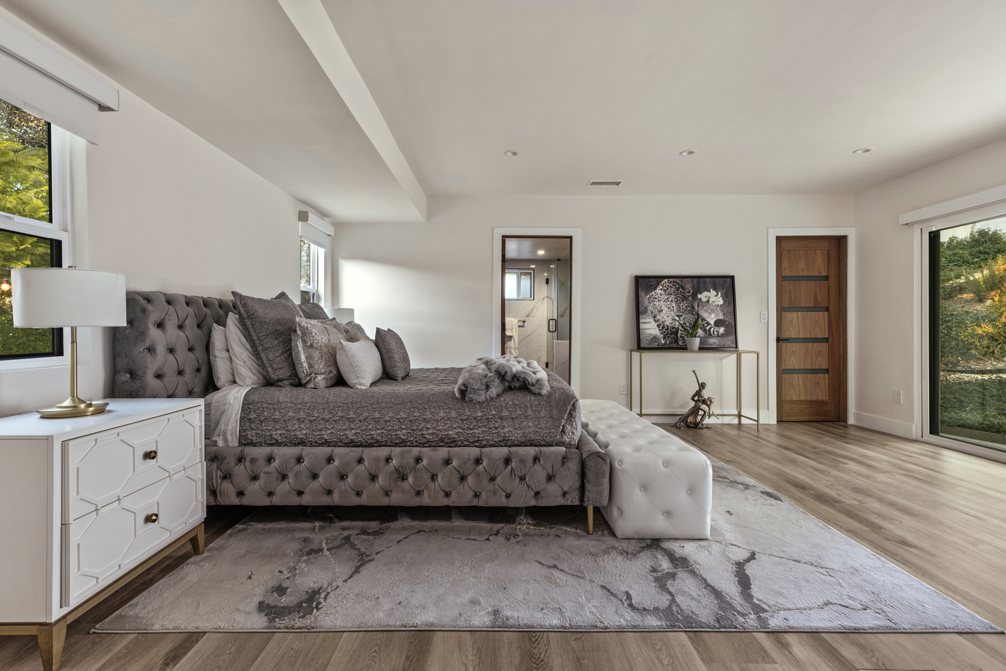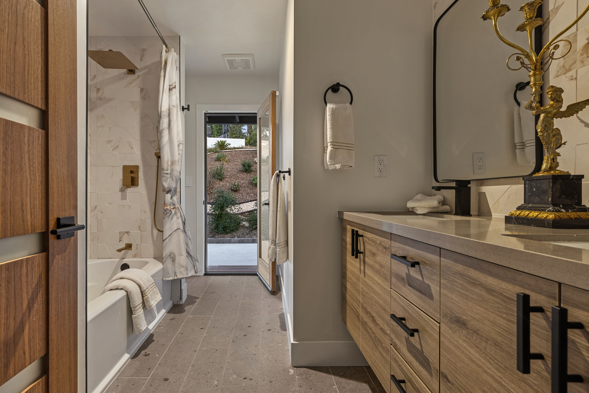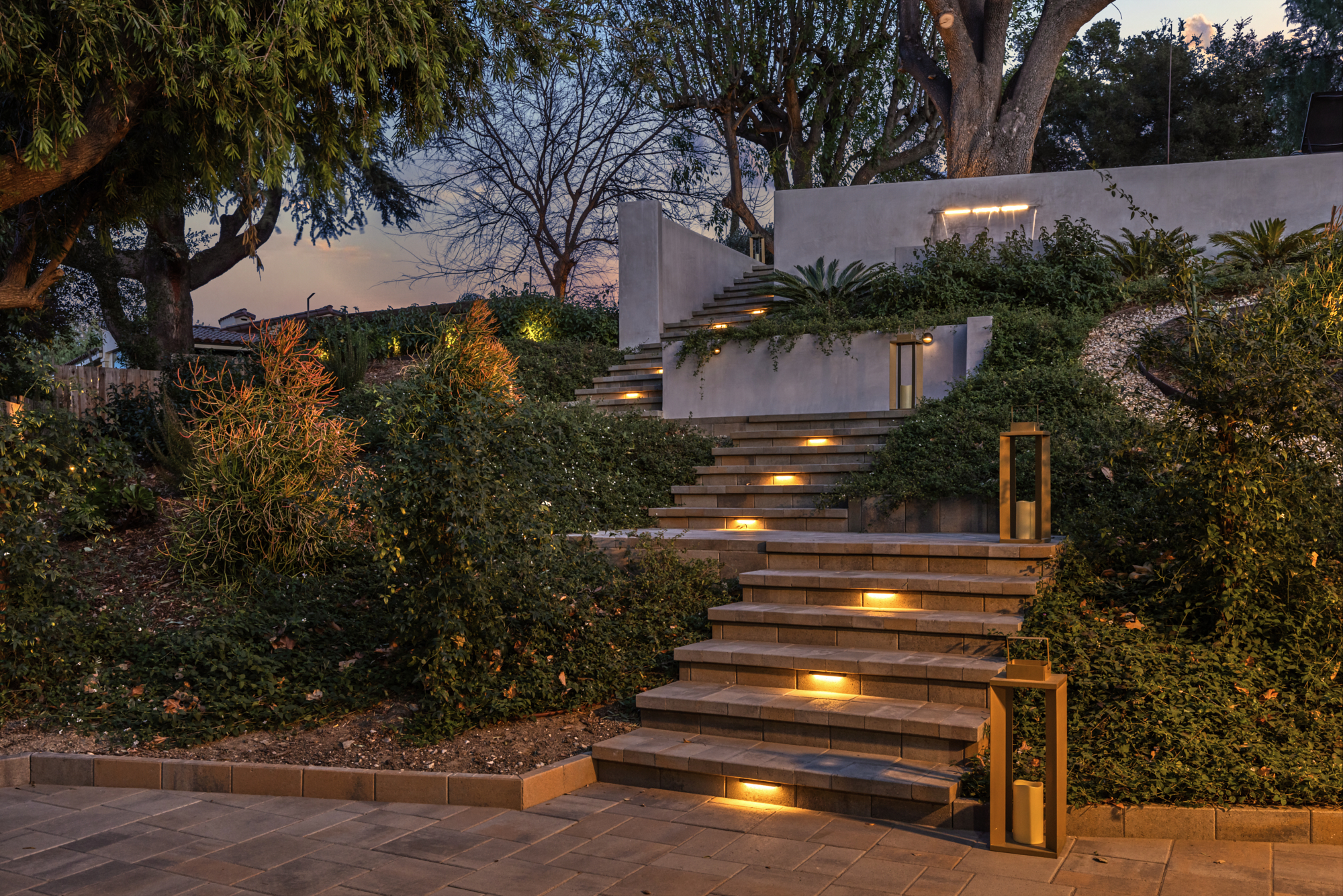 This exceptional single-story mid-century modern home in Woodland Hills sits on over half an acre along coveted Natoma Ave., where the street meets scenic hiking trails and the elevated setting provides privacy along with sweeping views of the hills and valley. Inside, double doors open to sun-filled spaces enhanced by expansive windows and skylights, leading to an open-concept living area designed for both style and comfort. The chef's kitchen features high-end appliances, a generous waterfall island, and refined finishes, flowing seamlessly into the living and dining areas anchored by a custom wine bar. The spacious primary suite offers a peaceful retreat with a walk-in closet and spa-like bath, while three versatile secondary bedrooms capture natural light and beautiful views. Outside, the resort-like backyard becomes an unforgettable highlight, complete with a sparkling pool, cascading waterfalls, ample lounging and gathering zones, multiple vantage points, a fire pit, bocce court, and lush landscaping is an ideal setting for effortless indoor-outdoor living and memorable entertaining.