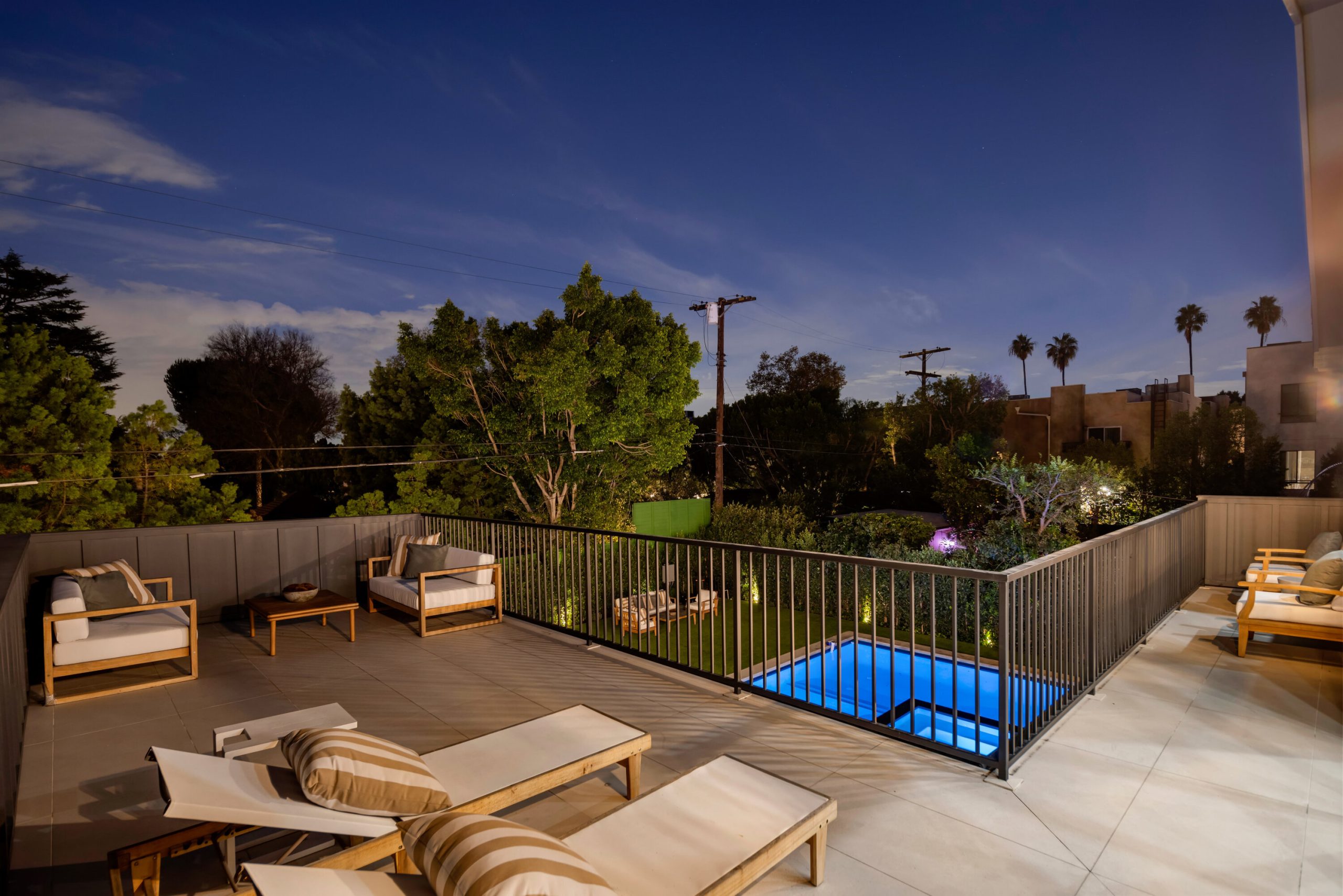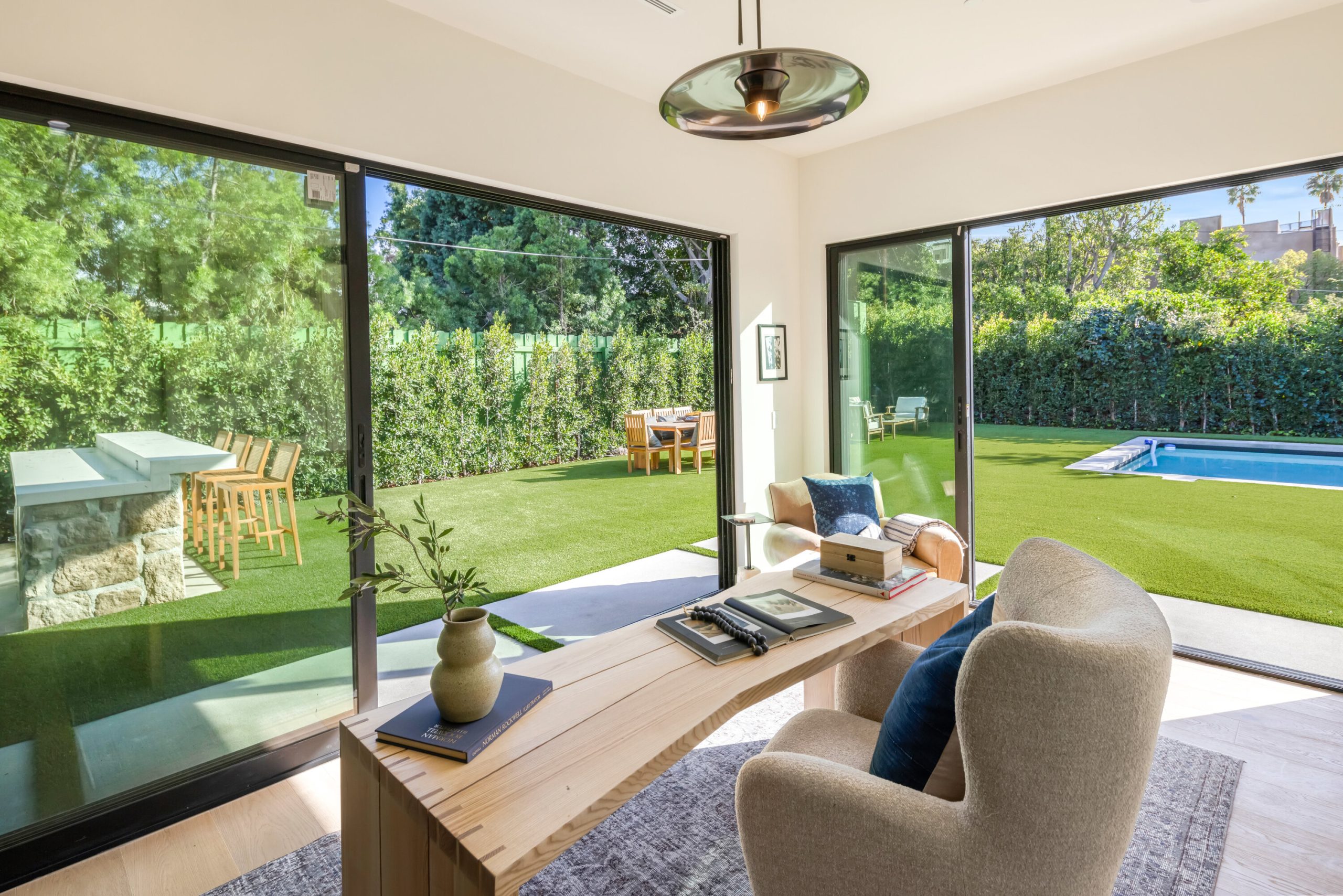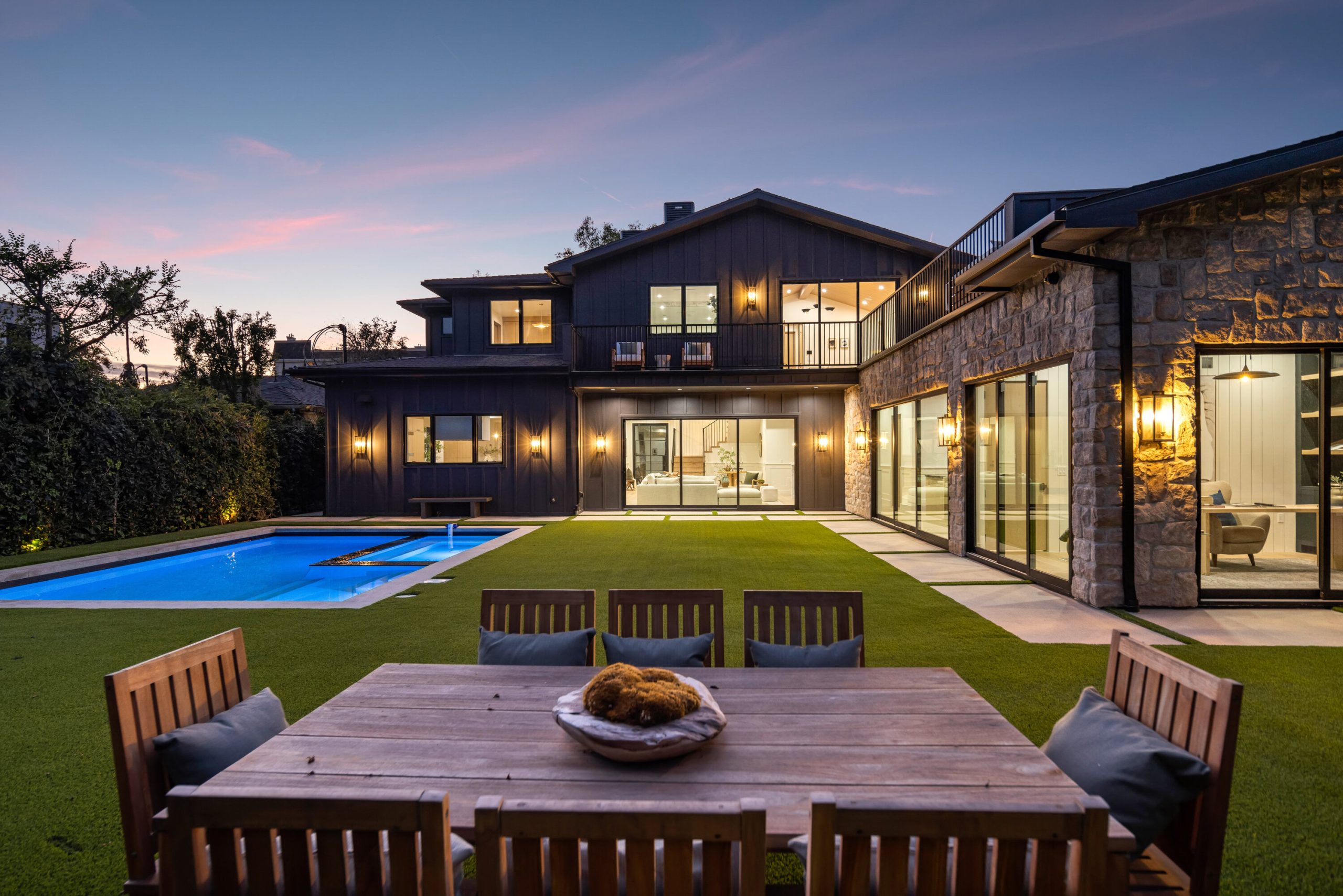 A striking statement in farmhouse luxury, this newly built estate with a detached ADU/guest house rests on a generous lot in the heart of Valley Village. Crafted for both everyday comfort and sophisticated entertaining, the open-concept main living space is centered around a chef's kitchen outfitted with premium Thermador smart appliances and an expansive island with seating. A formal dining area and spacious living room complete the main level, highlighted by an oversized sliding glass door that opens wide for seamless indoor-outdoor living.Step outside to discover a private backyard oasis featuring a sparkling pool and spa, framed by low-maintenance artificial turf that invites relaxation and play. Upstairs, four ensuite bedrooms provide ample retreat, complemented by a dedicated laundry room. The refined primary suite offers a private balcony, custom walk-in closet, and spa-inspired bath with soaking tub, rainfall shower, and dual vanity.The attached ADU, with its own private entrance, presents a versatile living arrangement with a comfortable lounge, kitchenette, two bedrooms, and two bathrooms ideal for extended family, guests, or a home office. Additional highlights include a multifunctional media room, soaring ceilings, a two-car garage, and a Control4 smart home system with integrated speakers, Nest thermostat, and security cameras.Perfectly positioned within the highly regarded Colfax School District, this property is just moments from the vibrant dining, shopping, and entertainment and Ventura Boulevard.
