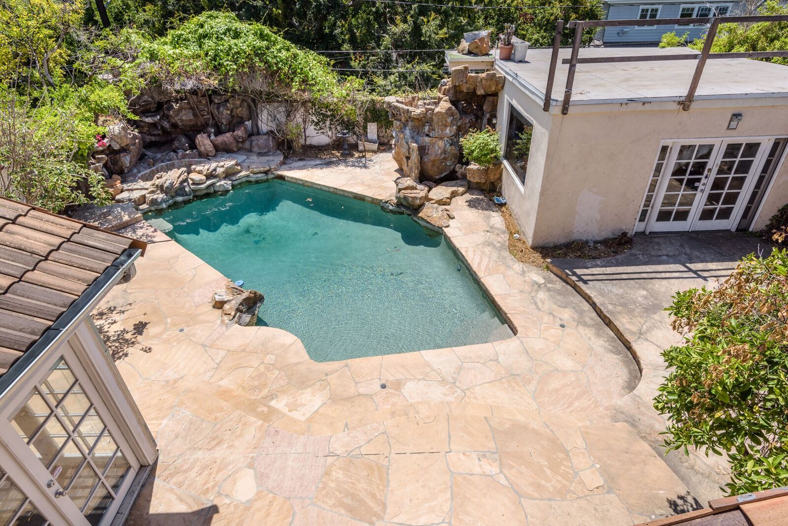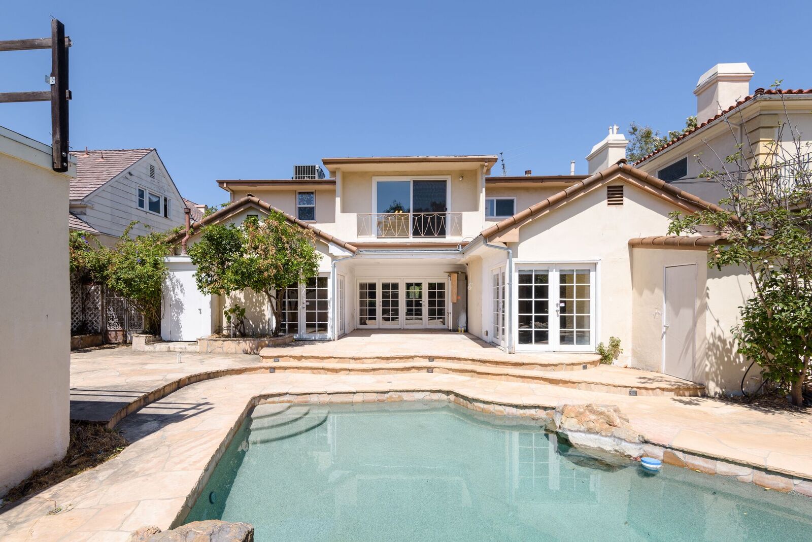 Endless possibilities on prestigious Beverly Hills quiet street! This charming 2 stories traditional family home features 5 bedrooms, 5.5 bath, family room, den/office and private yard with fabulous pool, spa, and converted studio. Enter thru private gate to a charming courtyard area with a pond. Perfect floor plan enters to large living and dining room great for entertaining. Large kitchen with granite counters, top of the line appliances, breakfast area, and walk-in pantry. Three spacious bedrooms upstairs include lavish master suite with amazing mountain views, fireplace, and private patio. Downstairs features 2nd master suite, 5th bedroom with bath, den/office, family room with fireplace and bar. Large backyard with pool perfect for entertaining. Additional features include skylights, jacuzzi bathtubs, cabana bath and pool fountains. Adjacent to Roxbury Park and convenient location to schools, markets, restaurants.