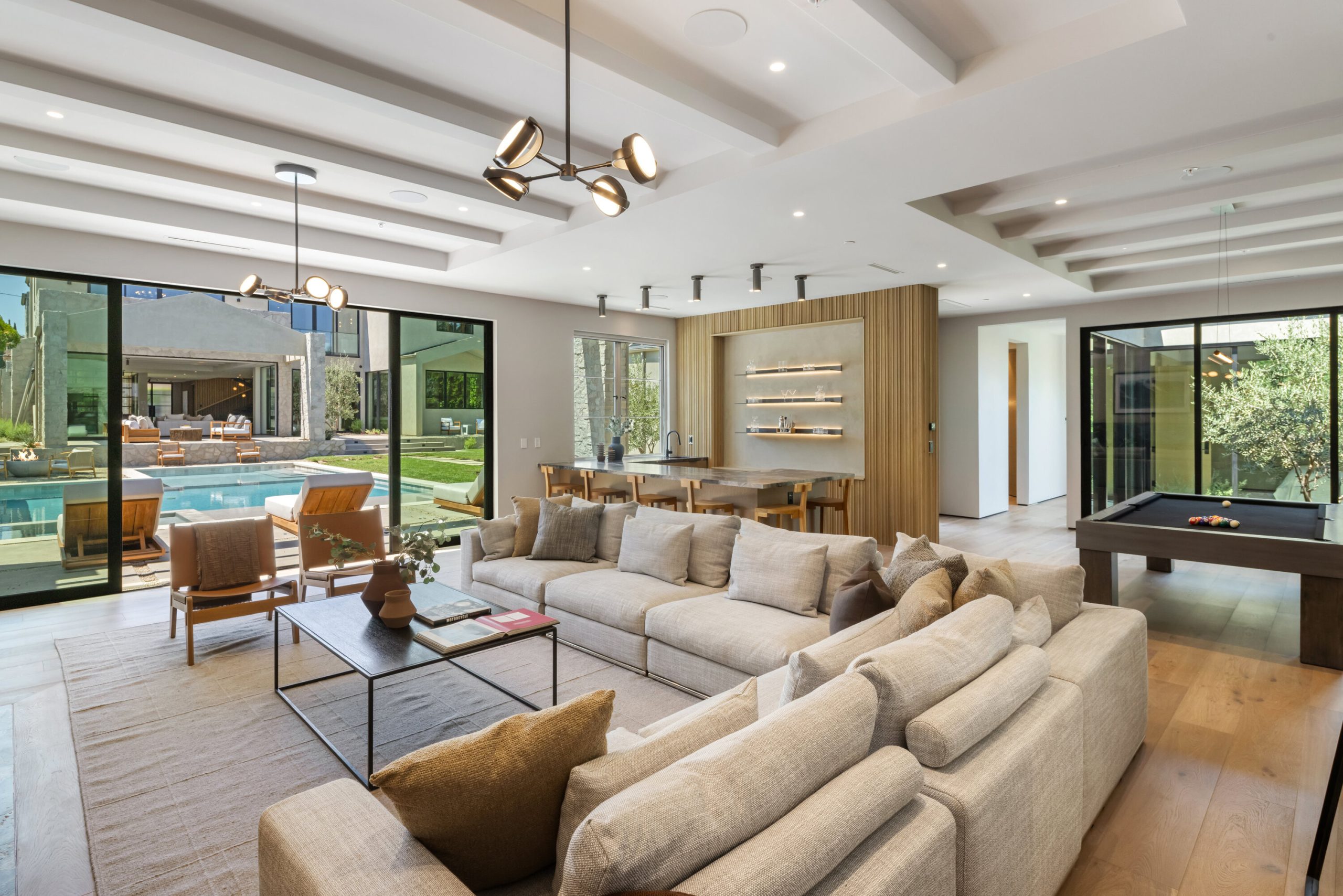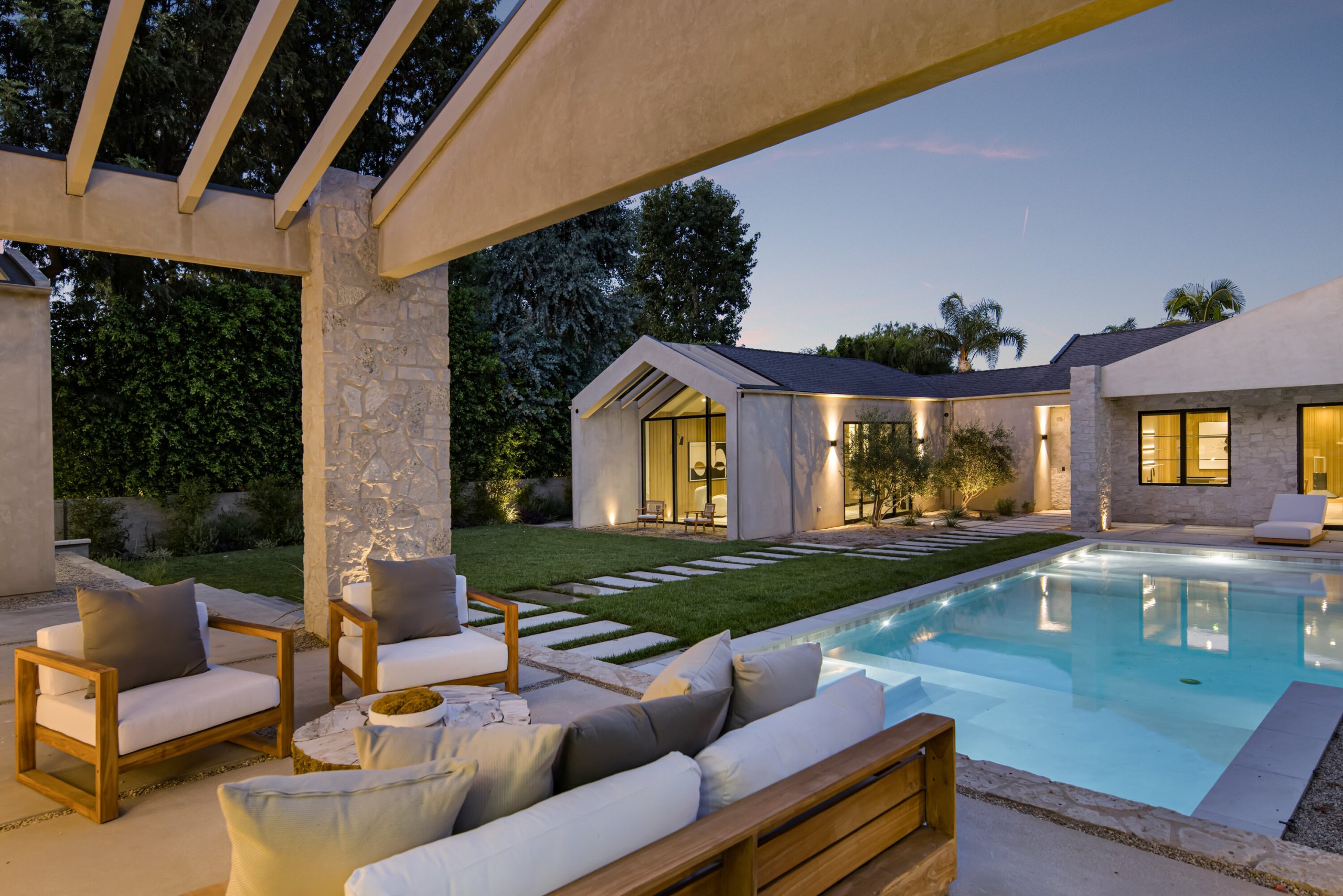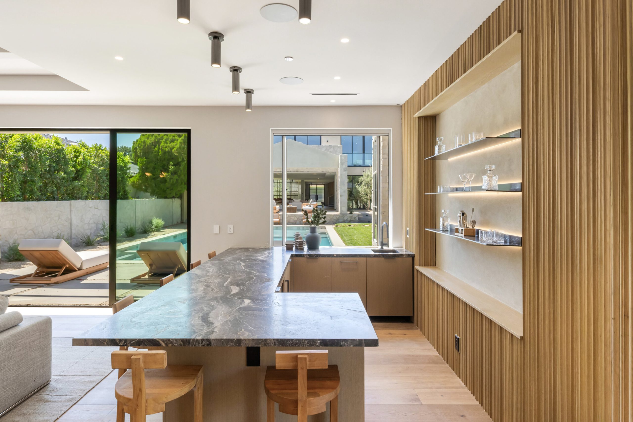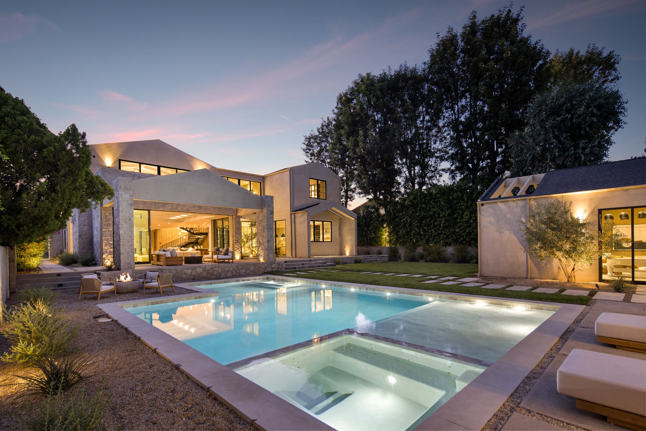 Welcome to 5056 Louise Avenue, a newly built architectural masterpiece created by Evan Gaskin Designs, nestled on a sprawling lot in the heart of Encino. This stunning residence, situated in Amestoy Estates, was designed with intention blending natural light, rich wood accents, and elegant stone elements to create a serene and luxurious living environment. Enter the main house to discover a bright, open floor plan that seamlessly connects sophisticated indoor living with the tranquility of the outdoors. Anchoring the main living space is a striking stone fireplace, a full custom bar, and a temperature-controlled wine room ideal for entertaining and relaxed evenings alike. The Chef's kitchen is a true centerpiece, featuring top-of-the-line Wolf appliances and a breathtaking oversized marble island that invites gathering and culinary creativity. The home offers five spacious bedrooms, each with its own en-suite bath. One guest suite is located on the main level, while the remaining four reside upstairs, including the expansive primary retreat. The primary suite boasts its own private terrace overlooking the lush backyard, and a spa-inspired bathroom complete with an oversized steam shower, luxurious soaking tub, and high-end fixtures by Jessi. The accompanying walk-in closet is a showstopper both in size and design. Throughout the home, you'll find quartz and all-natural tile surfaces, with premium fixtures by Phyllrich. Smart home automation by Crestron is seamlessly integrated into all main areas and the primary suite, providing effortless control over lighting, sound, and more. Floor-to-ceiling sliding glass doors lead you to a beautifully landscaped backyard oasis featuring a sparkling pool and spa. Across from the main home sits a spectacular 2,000-square-foot guest house and pool house, a gym, a recreation room, and a second full bar offering the ultimate in entertainment and relaxation. Security and convenience have been carefully considered, with a hardwired camera system covering both the interior and exterior, including front and backyard surveillance. 5056 Louise Ave is more than a home it's a lifestyle. Come experience the timeless elegance, thoughtful craftsmanship, and modern luxury that define this extraordinary Encino estate.