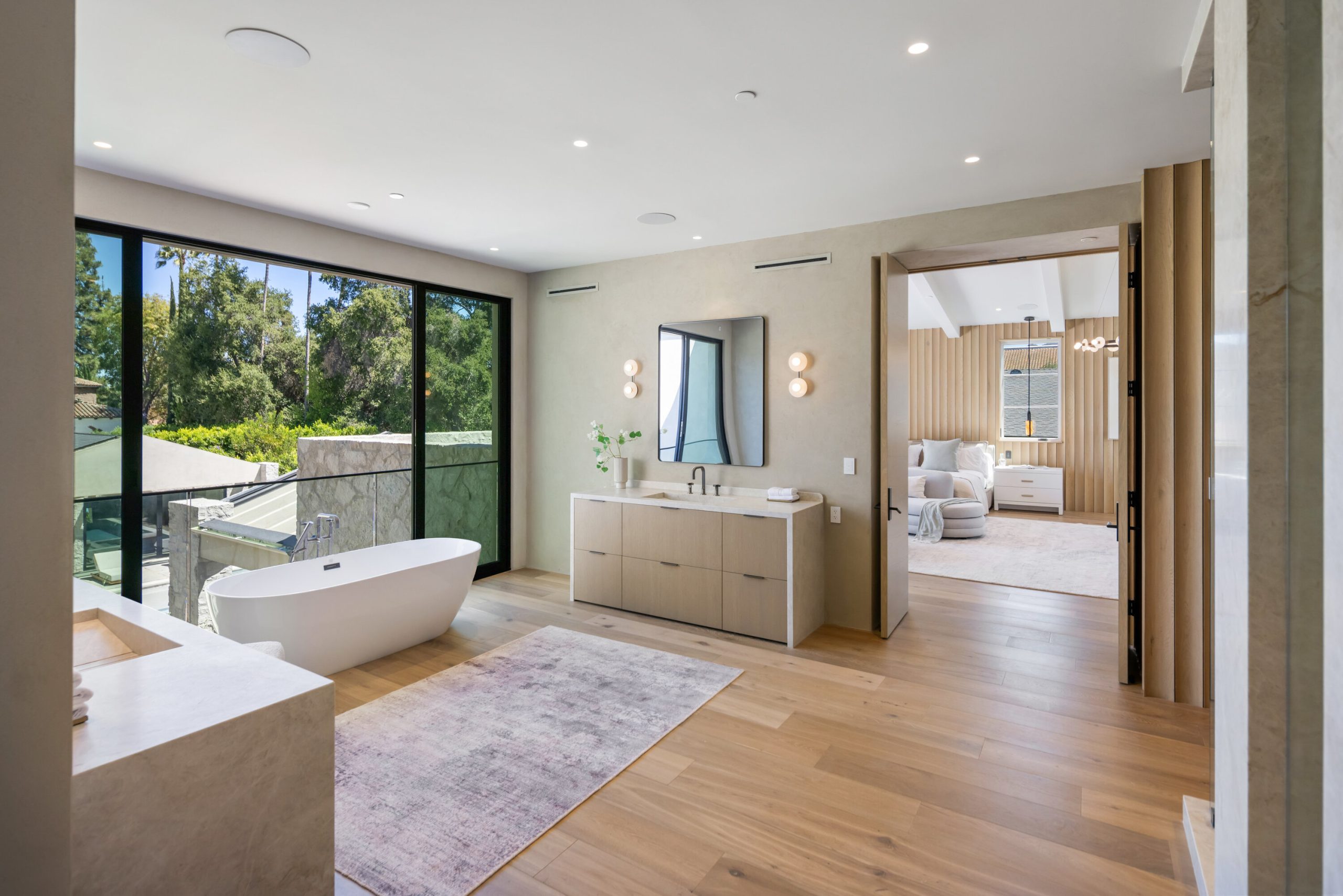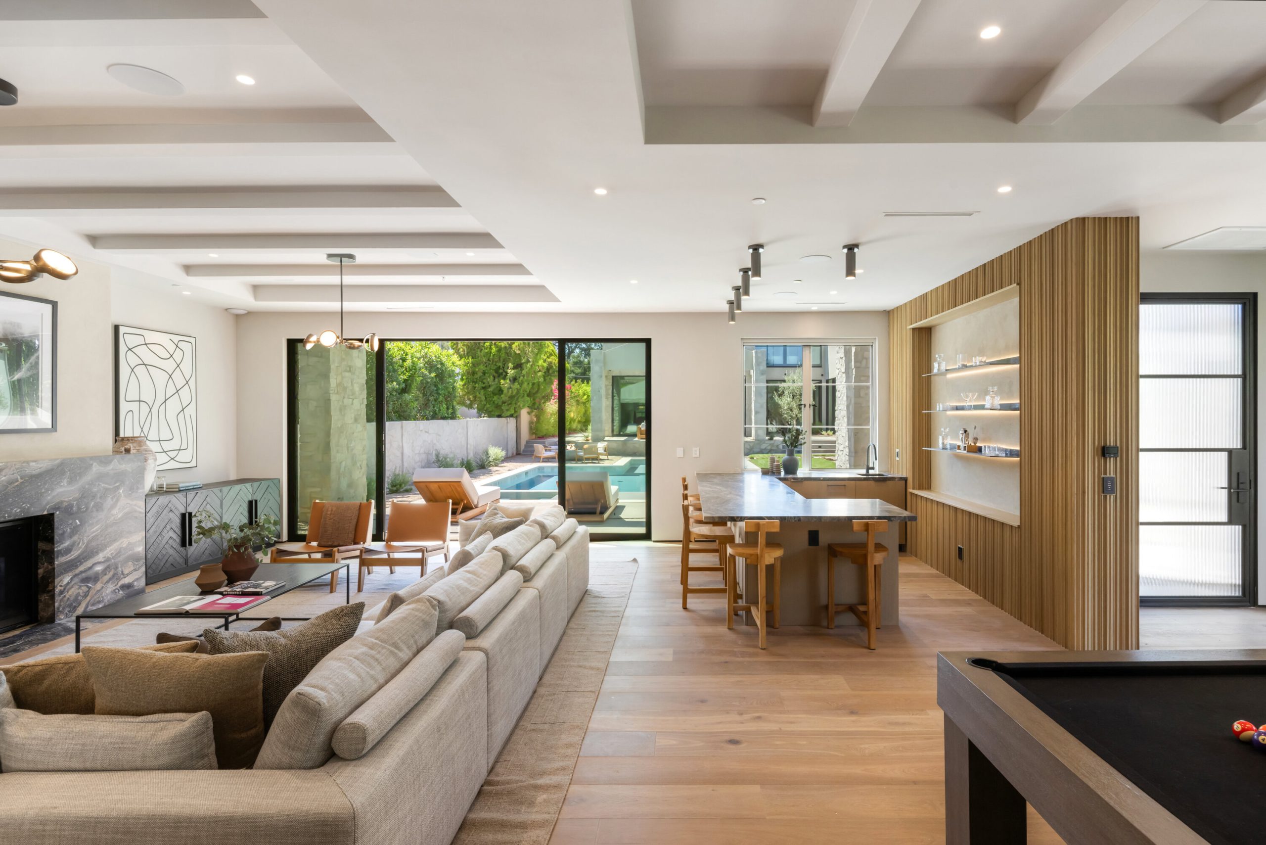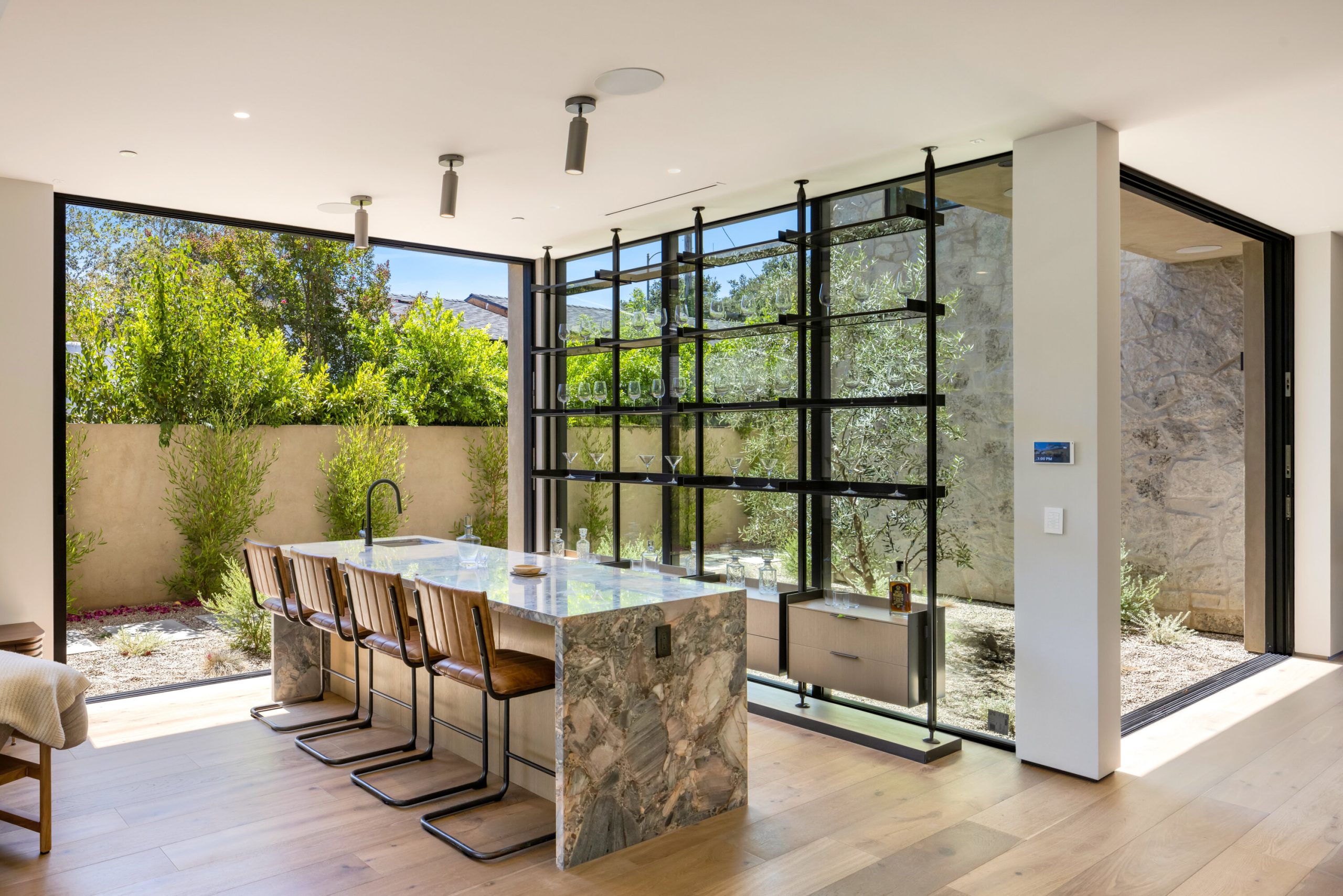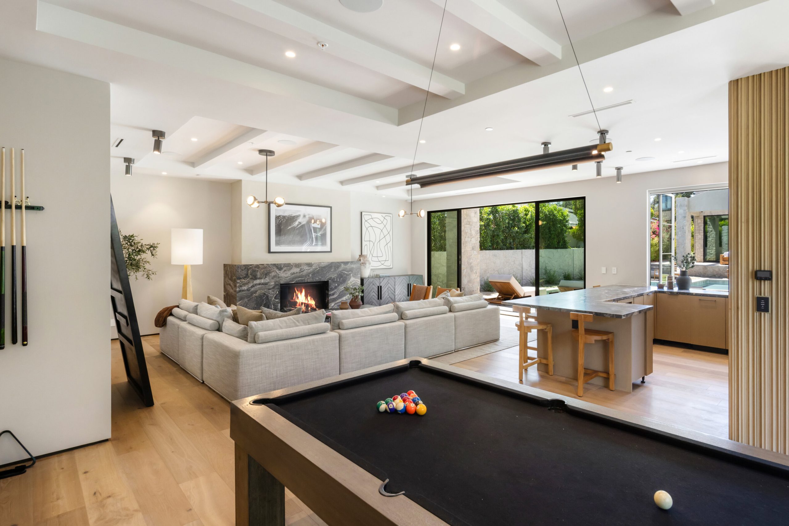 Welcome to 5056 Louise Avenue, a newly built architectural masterpiece created by Evan Gaskin Designs, nestled on a sprawling lot in the heart of Encino. This stunning residence, situated in Amestoy Estates, was designed with intention blending natural light, rich wood accents, and elegant stone elements to create a serene and luxurious living environment. Enter the main house to discover a bright, open floor plan that seamlessly connects sophisticated indoor living with the tranquility of the outdoors. Anchoring the main living space is a striking stone fireplace, a full custom bar, and a temperature-controlled wine room ideal for entertaining and relaxed evenings alike. The Chef's kitchen is a true centerpiece, featuring top-of-the-line Wolf appliances and a breathtaking oversized marble island that invites gathering and culinary creativity. The home offers five spacious bedrooms, each with its own en-suite bath. One guest suite is located on the main level, while the remaining four reside upstairs, including the expansive primary retreat. The primary suite boasts its own private terrace overlooking the lush backyard, and a spa-inspired bathroom complete with an oversized steam shower, luxurious soaking tub, and high-end fixtures by Jessi. The accompanying walk-in closet is a showstopper both in size and design. Throughout the home, you'll find quartz and all-natural tile surfaces, with premium fixtures by Phyllrich. Smart home automation by Crestron is seamlessly integrated into all main areas and the primary suite, providing effortless control over lighting, sound, and more. Floor-to-ceiling sliding glass doors lead you to a beautifully landscaped backyard oasis featuring a sparkling pool and spa. Across from the main home sits a spectacular 2,000-square-foot guest house and pool house, a gym, a recreation room, and a second full bar offering the ultimate in entertainment and relaxation. Security and convenience have been carefully considered, with a hardwired camera system covering both the interior and exterior, including front and backyard surveillance. 5056 Louise Ave is more than a home it's a lifestyle. Come experience the timeless elegance, thoughtful craftsmanship, and modern luxury that define this extraordinary Encino estate.