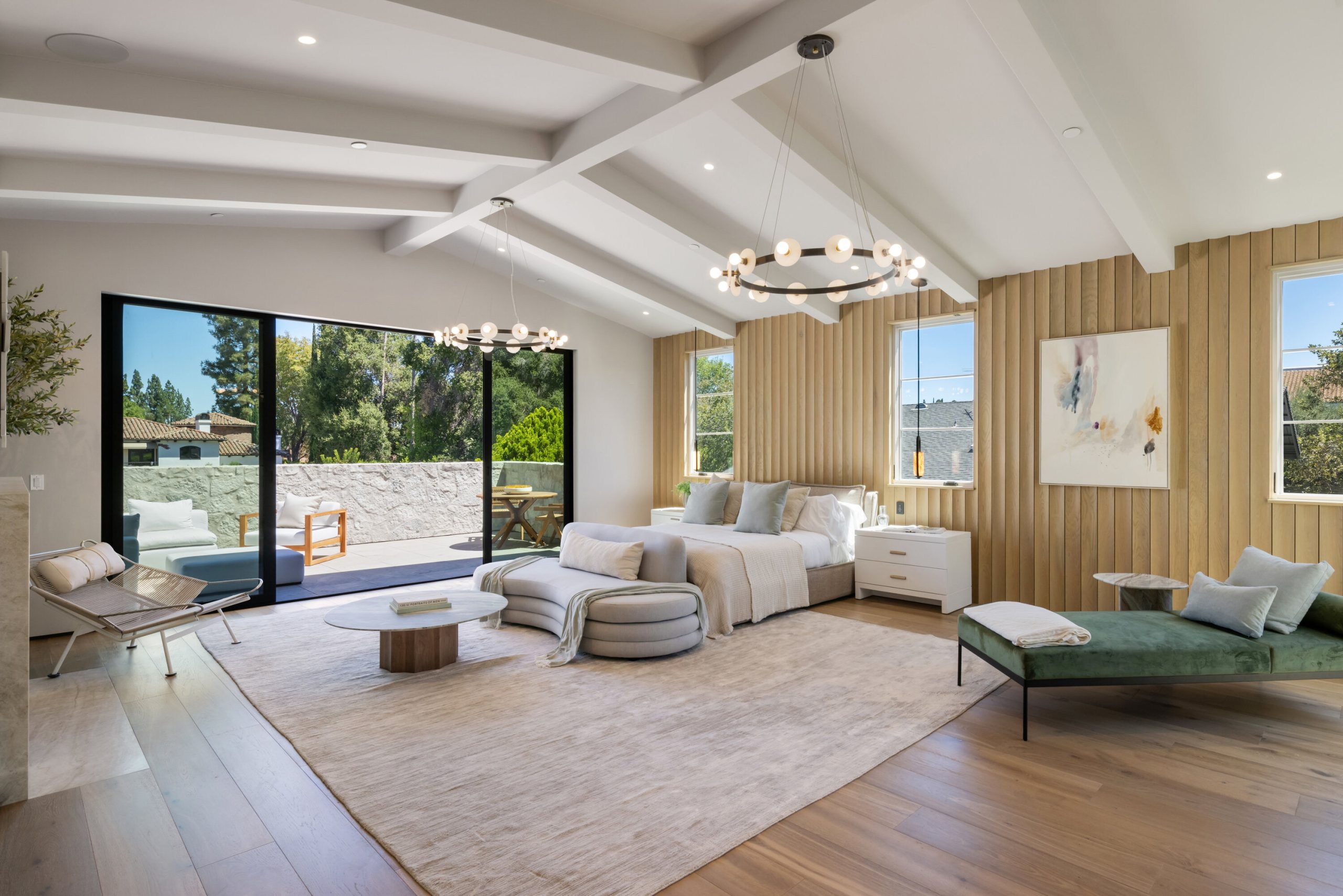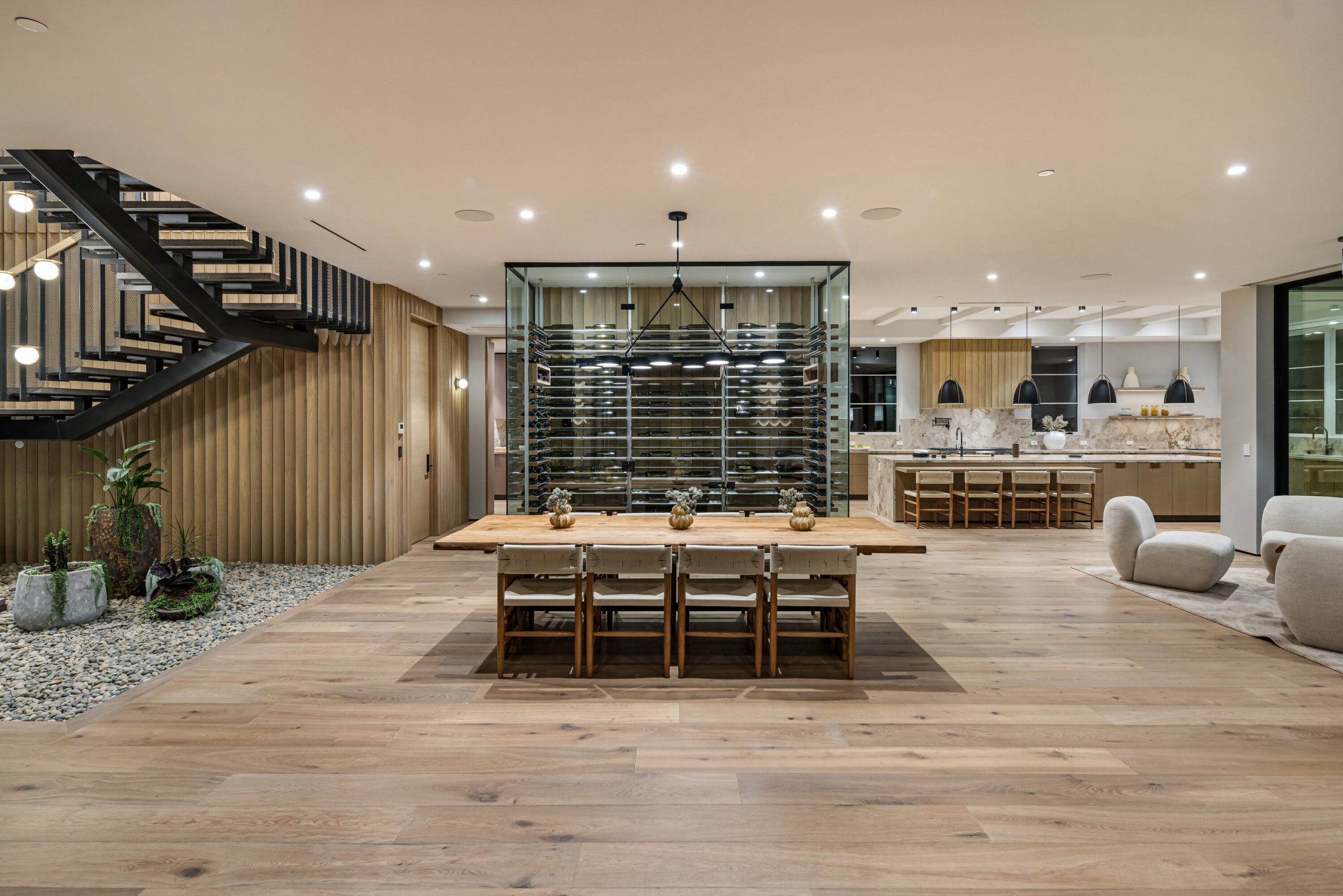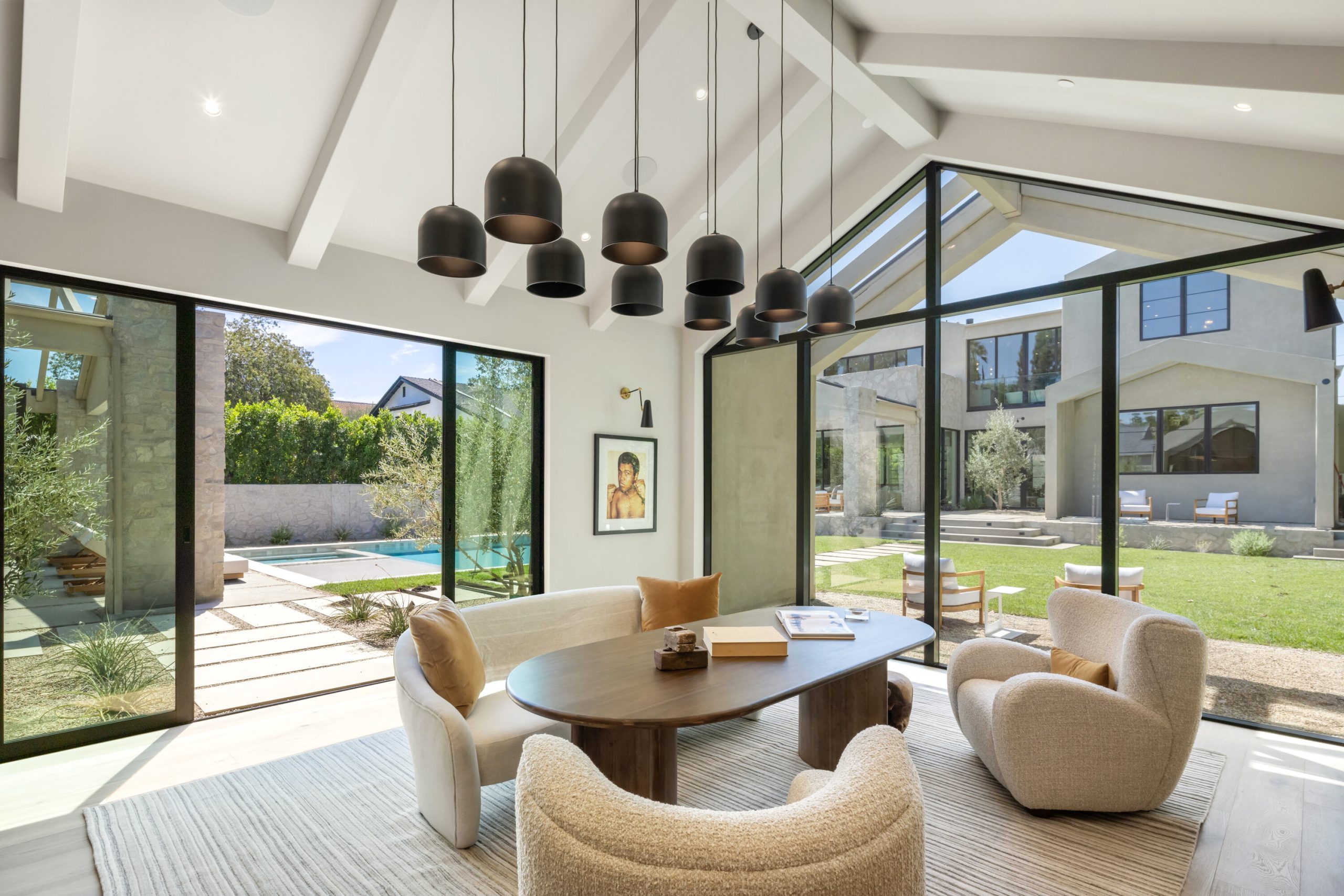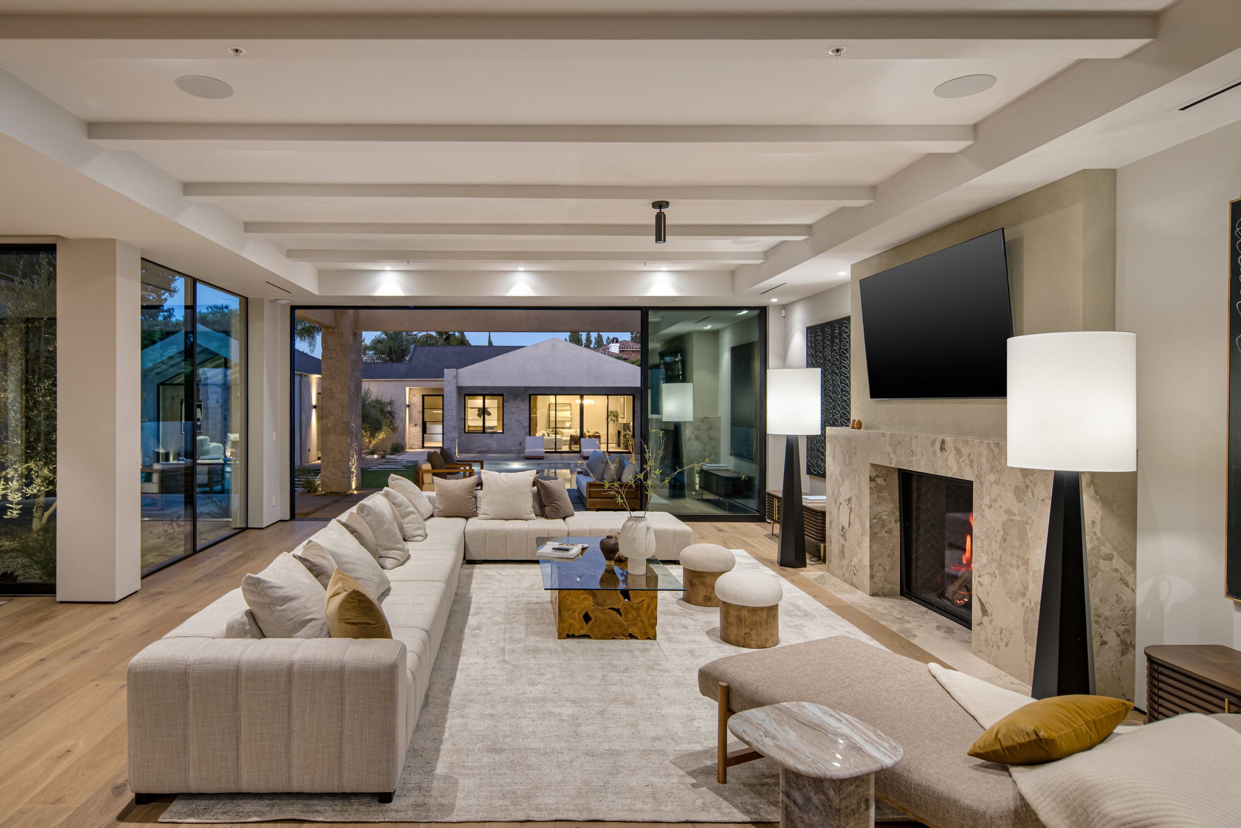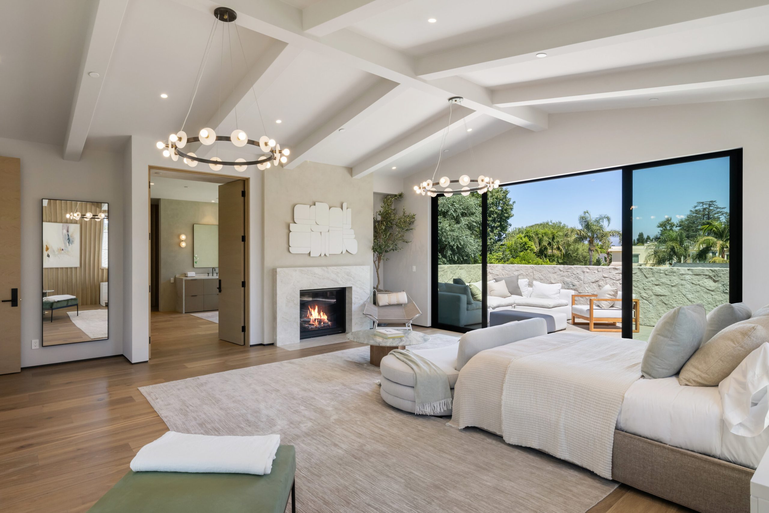 Welcome to 5056 Louise Avenue, a newly built architectural masterpiece created by Evan Gaskin Designs, nestled on a sprawling lot in the heart of Encino. This stunning residence, situated in Amestoy Estates, was designed with intention blending natural light, rich wood accents, and elegant stone elements to create a serene and luxurious living environment. Enter the main house to discover a bright, open floor plan that seamlessly connects sophisticated indoor living with the tranquility of the outdoors. Anchoring the main living space is a striking stone fireplace, a full custom bar, and a temperature-controlled wine room ideal for entertaining and relaxed evenings alike. The Chef's kitchen is a true centerpiece, featuring top-of-the-line Wolf appliances and a breathtaking oversized marble island that invites gathering and culinary creativity. The home offers five spacious bedrooms, each with its own en-suite bath. One guest suite is located on the main level, while the remaining four reside upstairs, including the expansive primary retreat. The primary suite boasts its own private terrace overlooking the lush backyard, and a spa-inspired bathroom complete with an oversized steam shower, luxurious soaking tub, and high-end fixtures by Jessi. The accompanying walk-in closet is a showstopper both in size and design. Throughout the home, you'll find quartz and all-natural tile surfaces, with premium fixtures by Phyllrich. Smart home automation by Crestron is seamlessly integrated into all main areas and the primary suite, providing effortless control over lighting, sound, and more. Floor-to-ceiling sliding glass doors lead you to a beautifully landscaped backyard oasis featuring a sparkling pool and spa. Across from the main home sits a spectacular 2,000-square-foot guest house and pool house, a gym, a recreation room, and a second full bar offering the ultimate in entertainment and relaxation. Security and convenience have been carefully considered, with a hardwired camera system covering both the interior and exterior, including front and backyard surveillance. 5056 Louise Ave is more than a home it's a lifestyle. Come experience the timeless elegance, thoughtful craftsmanship, and modern luxury that define this extraordinary Encino estate.