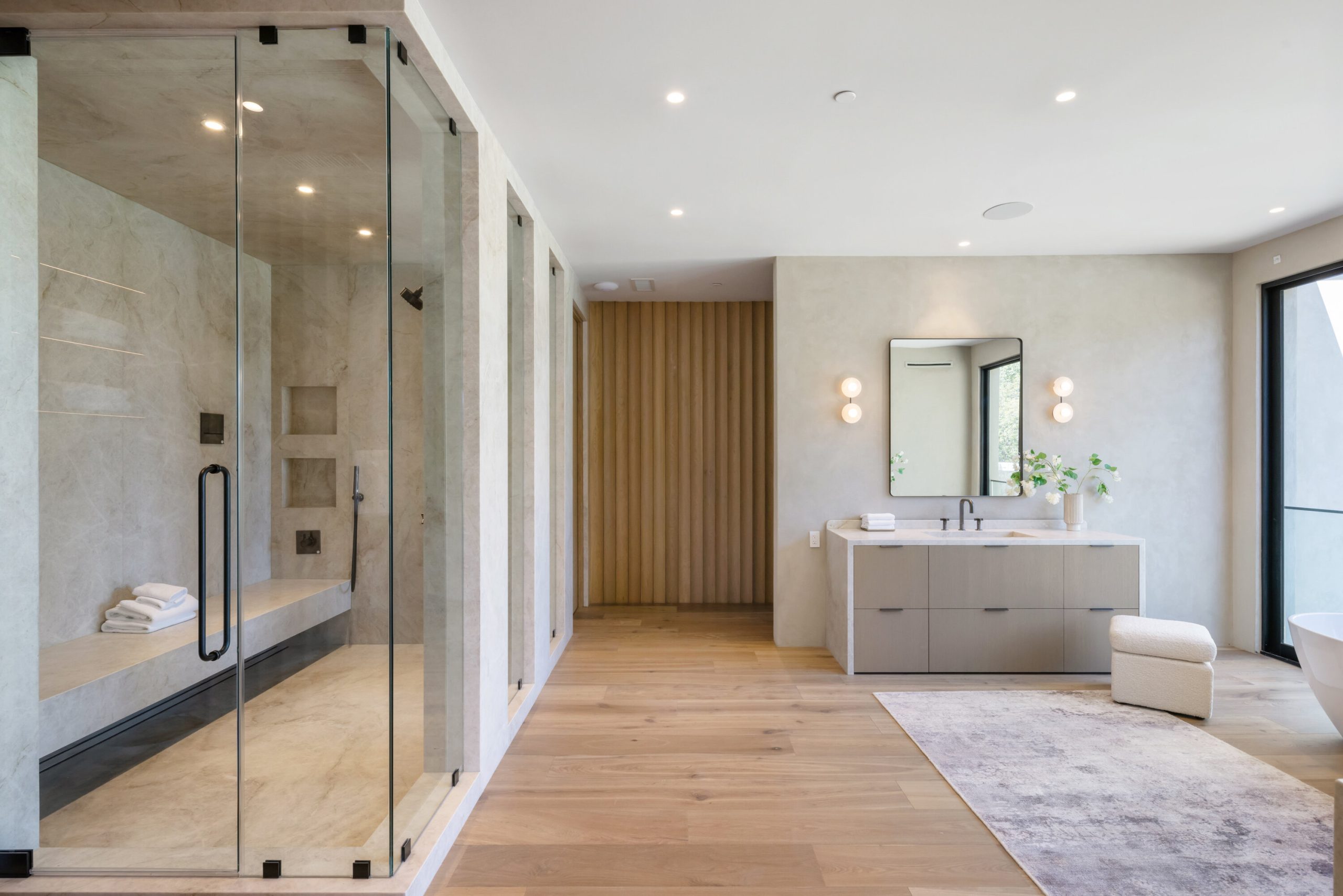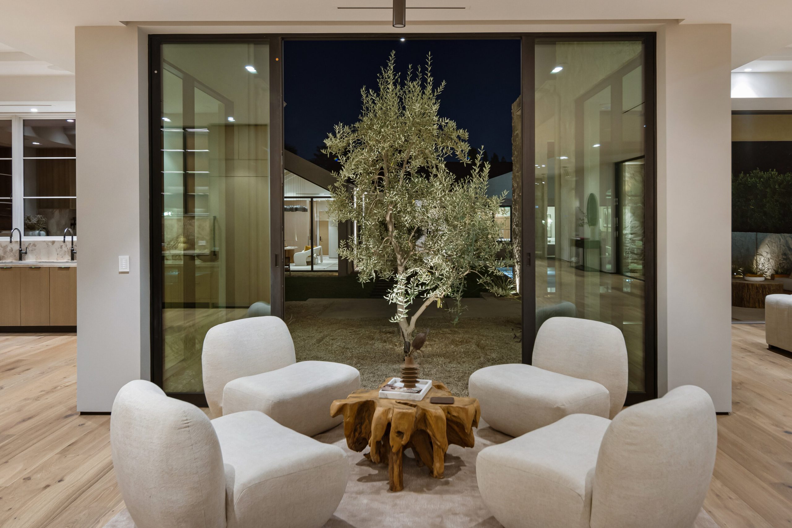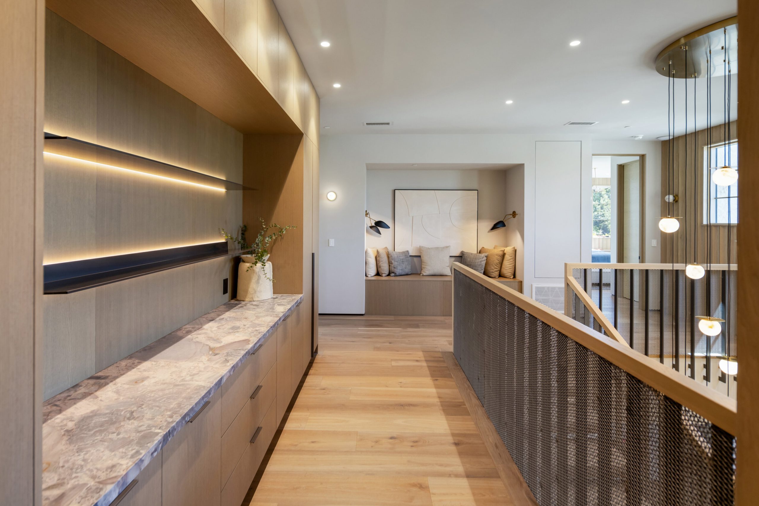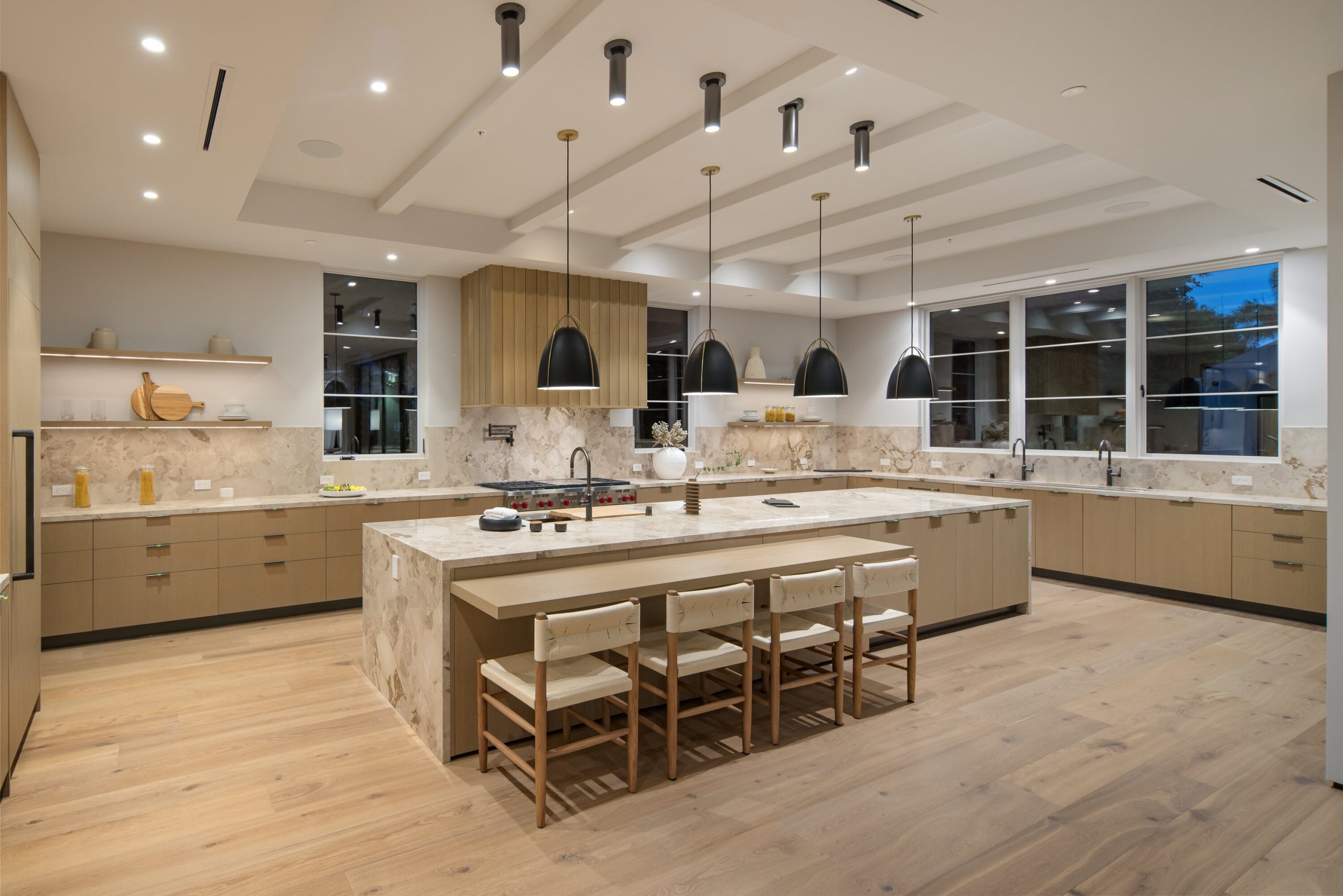 Welcome to 5056 Louise Avenue, a newly built architectural masterpiece created by Evan Gaskin Designs, nestled on a sprawling lot in the heart of Encino. This stunning residence, situated in Amestoy Estates, was designed with intention blending natural light, rich wood accents, and elegant stone elements to create a serene and luxurious living environment. Enter the main house to discover a bright, open floor plan that seamlessly connects sophisticated indoor living with the tranquility of the outdoors. Anchoring the main living space is a striking stone fireplace, a full custom bar, and a temperature-controlled wine room ideal for entertaining and relaxed evenings alike. The Chef's kitchen is a true centerpiece, featuring top-of-the-line Wolf appliances and a breathtaking oversized marble island that invites gathering and culinary creativity. The home offers five spacious bedrooms, each with its own en-suite bath. One guest suite is located on the main level, while the remaining four reside upstairs, including the expansive primary retreat. The primary suite boasts its own private terrace overlooking the lush backyard, and a spa-inspired bathroom complete with an oversized steam shower, luxurious soaking tub, and high-end fixtures by Jessi. The accompanying walk-in closet is a showstopper both in size and design. Throughout the home, you'll find quartz and all-natural tile surfaces, with premium fixtures by Phyllrich. Smart home automation by Crestron is seamlessly integrated into all main areas and the primary suite, providing effortless control over lighting, sound, and more. Floor-to-ceiling sliding glass doors lead you to a beautifully landscaped backyard oasis featuring a sparkling pool and spa. Across from the main home sits a spectacular 2,000-square-foot guest house and pool house, a gym, a recreation room, and a second full bar offering the ultimate in entertainment and relaxation. Security and convenience have been carefully considered, with a hardwired camera system covering both the interior and exterior, including front and backyard surveillance. 5056 Louise Ave is more than a home it's a lifestyle. Come experience the timeless elegance, thoughtful craftsmanship, and modern luxury that define this extraordinary Encino estate.
