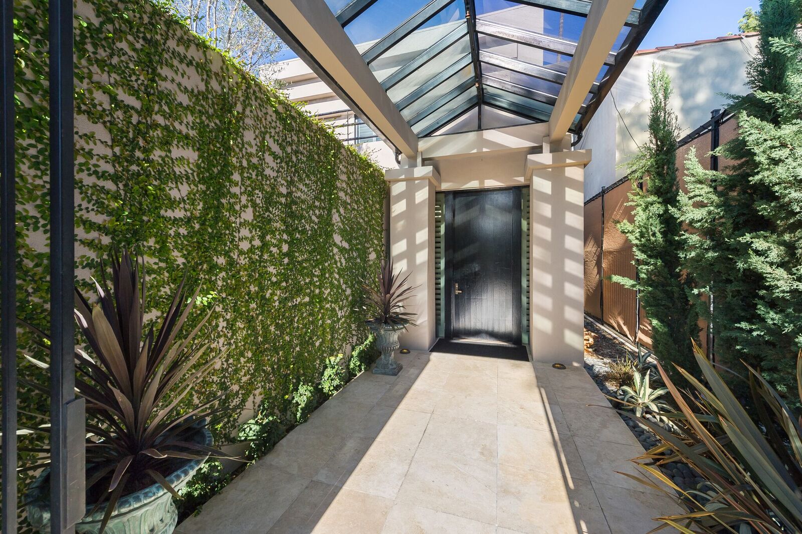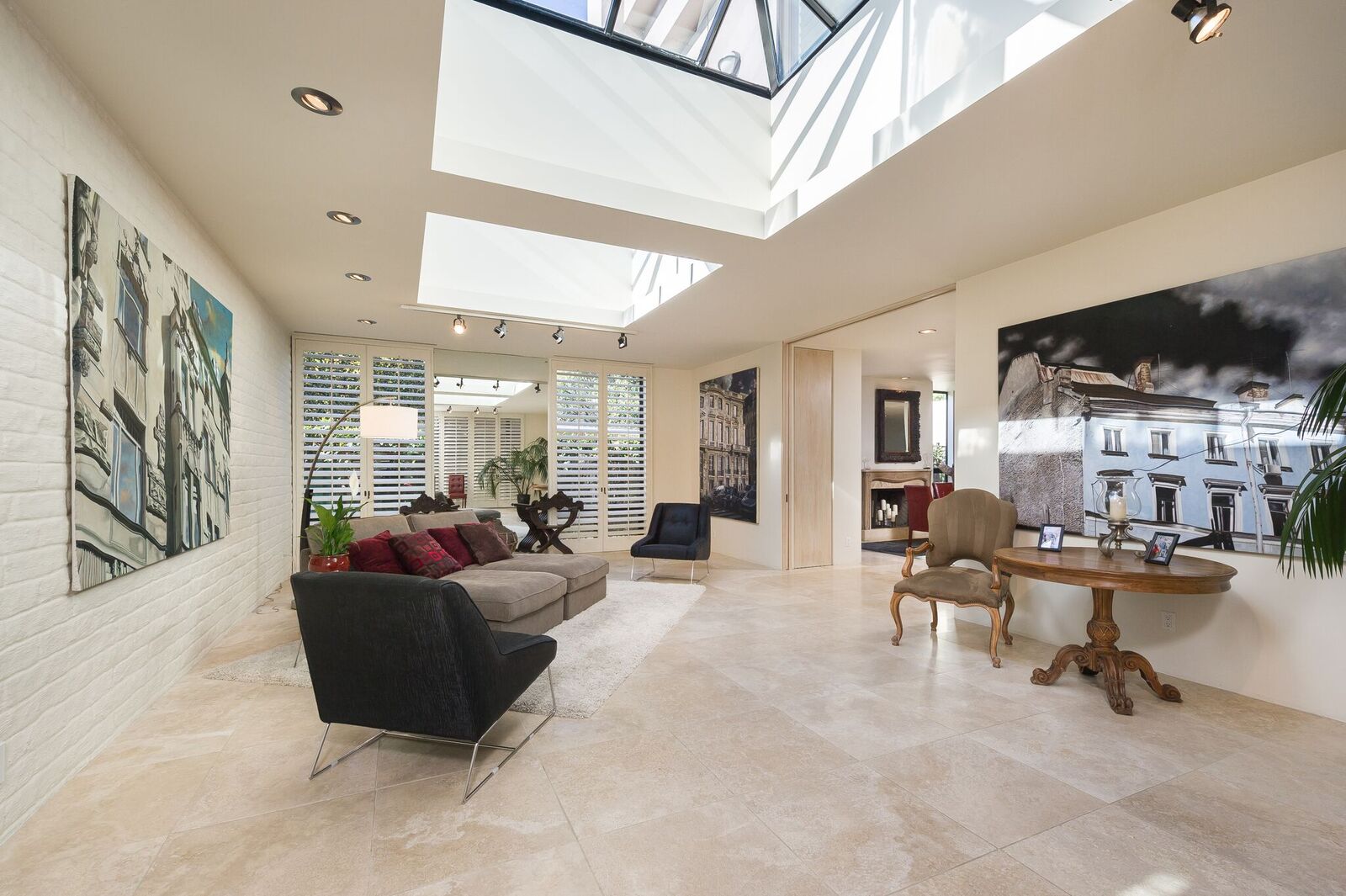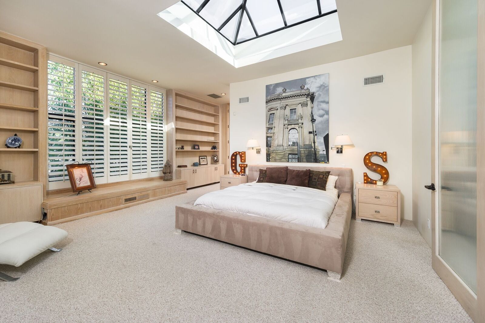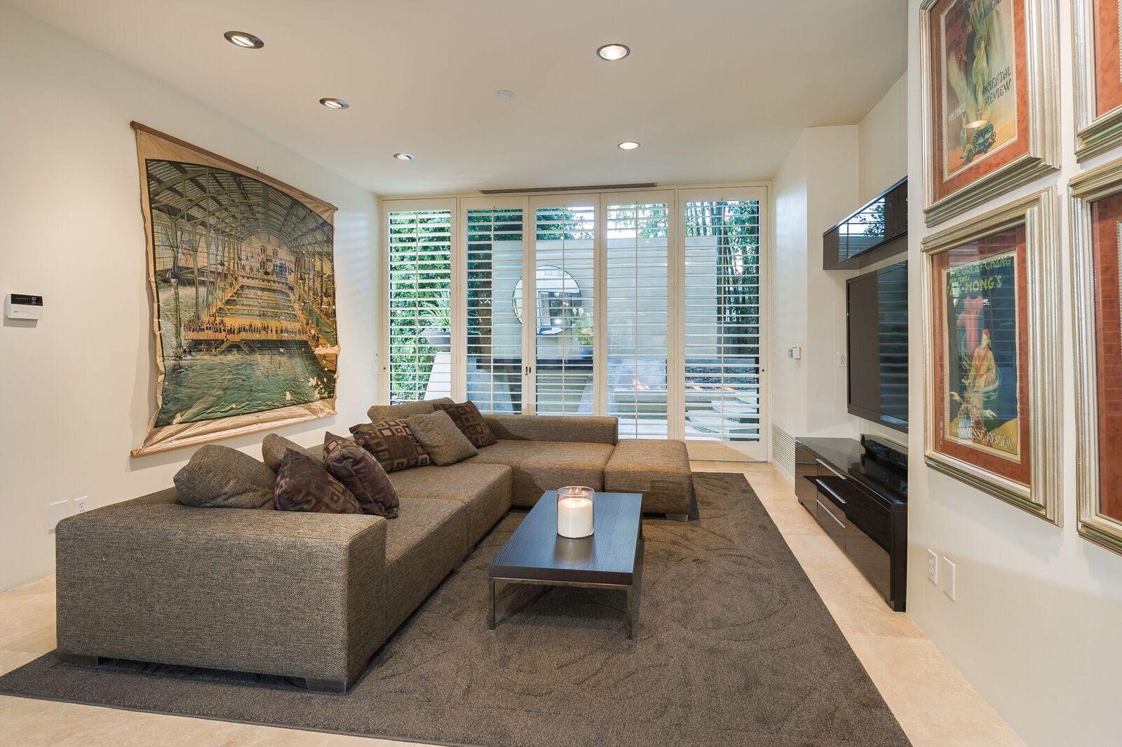 Unique and Sleek Contemporary home over 3000 sqft in the best part of WeHo. The home features custom all stainless kitchen with Caesar stone countertops and huge Viking range. Entertaining island with seating for 6 opens to the dining room with fireplace and media lounge. All bathrooms have been updated with new fixtures. Motorized shade in master bedroom opens to reveal a massive pyramid skylight, and the master bath has a full wet bar. The 2nd master suite contains a jacuzzi tub surrounded by Jerusalem stone walls with multiple skylights overhead. Custom cabinetry and built-in bookcases throughout, with floor to ceiling doors and windows. Completely private stone patio features a custom built-in spa with waterfall and outdoor media center with 42″ flat screen and surrounds sound. This is a fantastic location near the West Hollywood center, community theater, art galleries, fine dining, shopping and more!