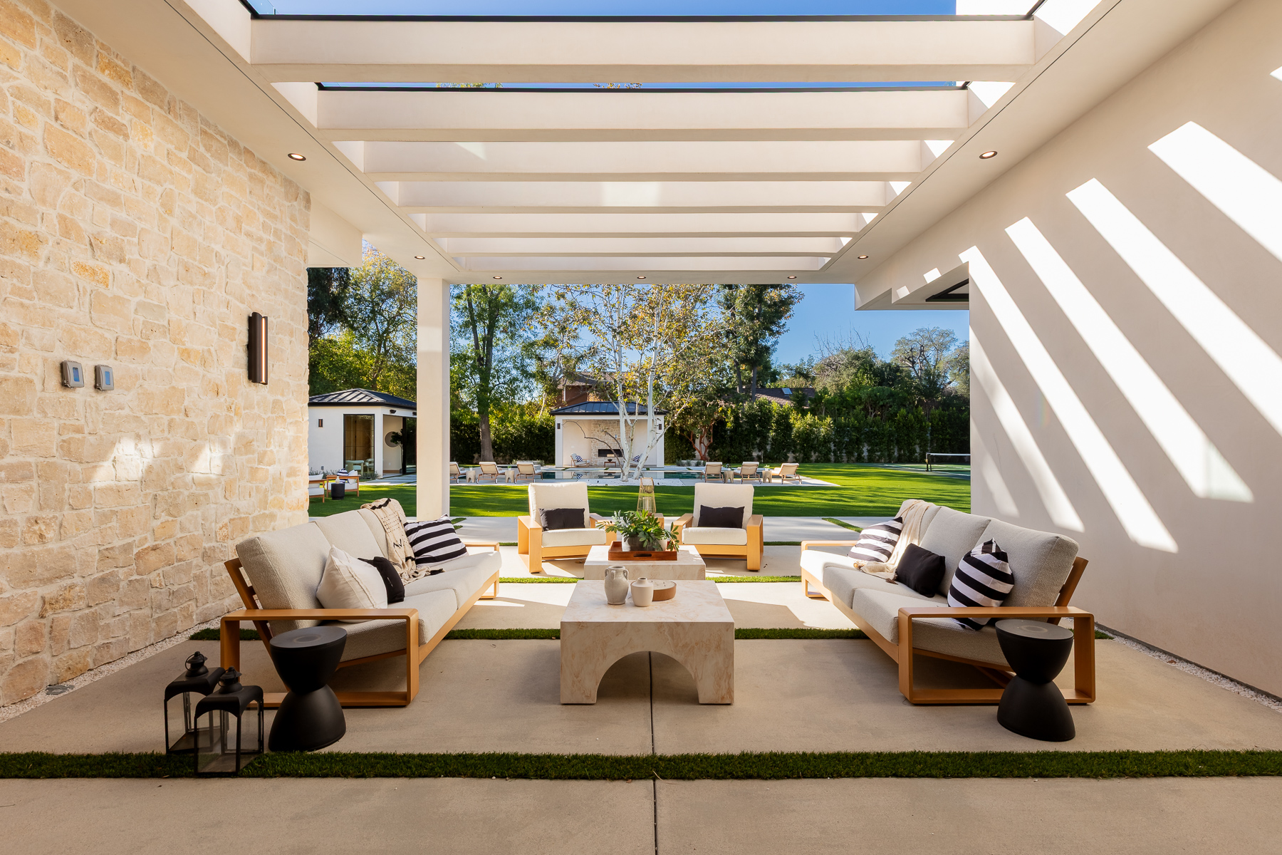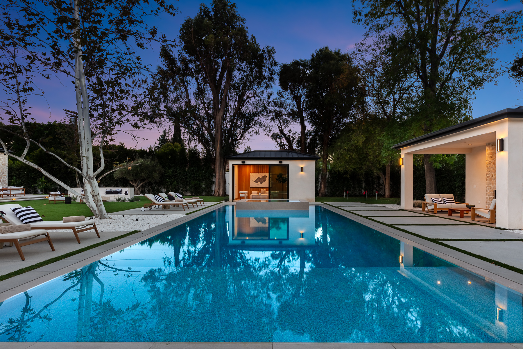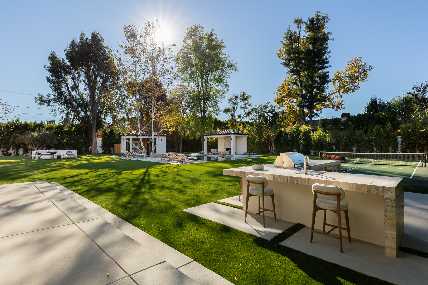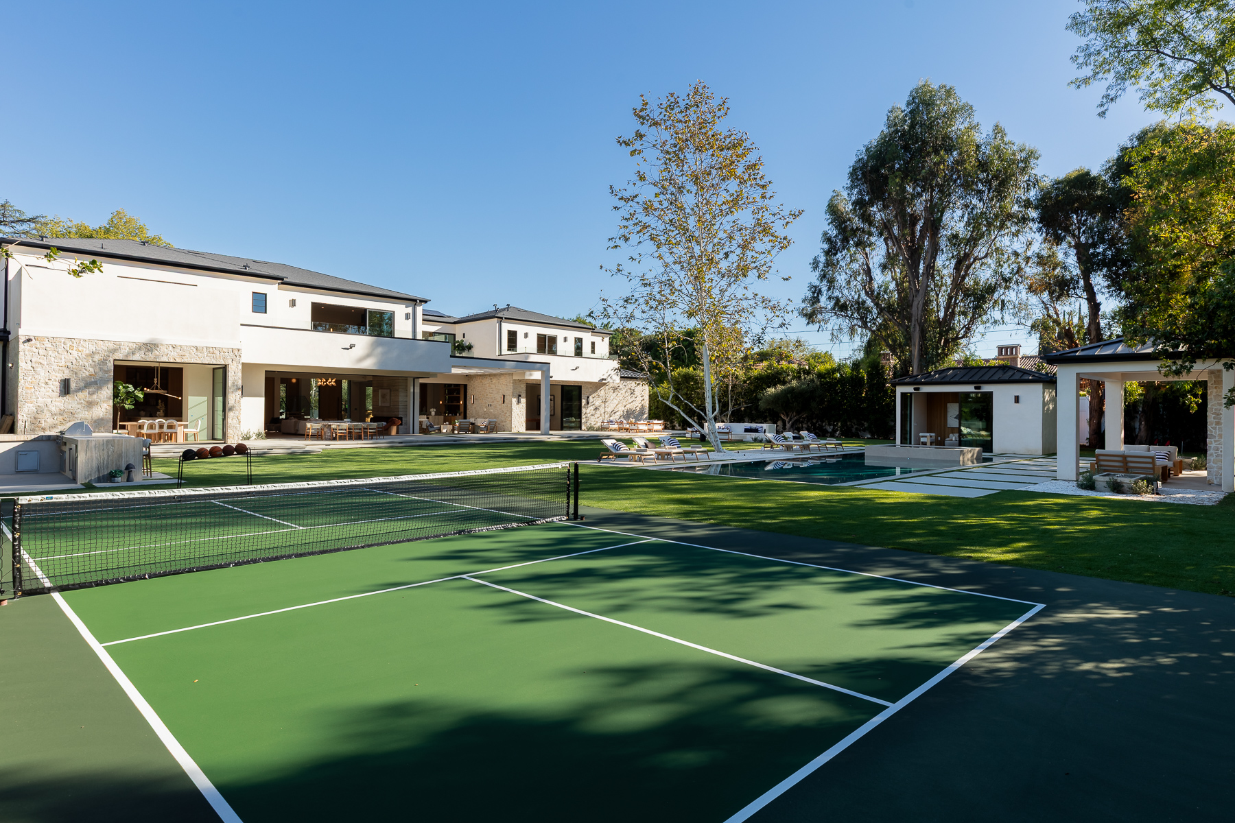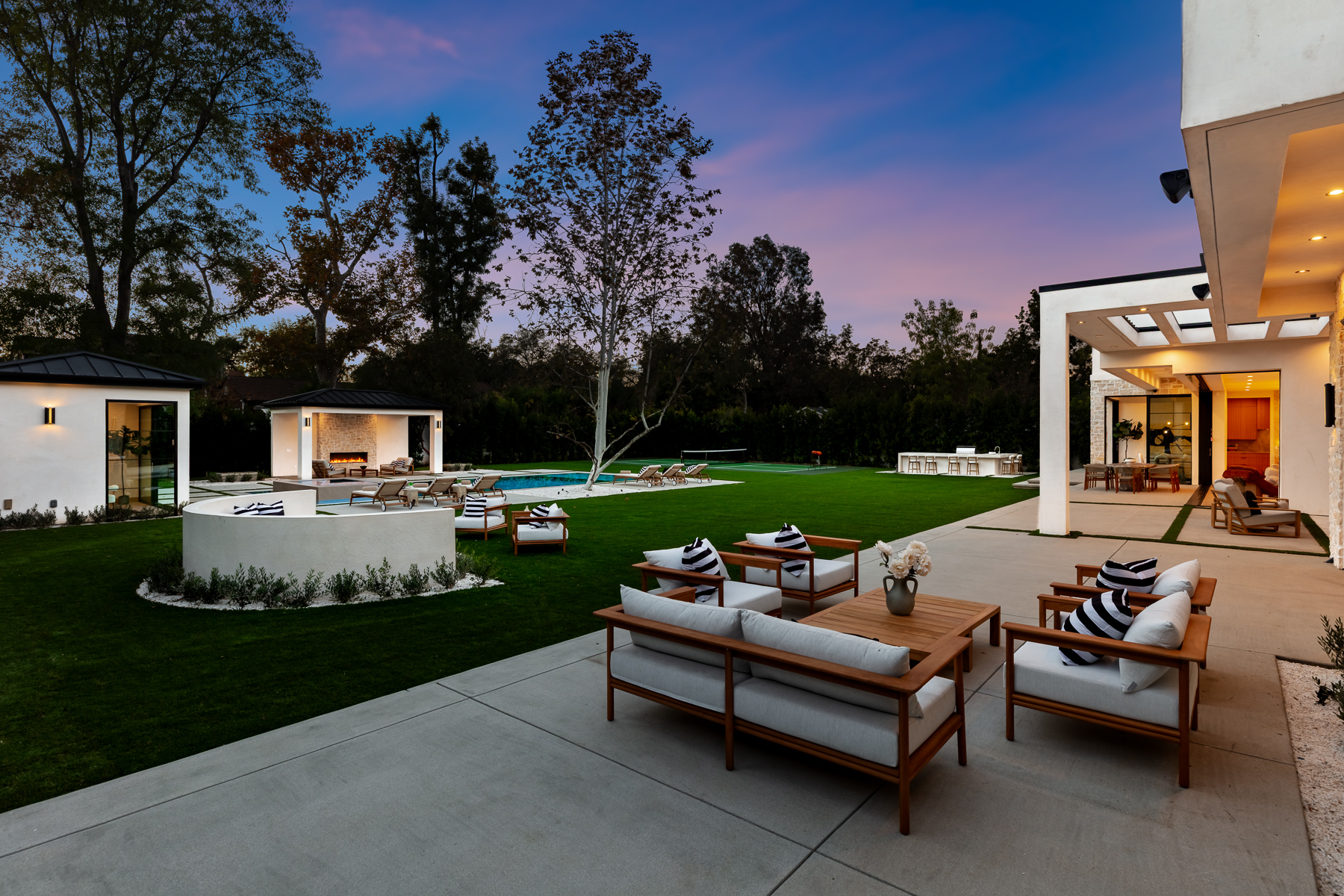 A masterpiece of comfort, design, and effortless luxury, this estate is thoughtfully curated by Studio Brinkley Design and delivers a lifestyle where every detail has been considered and nothing has been overlooked. The newly built residence spans over 10,000 square feet, offering unparalleled design and thoughtful craftsmanship. The grand foyer, with its soaring ceilings, welcomes you to an inviting formal living room featuring a striking fireplace, custom built-ins, and a sophisticated wet bar that flows seamlessly into the family room and chef's kitchen. Designed for both everyday living and effortless entertaining, the kitchen is a true centerpiece with double islands, Taj Mahal quartz countertops, chef-grade Wolf appliances, a walk-in pantry, and a full secondary prep kitchen. Sunlight fills the breakfast nook while expansive sliding doors create a perfect connection to the resort-style backyard. A glass-encased wine wall highlights the formal dining room, positioned adjacent to a private office that can also serve as an additional bedroom. The opposite wing of the home offers a spacious lower-level entertainment suite, complete with custom built-ins, a game and lounge area, and a dedicated home theatre, perfect for both hosting and relaxing. Throughout the residence, elegant paneling, designer finishes, and a state-of-the-art Control4 smart home system providing seamless automation for lighting, climate, security, and audio-visual experiences. A stunning staircase leads to four beautifully appointed en-suite bedrooms, including the primary retreat, a serene sanctuary with a fireplace, built-in wet bar, and two separate balconies, one offering a feeling of complete privacy with an outdoor sauna. The spa-inspired primary bath has dual vanities, a steam shower, a soaking tub, and an expansive custom closet. The backyard is an entertainer's paradise, with patios stretching the full length of the home, a covered outdoor living room with fireplace, a sparkling pool and spa, a fire pit, putting green, and sport court. A built-in barbecue area and pool house with an en-suite bath complete the resort-style setting. Additional features include an attached ADU with a private entrance, one bedroom, bath, and a versatile living area that can serve as a lounge, studio, or gym, ideal for guests or multigenerational living. The estate also offers a gated circular driveway and a two-car garage, all ideally positioned just moments from premier shops and celebrated local restaurants.
