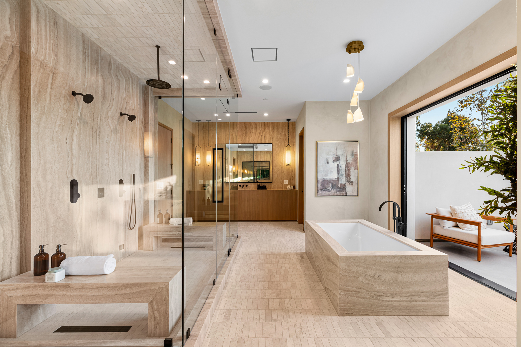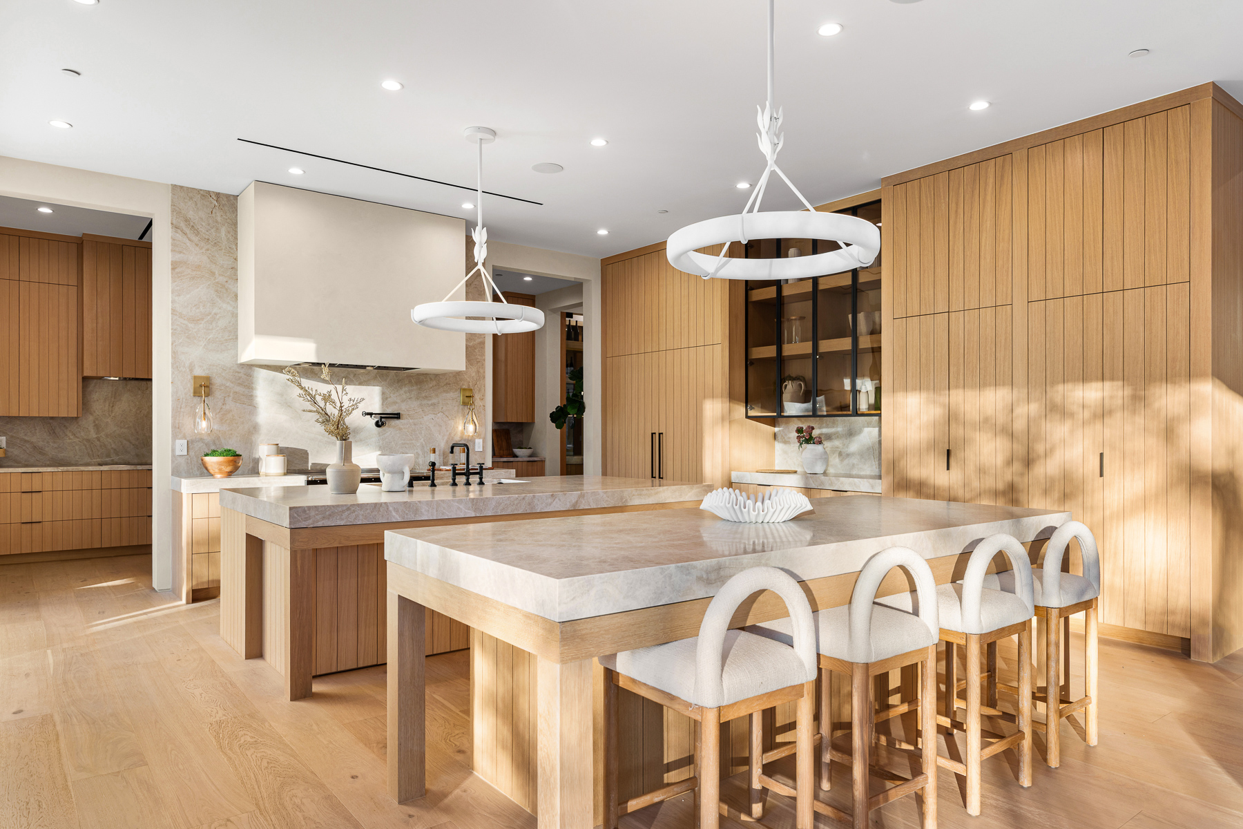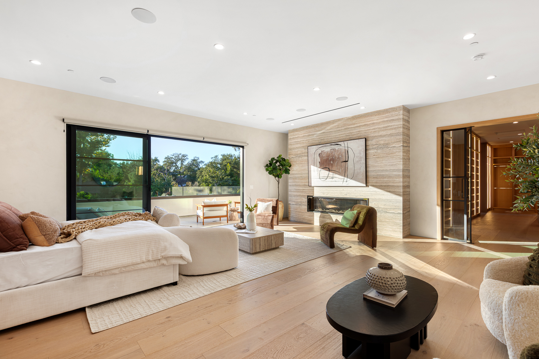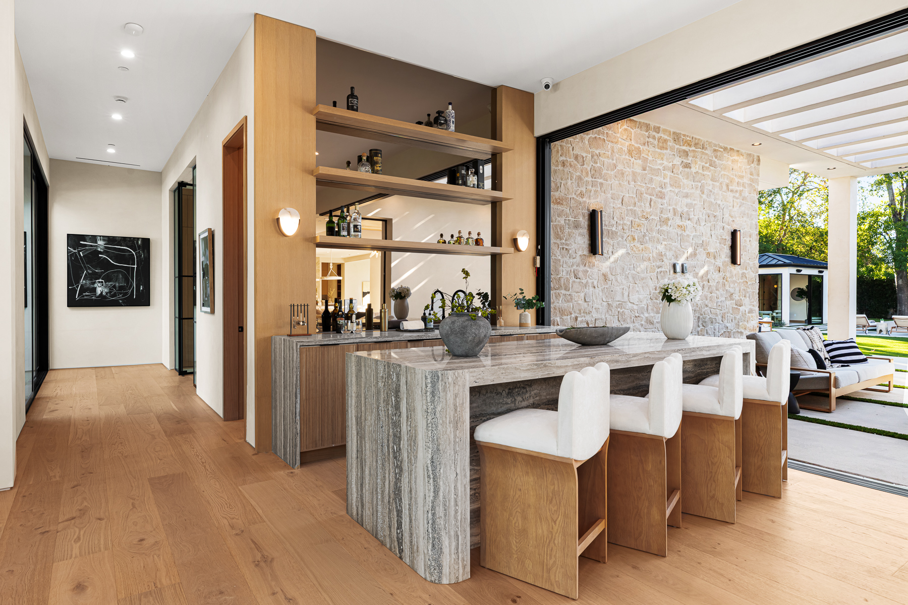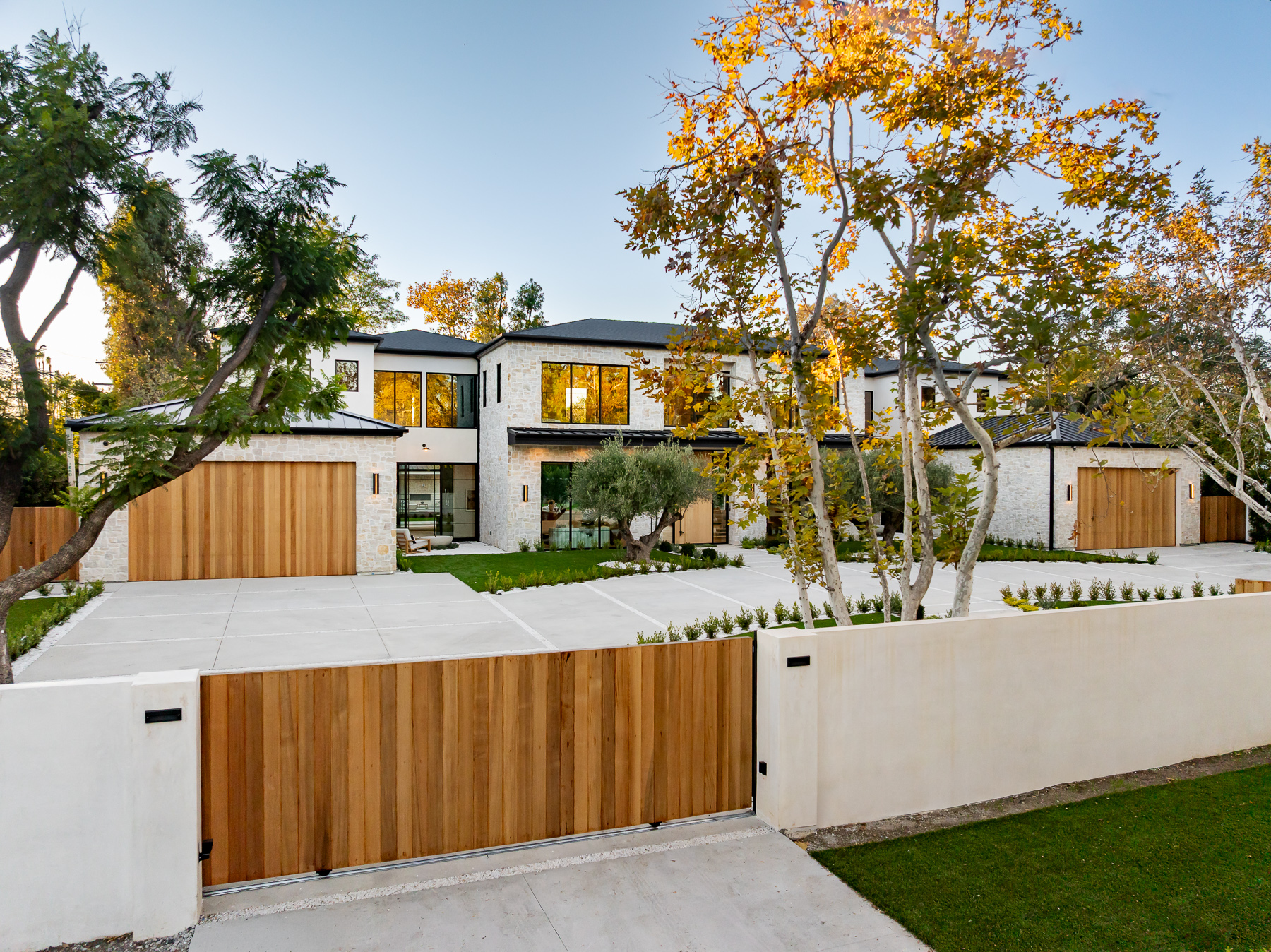 A masterpiece of comfort, design, and effortless luxury, this estate is thoughtfully curated by Studio Brinkley Design and delivers a lifestyle where every detail has been considered and nothing has been overlooked. The newly built residence spans over 10,000 square feet, offering unparalleled design and thoughtful craftsmanship. The grand foyer, with its soaring ceilings, welcomes you to an inviting formal living room featuring a striking fireplace, custom built-ins, and a sophisticated wet bar that flows seamlessly into the family room and chef's kitchen. Designed for both everyday living and effortless entertaining, the kitchen is a true centerpiece with double islands, Taj Mahal quartz countertops, chef-grade Wolf appliances, a walk-in pantry, and a full secondary prep kitchen. Sunlight fills the breakfast nook while expansive sliding doors create a perfect connection to the resort-style backyard. A glass-encased wine wall highlights the formal dining room, positioned adjacent to a private office that can also serve as an additional bedroom. The opposite wing of the home offers a spacious lower-level entertainment suite, complete with custom built-ins, a game and lounge area, and a dedicated home theatre, perfect for both hosting and relaxing. Throughout the residence, elegant paneling, designer finishes, and a state-of-the-art Control4 smart home system providing seamless automation for lighting, climate, security, and audio-visual experiences. A stunning staircase leads to four beautifully appointed en-suite bedrooms, including the primary retreat, a serene sanctuary with a fireplace, built-in wet bar, and two separate balconies, one offering a feeling of complete privacy with an outdoor sauna. The spa-inspired primary bath has dual vanities, a steam shower, a soaking tub, and an expansive custom closet. The backyard is an entertainer's paradise, with patios stretching the full length of the home, a covered outdoor living room with fireplace, a sparkling pool and spa, a fire pit, putting green, and sport court. A built-in barbecue area and pool house with an en-suite bath complete the resort-style setting. Additional features include an attached ADU with a private entrance, one bedroom, bath, and a versatile living area that can serve as a lounge, studio, or gym, ideal for guests or multigenerational living. The estate also offers a gated circular driveway and a two-car garage, all ideally positioned just moments from premier shops and celebrated local restaurants.