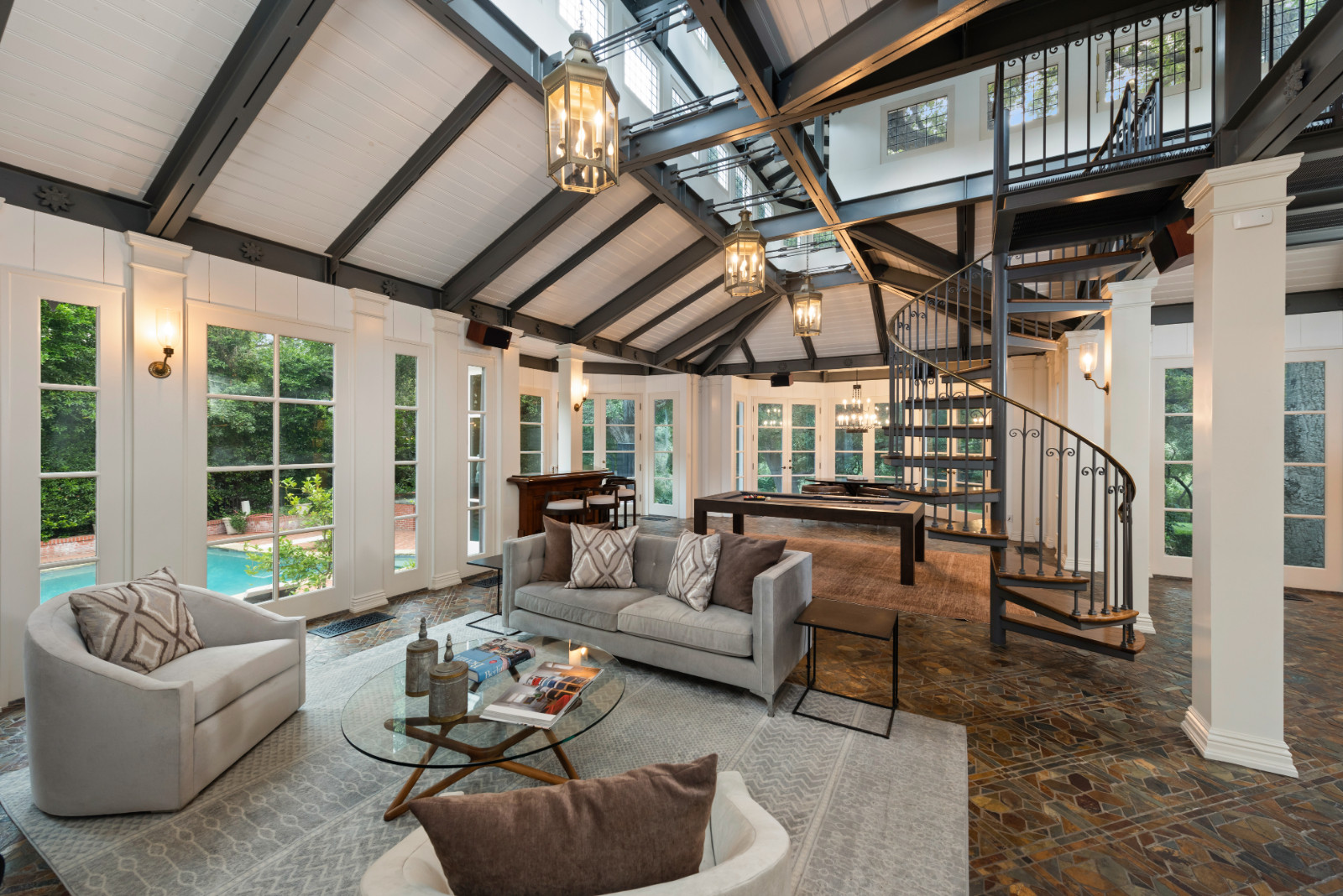 Welcome to this historic 1928 Colonial Estate by famed architect Myron Hunt, nestled on a peaceful tree-lined street, offering the ultimate comfort and convenience. Sprawling on a 2-acre lot with its own private tennis court, this well-maintained residence greets you with a grand circular driveway with motor court and a proper formal foyer. Perfect for any type of entertainment, this estate features expansive grounds with numerous areas for hosting parties and events, along with well-designed interior spaces that offer a spacious floor plan with 5 bedrooms and 5 bathrooms. Explore the main level and discover a large living room with fireplace, grand formal dining room that overlooks the centuries-old oak trees, a one-of-a-kind original 1920s kitchen with mahogany counters now used as a butler's pantry, and an impressive chef's kitchen with large island, indoor grill and original antique stove. The family room welcomes you with soaring beamed ceilings, a stunning two-story fireplace, custom built-in cocktail bar and dining area all that overlooks the pool and outdoor kitchen. Directly off the family room is the large pool and spa, complete with a big sun deck, outdoor BBQ bar and al fresco dining. Offering a world of privacy with lush landscaping throughout, the backyard features verdant rolling land with gorgeous knotty oak trees, private walking tails, fountains and ponds, a grand outdoor dining amphitheater and a main lounge area. Make your way down the lazy brick stairs to your newly completed full size private tennis court complete with reception landing area and shaded viewing lounge. Not to be overlooked, the estate is complete with a large 4-car garage and a sizable guest house above that is ready for anything you dream up. You do not want to miss this rare opportunity to own this gem!