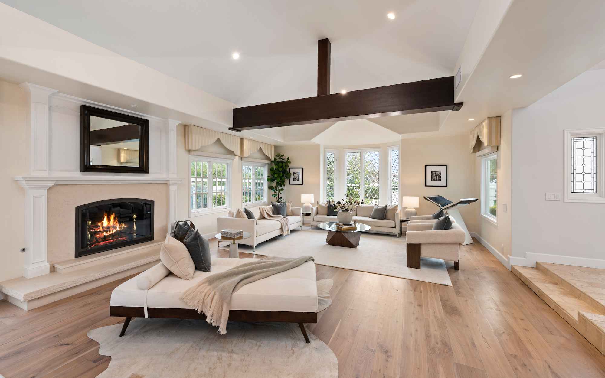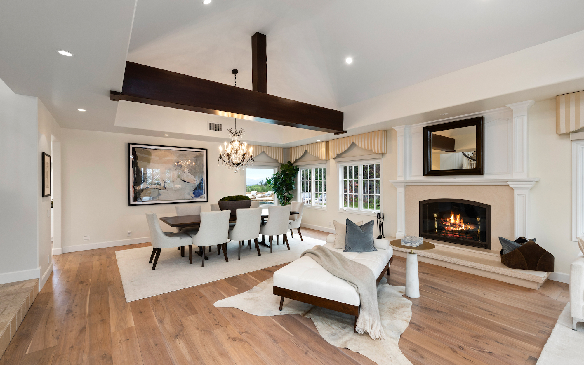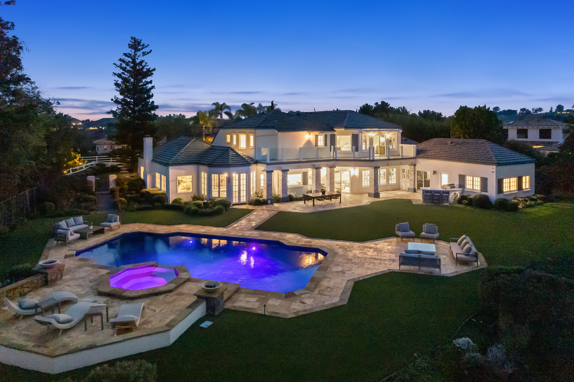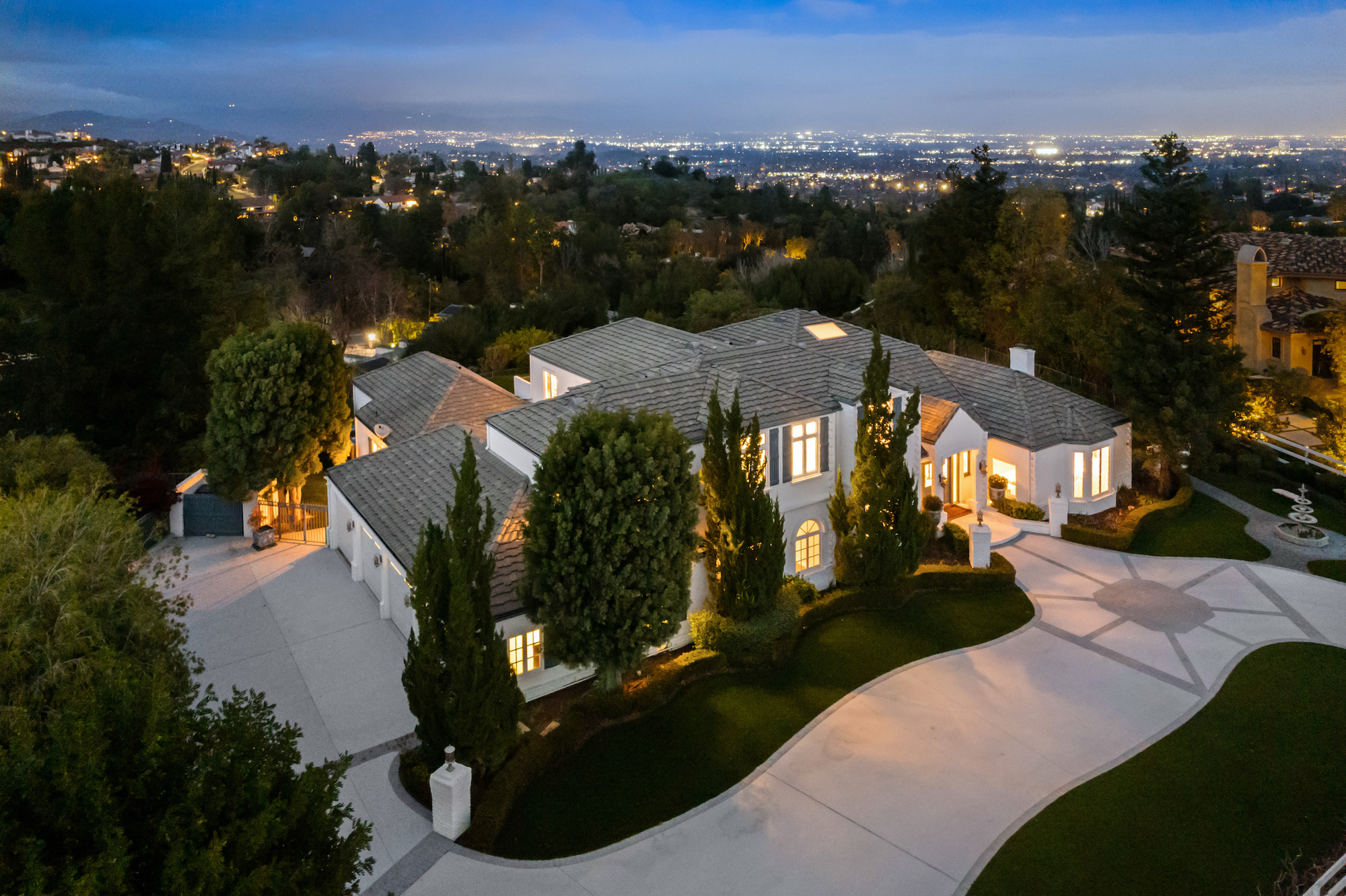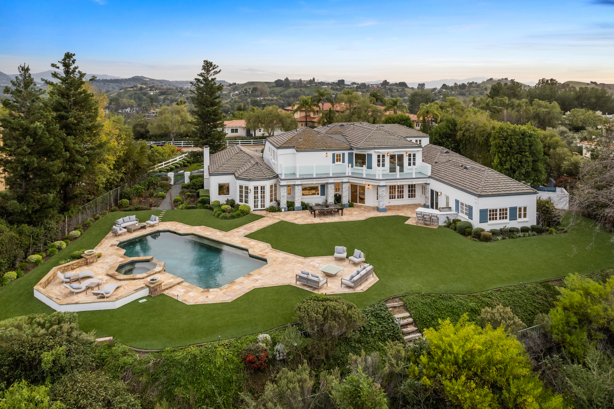 Welcome to 5933 Annie Oakley Rd, a Hidden Hills masterpiece that seamlessly blends timeless elegance with modern luxury. This stunning "Hamptons-style" classic underwent a major remodel in 2020, resulting in a French Farmhouse that feels like new construction. Enjoy the serenity of the location on a private cul-de-sac within the highly coveted 24-hour guard-gated enclave of Hidden Hills. The property boasts breathtaking, explosive city views that stretch across a 180-degree panorama. With meticulous attention to detail, this custom residence spans ~ 5,800 sq ft and is situated on over one acre of meticulously manicured gardens. As you enter the home, you are welcomed with an impressive interior, featuring 6 bedrooms and 6 baths, with a spacious and open-concept great room, adorned with open-beamed cathedral ceilings. The gourmet kitchen is complete with a grand center island and includes top-of-the-line appliances, granite counters, a farmhouse sink, and is complete with a cozy breakfast nook. Upstairs, the primary suite is a true retreat with open-beamed ceilings, a private balcony offering stunning city views and overlooks the grounds and a newly renovated, no-expense-spared lavish spa-like bathroom with soaking tub and steam shower. Additional amenities and features include a media room with wet bar, built-in BBQ area with al-fresco dining, a large custom salt-water pool and spa, a three-car garage with direct access, and a backup generator for the whole home. Experience the epitome of Hidden Hills living in this meticulously designed and thoughtfully upgraded residence. Don't miss the opportunity to call this masterpiece home, where luxury, sophistication, and panoramic views converge in an exceptional setting.
