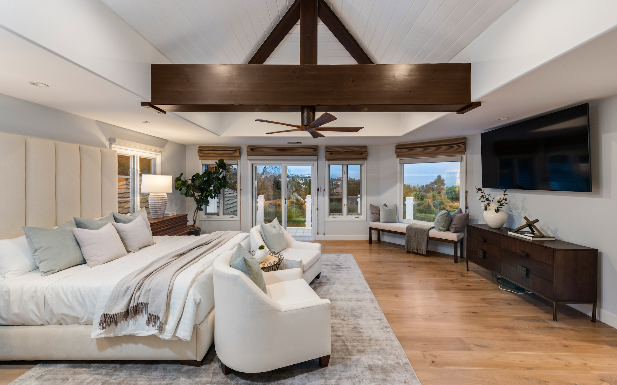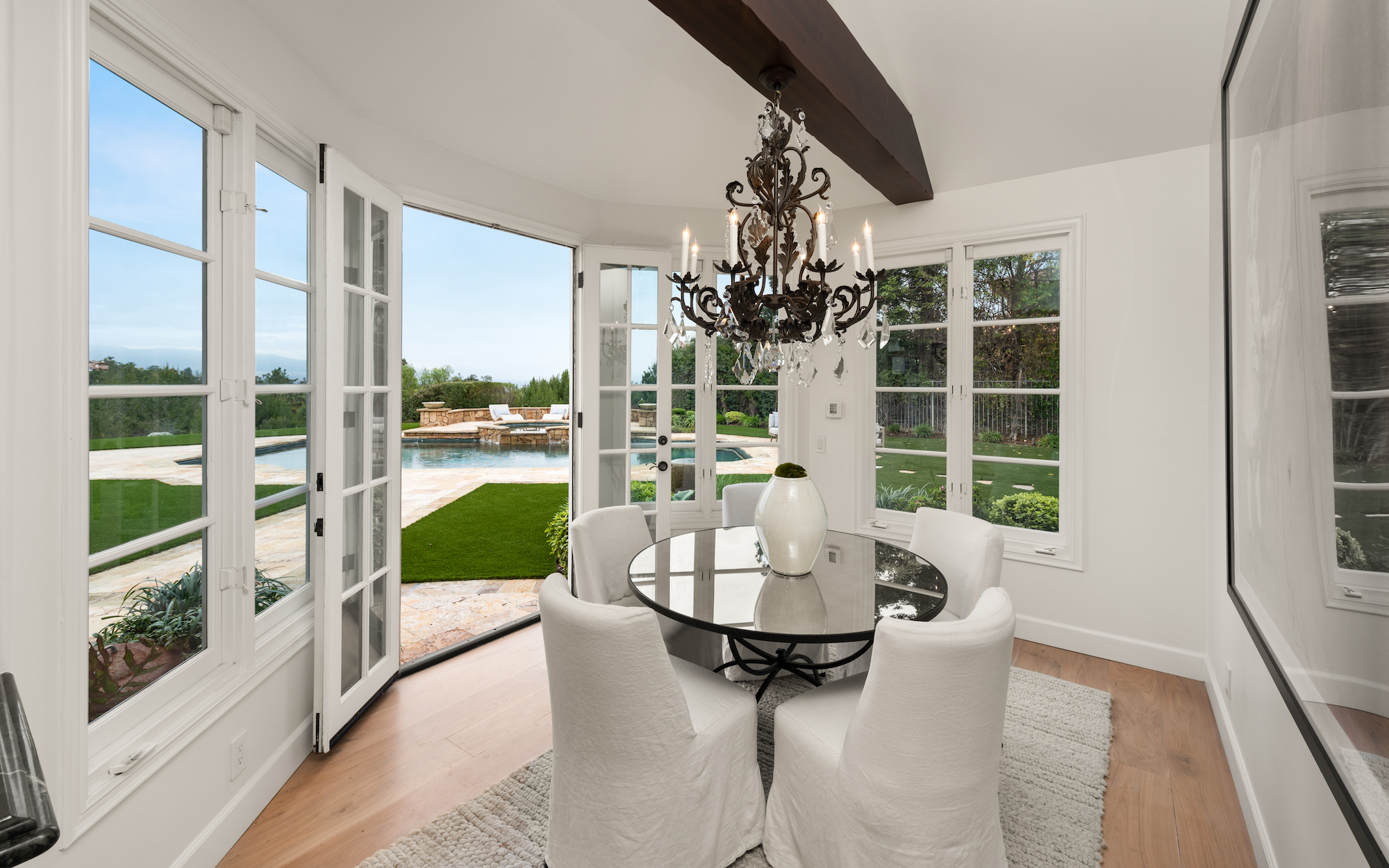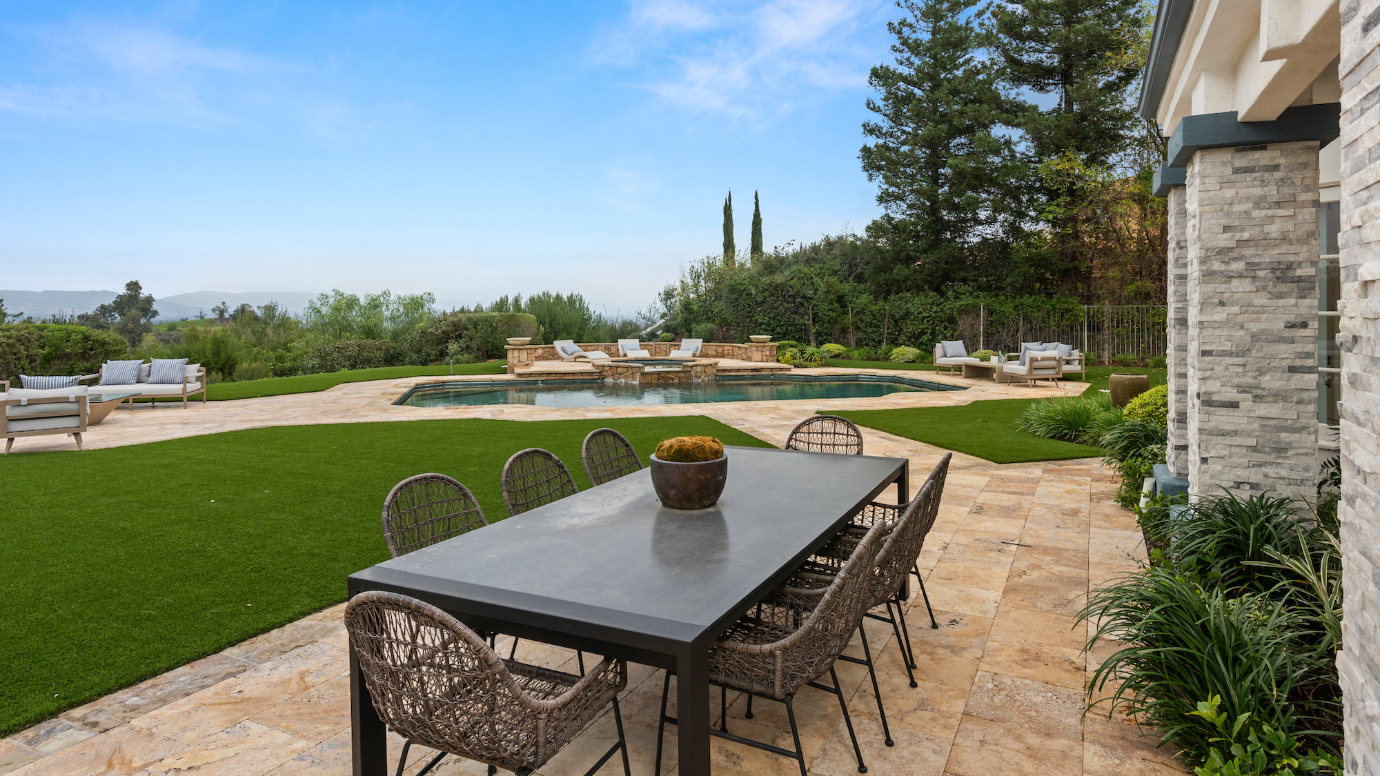string(1744) "Welcome to 5933 Annie Oakley Rd, a Hidden Hills masterpiece that seamlessly blends timeless elegance with modern luxury. This stunning "Hamptons-style" classic underwent a major remodel in 2020, resulting in a French Farmhouse that feels like new construction. Enjoy the serenity of the location on a private cul-de-sac within the highly coveted 24-hour guard-gated enclave of Hidden Hills. The property boasts breathtaking, explosive city views that stretch across a 180-degree panorama. With meticulous attention to detail, this custom residence spans ~ 5,800 sq ft and is situated on over one acre of meticulously manicured gardens. As you enter the home, you are welcomed with an impressive interior, featuring 6 bedrooms and 6 baths, with a spacious and open-concept great room, adorned with open-beamed cathedral ceilings. The gourmet kitchen is complete with a grand center island and includes top-of-the-line appliances, granite counters, a farmhouse sink, and is complete with a cozy breakfast nook. Upstairs, the primary suite is a true retreat with open-beamed ceilings, a private balcony offering stunning city views and overlooks the grounds and a newly renovated, no-expense-spared lavish spa-like bathroom with soaking tub and steam shower. Additional amenities and features include a media room with wet bar, built-in BBQ area with al-fresco dining, a large custom salt-water pool and spa, a three-car garage with direct access, and a backup generator for the whole home. Experience the epitome of Hidden Hills living in this meticulously designed and thoughtfully upgraded residence. Don't miss the opportunity to call this masterpiece home, where luxury, sophistication, and panoramic views converge in an exceptional setting."