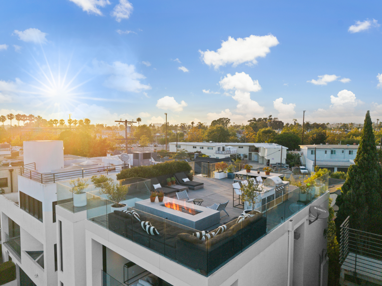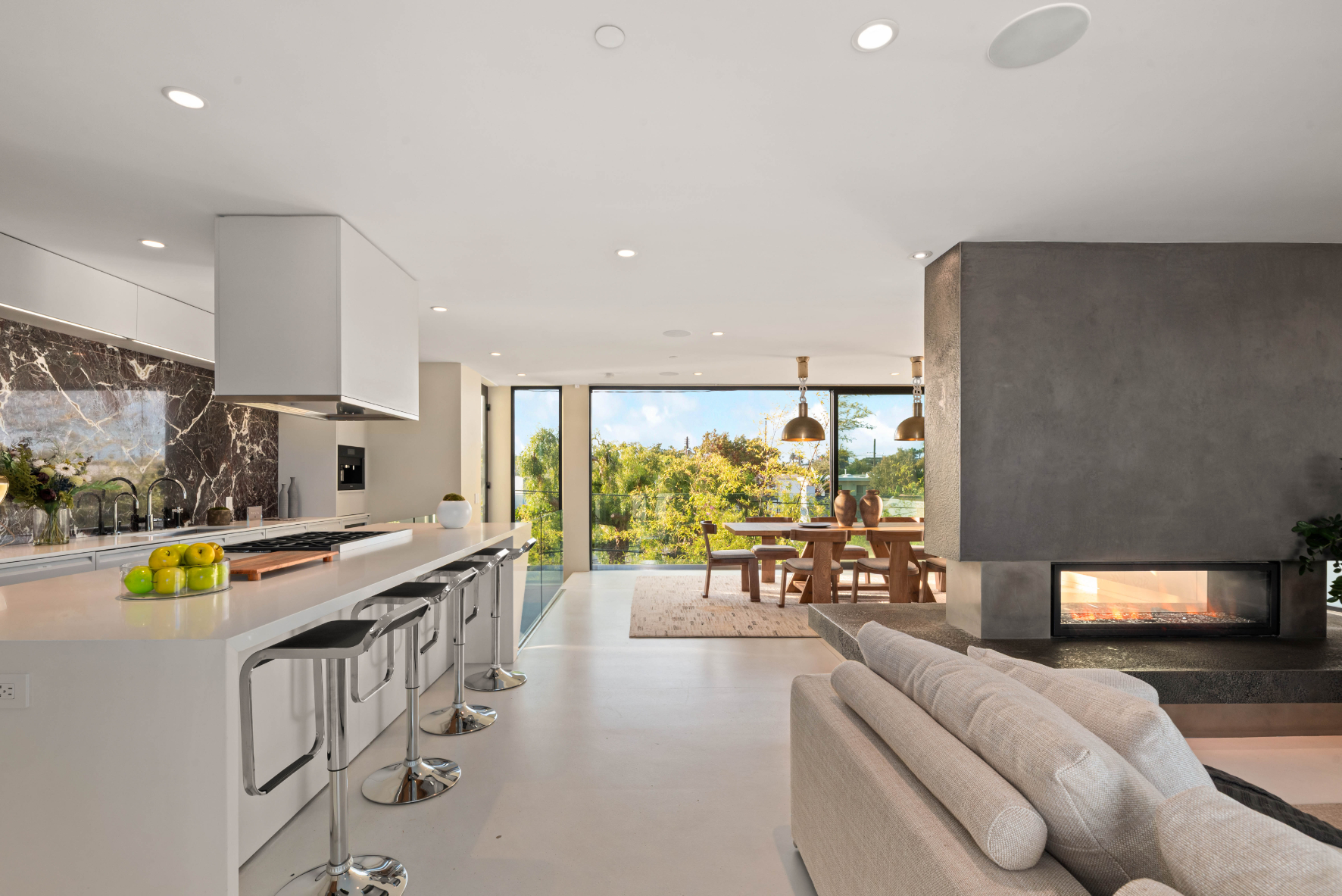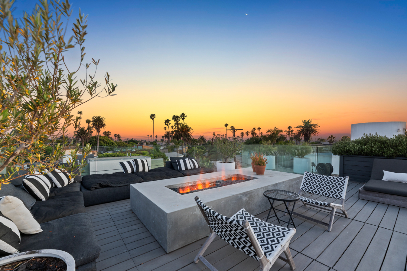 Welcome to 621 Mildred Avenue, a stunning architectural masterpiece nestled in the heart of Venice. This sleek, modern residence is the epitome of elevated coastal living, offering seamless indoor-outdoor flow, refined finishes, and thoughtfully curated design throughout. The main level features a bright, open-concept floor plan with floor-to-ceiling windows that flood the space with natural light and frame lush greenery. The dining area is anchored by a dramatic double-sided fireplace and enhanced by elegant pendant lighting, while the adjacent chef's kitchen showcases a sculptural island, integrated appliances, and a striking marble backsplash. Ascend to the expansive rooftop deck, an entertainer's dream with panoramic city views. This private oasis is complete with a built-in BBQ, lounge seating, dining area, and a linear fire pit, perfect for alfresco dining or sunset cocktails. Sophisticated yet welcoming, this home offers the ideal blend of comfort, style, and function in one of LA's most desirable neighborhoods.