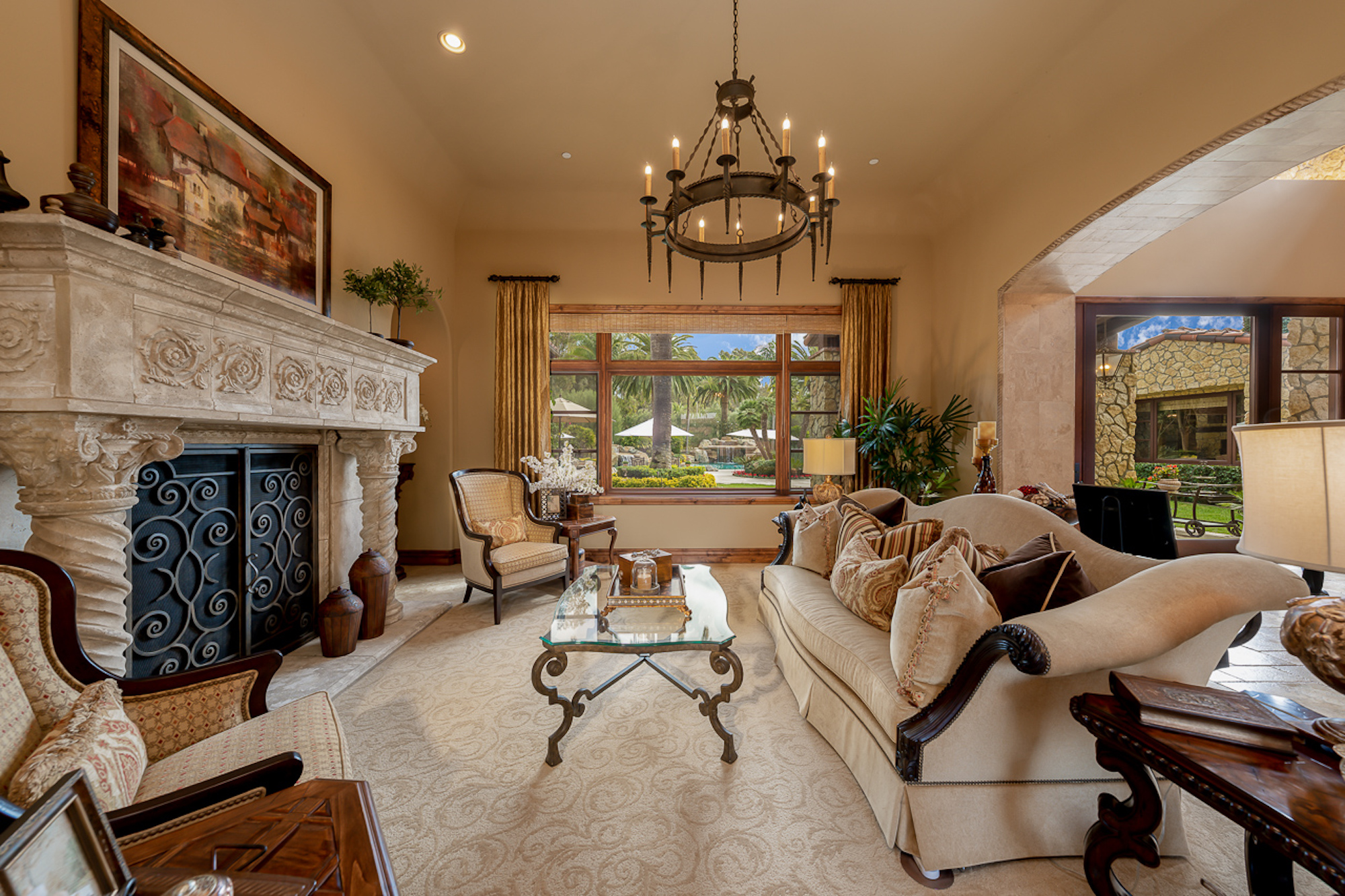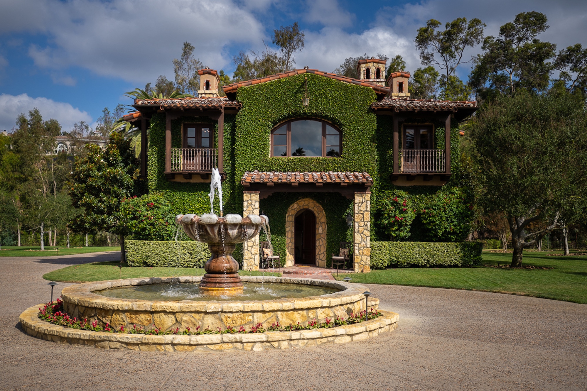 Experience a sprawling Mediterranean estate situated across 4.71 acres in coveted Rancho Santa Fe! A private gated entry leads to your own Tuscan villa through a circular drive with a serene fountain surrounded by four separate stone & vine covered structures with lush greenery. Meticulous attention to detail with a grand foyer, rustic stone tile, exposed wood beams, archways, soaring ceilings, abundant natural light with expansive windows & skylights, imposing fireplaces, and high-end fixtures & finishes throughout. A great room that is unparalleled in size and refinement, perfect for entertaining with an adjacent chef's kitchen, separate dining area, wine tasting room and billiard room.