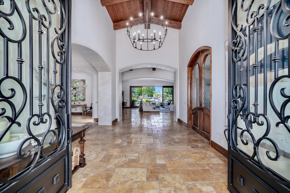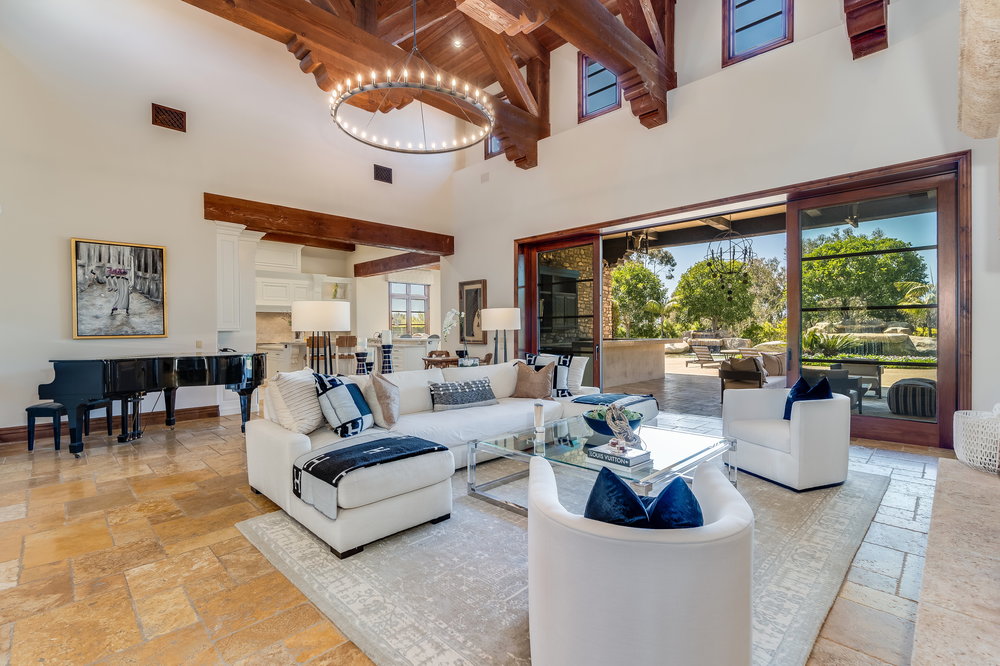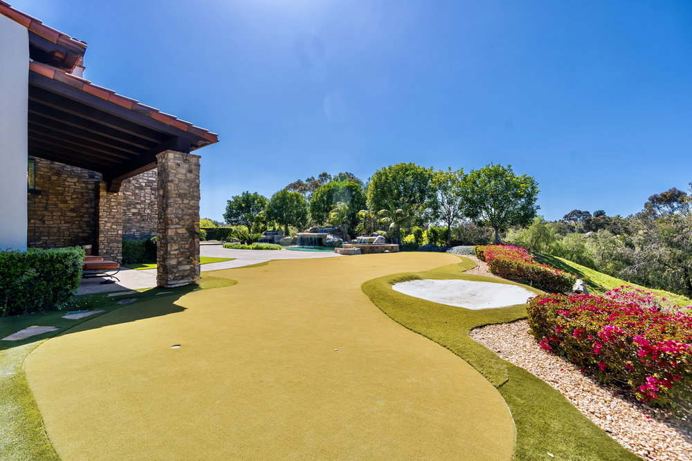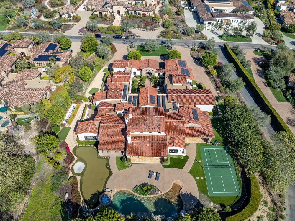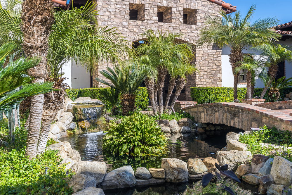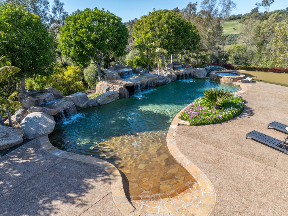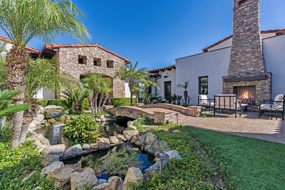 Experience the pinnacle of elegance and sophistication in this timeless custom estate, nestled within the prestigious guard-gated enclave of The Bridges at Rancho Santa Fe. Positioned on over two acres of private, tranquil grounds, this meticulously designed single-story residence with no steps offers breathtaking sunset views over the fairways of the renowned Bridges Golf Course. Sitting on one of the best and most private lots in The Bridges, this estate spans approximately 9, 788 square feet and is built to the highest standards, offering an unparalleled blend of luxury and comfort. Five ensuite bedrooms, including a private casita, provide versatile living spaces ideal for multi-generational living. A striking entrance sets the stage, where an arched bridge gracefully spans an oversized koi pond with a cascading waterfall, welcoming you into an atmosphere of serenity and refinement. Designed for grand-scale entertaining and intimate gatherings alike, the estate boasts a soaring open-beam ceiling in the great room, a formal dining room with a domed ceiling, a wood-paneled office, a state-of-the-art theater, and a billiards room complete with a wine cellar and full bar. The chefs kitchen is a culinary masterpiece, featuring quartz countertops, elegant white cabinetry with glass uppers, a new farmhouse sink, an oversized butlers pantry, and top-of-the-line stainless steel appliances. The Primary suite offers a luxurious retreat, with a fully remodeled sanctuary-like bathroom featuring top-tier finishes and great closet space.