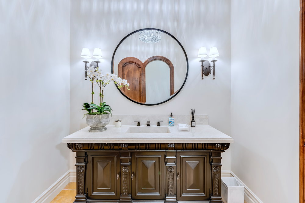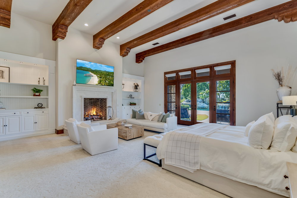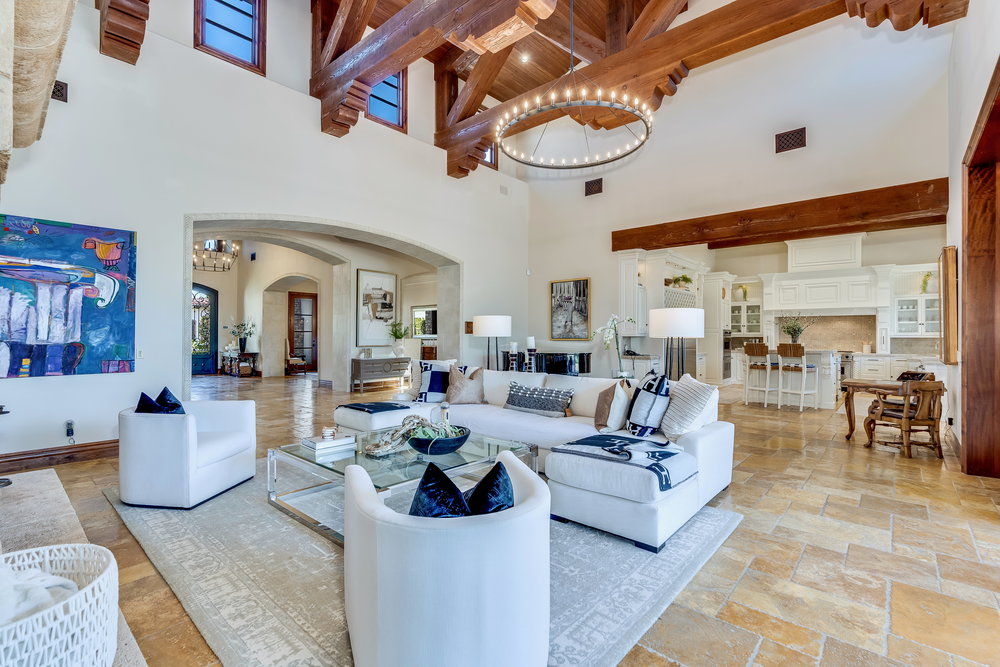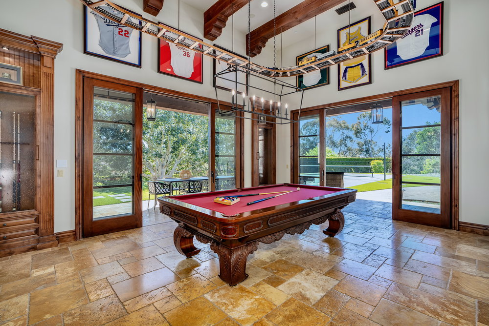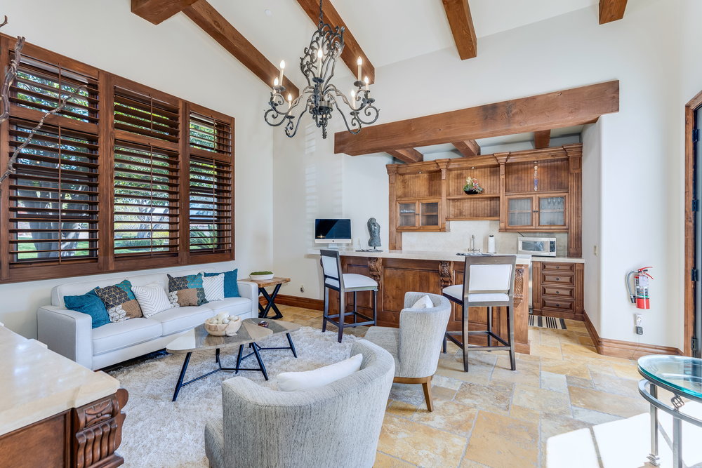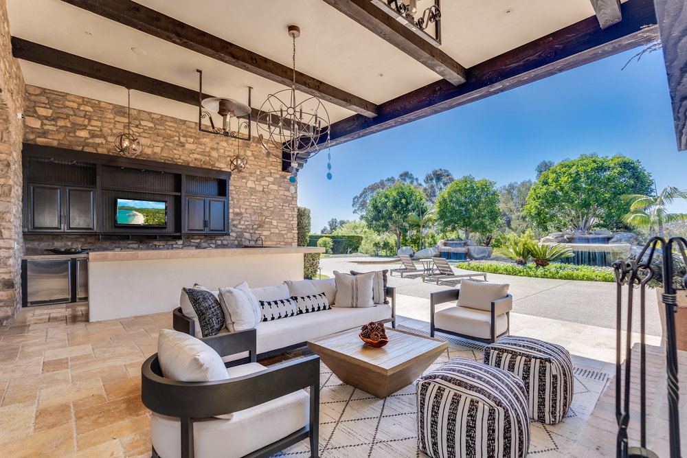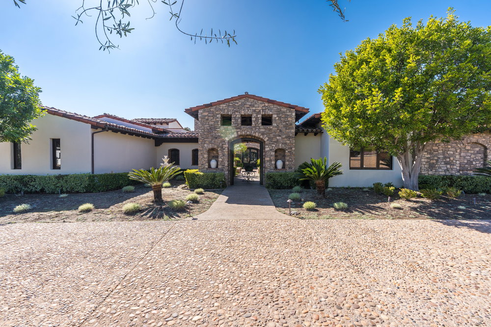 Experience the pinnacle of elegance and sophistication in this timeless custom estate, nestled within the prestigious guard-gated enclave of The Bridges at Rancho Santa Fe. Positioned on over two acres of private, tranquil grounds, this meticulously designed single-story residence with no steps offers breathtaking sunset views over the fairways of the renowned Bridges Golf Course. Sitting on one of the best and most private lots in The Bridges, this estate spans approximately 9, 788 square feet and is built to the highest standards, offering an unparalleled blend of luxury and comfort. Five ensuite bedrooms, including a private casita, provide versatile living spaces ideal for multi-generational living. A striking entrance sets the stage, where an arched bridge gracefully spans an oversized koi pond with a cascading waterfall, welcoming you into an atmosphere of serenity and refinement. Designed for grand-scale entertaining and intimate gatherings alike, the estate boasts a soaring open-beam ceiling in the great room, a formal dining room with a domed ceiling, a wood-paneled office, a state-of-the-art theater, and a billiards room complete with a wine cellar and full bar. The chefs kitchen is a culinary masterpiece, featuring quartz countertops, elegant white cabinetry with glass uppers, a new farmhouse sink, an oversized butlers pantry, and top-of-the-line stainless steel appliances. The Primary suite offers a luxurious retreat, with a fully remodeled sanctuary-like bathroom featuring top-tier finishes and great closet space.