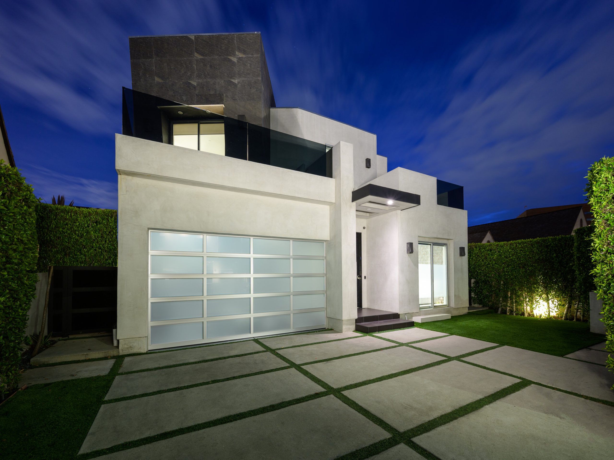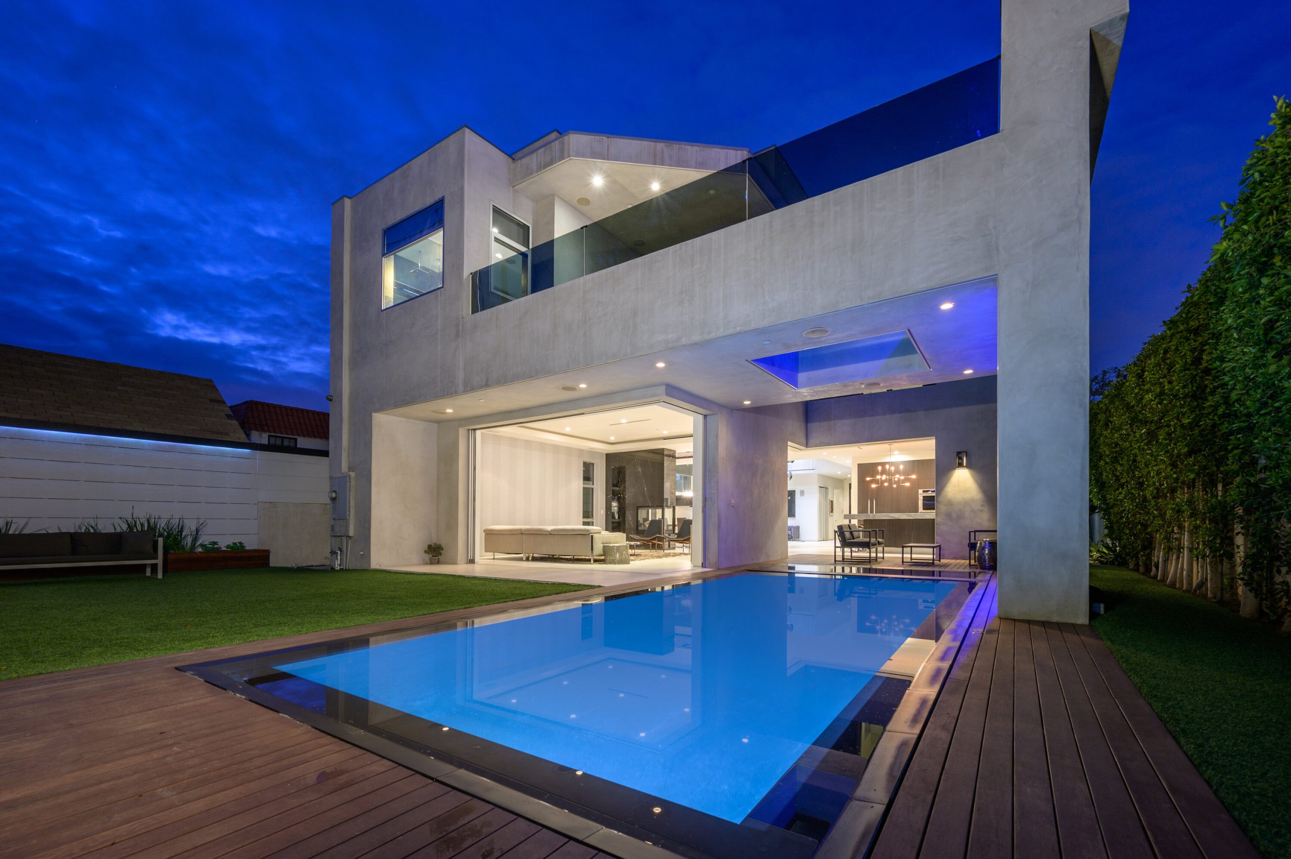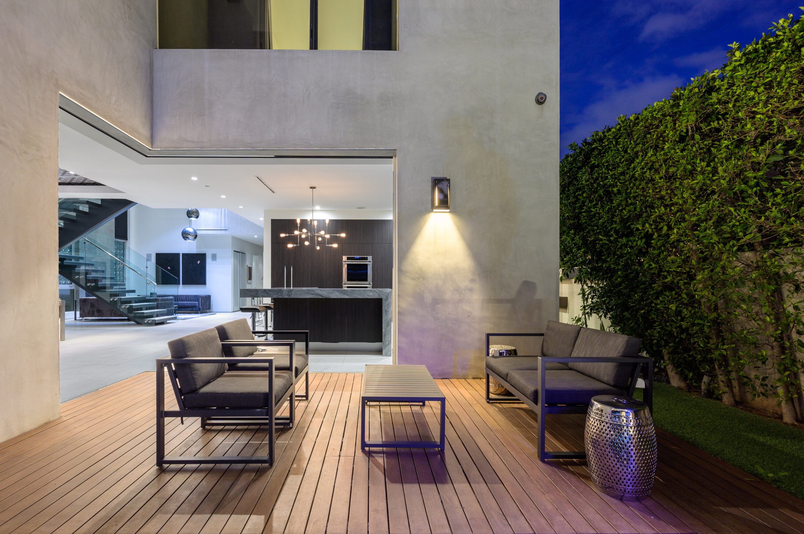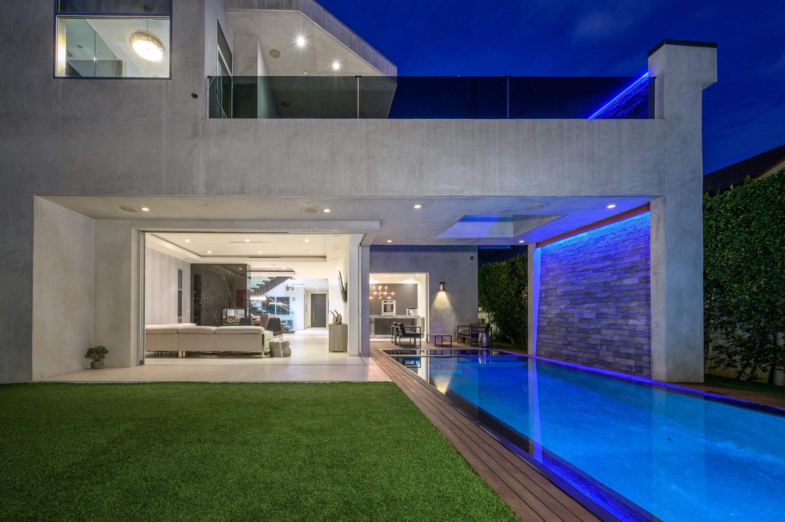 Indoor and outdoor living merge gracefully into one at this modern Beverly Grove Villa. Privacy abounds at this Smart Home beyond the gated entrance with tall foliage. The home showcases several beautiful living spaces and 5 bedroom suites each with their own private patios. The modern interior is bathed in natural light throughout. The dramatic two-story living room is bright, open and inviting with the vertical fireplace reaching up to the second level. The chef's kitchen with top of the line appliances and a waterfall island offers views of the pool, spa and grass area through the walls of glass that vanish. A floating staircase leads upstairs to the bedroom sanctuaries. The primary suite showcases a stunning fireplace, luxurious bathroom with a frameless glass shower and soaking tub, and a spacious walk in closet.