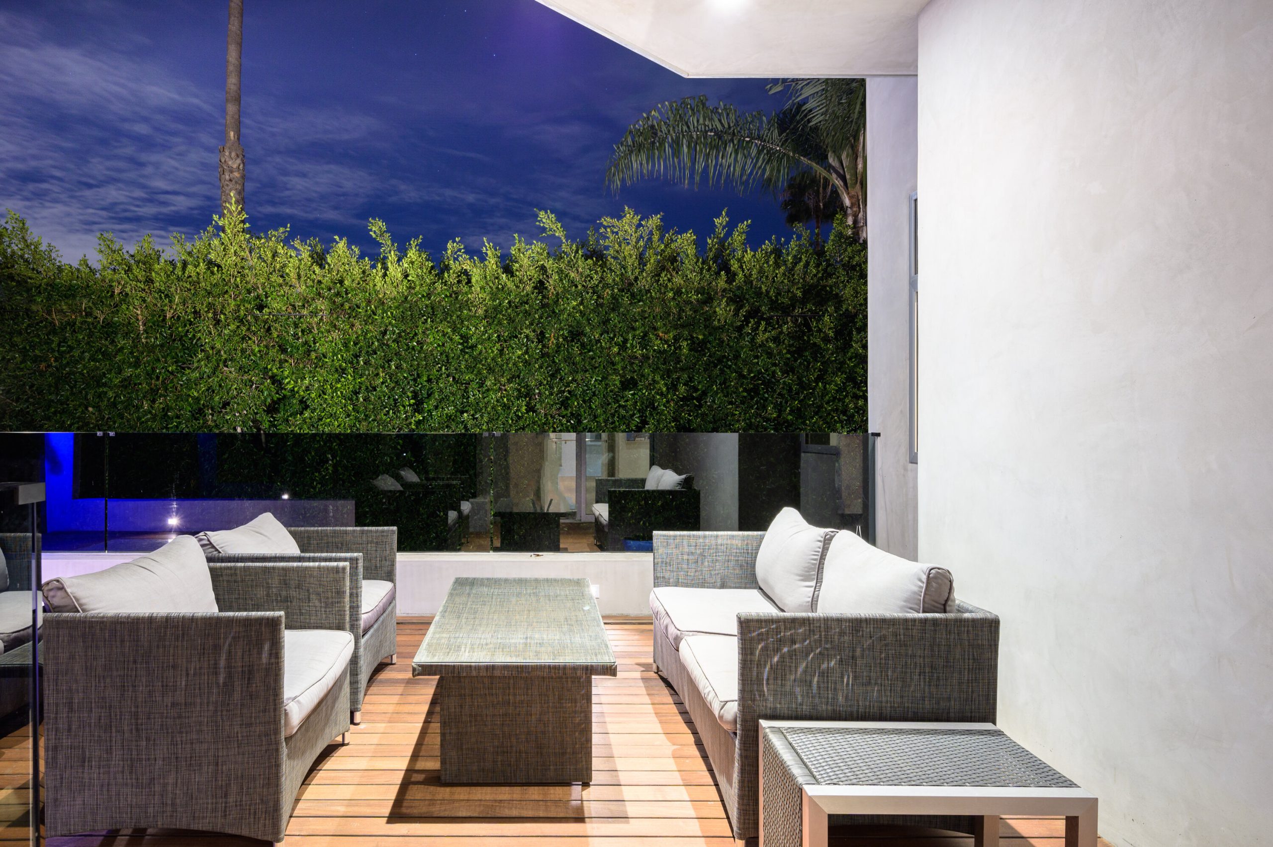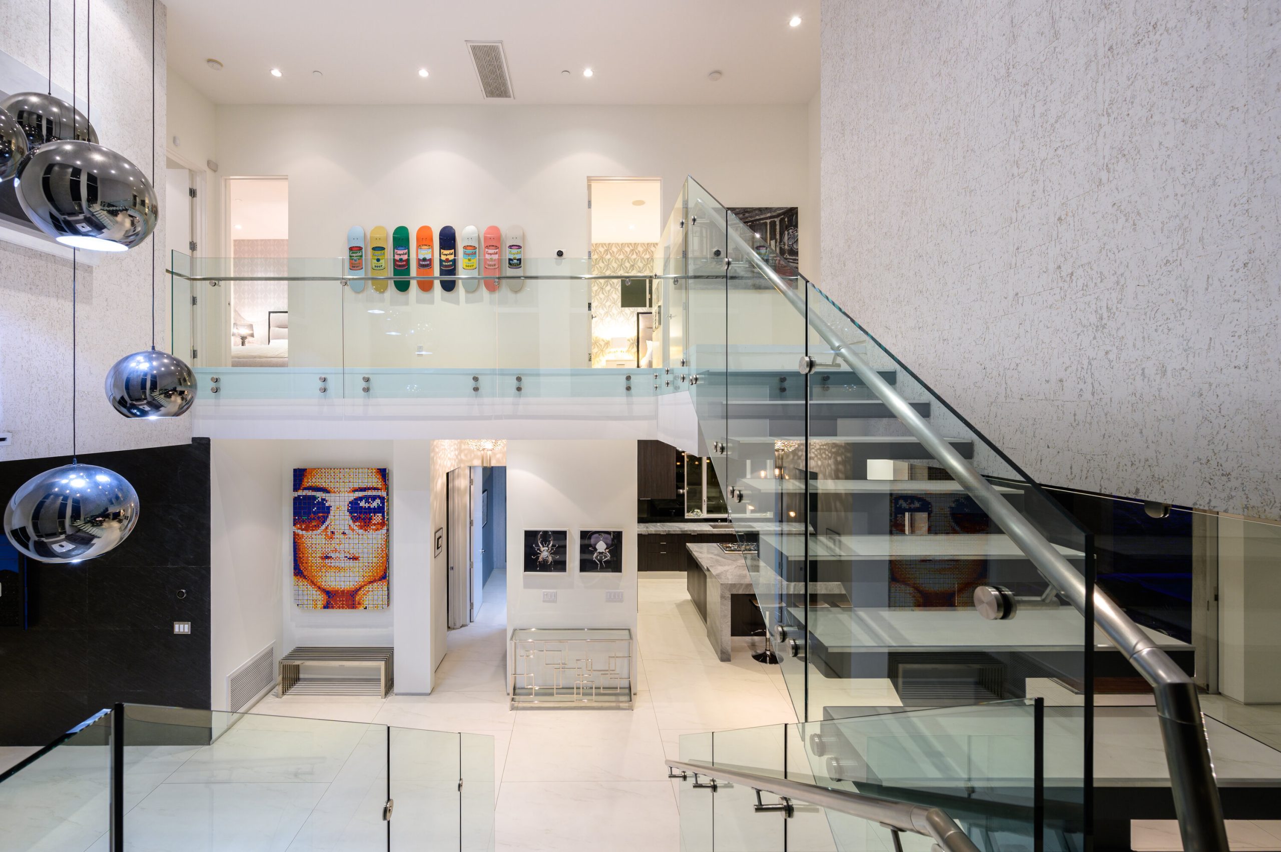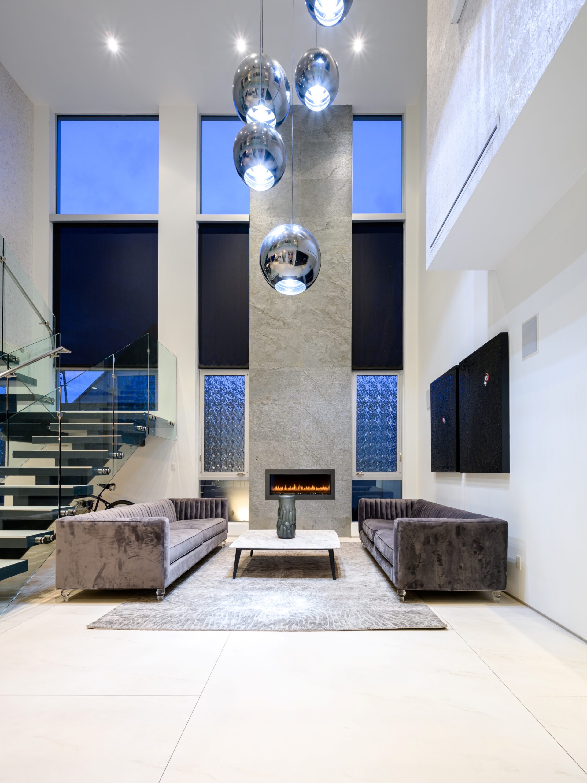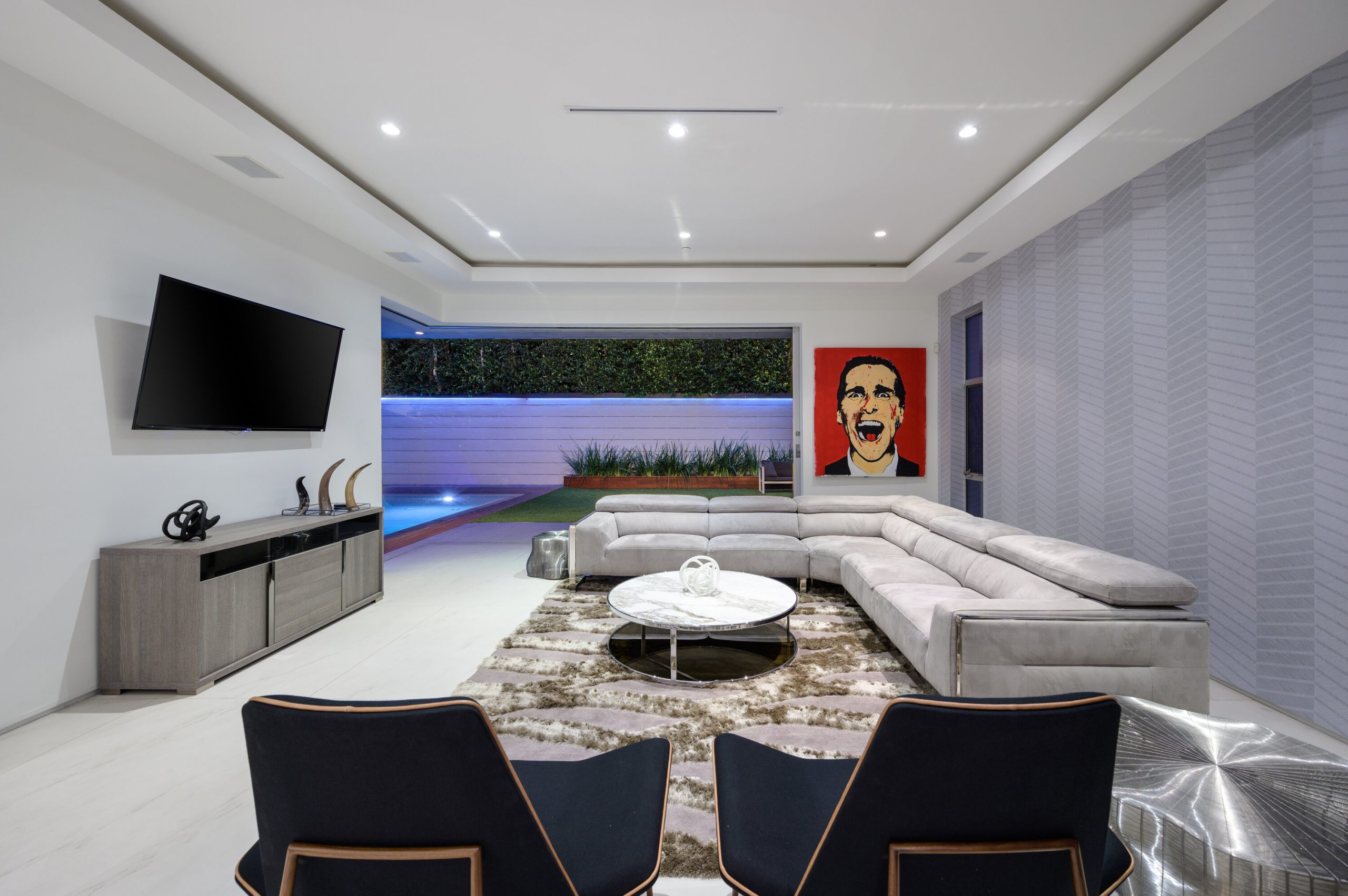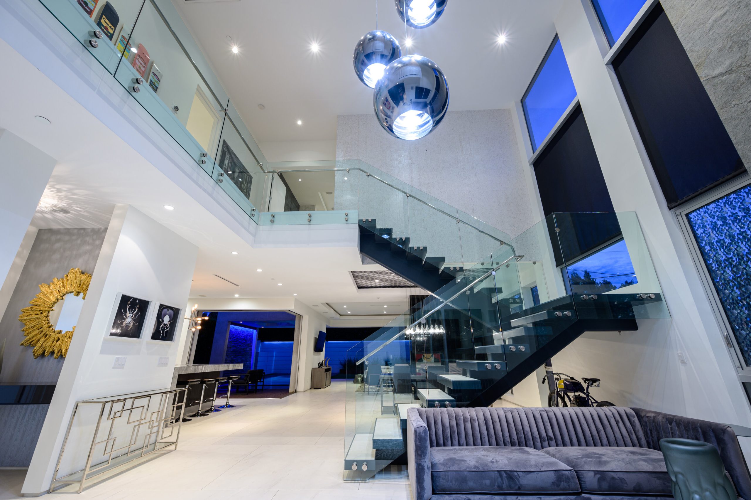 Indoor and outdoor living merge gracefully into one at this modern Beverly Grove Villa. Privacy abounds at this Smart Home beyond the gated entrance with tall foliage. The home showcases several beautiful living spaces and 5 bedroom suites each with their own private patios. The modern interior is bathed in natural light throughout. The dramatic two-story living room is bright, open and inviting with the vertical fireplace reaching up to the second level. The chef's kitchen with top of the line appliances and a waterfall island offers views of the pool, spa and grass area through the walls of glass that vanish. A floating staircase leads upstairs to the bedroom sanctuaries. The primary suite showcases a stunning fireplace, luxurious bathroom with a frameless glass shower and soaking tub, and a spacious walk in closet.