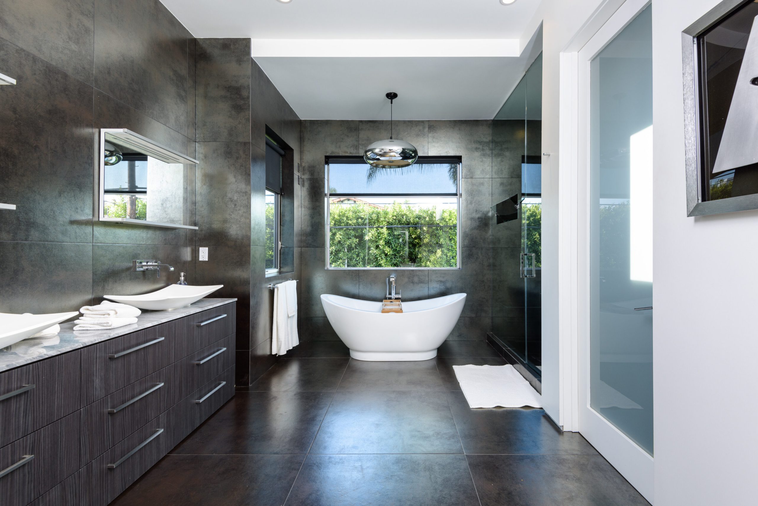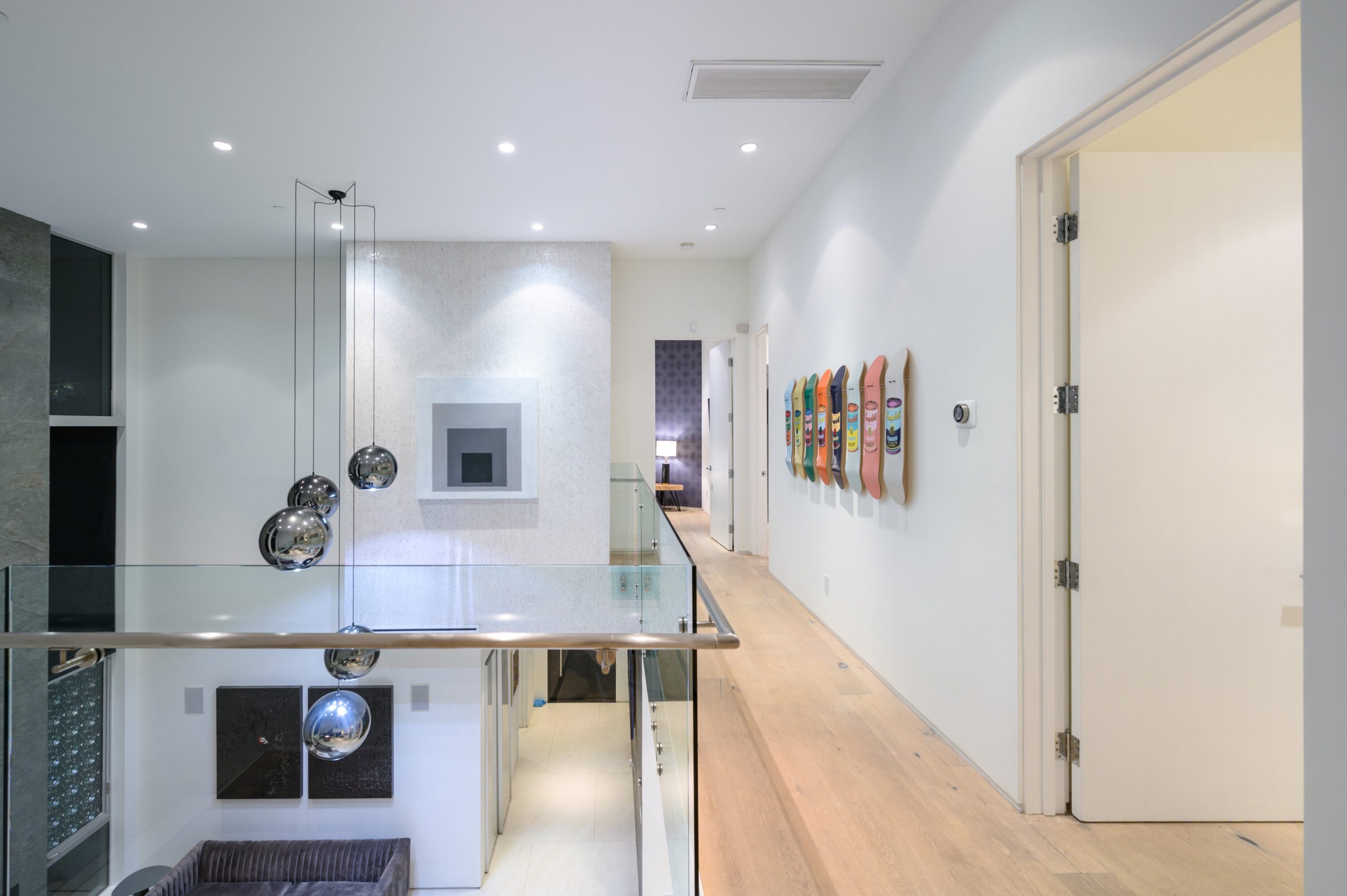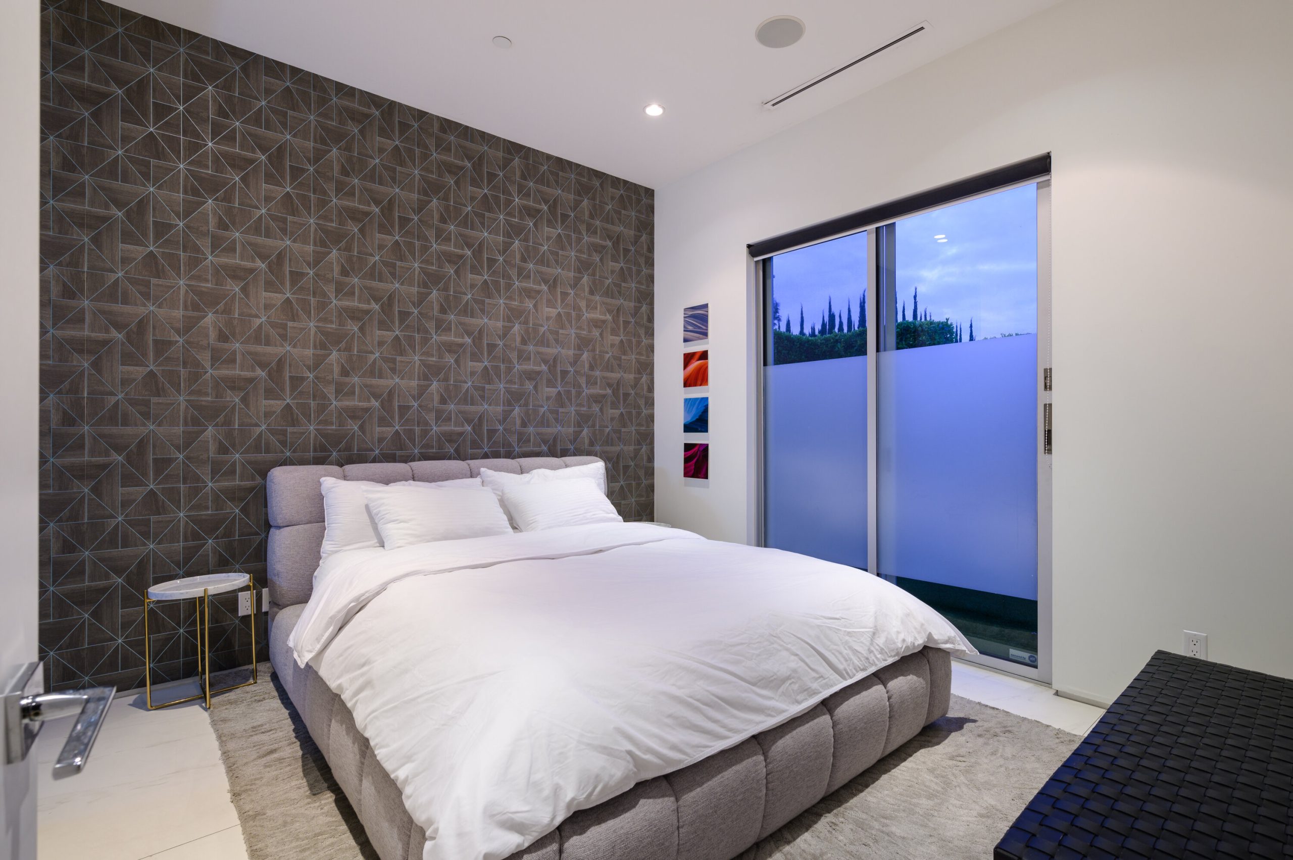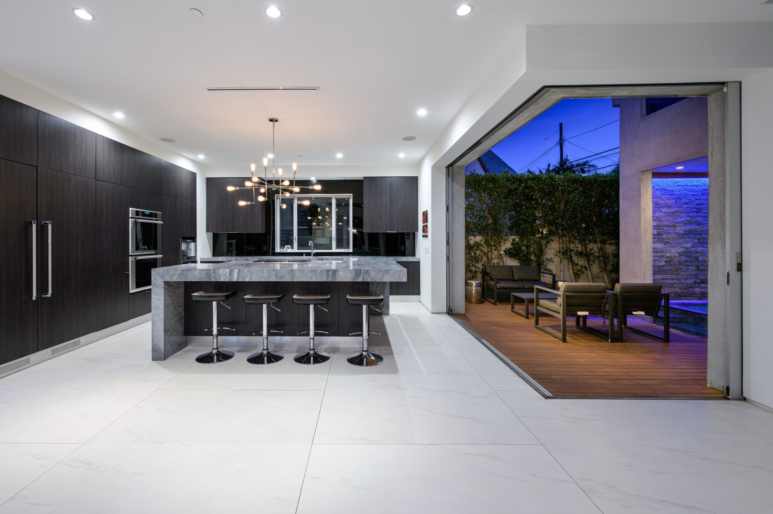Indoor and outdoor living merge gracefully into one at this modern Beverly Grove Villa. Privacy abounds at this Smart Home beyond the gated entrance with tall foliage. The home showcases several beautiful living spaces and 5 bedroom suites each with their own private patios. The modern interior is bathed in natural light throughout. The dramatic two-story living room is bright, open and inviting with the vertical fireplace reaching up to the second level. The chef's kitchen with top of the line appliances and a waterfall island offers views of the pool, spa and grass area through the walls of glass that vanish. A floating staircase leads upstairs to the bedroom sanctuaries. The primary suite showcases a stunning fireplace, luxurious bathroom with a frameless glass shower and soaking tub, and a spacious walk in closet.