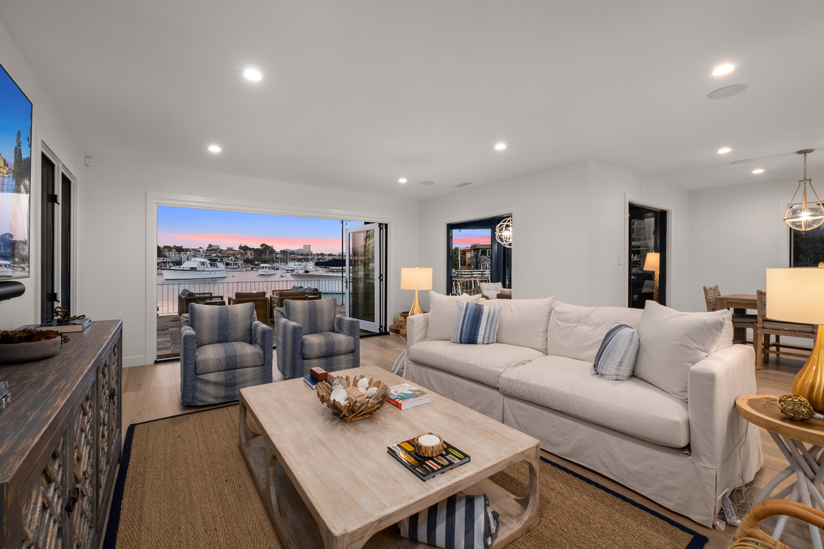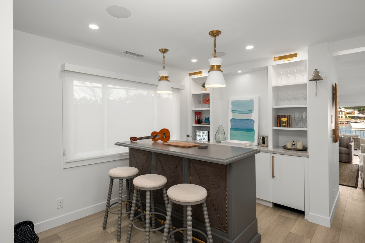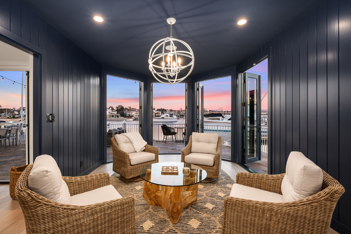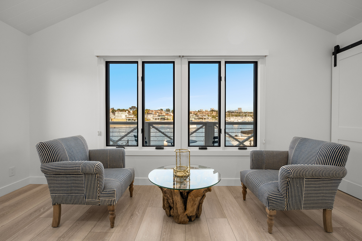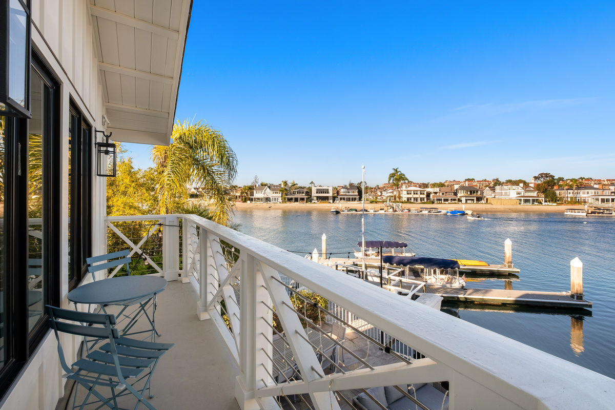 Among the most exclusive addresses in Newport Beach, this extraordinary property is one of only eight homes on private-gated Collins Island, capturing pristine harbor views from every vantage point. The huge 6,000 sq ft lot hosts a completely reimagined residence that has recently been remodeled inside and out, with 150 linear feet on the water and two dock spaces to accommodate approx. 71' and 43' boats. A light-filled foyer beckons to three private suites and a main-level great room designed for entertaining, with Lutron controlled lighting installed throughout. Wide-plank floors and bronze finishes enhance a light, airy ambience in the gourmet kitchen and bar, equipped with the finest finishes and chef-level appliances. The Craftsman-inspired living area displays stained glass and built-ins flanking a fireplace, vanishing through bi-fold doors to a waterfront patio with a fire pit and abundant space to dine under the stars, while a unique sunroom living area proceeds through multiple doors to the patio for tranquil indoor-outdoor enjoyment. Retreat upstairs to the stunning primary suite with a sitting area and sunroom/office, private view balcony, stunning primary bath, and vaulted open-beamed ceilings. Each secondary bedroom has an en-suite bath for ultimate privacy and convenience, with one guest suite downstairs. Enjoy shops and dining within blocks on Balboa Island and Marine Ave, or take the ferry across to the Balboa Peninsula. Rare and charming, this is a legacy property unlike any other.
