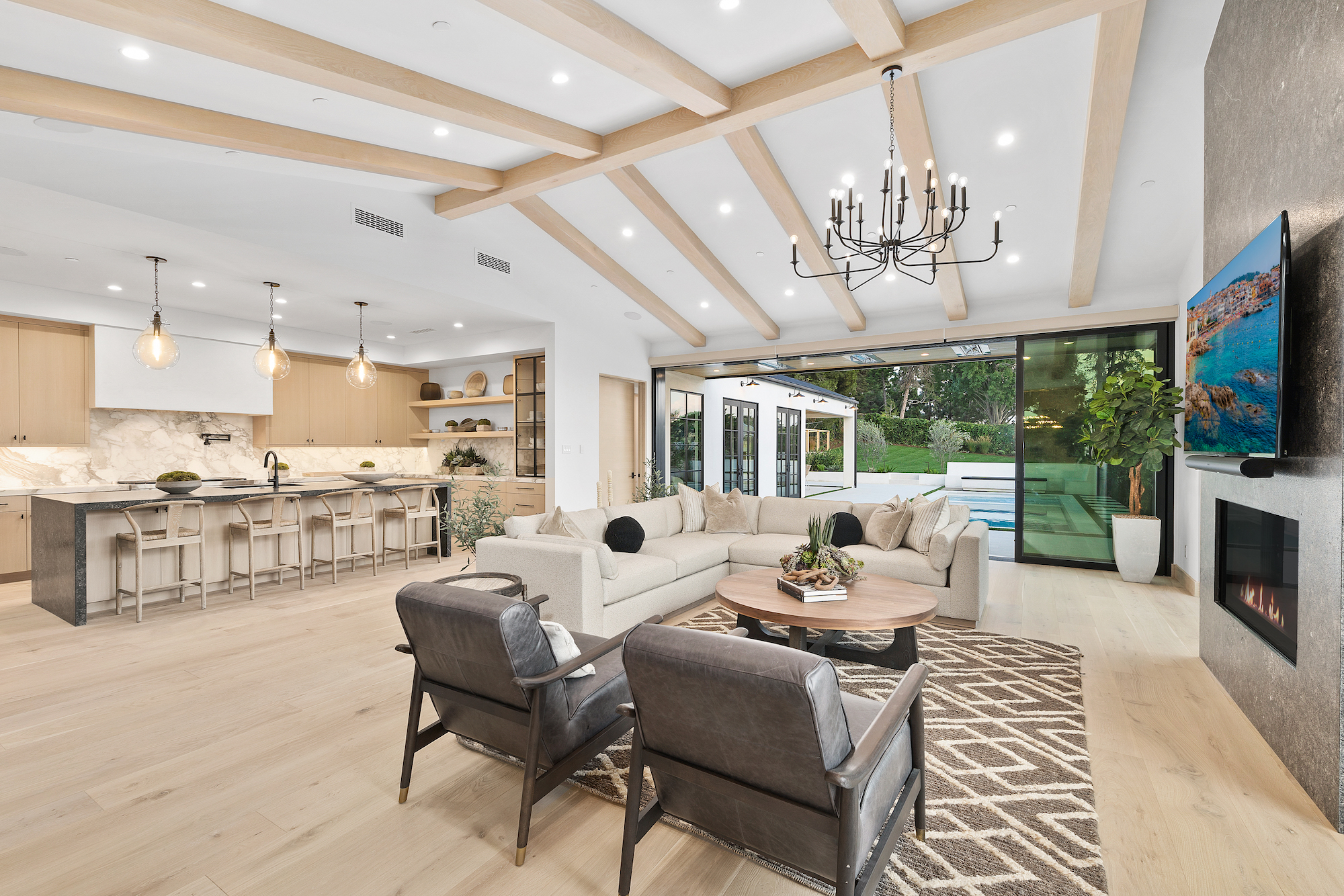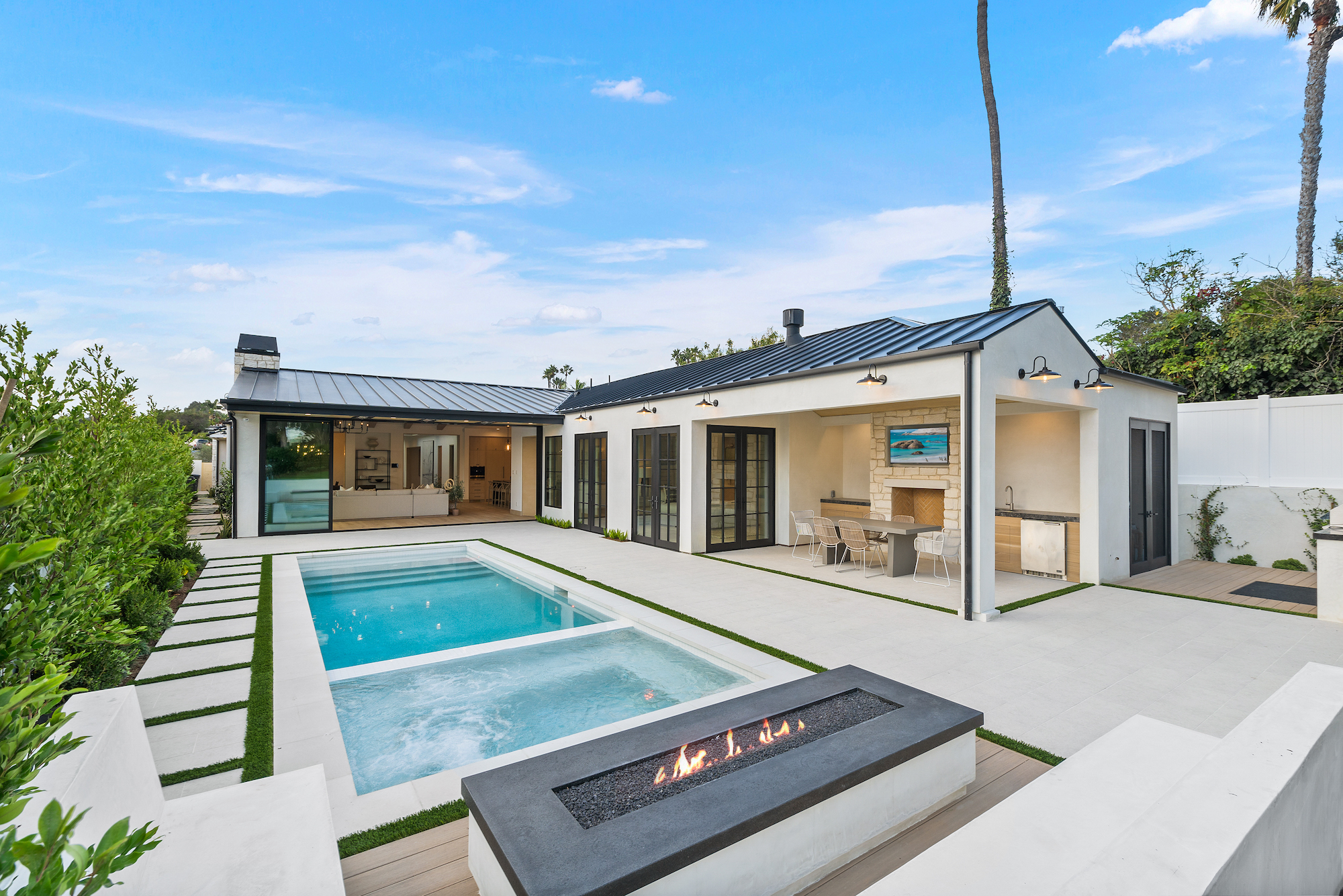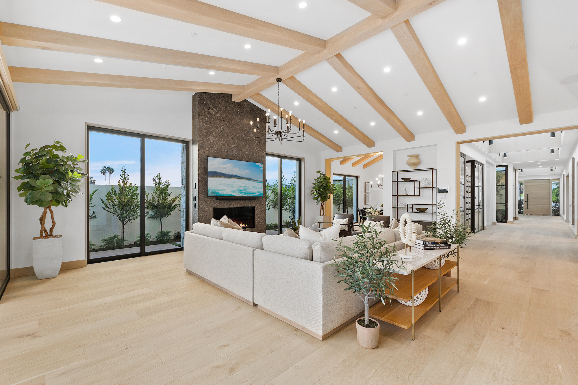 Introducing Corona del Mar s newest luxury retreat. Construction has just been completed on this modern architectural home set in the Irvine Terrace enclave. Situated on a flat lot of over 9,600 sq. ft. with direct access through a vast lawn space to Irvine Terrace Park, the design by architect Eric Aust embraces the highest quality construction and finishes throughout over 5,000 sq.ft.of single level living space, incorporating tumbled limestone slab and honed marble offset by rich, antique brass for a bold yet sophisticated look. Enjoy the massive open outdoor entertainment area, where a covered California room transitions to a sun-kissed pool and spa including a sitting fire pit lounge and built-in barbeque.The modern open floor plan hosts a work-from-home office, separate media room and five en-suite bedrooms, including a decadent primary suite with his-and-her walk-in closets, spa-like bath, private fireplace and multiple exterior access points. The light-filled great room with tall vaulted beamed ceilings is ideal for entertaining and day-to-day relaxation. From there, effortlessly move the dining space with dual wine vaults or outside through vast sliding doors and casual dining at the kitchen waterfall edge island. An additional dirty kitchen with walk-in cooler and range allows flexibility for events. The separate Two-door, three-car garage allows ample vehicle parking. The fully integrated smart home system adds all modern amenities to be expected in a home of this caliber. A true modern masterpiece, be the first to live in this brand-new jewel of Corona Del Mar. Centrally located and nearby to Fashion Island,Balboa Island, Newport Country Club, Balboa Bay Club all local dining and shopping.