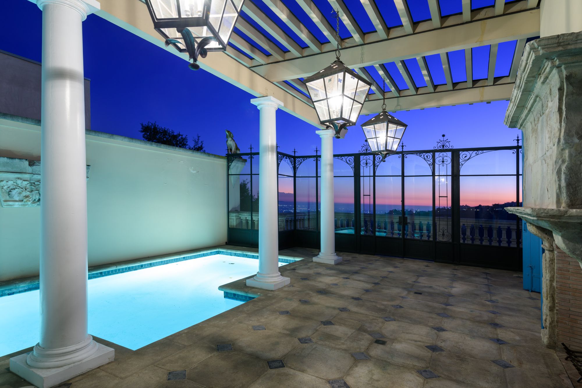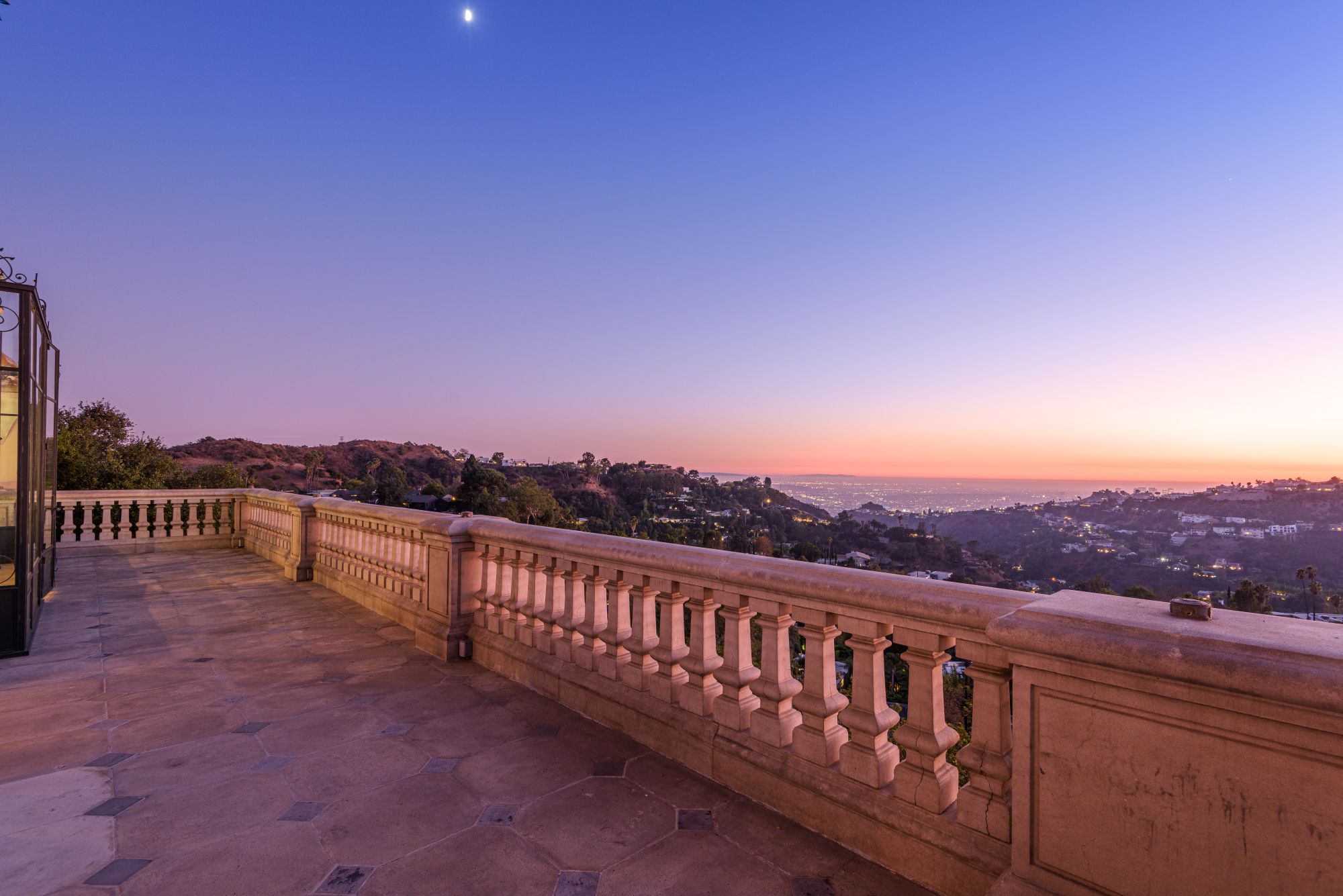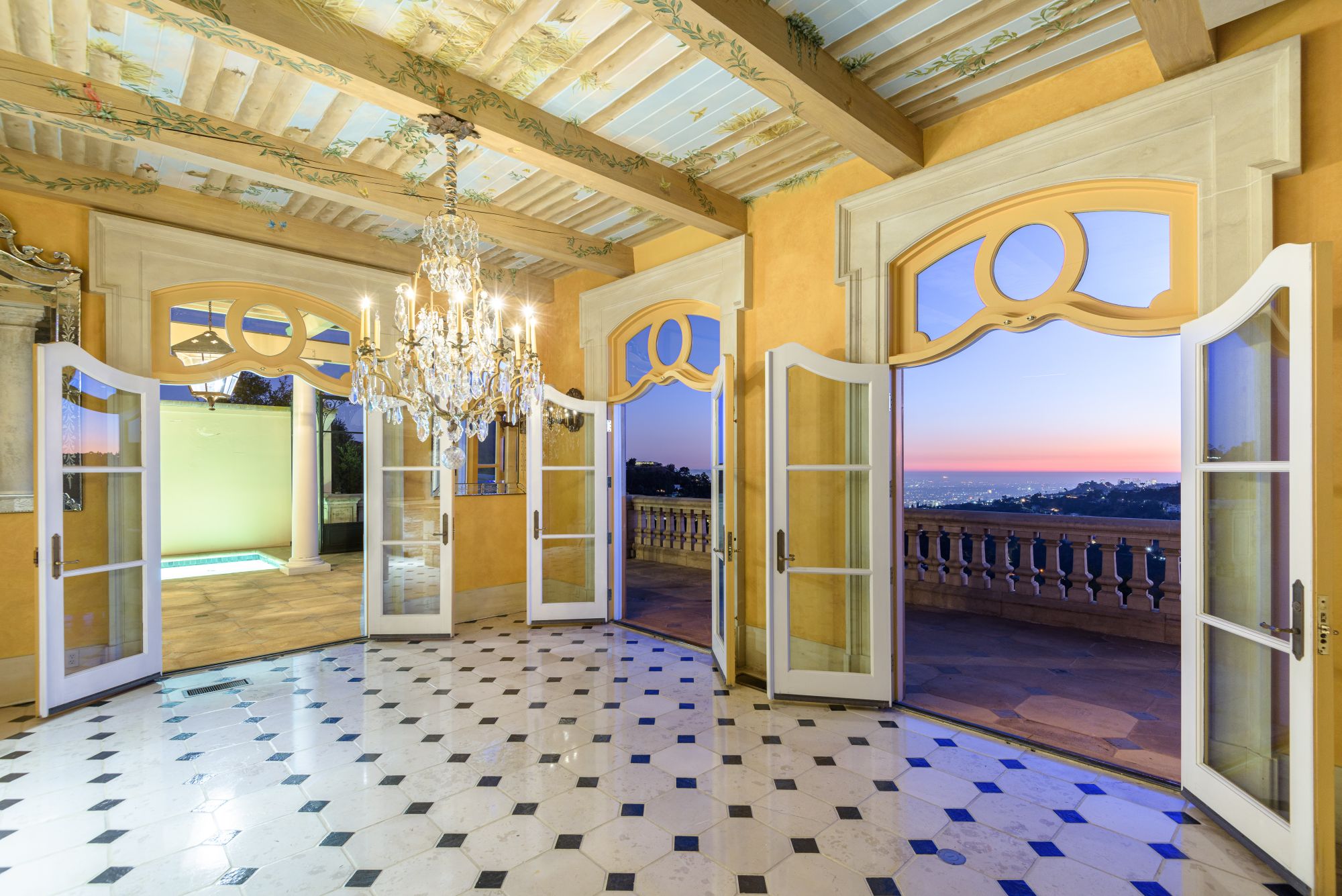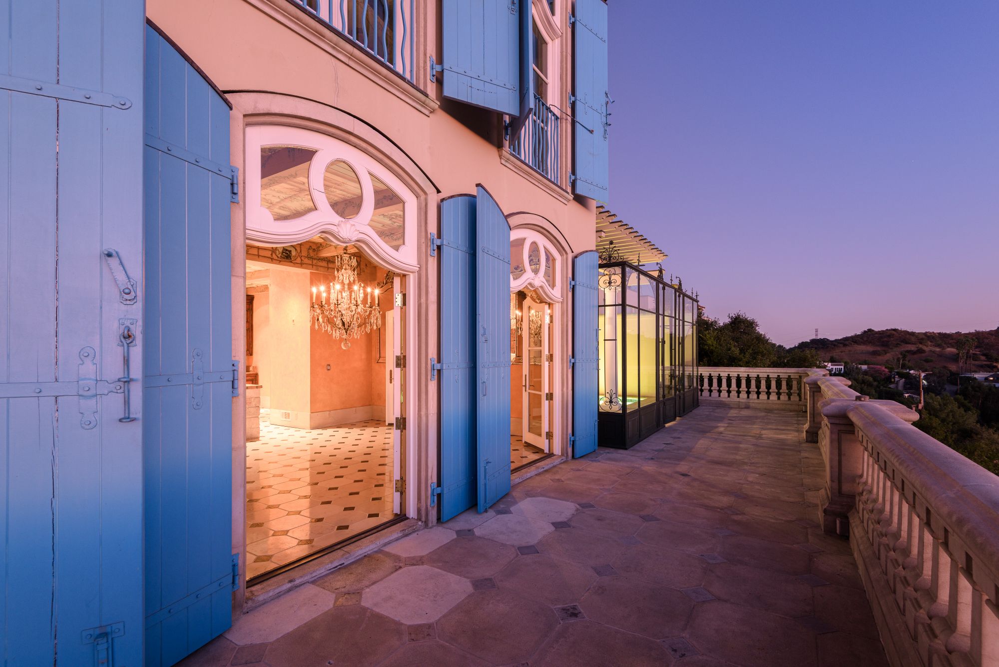 A stunning tour de force of artisanship and design, every detail of this exquisite Southern French Renaissance-inspired offering. Perched in the hills above Mulholland with city and canyon views, an ivy-covered fa~ade is adorned in 15th century hand-carved stone angel and gargoyle figures from France. Once inside, one is instantly transported to decadent manors of the south of France as a magnificent 16th century marble staircase to painted stone walls. Three bedrooms upstairs including a grand master with an en-suite salon showcasing a painted and gilded boiserie masterpiece on the walls. A series of French doors with teal shutters open to a pool deck with ample space for lounging and al fresco dining as well as a terrace where breathtaking canyon and city to ocean views. Please note that all furniture and white painted walls are virtually staged. Please look at empty rooms as well.