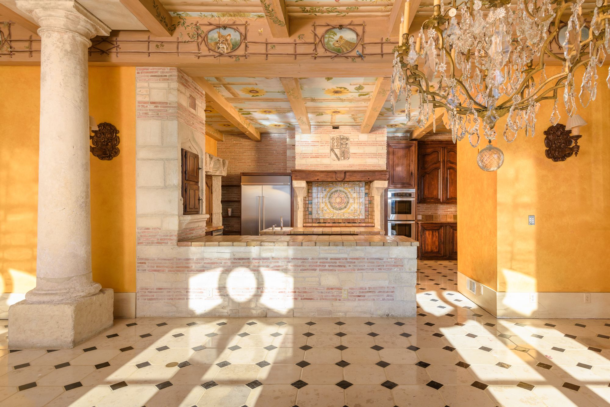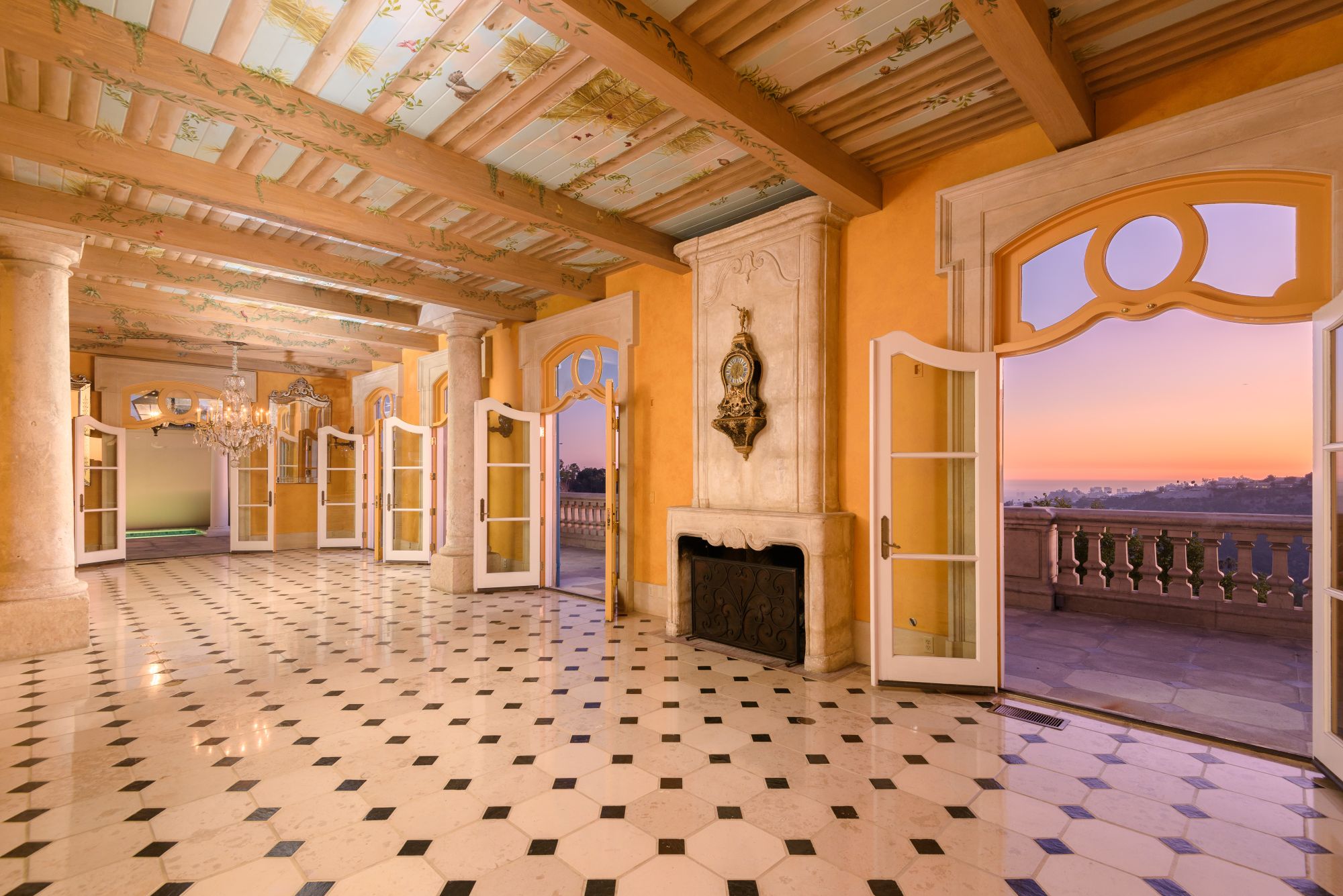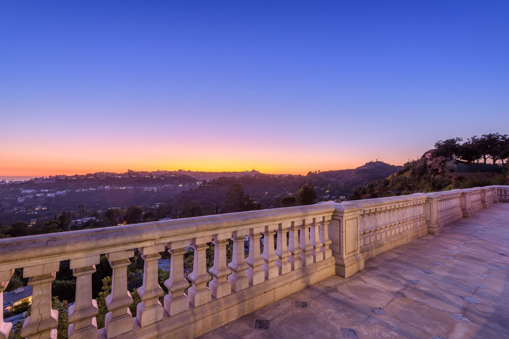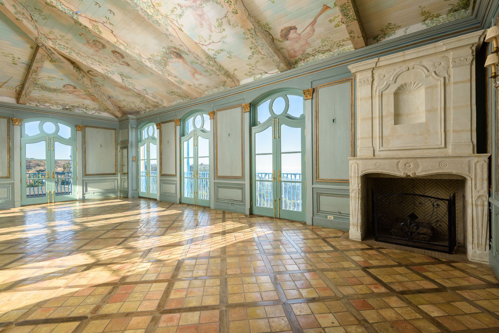 A stunning tour de force of artisanship and design, every detail of this exquisite Southern French Renaissance-inspired offering. Perched in the hills above Mulholland with city and canyon views, an ivy-covered fa~ade is adorned in 15th century hand-carved stone angel and gargoyle figures from France. Once inside, one is instantly transported to decadent manors of the south of France as a magnificent 16th century marble staircase to painted stone walls. Three bedrooms upstairs including a grand master with an en-suite salon showcasing a painted and gilded boiserie masterpiece on the walls. A series of French doors with teal shutters open to a pool deck with ample space for lounging and al fresco dining as well as a terrace where breathtaking canyon and city to ocean views. Please note that all furniture and white painted walls are virtually staged. Please look at empty rooms as well.