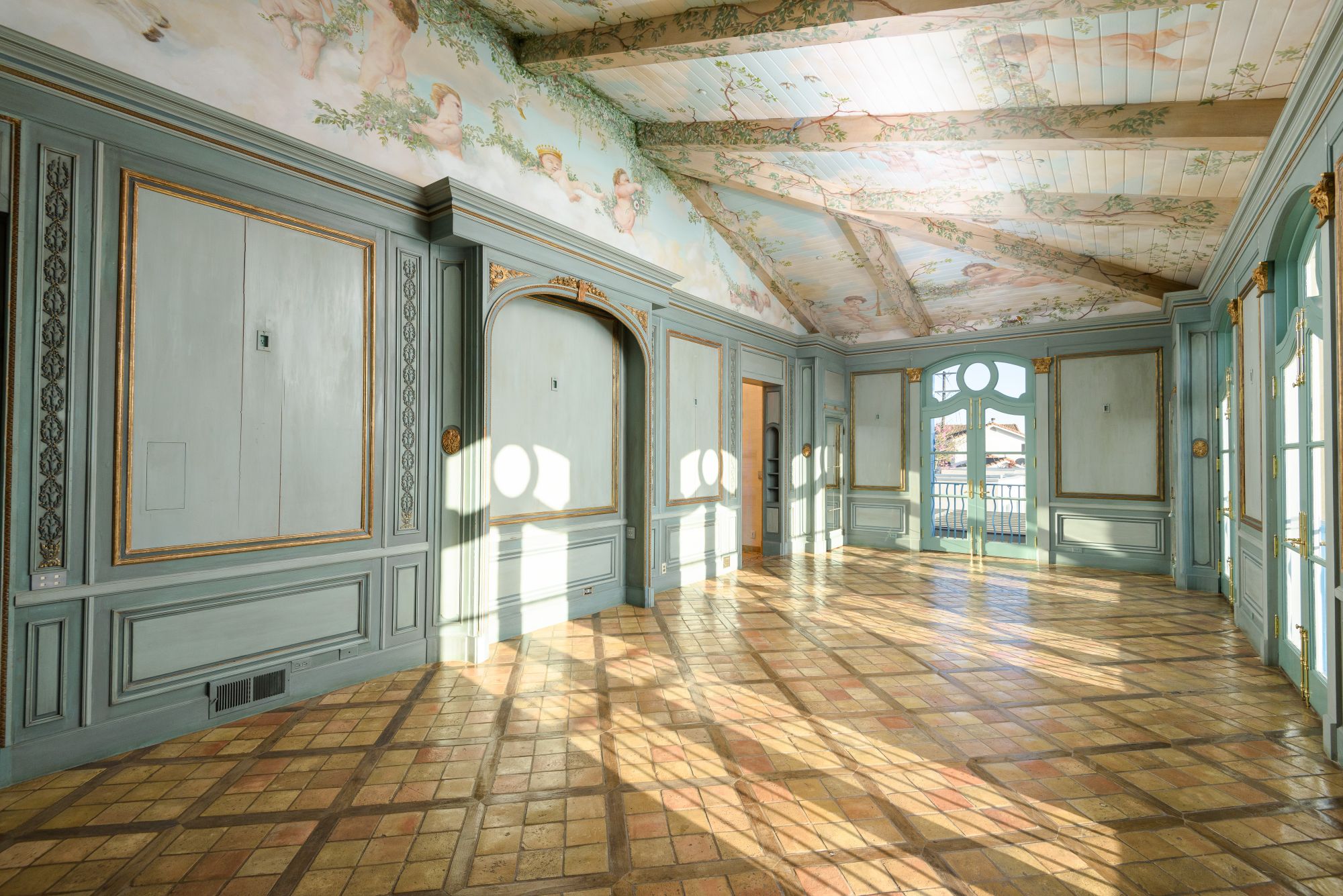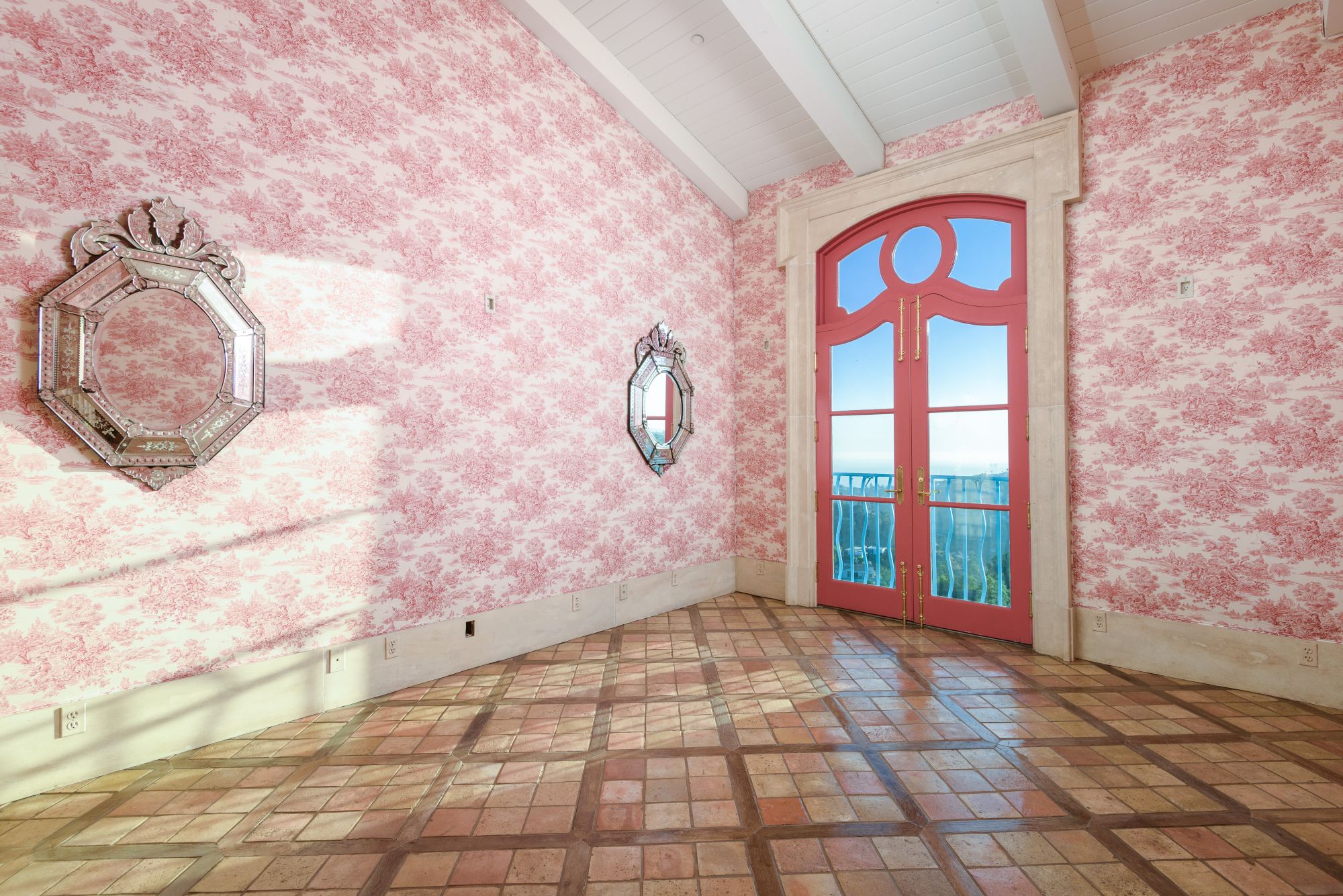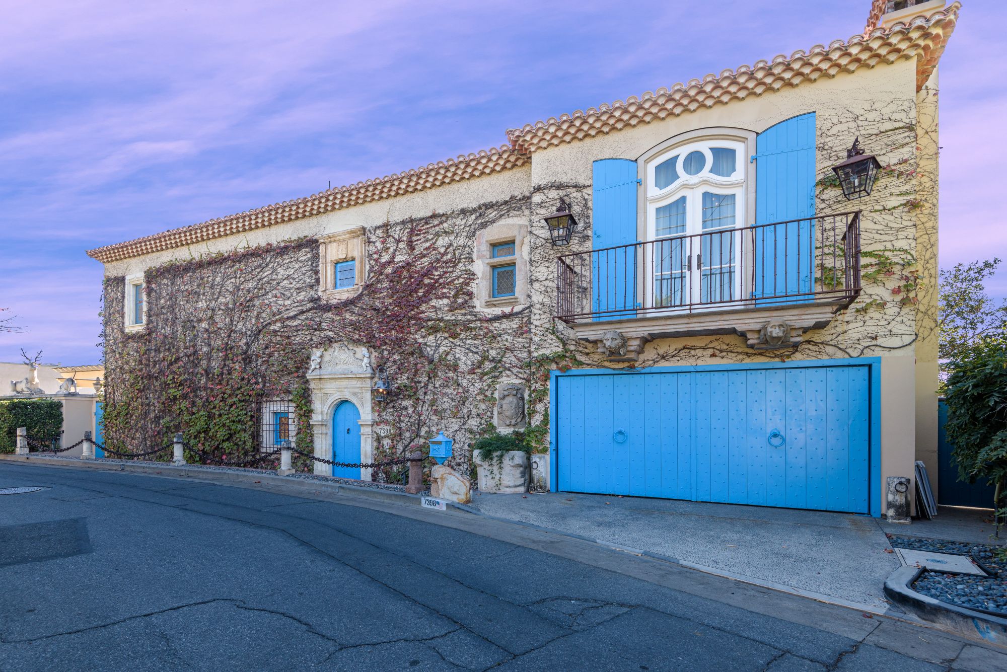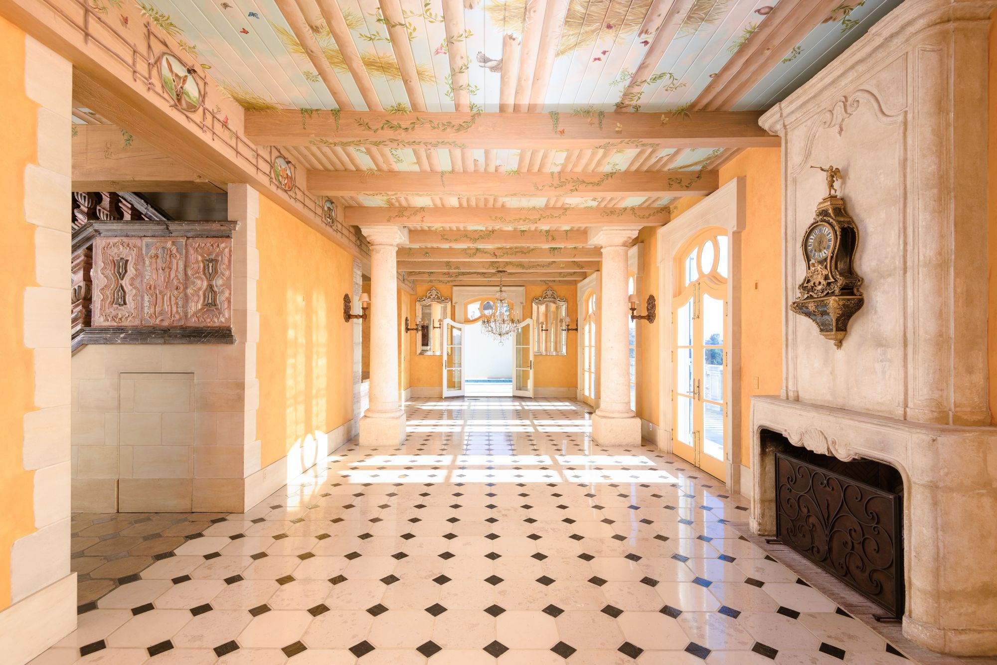 A stunning tour de force of artisanship and design, every detail of this exquisite Southern French Renaissance-inspired offering. Perched in the hills above Mulholland with city and canyon views, an ivy-covered fa~ade is adorned in 15th century hand-carved stone angel and gargoyle figures from France. Once inside, one is instantly transported to decadent manors of the south of France as a magnificent 16th century marble staircase to painted stone walls. Three bedrooms upstairs including a grand master with an en-suite salon showcasing a painted and gilded boiserie masterpiece on the walls. A series of French doors with teal shutters open to a pool deck with ample space for lounging and al fresco dining as well as a terrace where breathtaking canyon and city to ocean views. Please note that all furniture and white painted walls are virtually staged. Please look at empty rooms as well.