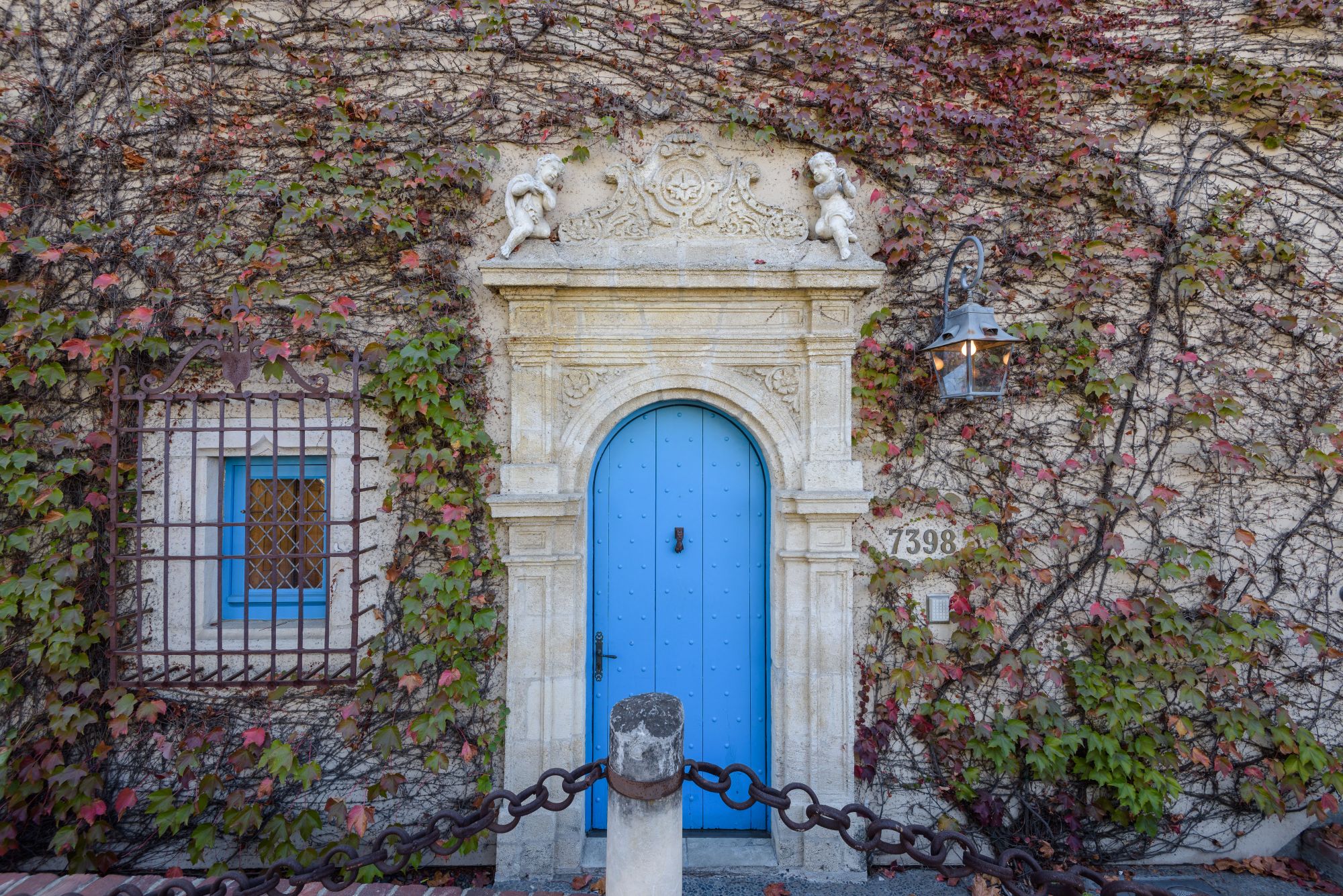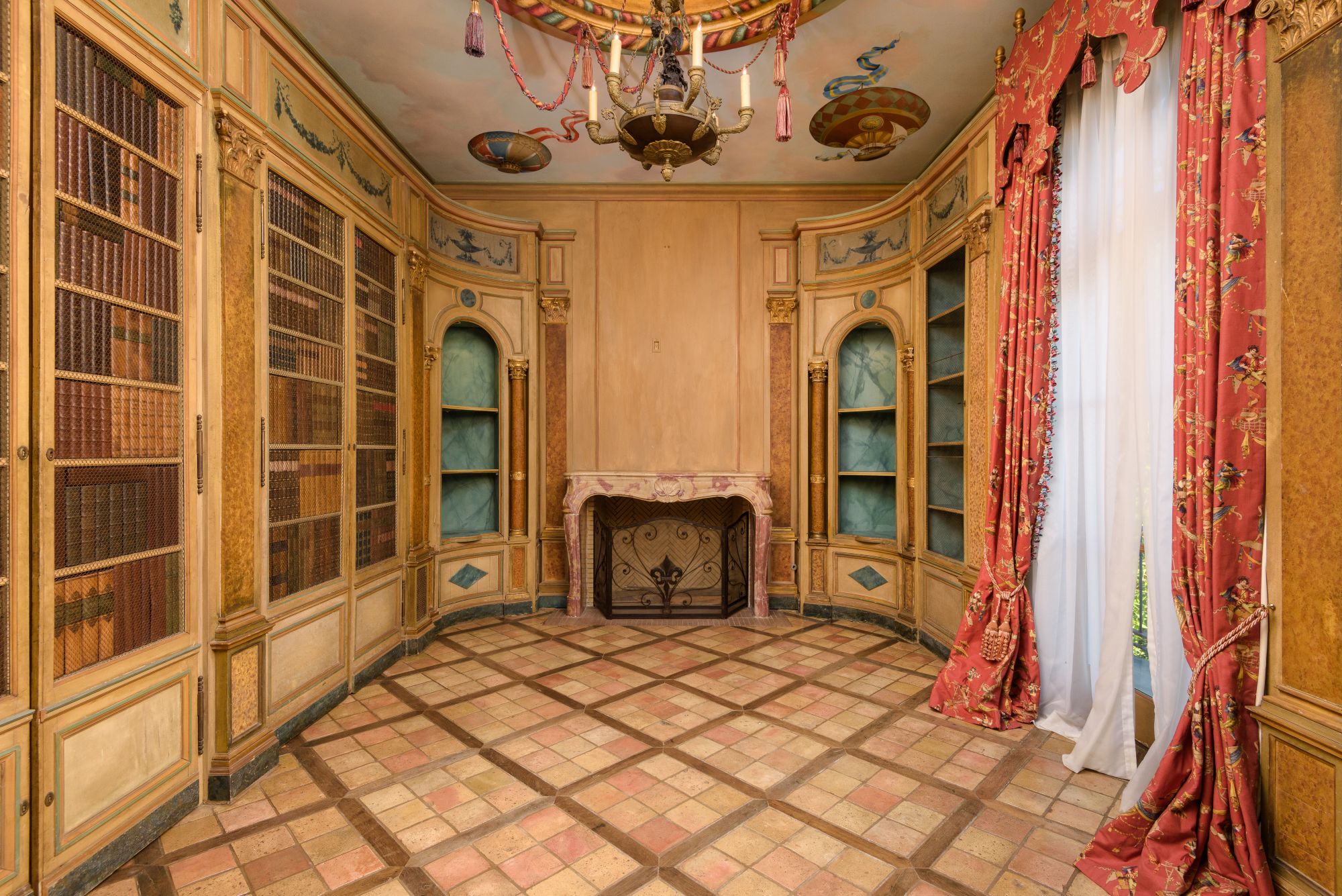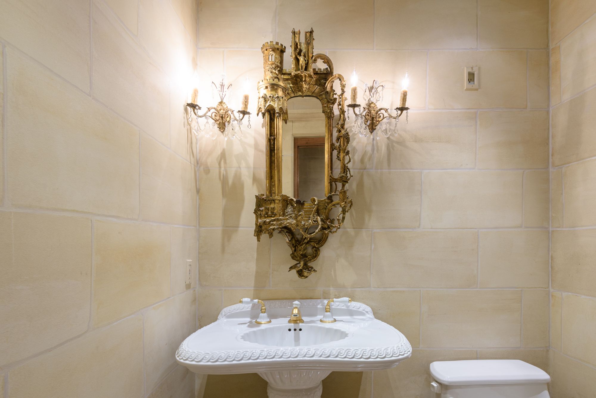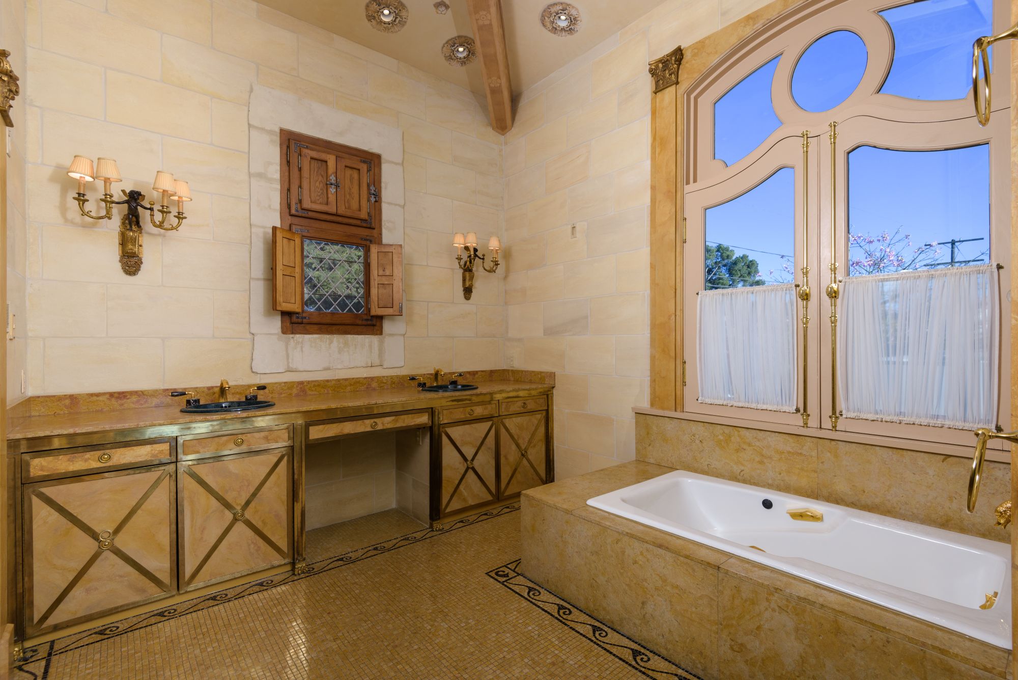 A stunning tour de force of artisanship and design, every detail of this exquisite Southern French Renaissance-inspired offering. Perched in the hills above Mulholland with city and canyon views, an ivy-covered fa~ade is adorned in 15th century hand-carved stone angel and gargoyle figures from France. Once inside, one is instantly transported to decadent manors of the south of France as a magnificent 16th century marble staircase to painted stone walls. Three bedrooms upstairs including a grand master with an en-suite salon showcasing a painted and gilded boiserie masterpiece on the walls. A series of French doors with teal shutters open to a pool deck with ample space for lounging and al fresco dining as well as a terrace where breathtaking canyon and city to ocean views. Please note that all furniture and white painted walls are virtually staged. Please look at empty rooms as well.