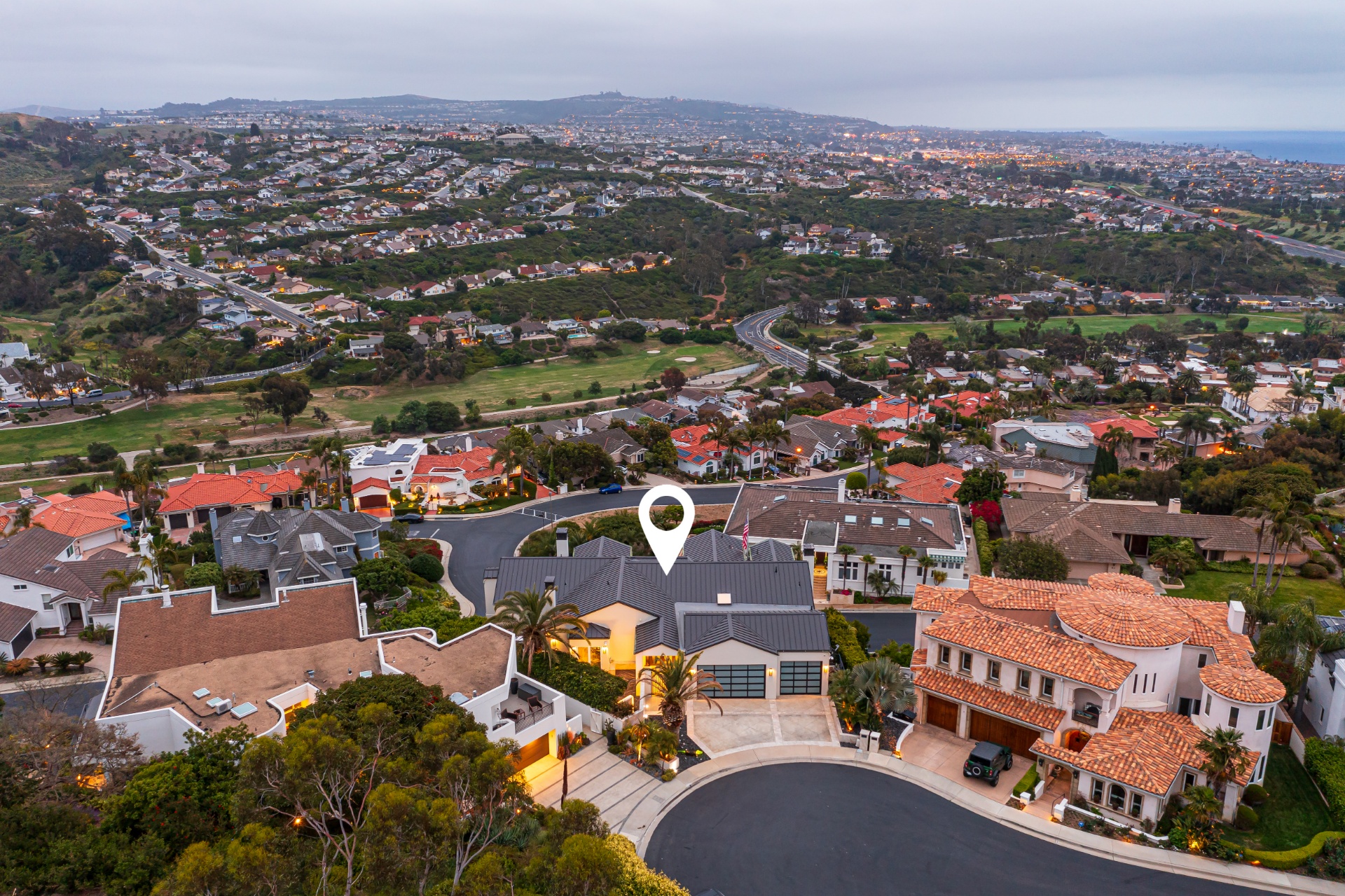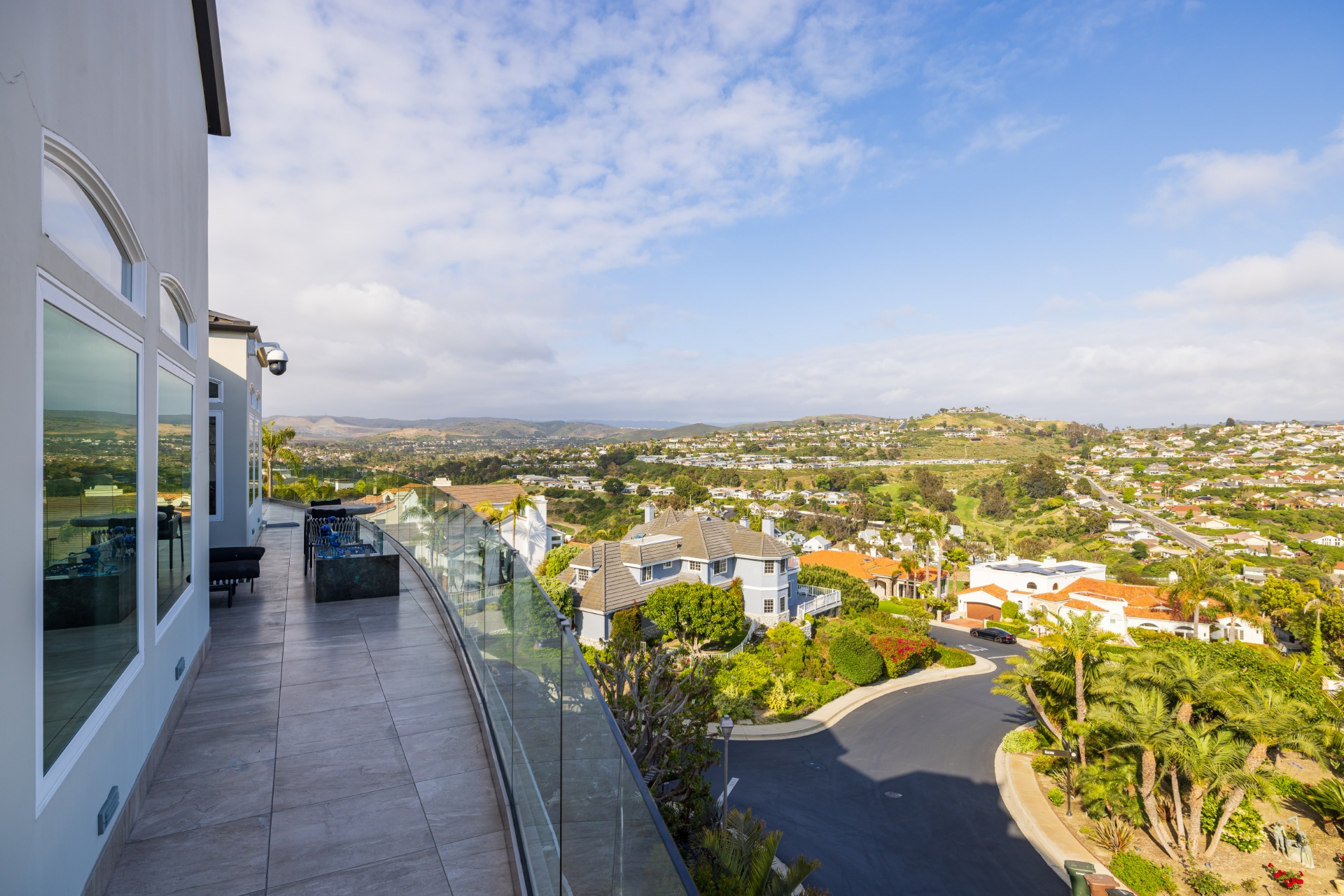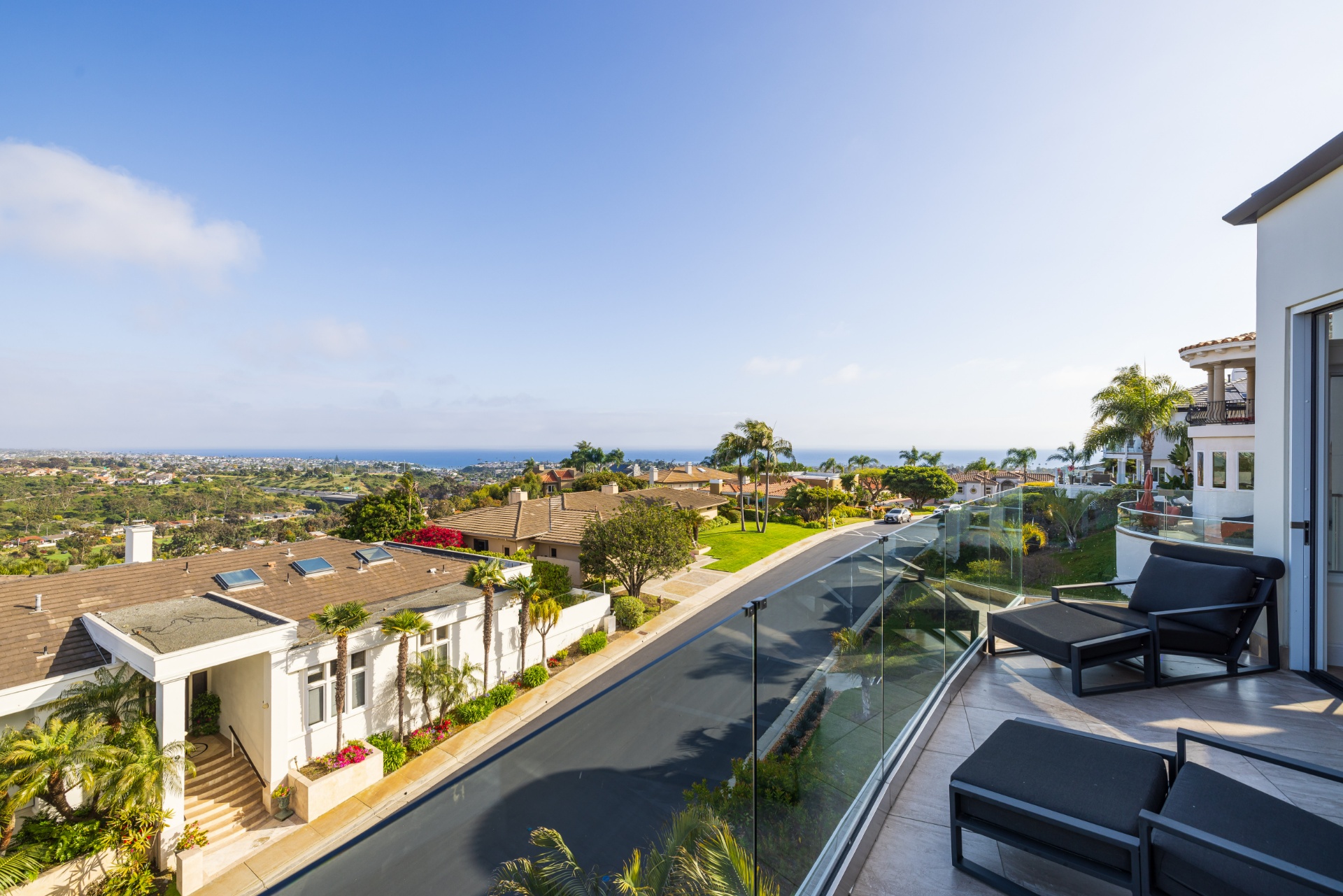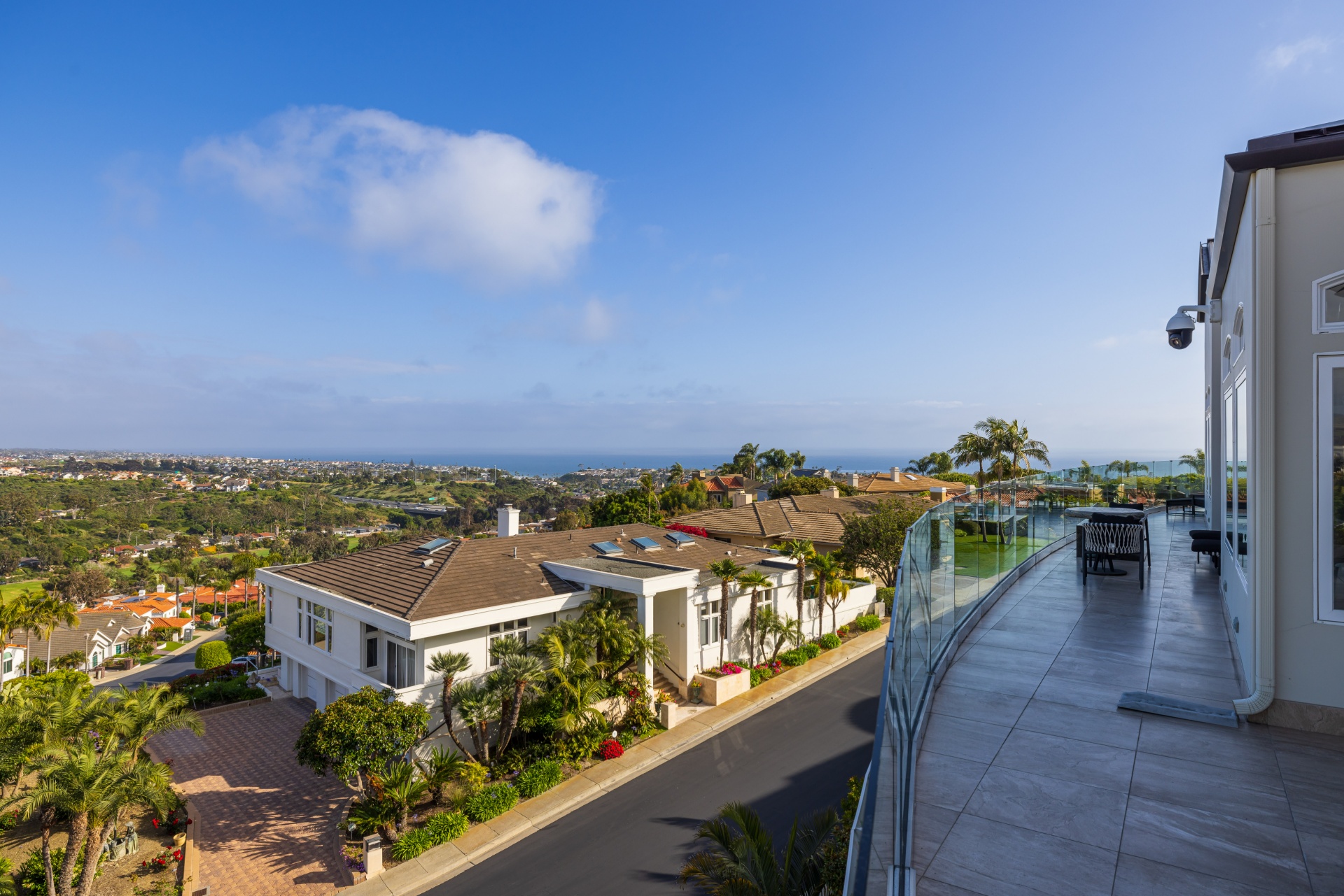 Welcome to 8 Via Goleta, an exquisite estate situated in the prestigious guard-gated community of Sea-Pointe Estates. Nestled on a hillside cul-de-sac, it boasts breathtaking views of the valley, ocean, and beyond, complemented by expansive living spaces perfect for entertaining and family gatherings. The gourmet kitchen is a chef's dream, equipped with top-of-the-line appliances including a Sub-Zero refrigerator, Wolf double oven, Sub-Zero wine fridge, double dishwasher, and adorned with Taj Mahal quartzite countertops. Custom Kleef European cabinetry and Emtek hardware add a touch of modern sophistication. The primary suite serves as a private oasis, complete with a spa-like bathroom featuring onyx slabs, ample walk-in closet space, and an office attached to the primary wing with its own private outdoor spa. This home is adorned with durable porcelain floors, onyx accents, and cove lighting throughout, creating a warm and inviting ambiance. Enjoy the convenience of an elevator providing access to the lower floor, which includes a media room with a video wall, a bar with special art features, an infrared sauna, a fully-equipped gym, a 200-bottle wine cellar, a speakeasy safe room, and an outdoor terrace for entertaining guests. Additional highlights include a grand foyer, a formal dining room with hillside views, a cozy family room with a fireplace, and a versatile home office. The outdoor living area is equally impressive, featuring elegant stonework, a patio deck with outdoor heaters, fire pits, and ample space for outdoor entertainment. Peace of mind is ensured with full home surveillance and modern amenities. This home offers convenient access to Dana Point Harbor, top-rated schools, and beautiful beaches. Experience the epitome of California living in this stunning San Clemente estate.
