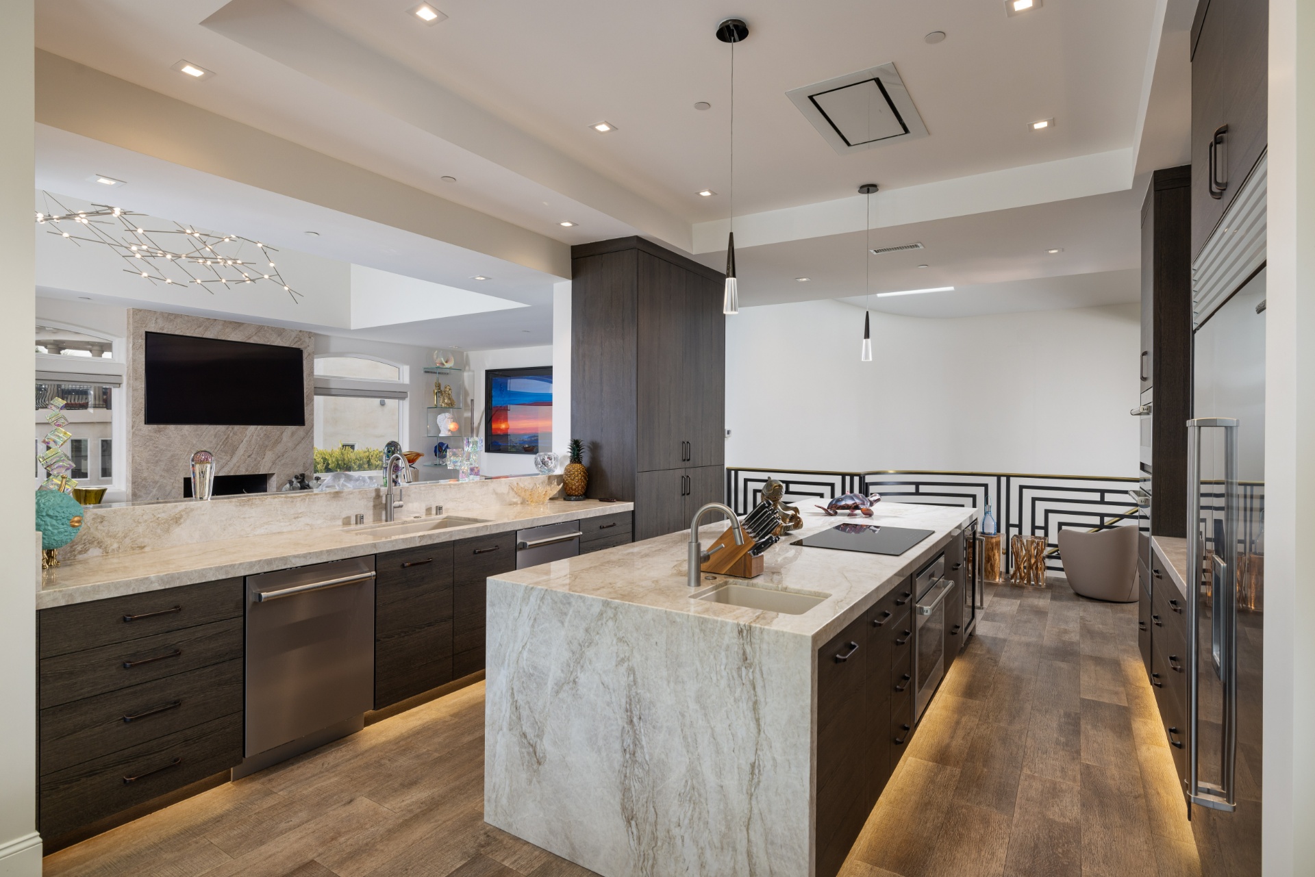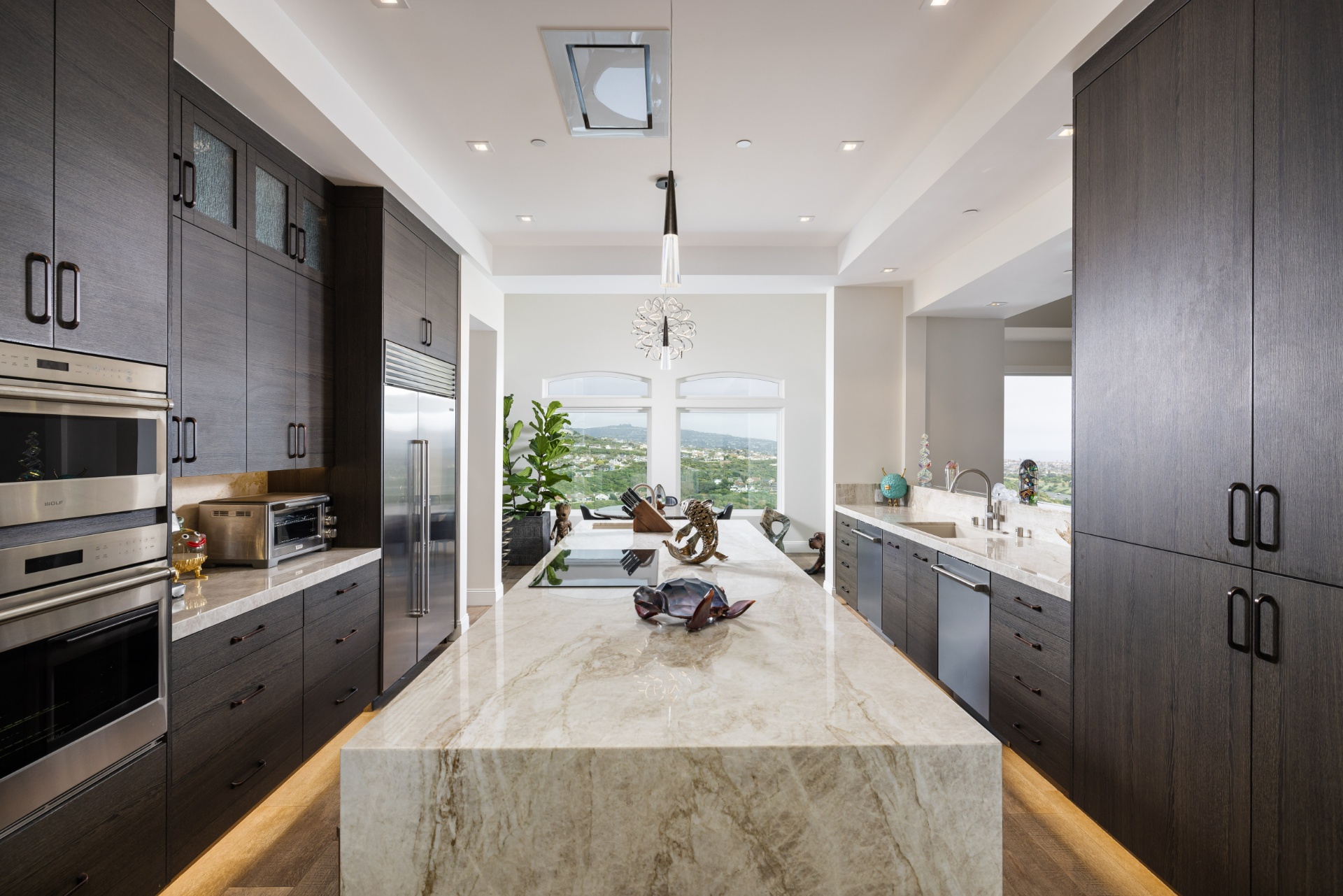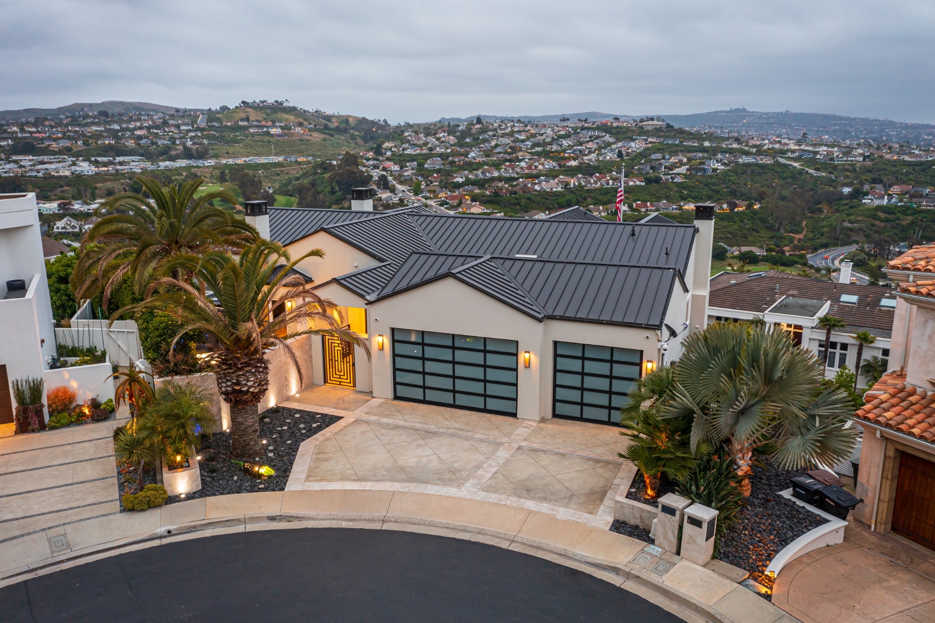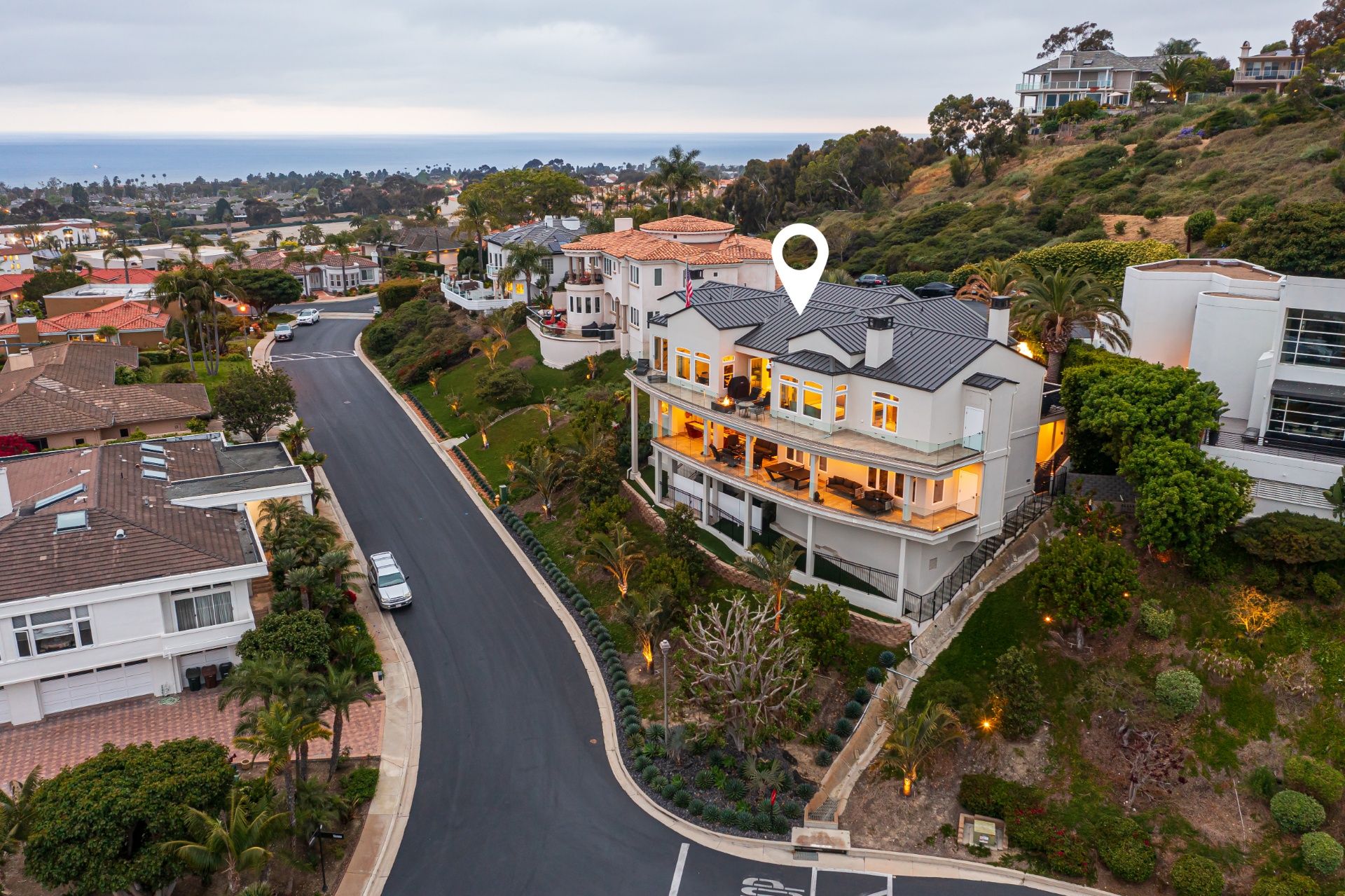 Welcome to 8 Via Goleta, an exquisite estate situated in the prestigious guard-gated community of Sea-Pointe Estates. Nestled on a hillside cul-de-sac, it boasts breathtaking views of the valley, ocean, and beyond, complemented by expansive living spaces perfect for entertaining and family gatherings. The gourmet kitchen is a chef's dream, equipped with top-of-the-line appliances including a Sub-Zero refrigerator, Wolf double oven, Sub-Zero wine fridge, double dishwasher, and adorned with Taj Mahal quartzite countertops. Custom Kleef European cabinetry and Emtek hardware add a touch of modern sophistication. The primary suite serves as a private oasis, complete with a spa-like bathroom featuring onyx slabs, ample walk-in closet space, and an office attached to the primary wing with its own private outdoor spa. This home is adorned with durable porcelain floors, onyx accents, and cove lighting throughout, creating a warm and inviting ambiance. Enjoy the convenience of an elevator providing access to the lower floor, which includes a media room with a video wall, a bar with special art features, an infrared sauna, a fully-equipped gym, a 200-bottle wine cellar, a speakeasy safe room, and an outdoor terrace for entertaining guests. Additional highlights include a grand foyer, a formal dining room with hillside views, a cozy family room with a fireplace, and a versatile home office. The outdoor living area is equally impressive, featuring elegant stonework, a patio deck with outdoor heaters, fire pits, and ample space for outdoor entertainment. Peace of mind is ensured with full home surveillance and modern amenities. This home offers convenient access to Dana Point Harbor, top-rated schools, and beautiful beaches. Experience the epitome of California living in this stunning San Clemente estate.