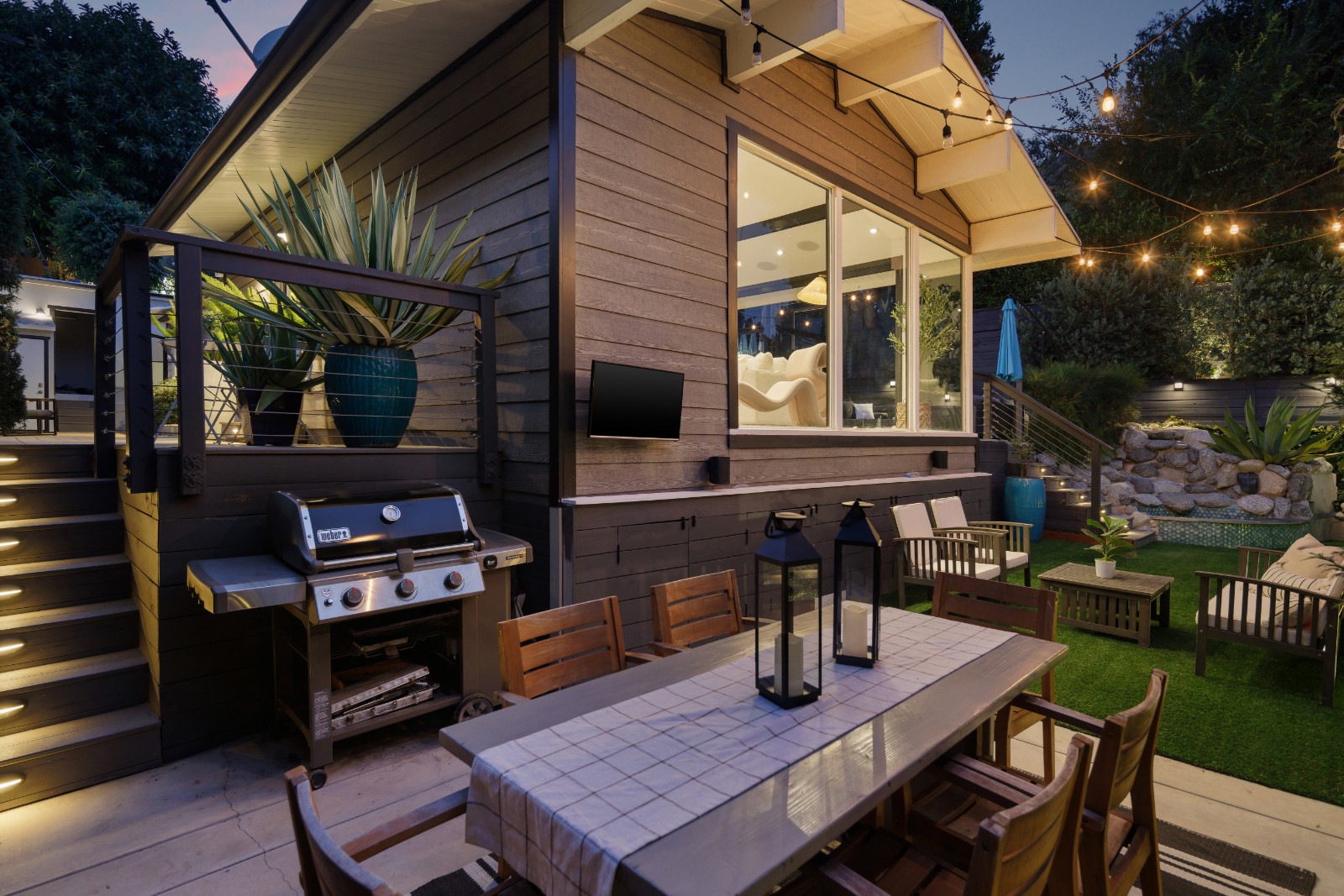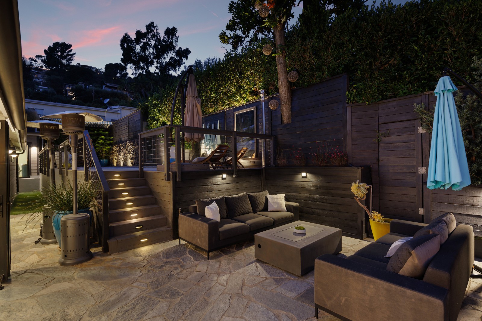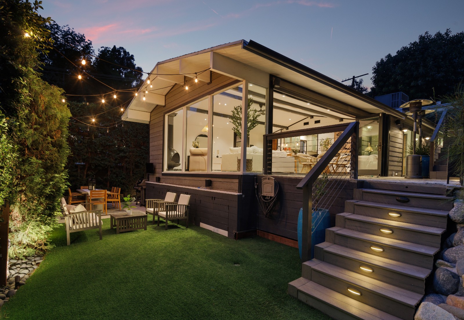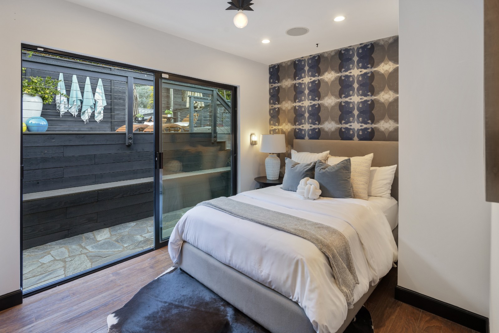 Nestled within the heart of Laurel Canyon, this custom-renovated contemporary home is an incredible retreat within the Canyons. With no expense spared and meticulous attention to detail, this residence is a pinnacle of modern design. Equipped with the cutting-edge Vantage home automation system, it stands as a smart home, offering the utmost convenience and efficiency. Located on a peaceful cul-de-sac in the prestigious Wonderland School District, the house exudes tranquility and privacy, surrounded by mature hedges and secured by gates. The property provides an array of entertaining spaces, from the outdoor dining area adorned with enchanting string lights to the cozy lounge area featuring a fire pit and the inviting deck with a pristine pool and bubbling jacuzzi. Inside, the living room boasts soaring wooden-beamed ceilings and walls of glass that frame a picturesque tree-lined vista, evoking a mid-century ambiance. The main house comprises two bedrooms and two bathrooms, with the primary suite offering a generously spacious closets including one large walk-in and direct access to a private patio. In addition to its impeccable features, this home includes a garage and a detached flex room, perfect for at-home office, gym, media room, or a potential third bedroom. The home also features high-end appliances and a dining area that seamlessly connect to the expansive outdoor entertaining areas, facilitating the coveted indoor/outdoor LA lifestyle. Whether you seek quiet evenings of solitude or vibrant gatherings, this residence caters to all desires, making it an unparalleled retreat in one of the most beautiful canyon neighborhoods in Laurel Canyon.