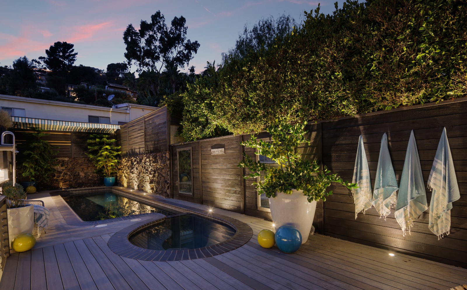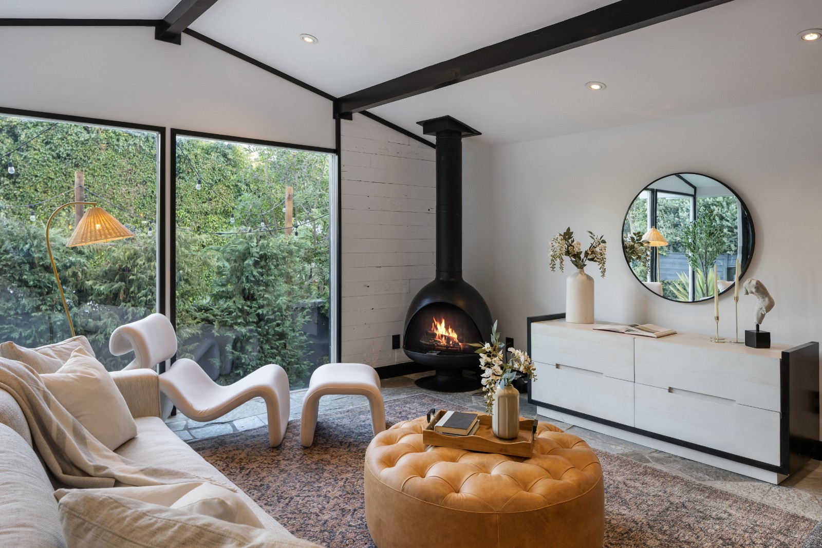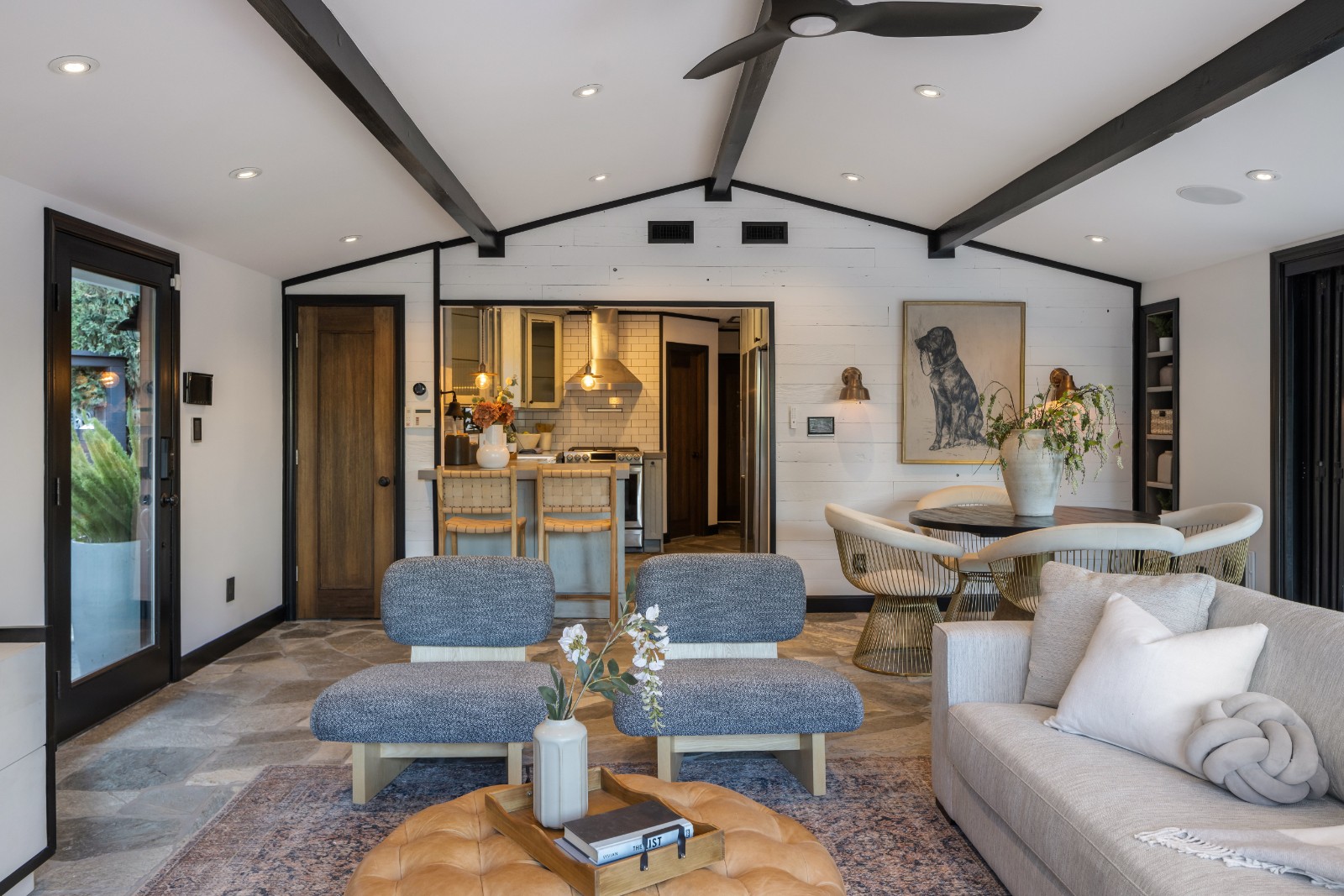 Nestled within the heart of Laurel Canyon, this custom-renovated contemporary home is an incredible retreat within the Canyons. With no expense spared and meticulous attention to detail, this residence is a pinnacle of modern design. Equipped with the cutting-edge Vantage home automation system, it stands as a smart home, offering the utmost convenience and efficiency. Located on a peaceful cul-de-sac in the prestigious Wonderland School District, the house exudes tranquility and privacy, surrounded by mature hedges and secured by gates. The property provides an array of entertaining spaces, from the outdoor dining area adorned with enchanting string lights to the cozy lounge area featuring a fire pit and the inviting deck with a pristine pool and bubbling jacuzzi. Inside, the living room boasts soaring wooden-beamed ceilings and walls of glass that frame a picturesque tree-lined vista, evoking a mid-century ambiance. The main house comprises two bedrooms and two bathrooms, with the primary suite offering a generously spacious closets including one large walk-in and direct access to a private patio. In addition to its impeccable features, this home includes a garage and a detached flex room, perfect for at-home office, gym, media room, or a potential third bedroom. The home also features high-end appliances and a dining area that seamlessly connect to the expansive outdoor entertaining areas, facilitating the coveted indoor/outdoor LA lifestyle. Whether you seek quiet evenings of solitude or vibrant gatherings, this residence caters to all desires, making it an unparalleled retreat in one of the most beautiful canyon neighborhoods in Laurel Canyon.