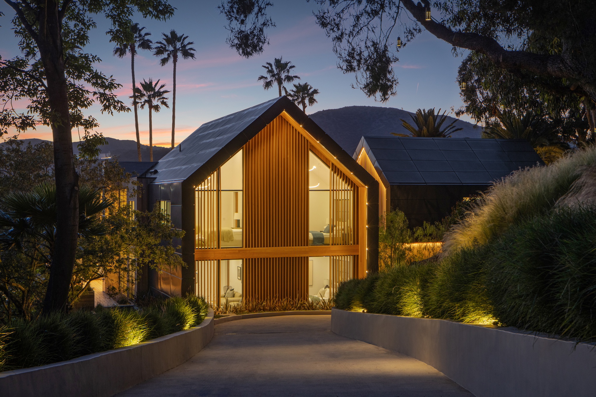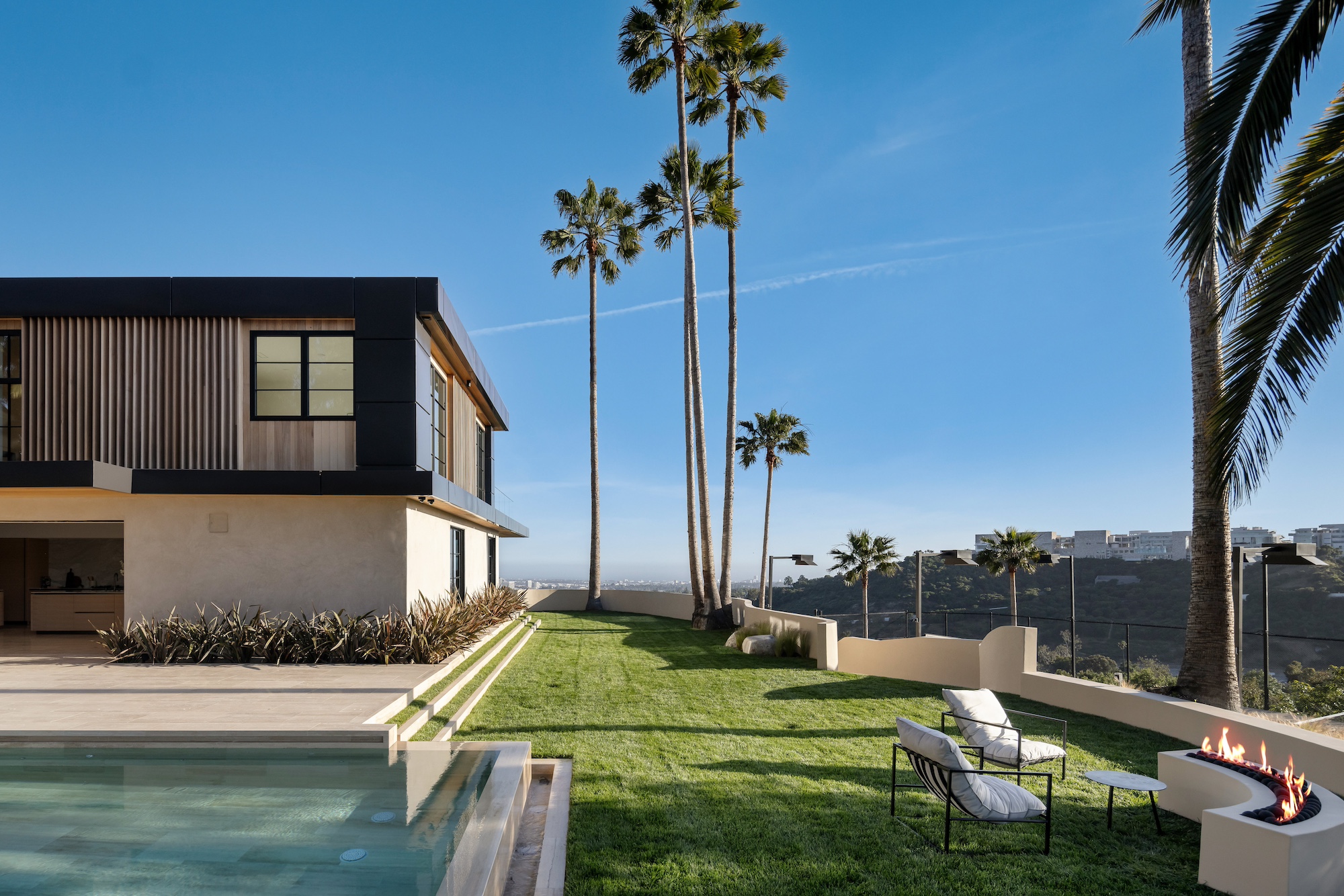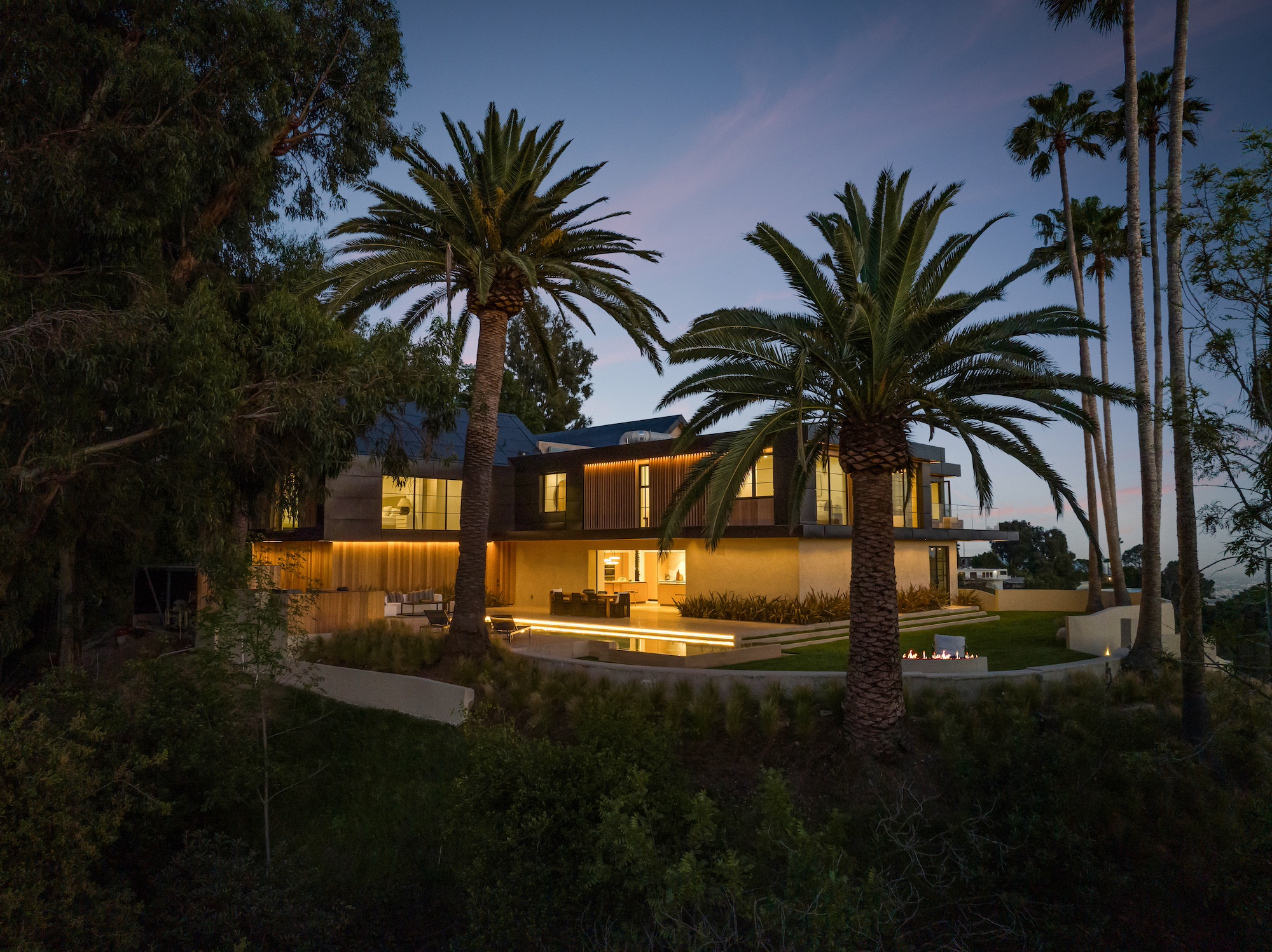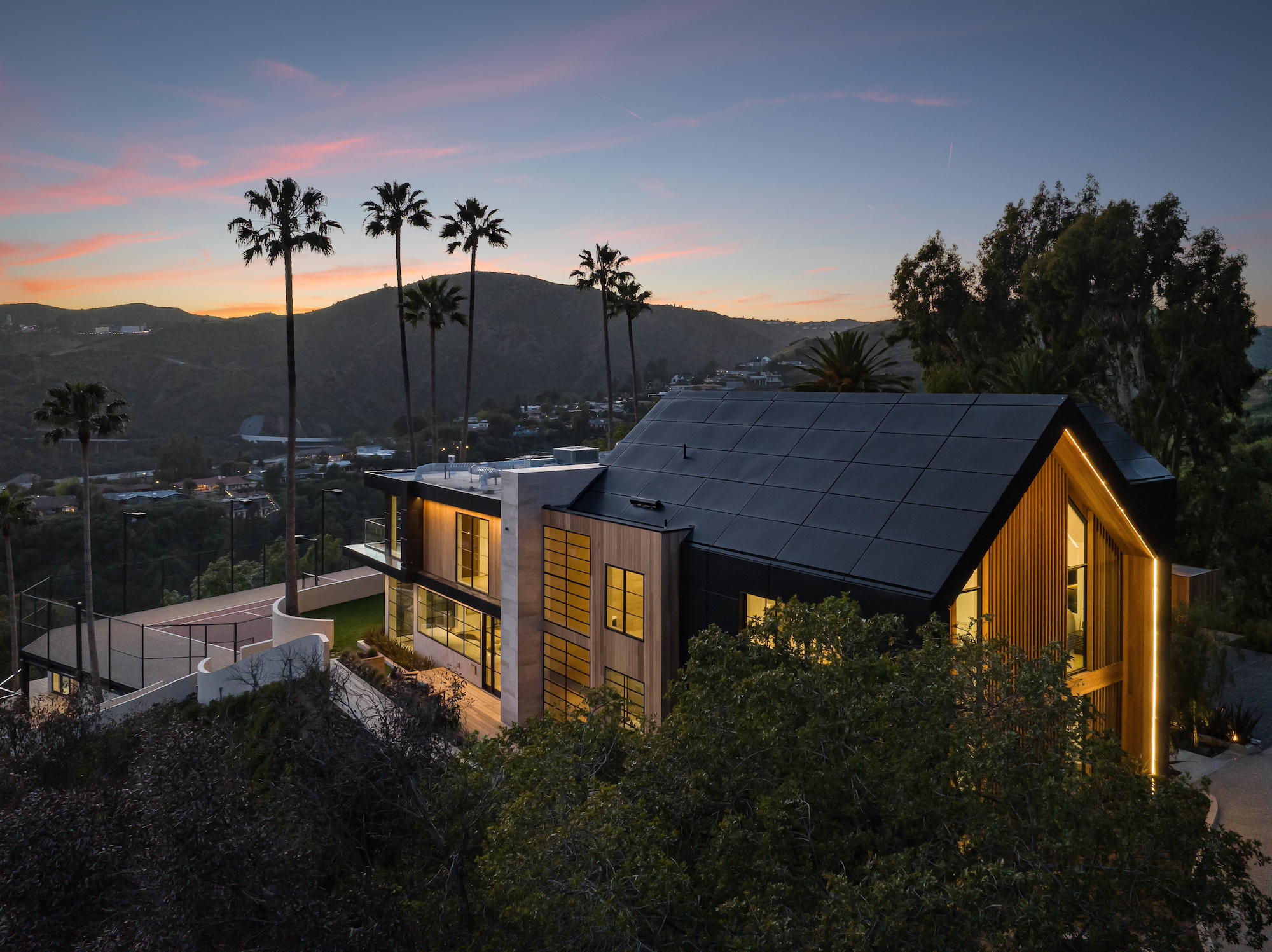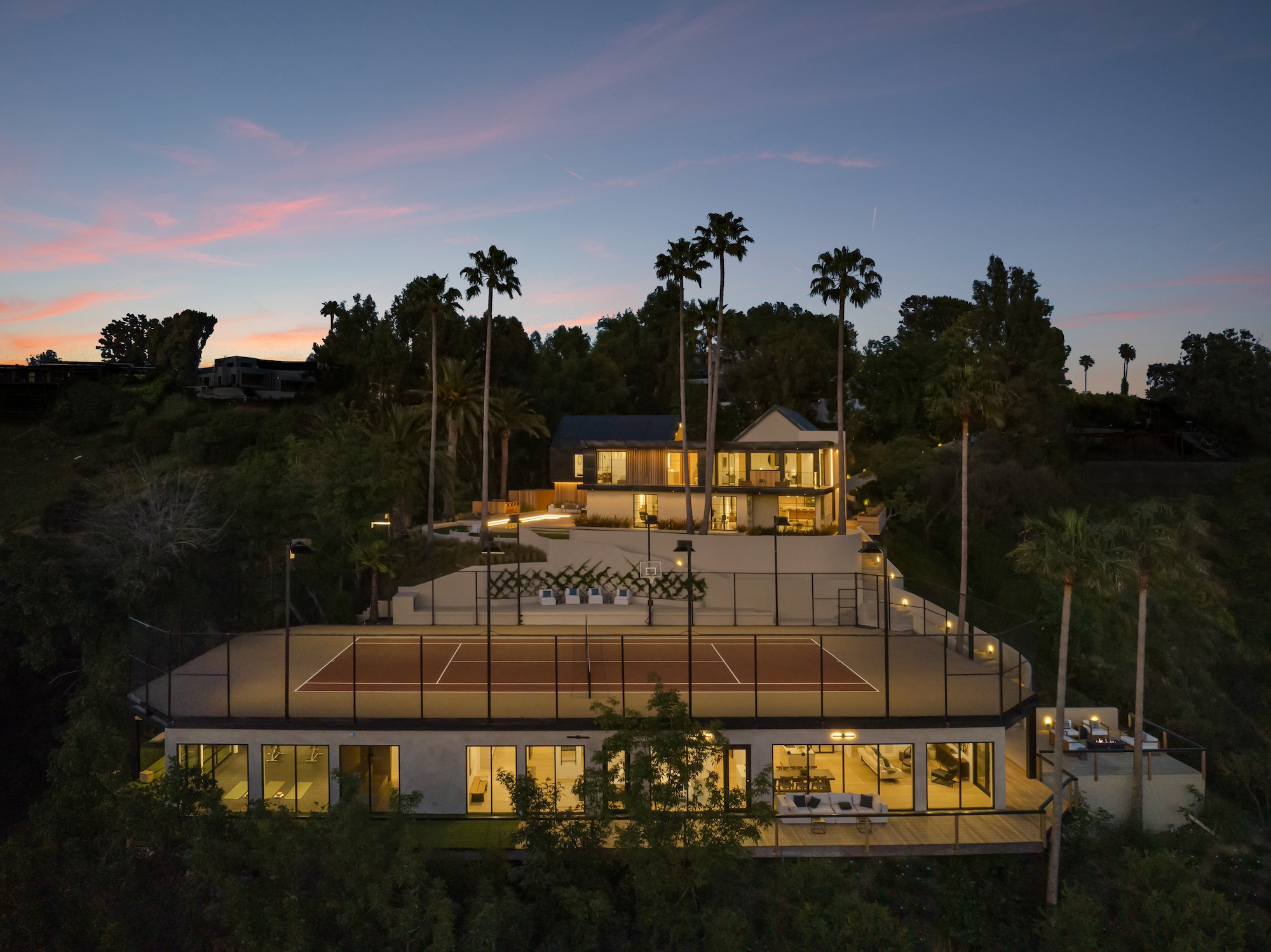 string(2378) "Nestled in the tranquil hills of Bel Air, this architectural masterpiece sits on over 3.5 acres surrounded by majestic mature trees, offering breathtaking panoramic views of the mountains, ocean, and the world-famous Getty Museum. Designed by AADS, the home's design is in a league of its own, combining its distinct Scandinavian-inspired roofline with a palette of natural and organic finishes, drawing inspiration from the Getty Museum itself. This compound boasts an extremely private homesite at the bottom of a 250-foot gated driveway. The masculine exterior is tastefully contrasted with a warm and inviting interior palette that is artfully pared back to travertine stone, white oak, and walnut throughout the entire home. Setting eyes on the front facade, it's hard to decipher where the garage is. Using structural steel engineering, the door is seamlessly camouflaged behind mahogany siding, concealing an airplane hangar door that allows for a large 40-ft single opening. This creates a new level of functionality and design compared to traditional garage spaces. The expansive main house is appointed with 5 en-suite bedrooms upstairs and a downstairs guest suite across over 8,300 sq. ft. of living space. With multiple vistas, the primary suite is second-to-none, featuring huge clear-view center-pivot windows leading to a private balcony, two separate bathrooms with floor-to-ceiling travertine slab walls, and two walk-in Italian-made closets. On the main level, the ultra-luxurious kitchen is appointed with Italian-made cabinets by Molteni&C Dada and book-matched Calacatta marble countertops. Behind the main kitchen is a fully appointed pantry kitchen that is perfect for private-chef dinners and event caterers. Additionally, an over 3,400 sq. ft. detached guest house offers 2 en-suite bedrooms and a separate wellness area, complete with a gym, sauna, steam room, and massage room. The gym boasts views of a neighboring vineyard reminiscent of the hillsides of Tuscany. Marrying the main house and guest house is the ultimate outdoor oasis, equipped with a private pool and spa, large flat grass pad, private tennis court, and ample patio space for hosting gatherings. This is the home that keeps on giving. Perched amidst the lush hillside, this property effortlessly blends luxury living with the best lifestyle and views that Los Angeles has to offer."