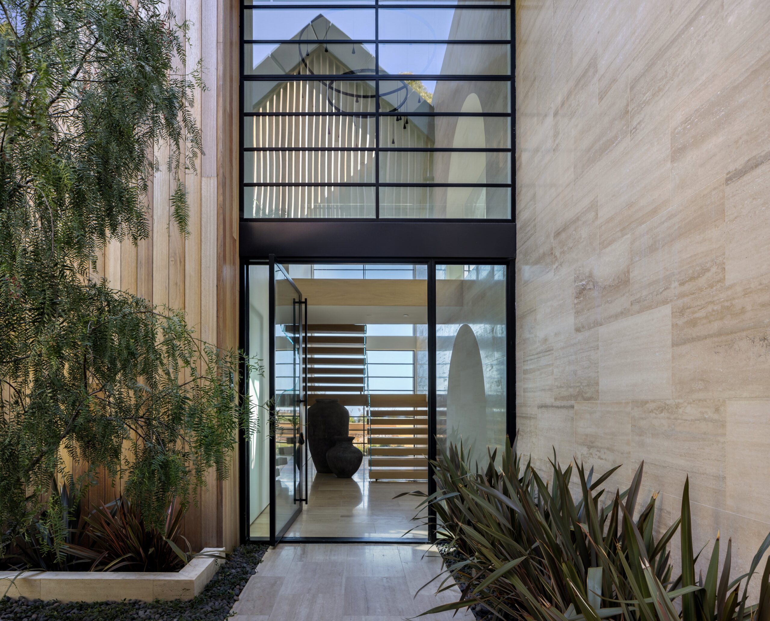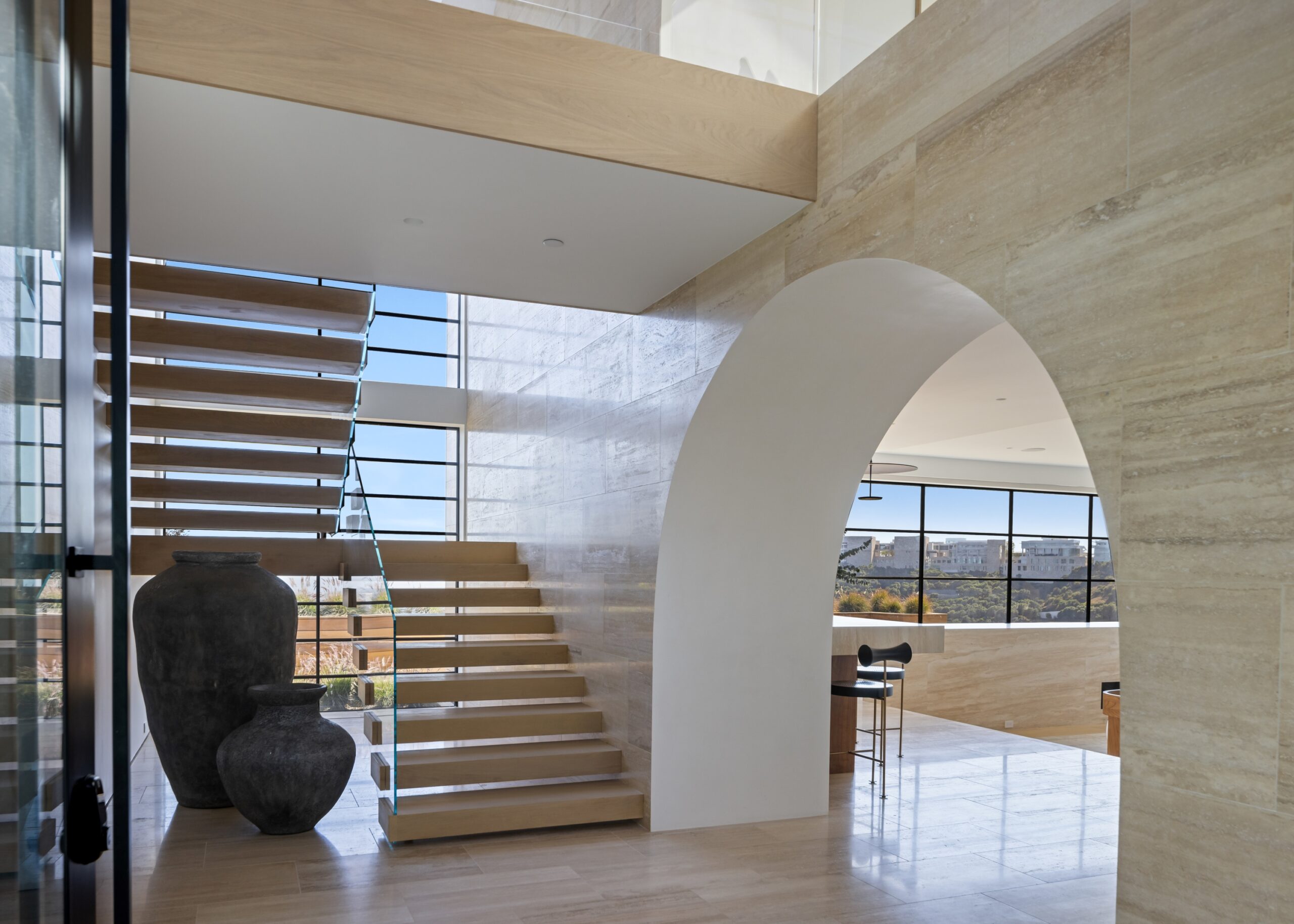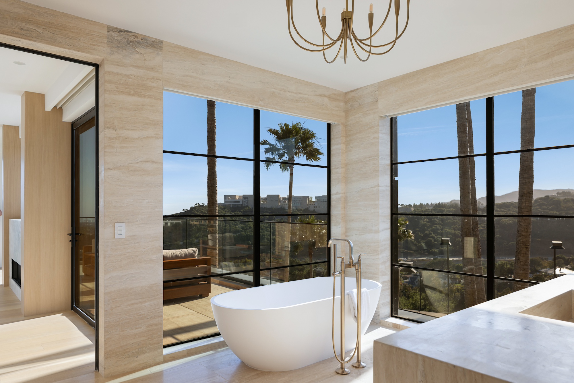 Nestled in the tranquil hills of Bel Air, this architectural masterpiece sits on over 3.5 acres surrounded by majestic mature trees, offering breathtaking panoramic views of the mountains, ocean, and the world-famous Getty Museum. Designed by AADS, the home's design is in a league of its own, combining its distinct Scandinavian-inspired roofline with a palette of natural and organic finishes, drawing inspiration from the Getty Museum itself. This compound boasts an extremely private homesite at the bottom of a 250-foot gated driveway. The masculine exterior is tastefully contrasted with a warm and inviting interior palette that is artfully pared back to travertine stone, white oak, and walnut throughout the entire home. Setting eyes on the front facade, it's hard to decipher where the garage is. Using structural steel engineering, the door is seamlessly camouflaged behind mahogany siding, concealing an airplane hangar door that allows for a large 40-ft single opening. This creates a new level of functionality and design compared to traditional garage spaces. The expansive main house is appointed with 5 en-suite bedrooms upstairs and a downstairs guest suite across over 8,300 sq. ft. of living space. With multiple vistas, the primary suite is second-to-none, featuring huge clear-view center-pivot windows leading to a private balcony, two separate bathrooms with floor-to-ceiling travertine slab walls, and two walk-in Italian-made closets. On the main level, the ultra-luxurious kitchen is appointed with Italian-made cabinets by Molteni&C Dada and book-matched Calacatta marble countertops. Behind the main kitchen is a fully appointed pantry kitchen that is perfect for private-chef dinners and event caterers. Additionally, an over 3,400 sq. ft. detached guest house offers 2 en-suite bedrooms and a separate wellness area, complete with a gym, sauna, steam room, and massage room. The gym boasts views of a neighboring vineyard reminiscent of the hillsides of Tuscany. Marrying the main house and guest house is the ultimate outdoor oasis, equipped with a private pool and spa, large flat grass pad, private tennis court, and ample patio space for hosting gatherings. This is the home that keeps on giving. Perched amidst the lush hillside, this property effortlessly blends luxury living with the best lifestyle and views that Los Angeles has to offer.