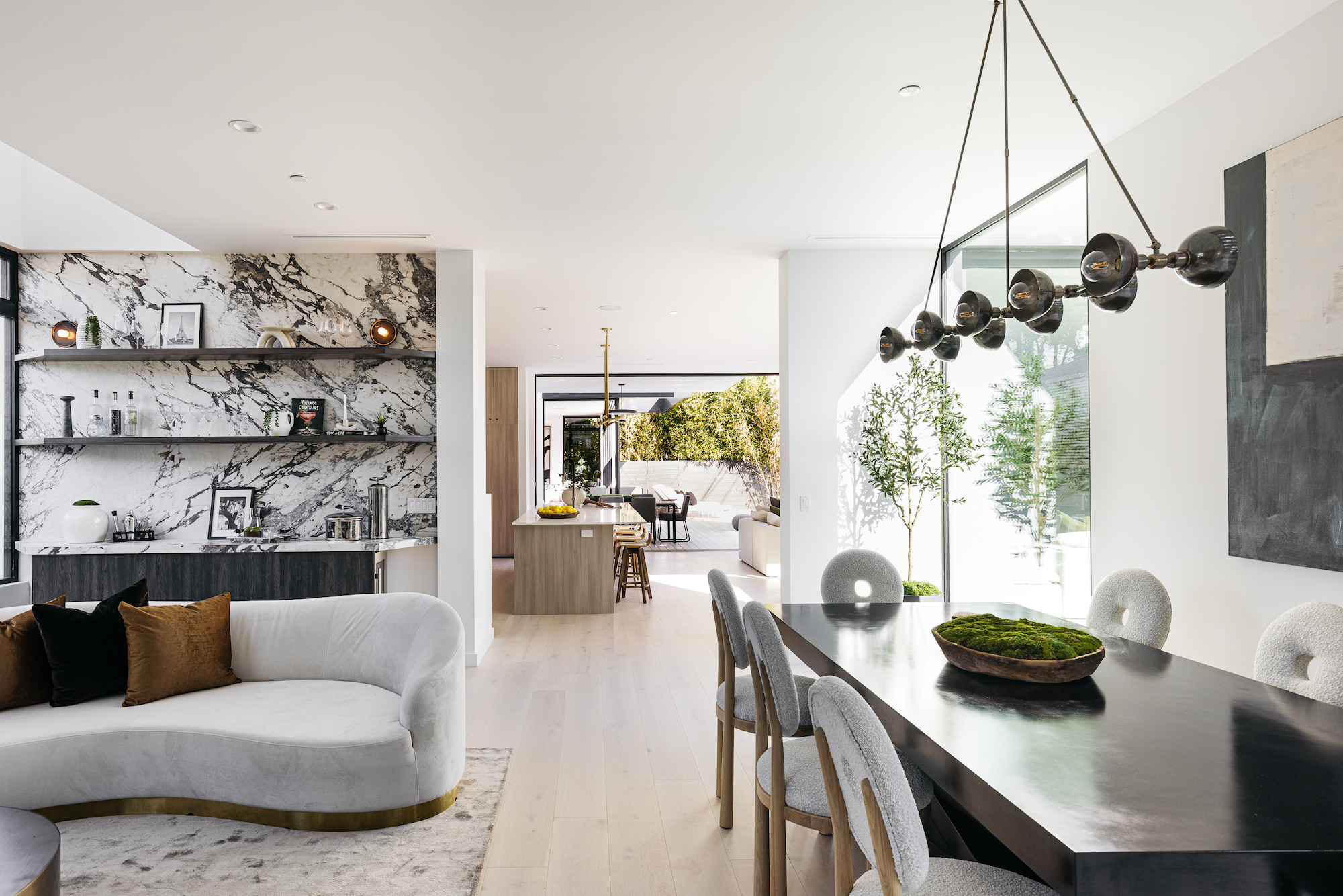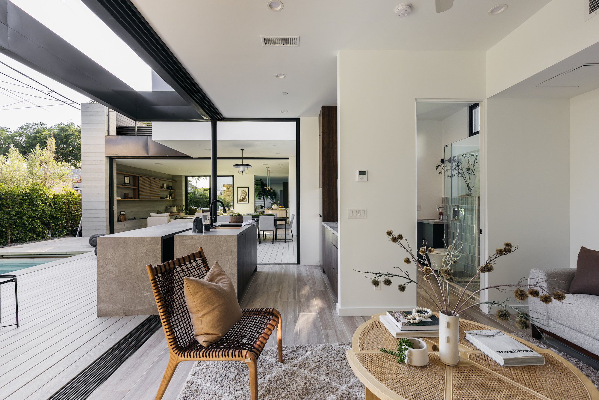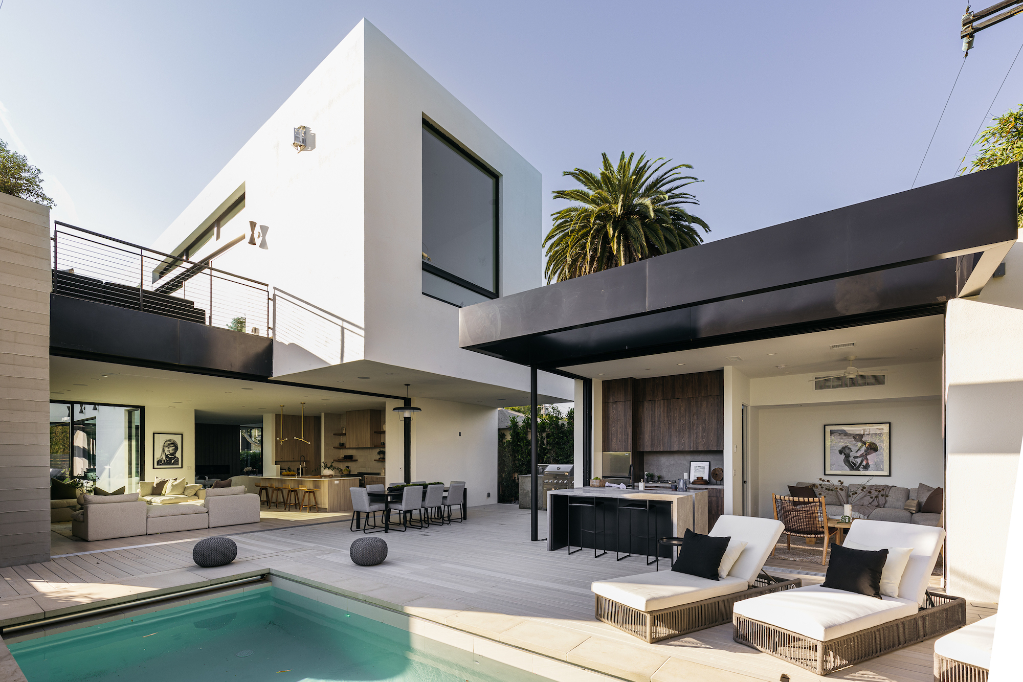 Incredible architectural home within minutes of Downtown Culver City. Entertainer's dream home where you enter right into an elegant living room featuring custom plaster fireplace and built in bar. This gorgeous bar area comes with dramatic porcelain stone wall, ice maker, and wine fridge. HUGE kitchen with Dacor appliance package of 4 ft gas range, 30 inch side by side fridge freezer with custom cabinet panels, 4 ft sink in kitchen island, and butler pantry tucked behind kitchen. Butler pantry contains a second gas range and an enormous amount of additional storage. Kitchen and living space all open to the backyard featuring a stunning new pool and fully outfitted guest house. Outdoor pool deck has covered dining, built in barbeque, and custom stone dining island. Center courtyard, visible from all first floor living areas, has 6 ft long custom built in firepit and beautiful olive tree. Second level primary suite features a built- in fireplace, dual shower head walk in shower, soaking tub, double walk in closets, and extra built in storage. Second level also features game room den with an additional gas fireplace and tree top views. This custom built home is brand new construction and has so many more unique features. Best to see in person and feel the elegance and privacy of this incredible home.