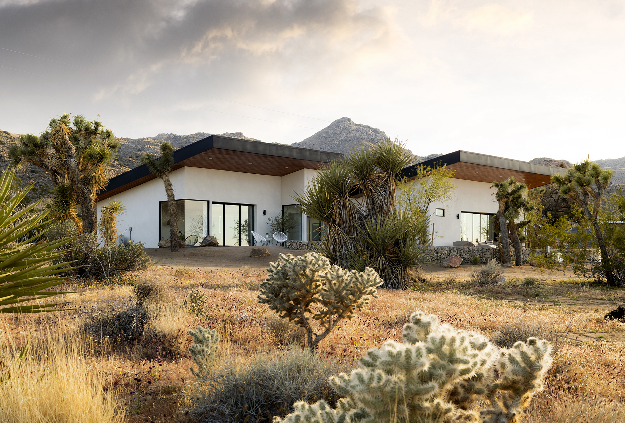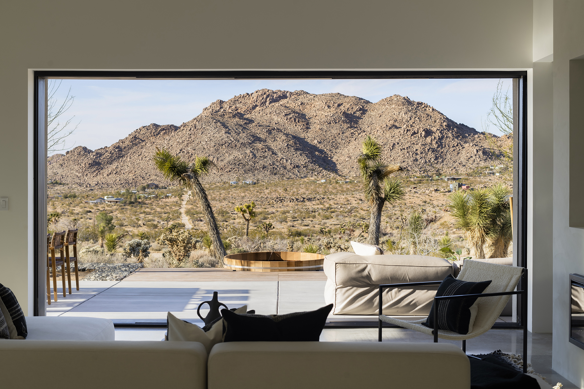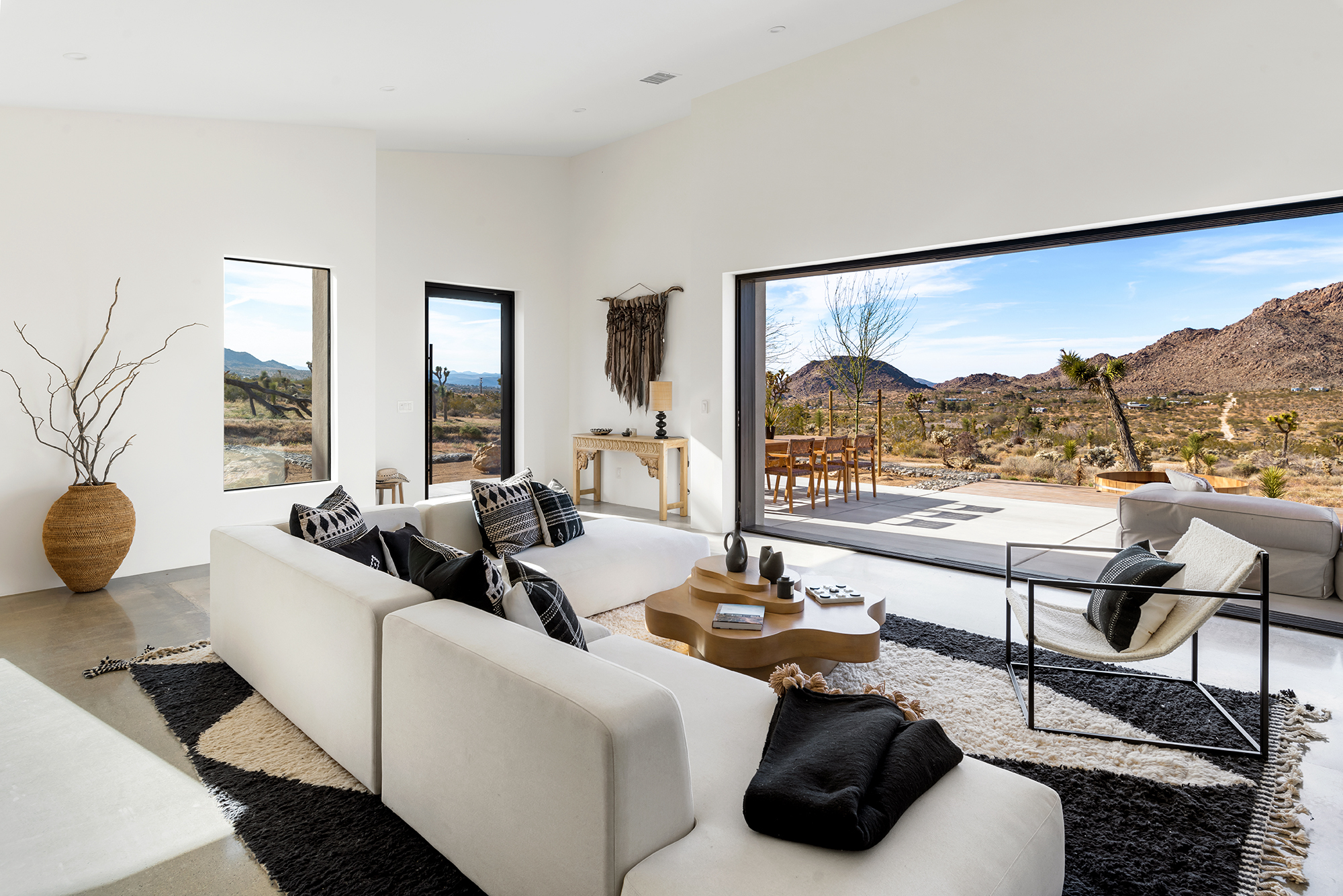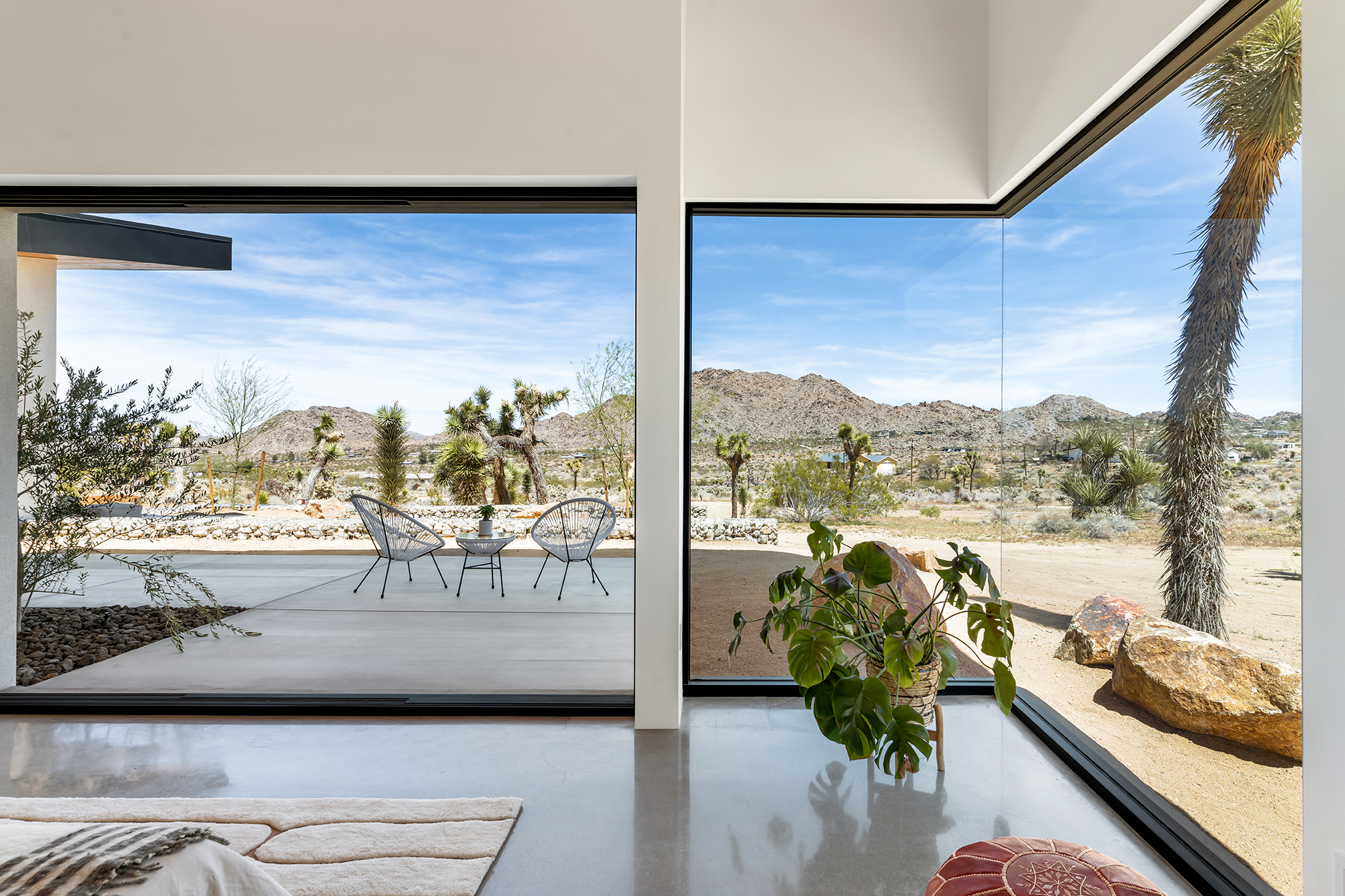 string(1849) "Contemporary Desert Masterpiece: Classic butterfly roof design with a 15' tall soaring eve gracing the front of this meticulous new construction. The tall eves, providing shaded outdoor space, when combined with a 15' wide disappearing sliding-glass wall create an authentic indoor/outdoor living experience. Step into the redwood hot tub out front, with a majestic boulder mountain, perfectly framed through the massive glass wall when viewed from inside the spacious Great Room. Formal entry is through an 8' tall by 4' wide pivot glass door. The custom kitchen showcases a massive quartz double waterfall island and hand-built cabinetry, allowing for an ideal social space with the dining area and kitchen filling out the rest of the Great Room. One reaches the en suite primary bedroom down a long glass encased hallway. The primary bedroom also features an unobstructed frameless cantilevered corner window utilized by Frank Lloyd Wright in the Ennis House built in the Hollywood Hills exactly a century ago. The primary bathroom features a nearly 6' by 10' massive window looking out at the mountain range to the south, while the guest bathroom has a door opening to an exterior platform, for a total of 3 full baths and 3 bedrooms spread over 2,287 square feet of interior living space. Inspired by midcentury design throughout, each room features endless glass, illuminating the interior and looking out over vast wilderness in every direction. Tucked up near the Joshua Tree National Park on a large 2.5-acre parcel, one can hike from home into the Park or drive to the main entrance gate a short distance up the road. Located in the coveted Monument Manor/Joshua Highlands neighborhood, often referred to as the Bel Air of Joshua Tree, the location offers privacy, prestige and convenience for those seeking serene wilderness surroundings."