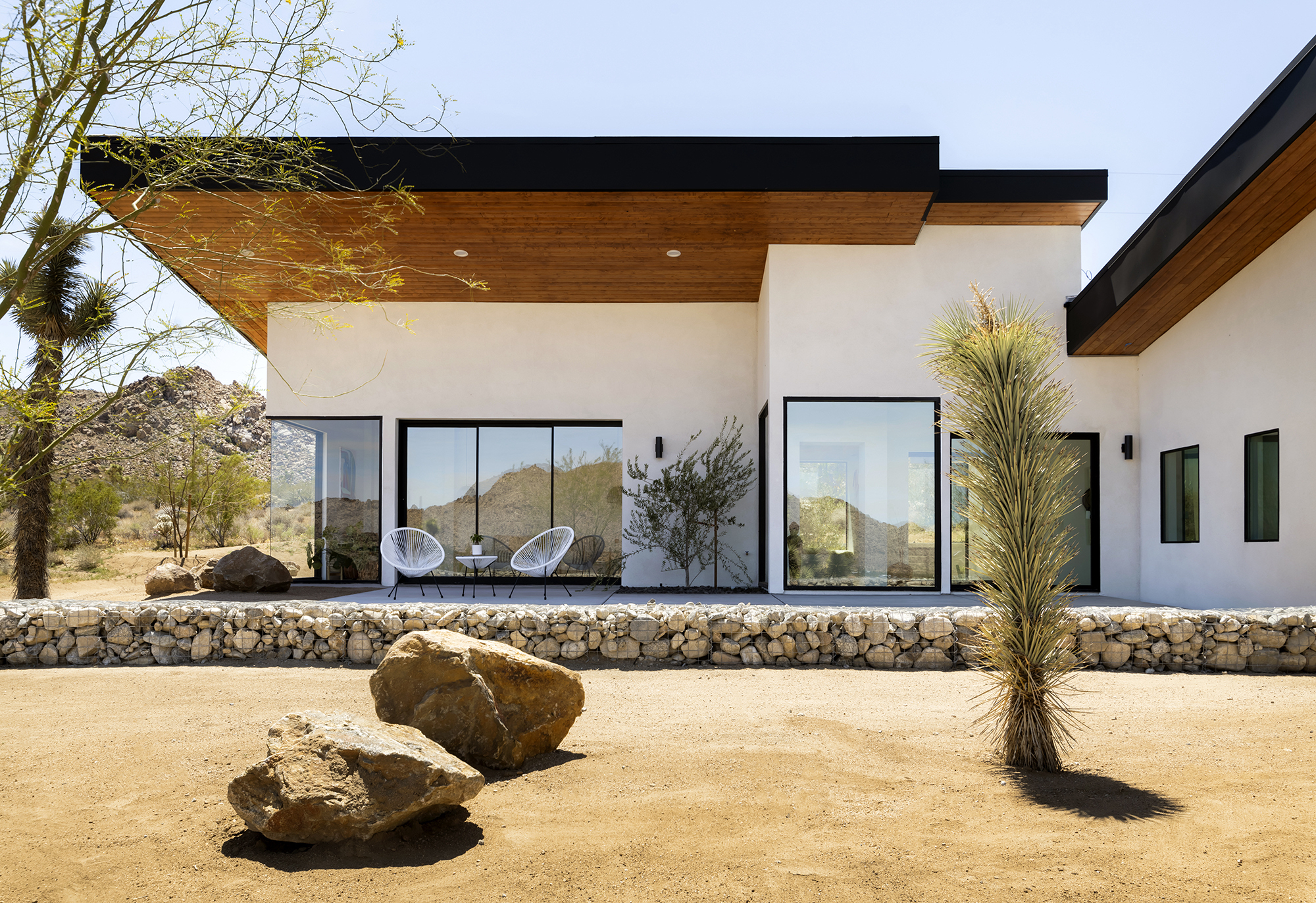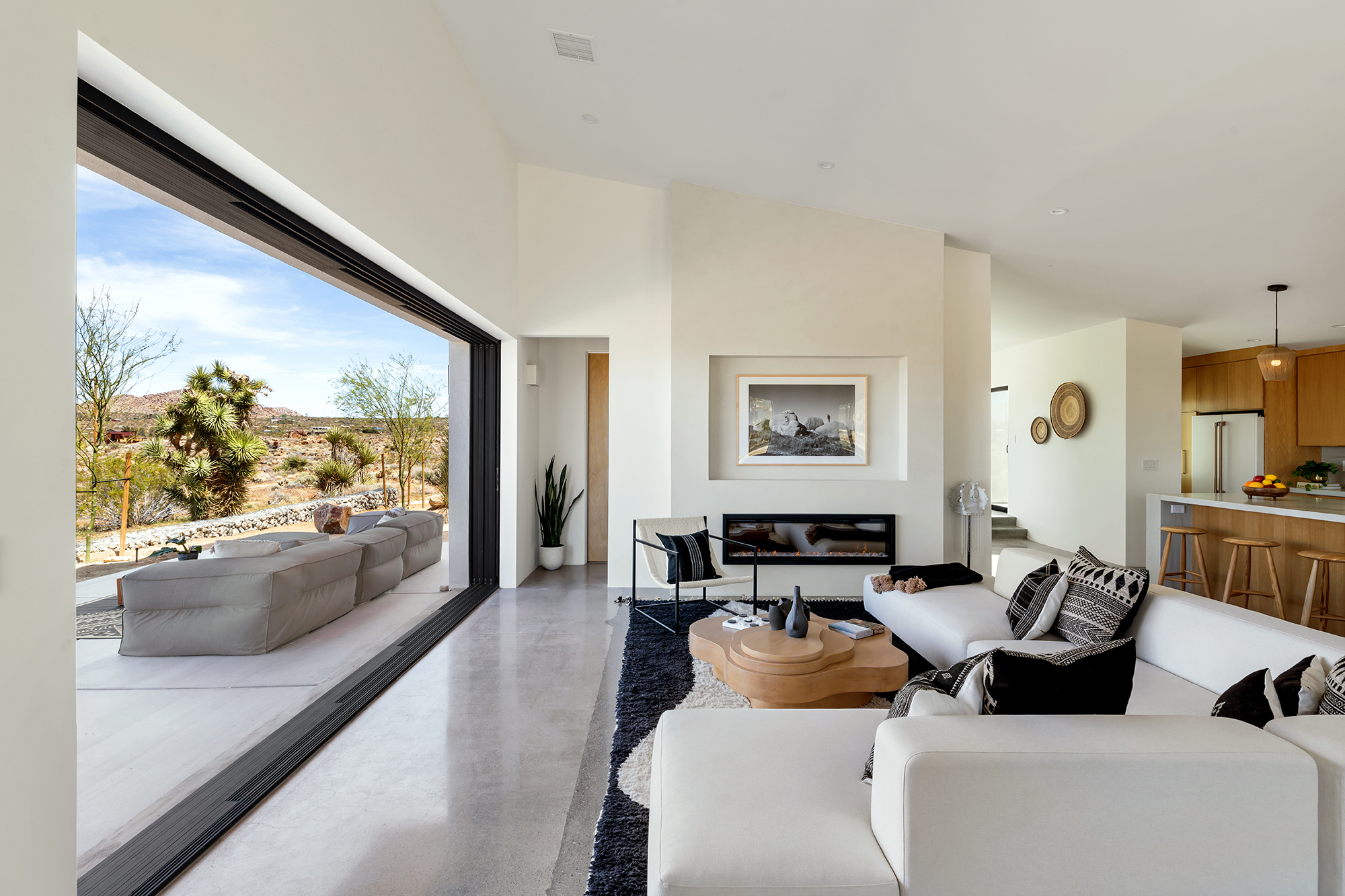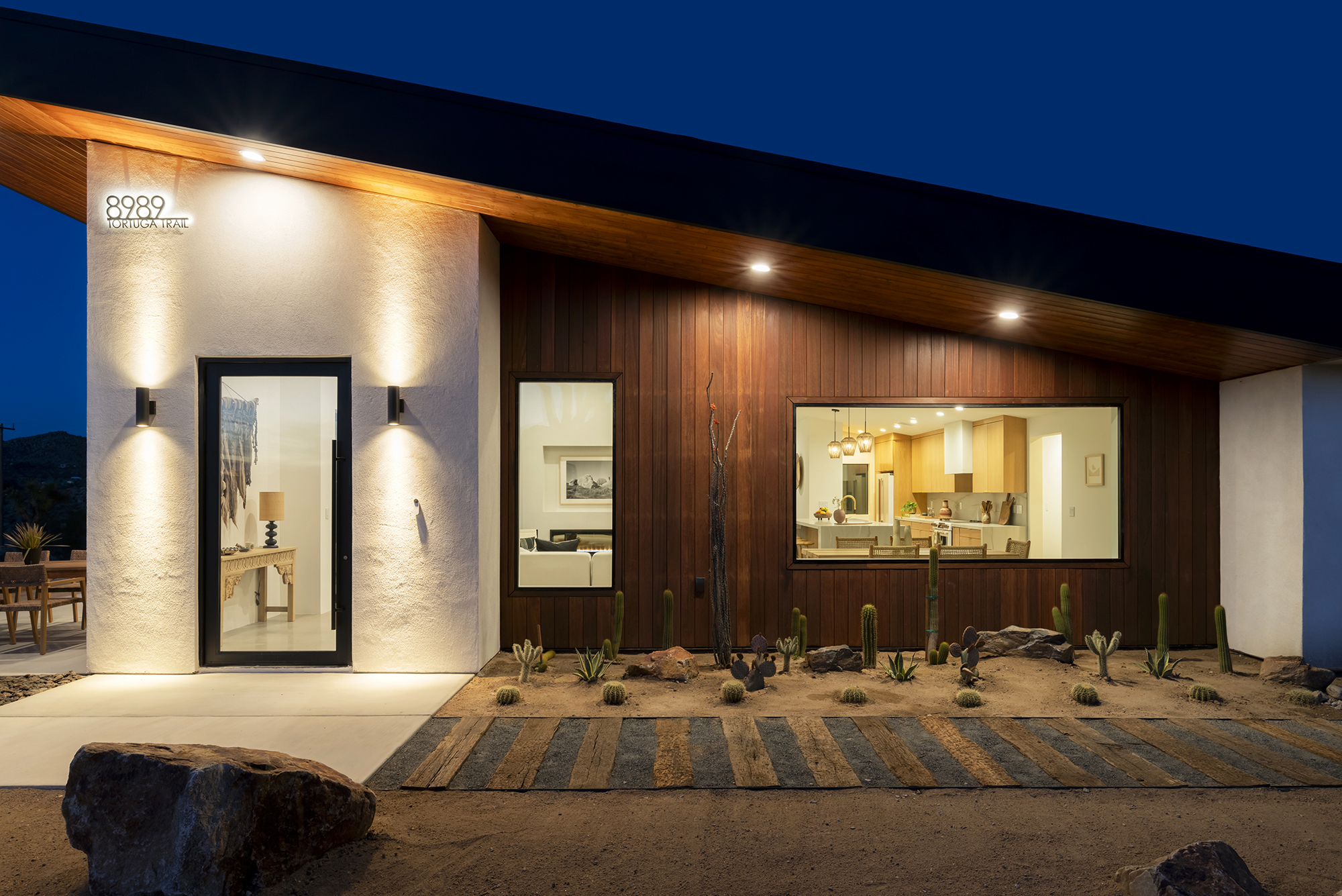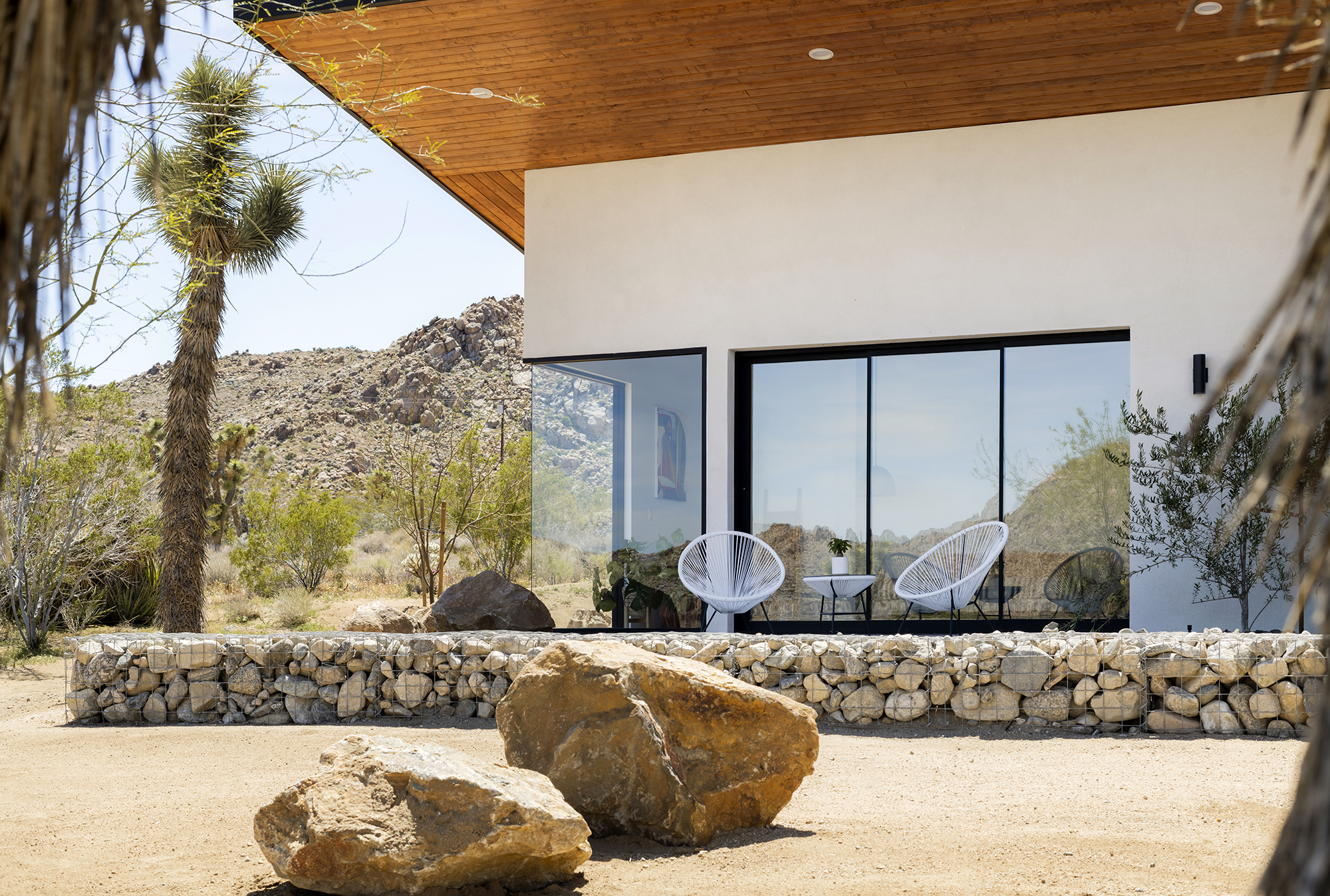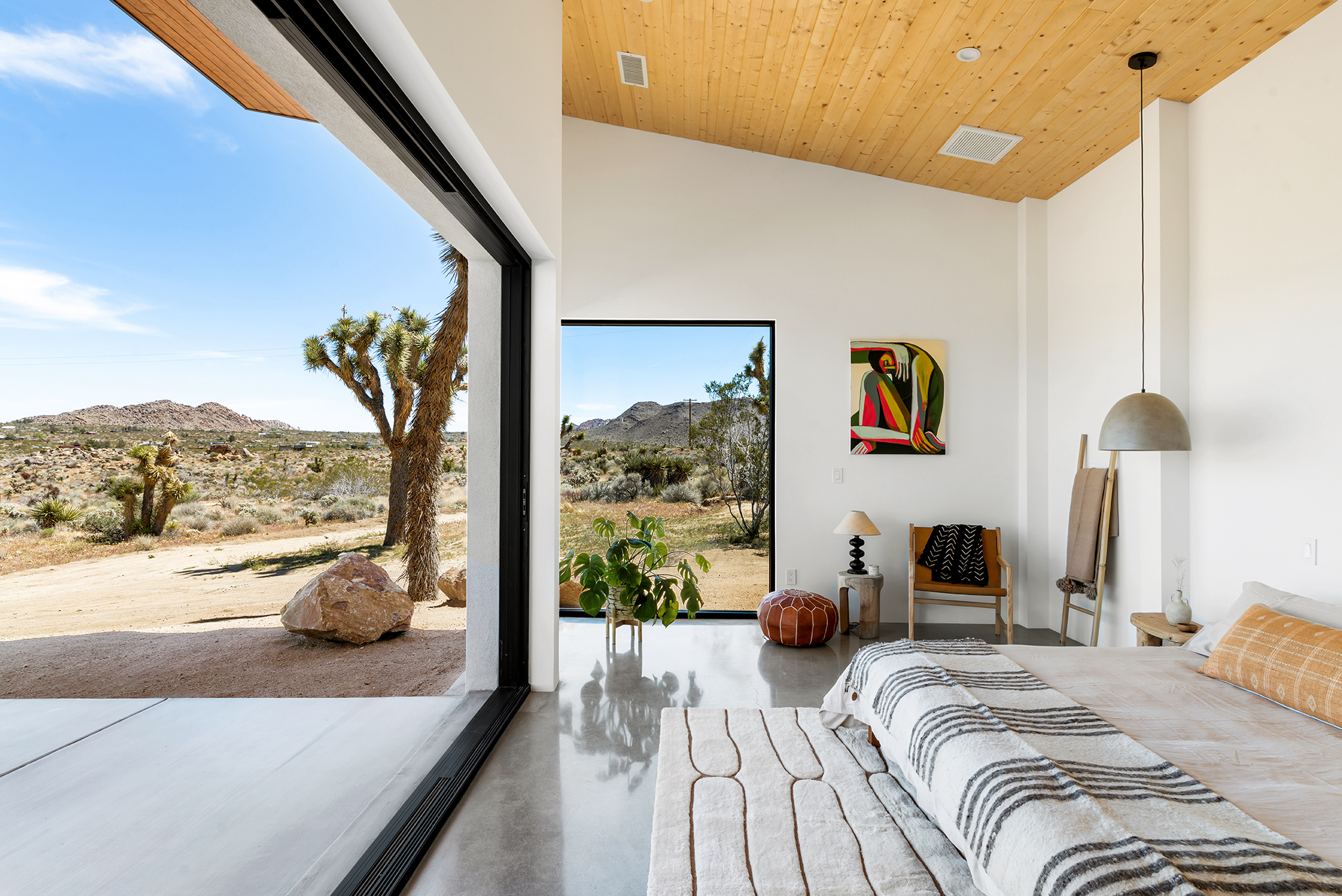 string(1849) "Contemporary Desert Masterpiece: Classic butterfly roof design with a 15' tall soaring eve gracing the front of this meticulous new construction. The tall eves, providing shaded outdoor space, when combined with a 15' wide disappearing sliding-glass wall create an authentic indoor/outdoor living experience. Step into the redwood hot tub out front, with a majestic boulder mountain, perfectly framed through the massive glass wall when viewed from inside the spacious Great Room. Formal entry is through an 8' tall by 4' wide pivot glass door. The custom kitchen showcases a massive quartz double waterfall island and hand-built cabinetry, allowing for an ideal social space with the dining area and kitchen filling out the rest of the Great Room. One reaches the en suite primary bedroom down a long glass encased hallway. The primary bedroom also features an unobstructed frameless cantilevered corner window utilized by Frank Lloyd Wright in the Ennis House built in the Hollywood Hills exactly a century ago. The primary bathroom features a nearly 6' by 10' massive window looking out at the mountain range to the south, while the guest bathroom has a door opening to an exterior platform, for a total of 3 full baths and 3 bedrooms spread over 2,287 square feet of interior living space. Inspired by midcentury design throughout, each room features endless glass, illuminating the interior and looking out over vast wilderness in every direction. Tucked up near the Joshua Tree National Park on a large 2.5-acre parcel, one can hike from home into the Park or drive to the main entrance gate a short distance up the road. Located in the coveted Monument Manor/Joshua Highlands neighborhood, often referred to as the Bel Air of Joshua Tree, the location offers privacy, prestige and convenience for those seeking serene wilderness surroundings."