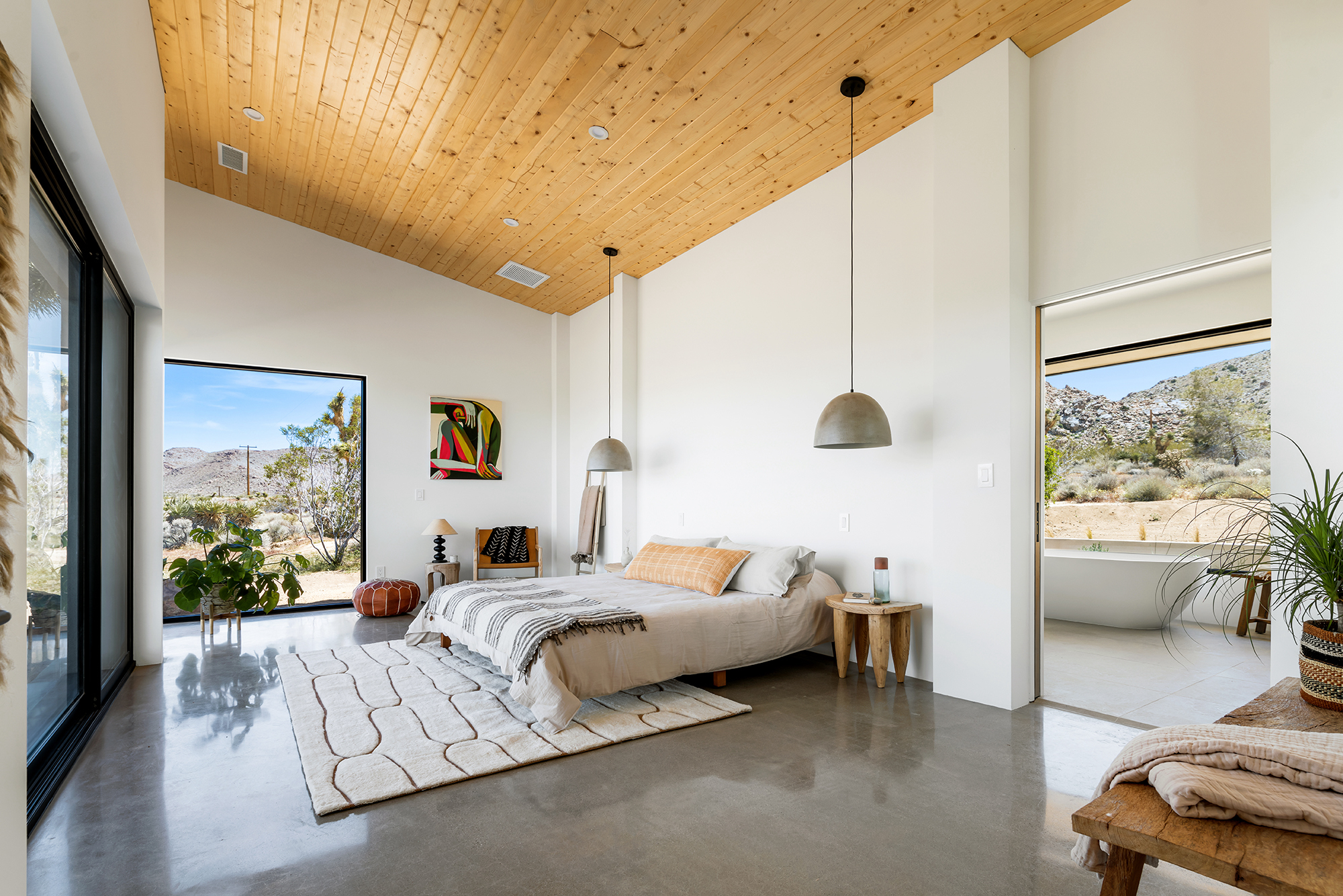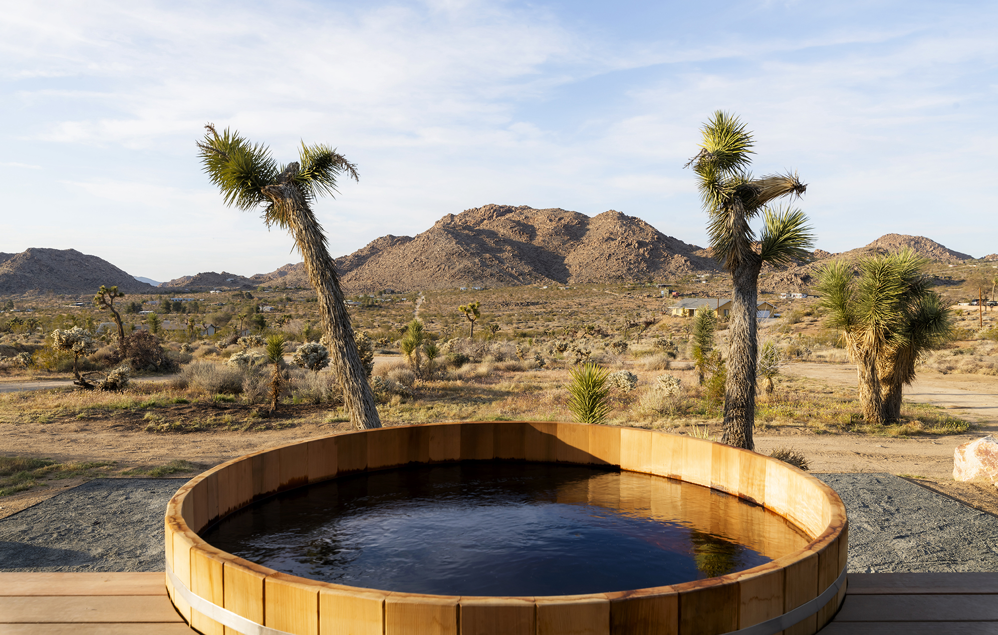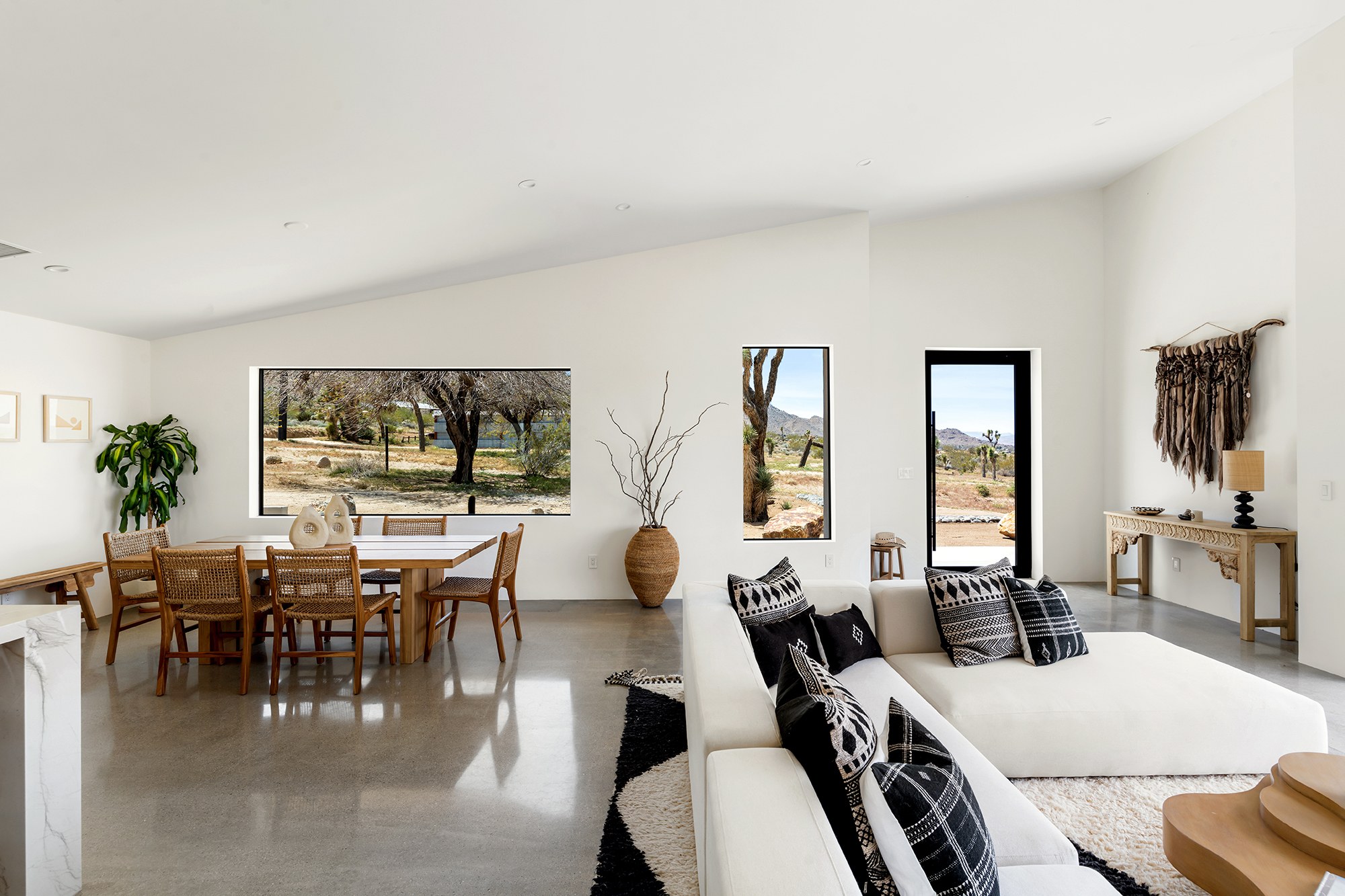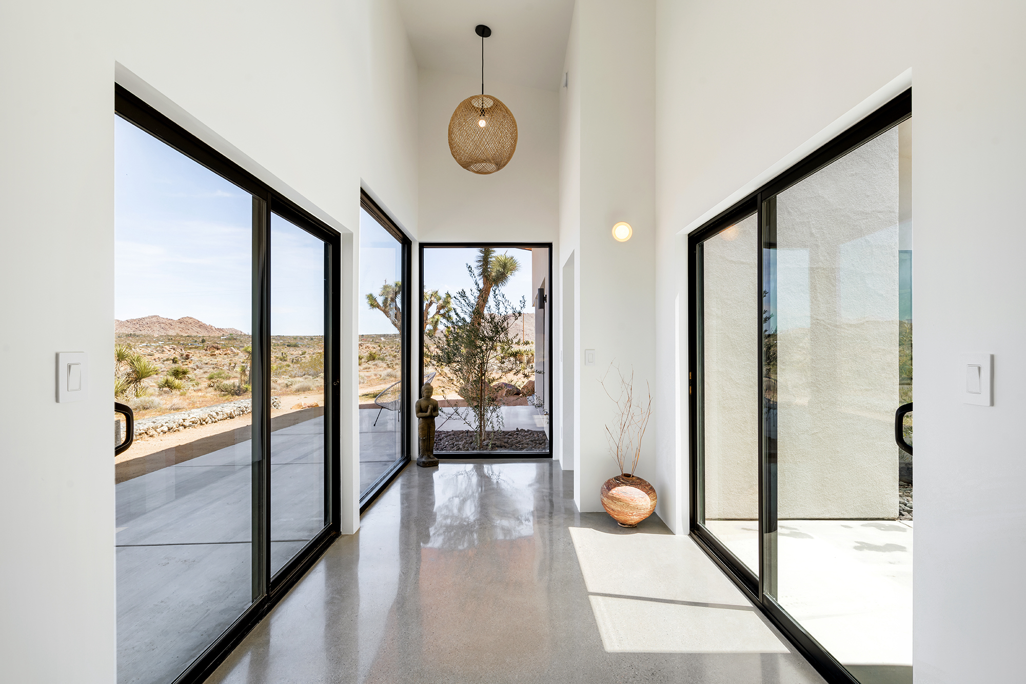 string(1849) "Contemporary Desert Masterpiece: Classic butterfly roof design with a 15' tall soaring eve gracing the front of this meticulous new construction. The tall eves, providing shaded outdoor space, when combined with a 15' wide disappearing sliding-glass wall create an authentic indoor/outdoor living experience. Step into the redwood hot tub out front, with a majestic boulder mountain, perfectly framed through the massive glass wall when viewed from inside the spacious Great Room. Formal entry is through an 8' tall by 4' wide pivot glass door. The custom kitchen showcases a massive quartz double waterfall island and hand-built cabinetry, allowing for an ideal social space with the dining area and kitchen filling out the rest of the Great Room. One reaches the en suite primary bedroom down a long glass encased hallway. The primary bedroom also features an unobstructed frameless cantilevered corner window utilized by Frank Lloyd Wright in the Ennis House built in the Hollywood Hills exactly a century ago. The primary bathroom features a nearly 6' by 10' massive window looking out at the mountain range to the south, while the guest bathroom has a door opening to an exterior platform, for a total of 3 full baths and 3 bedrooms spread over 2,287 square feet of interior living space. Inspired by midcentury design throughout, each room features endless glass, illuminating the interior and looking out over vast wilderness in every direction. Tucked up near the Joshua Tree National Park on a large 2.5-acre parcel, one can hike from home into the Park or drive to the main entrance gate a short distance up the road. Located in the coveted Monument Manor/Joshua Highlands neighborhood, often referred to as the Bel Air of Joshua Tree, the location offers privacy, prestige and convenience for those seeking serene wilderness surroundings."