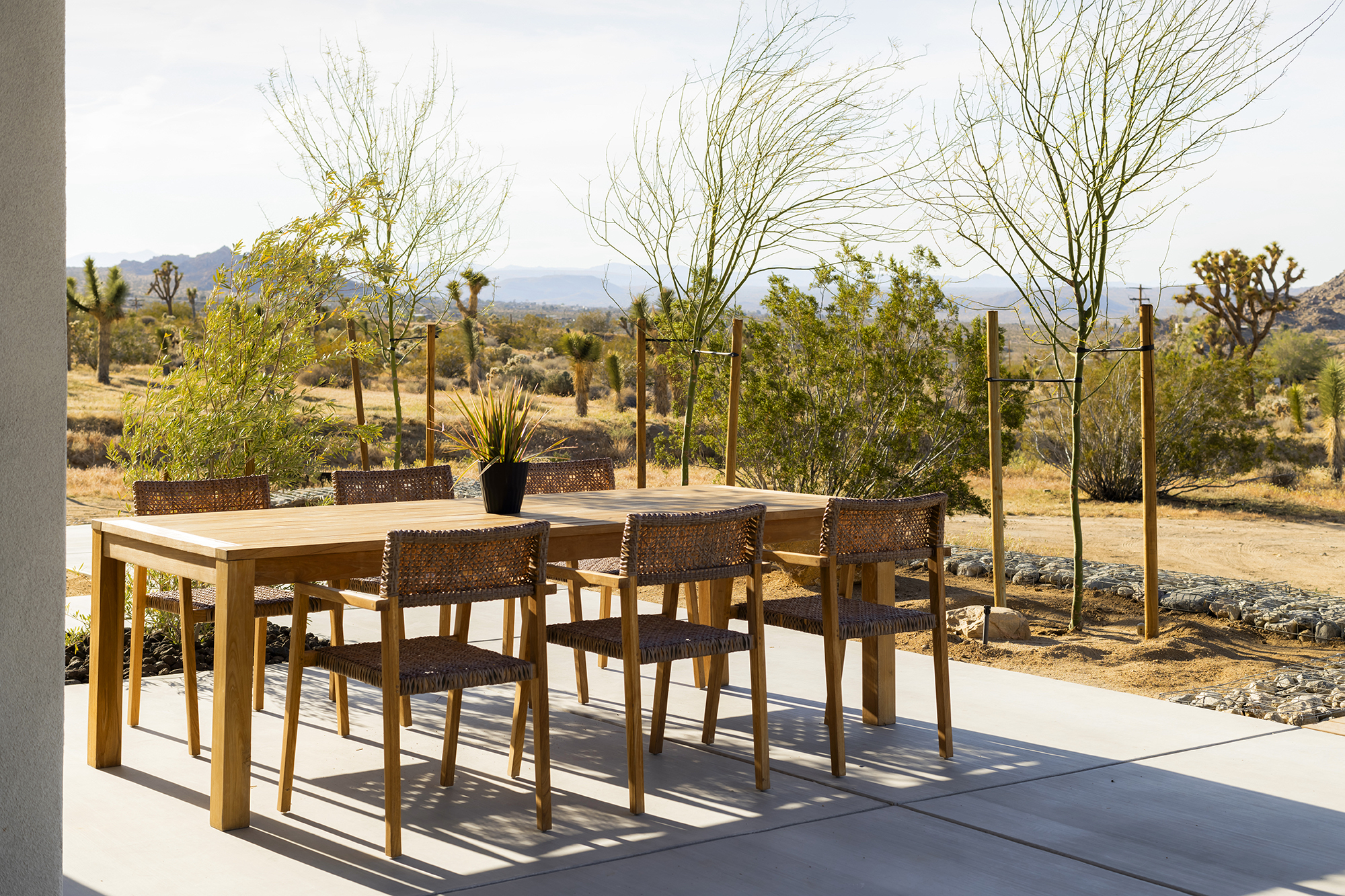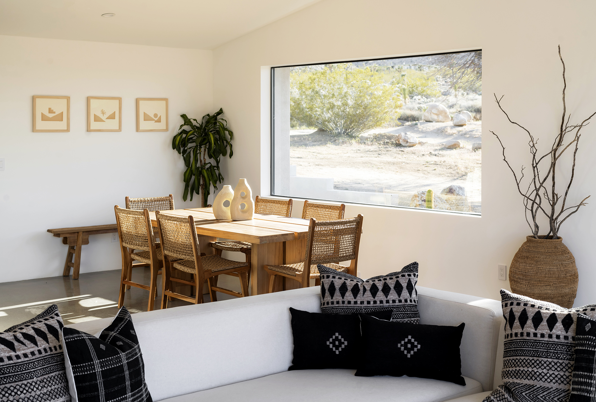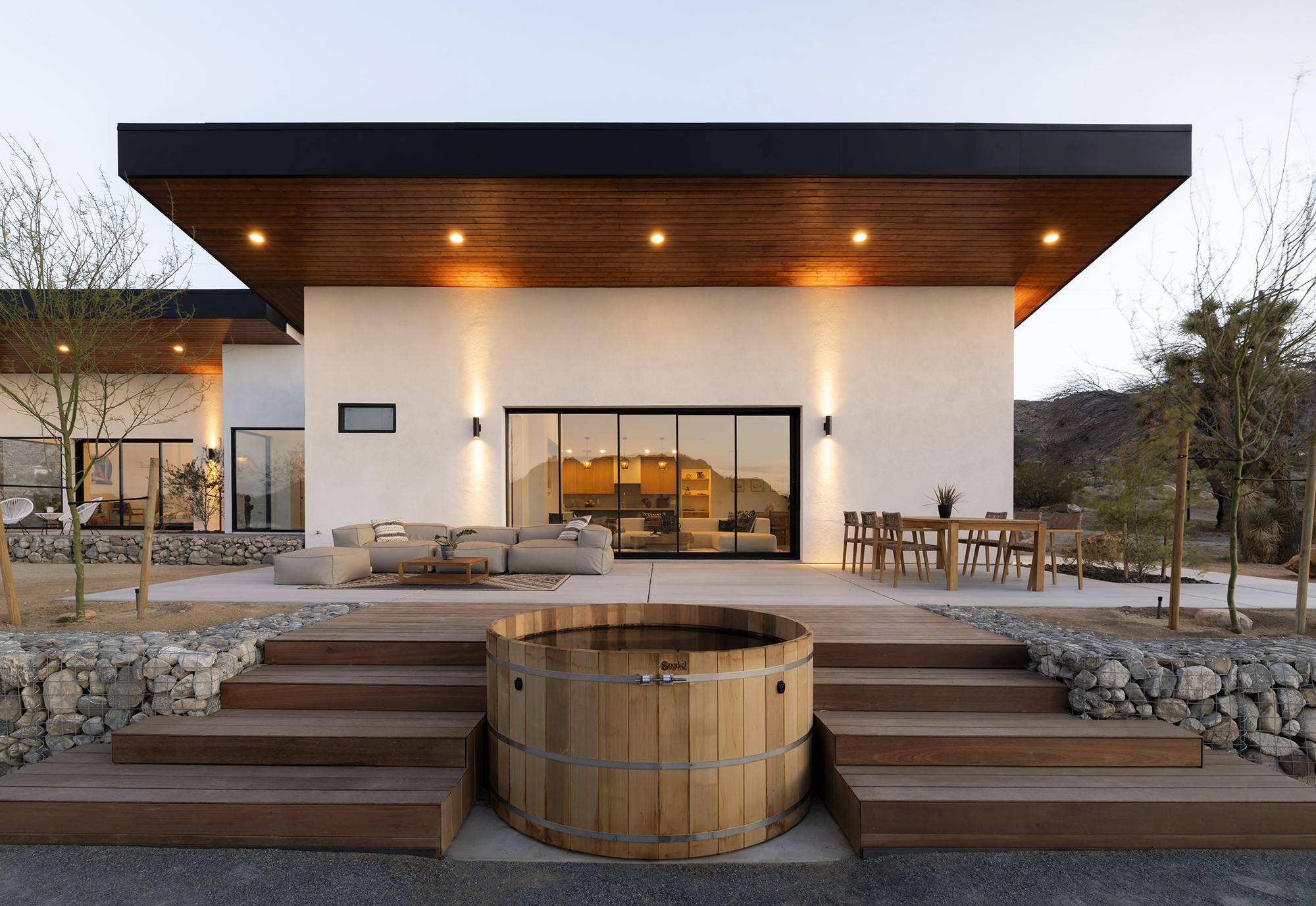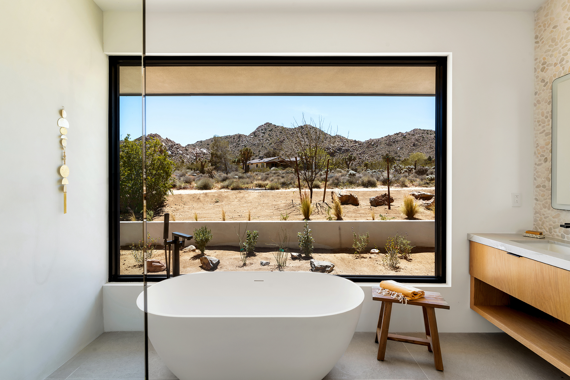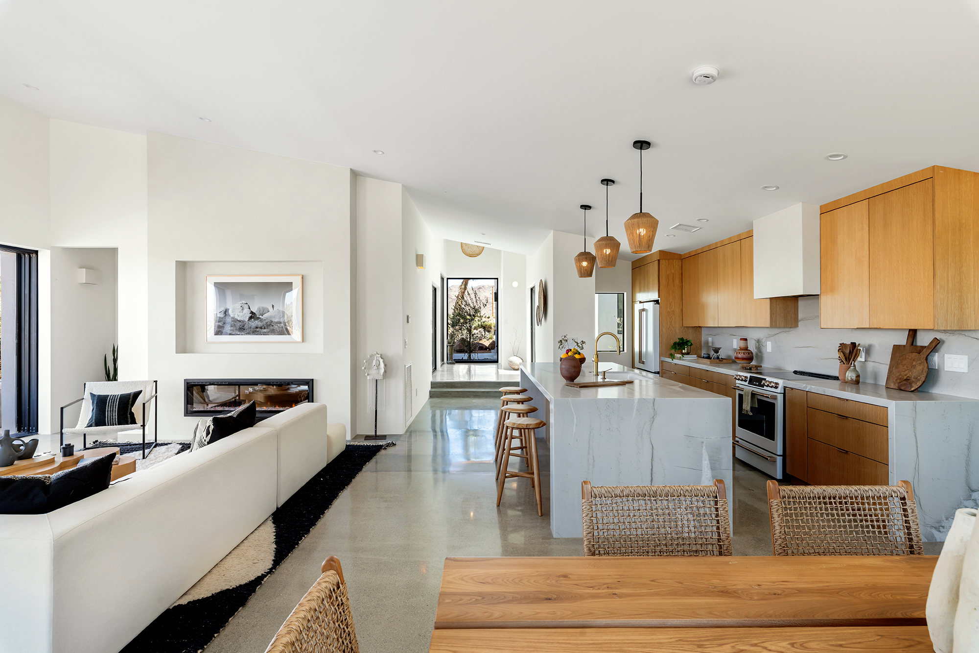 string(1849) "Contemporary Desert Masterpiece: Classic butterfly roof design with a 15' tall soaring eve gracing the front of this meticulous new construction. The tall eves, providing shaded outdoor space, when combined with a 15' wide disappearing sliding-glass wall create an authentic indoor/outdoor living experience. Step into the redwood hot tub out front, with a majestic boulder mountain, perfectly framed through the massive glass wall when viewed from inside the spacious Great Room. Formal entry is through an 8' tall by 4' wide pivot glass door. The custom kitchen showcases a massive quartz double waterfall island and hand-built cabinetry, allowing for an ideal social space with the dining area and kitchen filling out the rest of the Great Room. One reaches the en suite primary bedroom down a long glass encased hallway. The primary bedroom also features an unobstructed frameless cantilevered corner window utilized by Frank Lloyd Wright in the Ennis House built in the Hollywood Hills exactly a century ago. The primary bathroom features a nearly 6' by 10' massive window looking out at the mountain range to the south, while the guest bathroom has a door opening to an exterior platform, for a total of 3 full baths and 3 bedrooms spread over 2,287 square feet of interior living space. Inspired by midcentury design throughout, each room features endless glass, illuminating the interior and looking out over vast wilderness in every direction. Tucked up near the Joshua Tree National Park on a large 2.5-acre parcel, one can hike from home into the Park or drive to the main entrance gate a short distance up the road. Located in the coveted Monument Manor/Joshua Highlands neighborhood, often referred to as the Bel Air of Joshua Tree, the location offers privacy, prestige and convenience for those seeking serene wilderness surroundings."