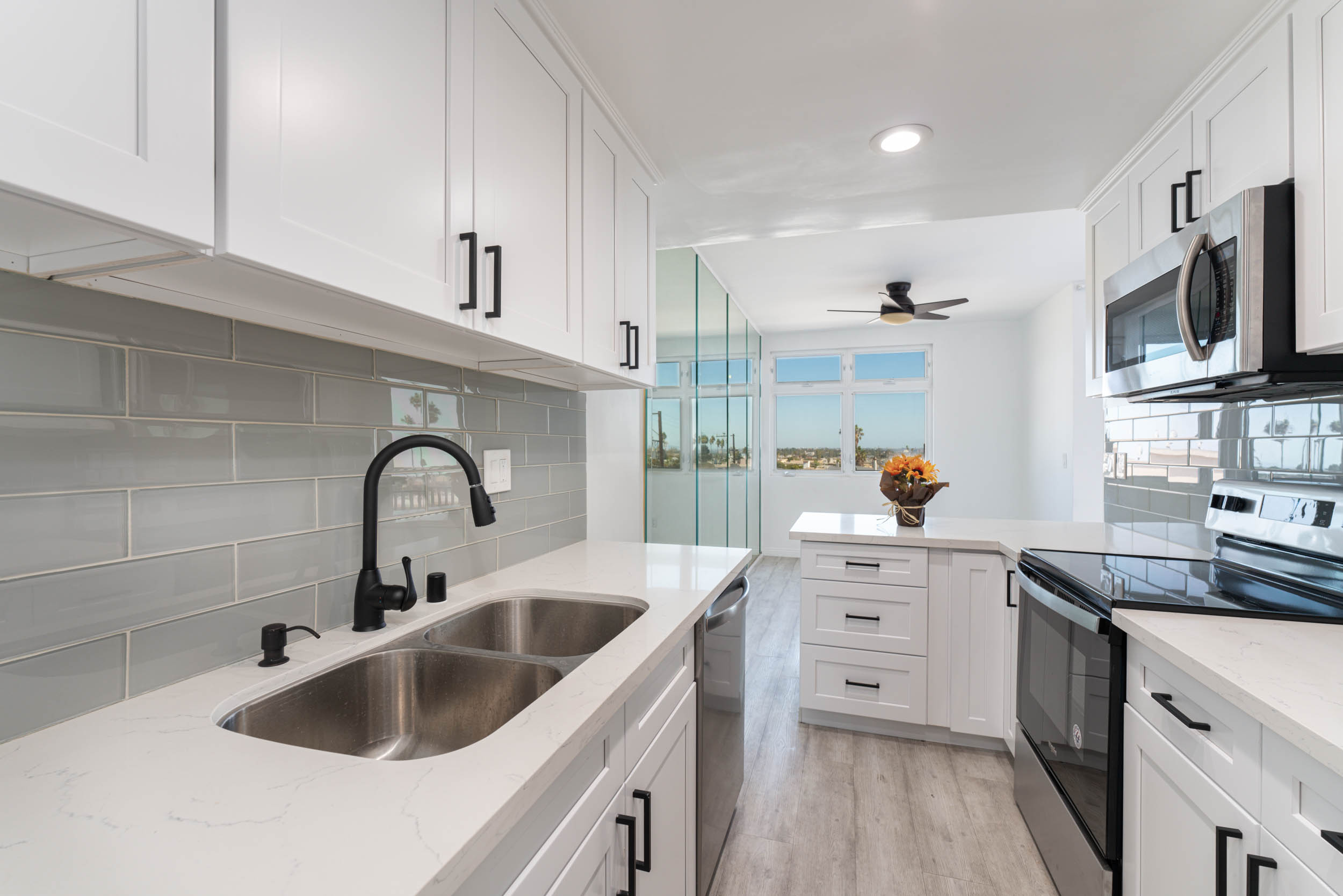 Stunningly remodeled penthouse with abundant natural light and peek-a-boo ocean vistas, nestled in the vibrant heart of Santa Monica just moments from the chic boutiques of Montana Avenue. This rare corner unit boasts 2 bedrooms and 2 bathrooms, each offering expansive views of both the coastline and mountains. The modern gourmet kitchen is a chef's dream, featuring quartz countertops, stainless steel appliances, bespoke shaker cabinetry, and a convenient breakfast bar that seamlessly connects to the dining area. Throughout the condo, you'll find elegant light gray flooring complemented by a pristine white tiled fireplace. Indulge in luxury within the master bathroom, which showcases custom vanities, a sumptuous bathtub, and a separate glass door shower. With only a block separating you from the bustling shops and dining options of Montana Avenue, and mere minutes from Palisades Park, Third Street Promenade, and the beach, convenience and leisure are at your fingertips. Additional amenities include two side-by-side parking spaces, a recreational room, hot tub, and sauna, ensuring a lifestyle of both comfort and indulgence.