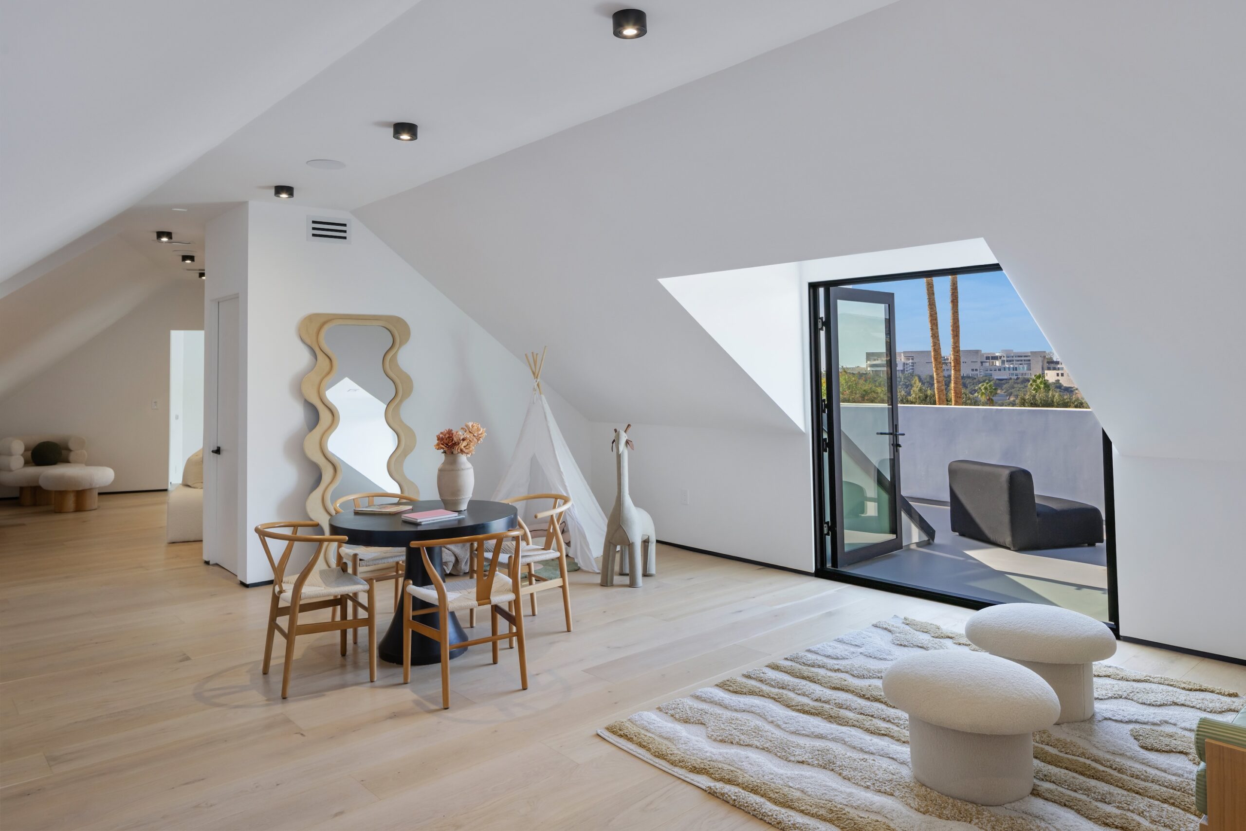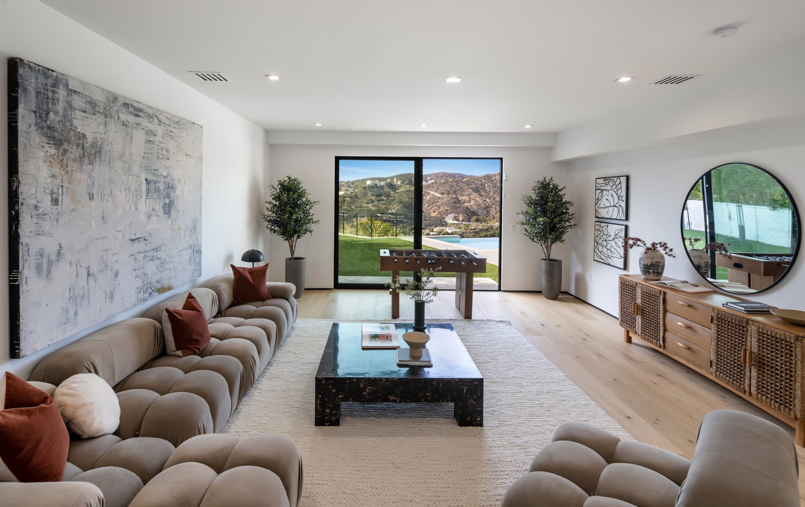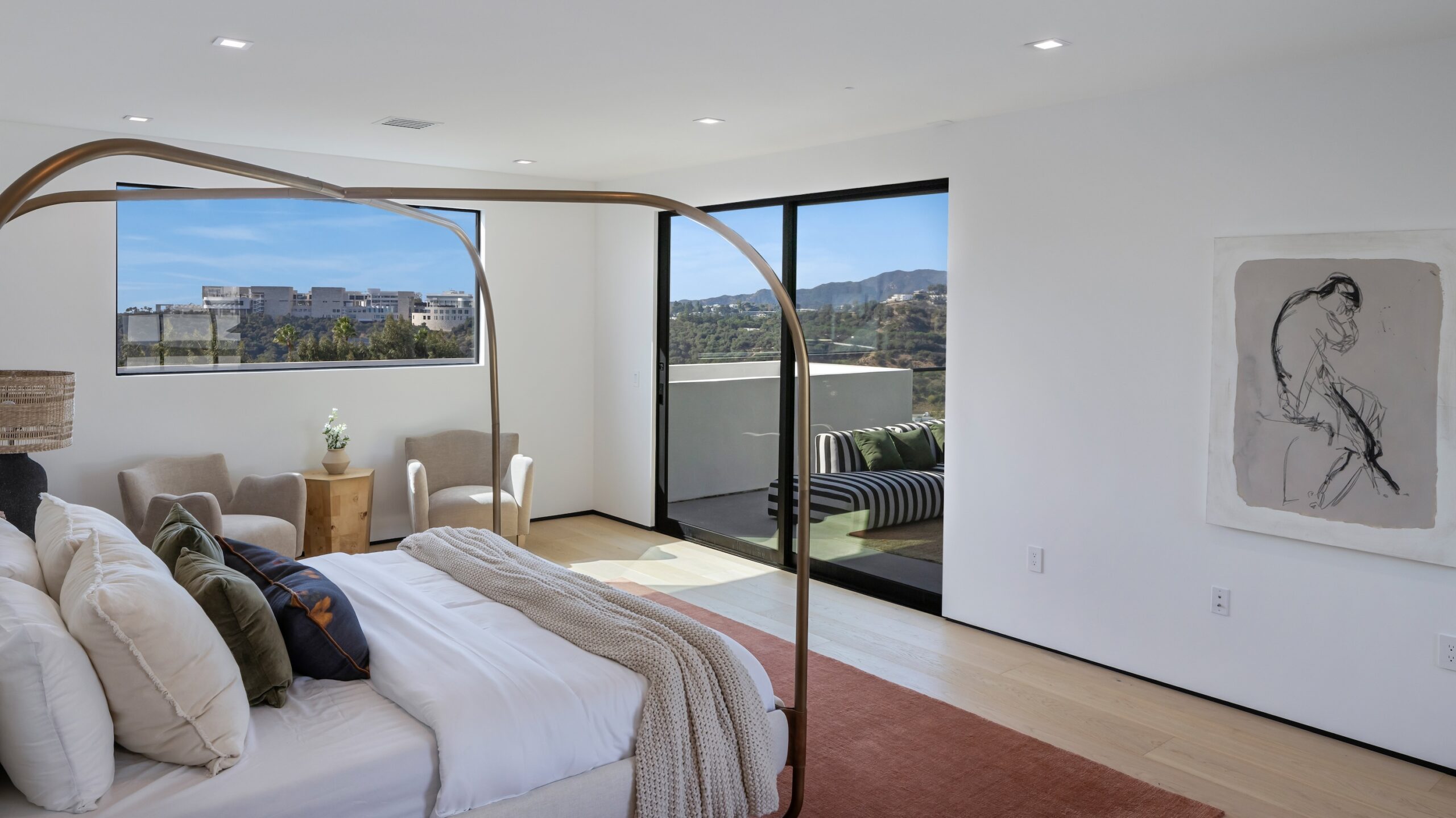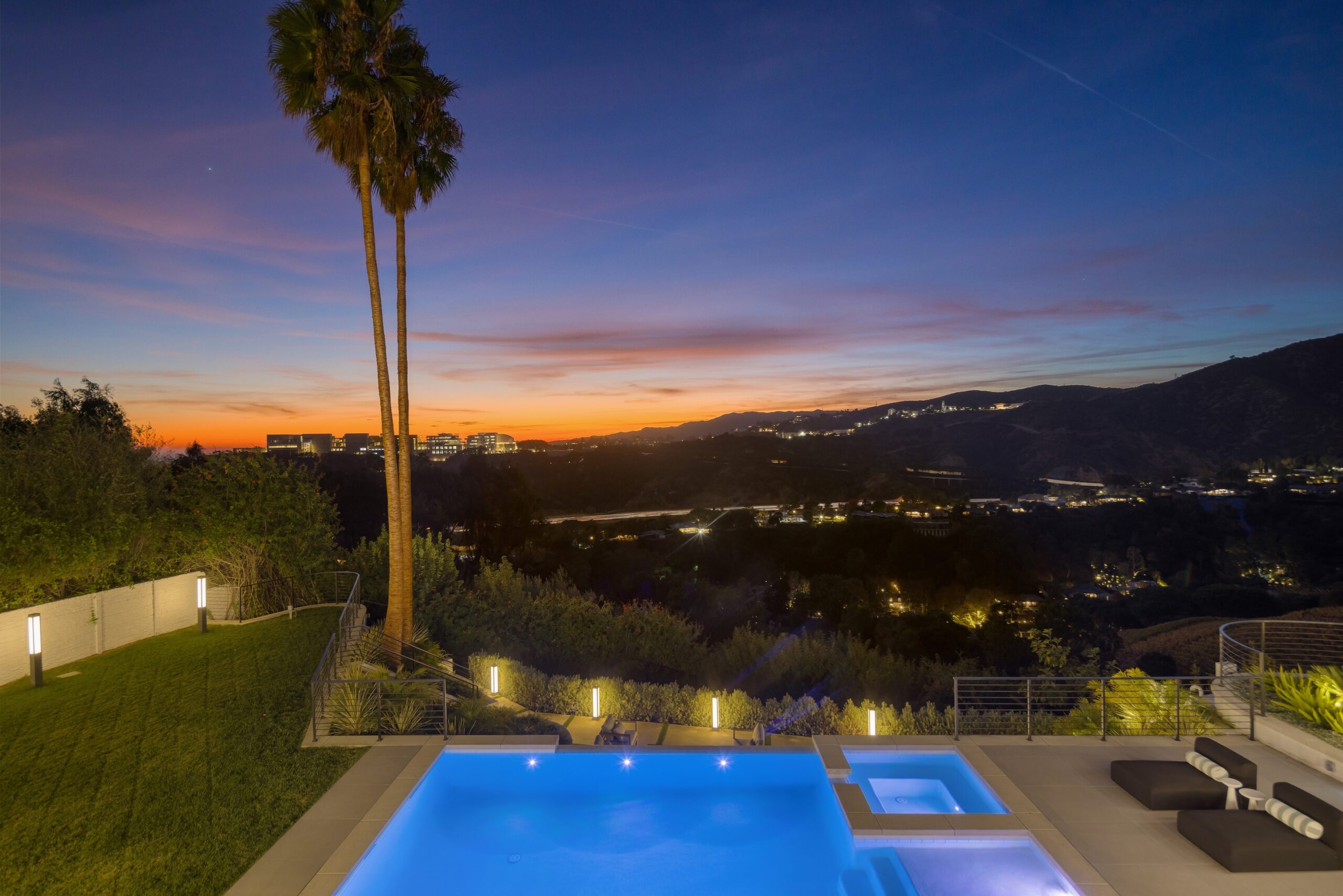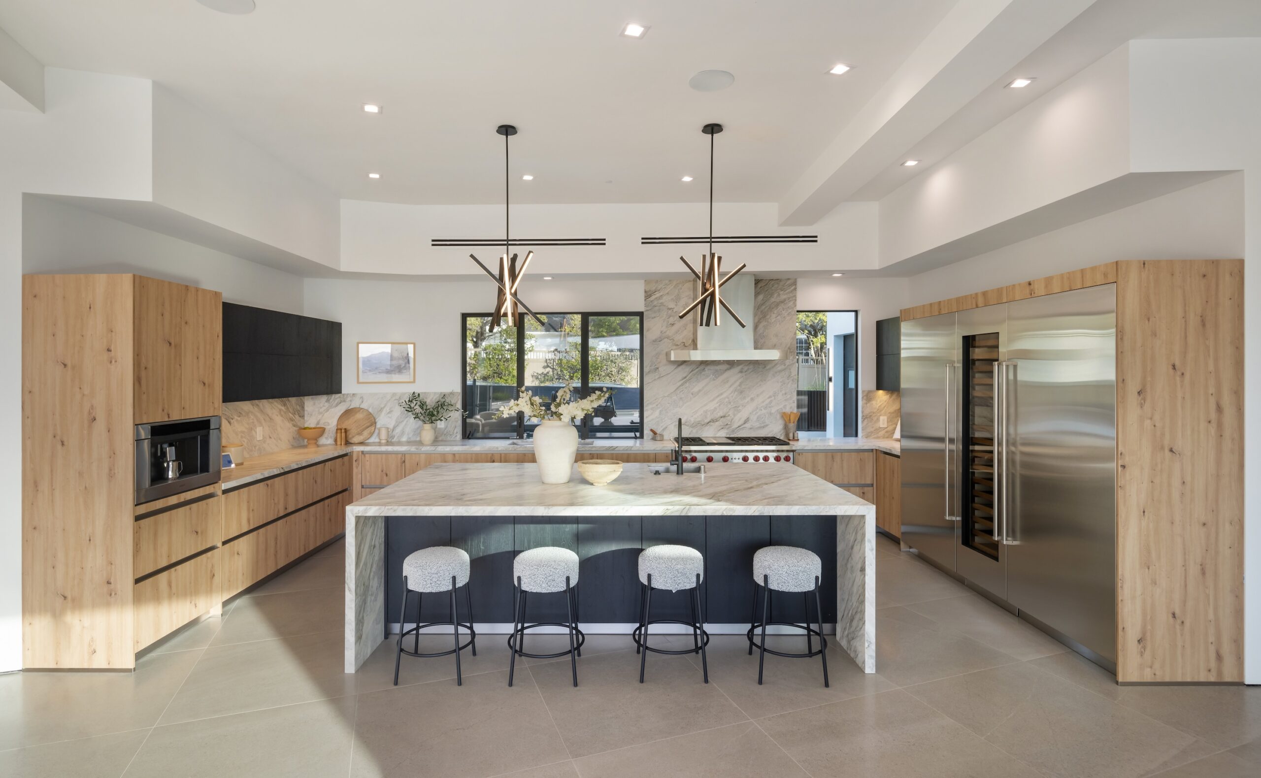 This stunning architectural estate, set on over half an acre, offers breathtaking views of the Getty Museum, Moraga Vineyard, mountains, and the ocean. Thoughtfully designed for modern luxury and timeless elegance, the home features expansive living spaces framed by floor-to-ceiling Fleetwood glass doors that blend indoor and outdoor living seamlessly. The state-of-the-art kitchen is a masterpiece with Bauformat German cabinetry, a Wolf 48" range, Sub-Zero refrigerator and freezer, a built-in Wolf coffee system, and Bianco Stella Honed Dolomite countertops and backsplash. The main level boasts four bedrooms, including a luxurious primary suite with a spa-like bath featuring Calacatta Vision Honed Marble and a private outdoor retreat. Upstairs are two junior suites with private decks, plus space for an office and a gym or playroom. The backyard is a resort-style oasis with an infinity pool, spa, sprawling lawn, and multiple outdoor entertaining areas. Highlights include a powder room with Explosion Blue Honed Granite, a Namibian Black Honed Granite fireplace and bar, and advanced smart home technology throughout. Located near John Thomas Dye and Community Magnet Charter Schools and just minutes from Brentwood, Beverly Hills, and Sunset Boulevard, this estate redefines luxury living in an unbeatable location.