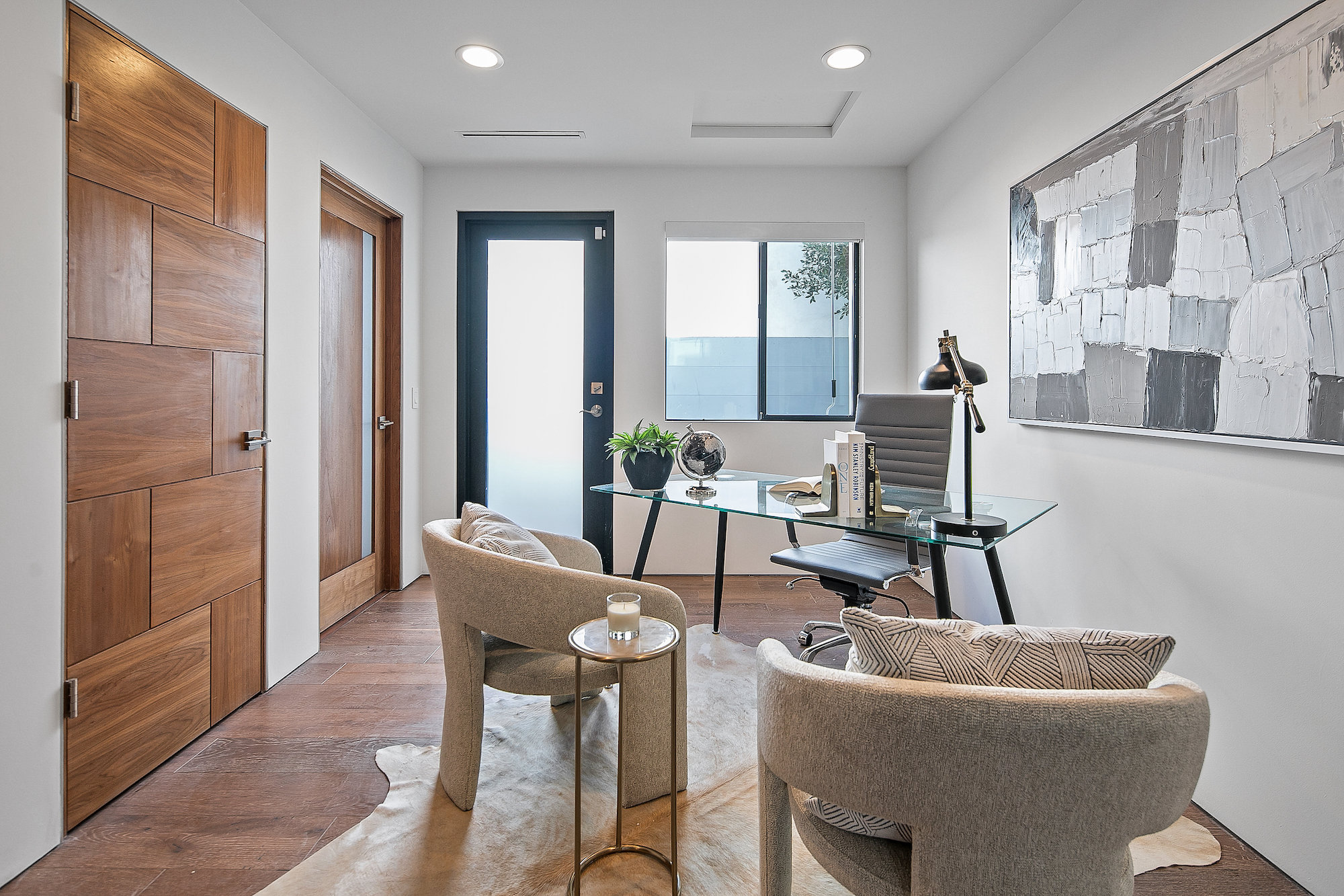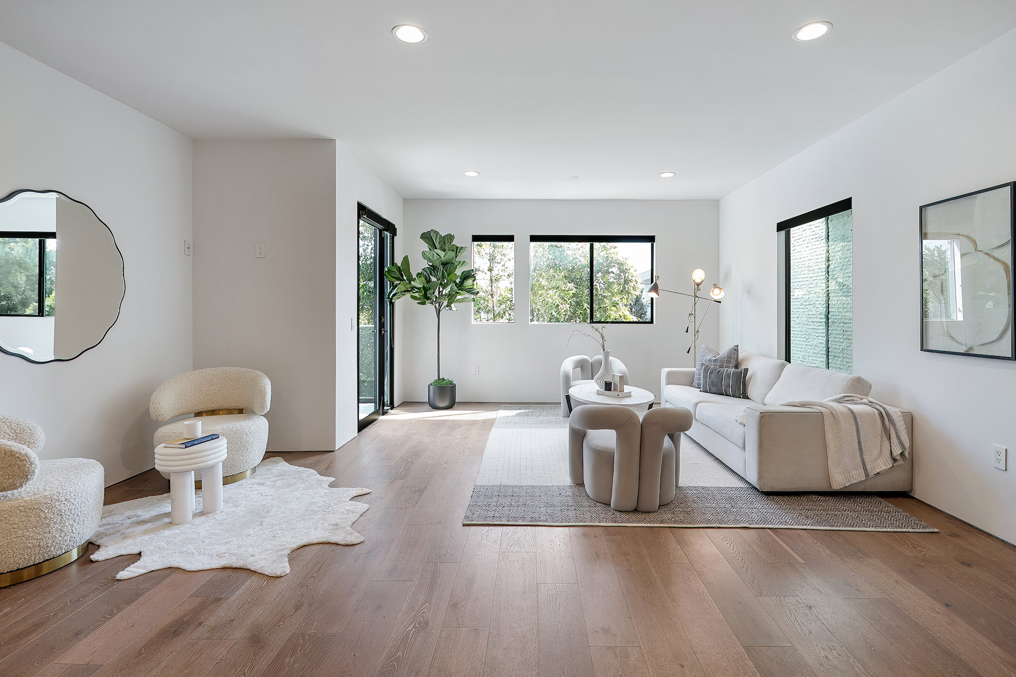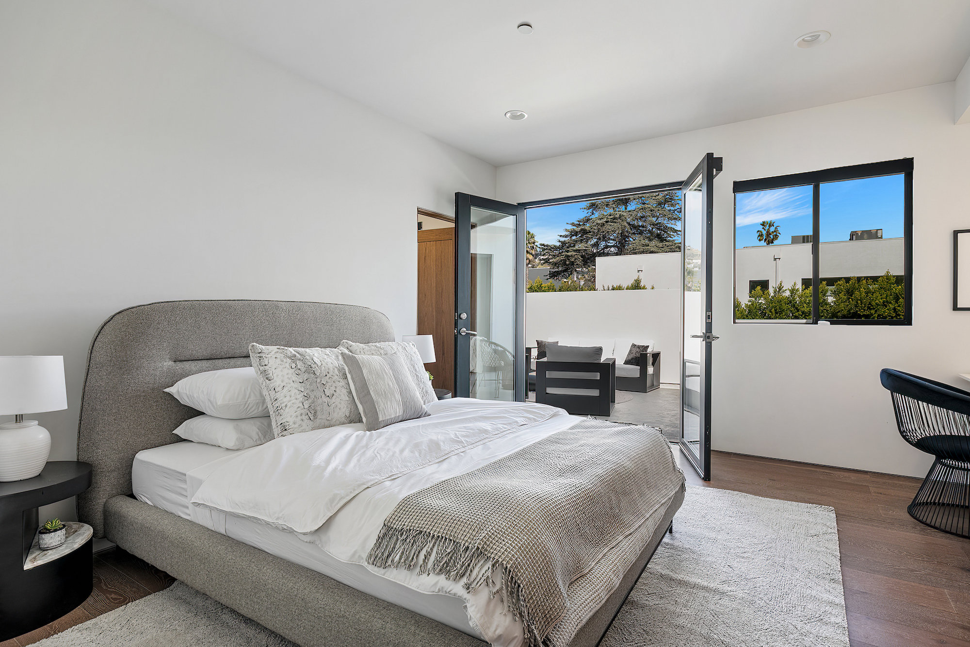 Centrally located Contemporary home, West Hollywood adjacent, a short distance to Beverly Hills, Sunset Strip, Melrose Shopping District and other iconic LA destinations, restaurants, day and night life. 4 bed, 4.5 baths with 12' to 20' foot ceilings, 12' sliding glass doors, and rooftop deck with views of the Hollywood Hills. Multiple skylights and walls of glass invite a flood of afternoon sun. Three en-suite beds on second level and one en-suite bed on main level. All beds on second level open to a connective rooftop deck. 80 sq ft pavilion makes for an ideal recording studio, yoga, fitness, meditation or office with city views. Expansive open floor plan and Chef's kitchen with Miele appliances. Great room opens to a heated pool and spa and enchanting backyard with lush landscaping and privacy. Ideal for entertaining and summer dinner parties. Gated and secure with parking for four. SONOS, Nests, and automatic shades throughout.