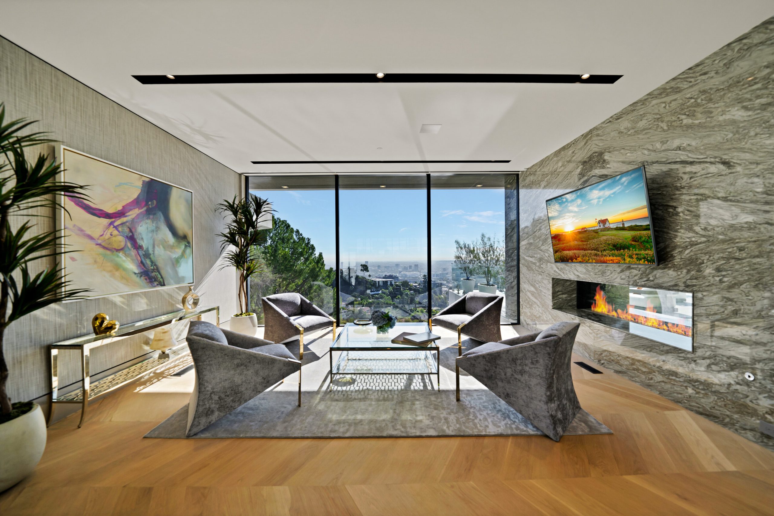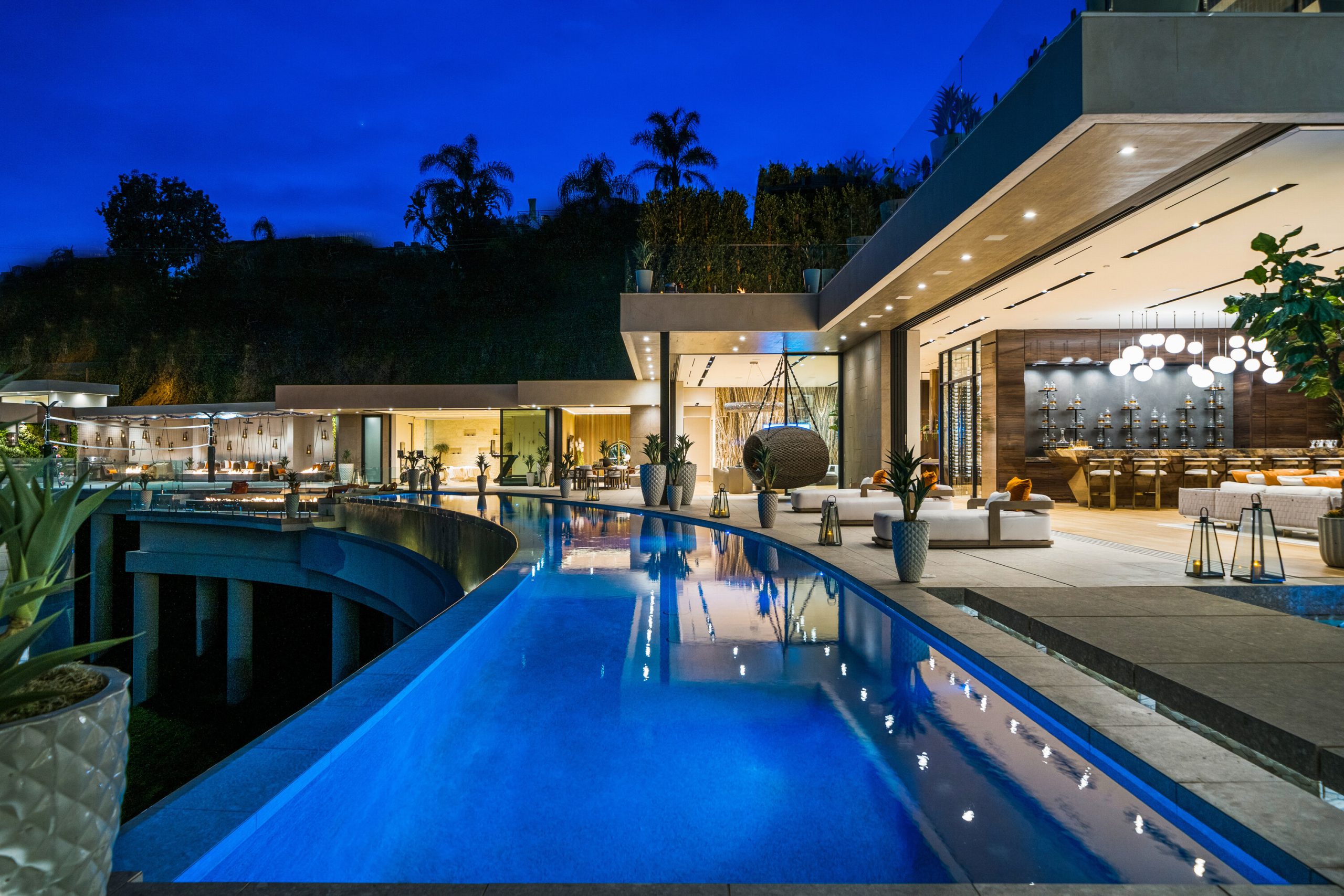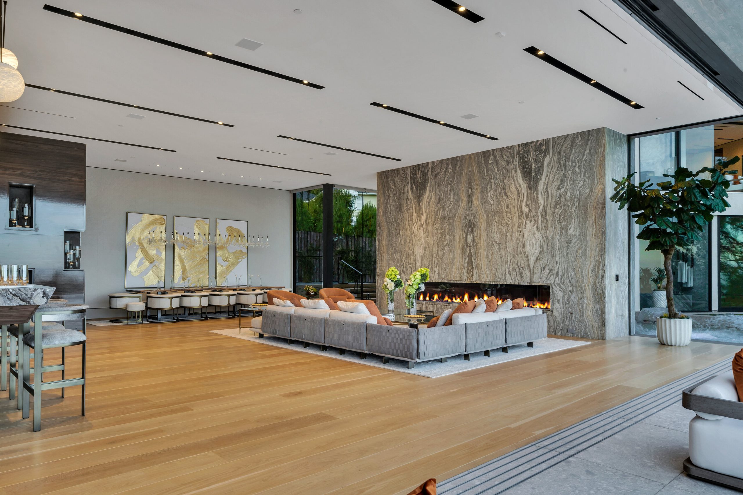 Seller accepts crypto! Conceived and executed with the modern mogul's ambition top of mind, this newly constructed palace offers sweeping, uninterrupted views of the canyon and Los Angeles skyline, spanning 500 feet of frontage in a coveted Bird Streets enclave. Enter beneath a bespoke chandelier and cascading fountains into a 13-foot living room anchored by layered stone fireplaces. The Arclinea kitchen opens to a European-inspired wine room illuminated by a sculptural pendant. Floor-to-ceiling glass panels dissolve the line between indoors and outdoors, revealing expansive terraces with an 18-foot sunken fire pit, a 100-foot infinity pool, a 30-person spa, and a sand volleyball court, each set against sweeping vistas. The primary suite serves as a private retreat, featuring a reading vestibule, a 1,500-square-foot balcony with Jacuzzi and fire features, dual dressing rooms, and a travertine-clad bath with twin soaking tubs and panoramic views. Tailored for both comfort and spectacle, the home also includes a command center-style office, a full screening room, a gym, hookah and meditation lounges, a panic room, a shoeshine station, and more. Designed with intent, the residence is as functional as it is striking. Revel in the pinnacle of modern elegance, all while being enveloped by some of Southern California's most breathtaking views.