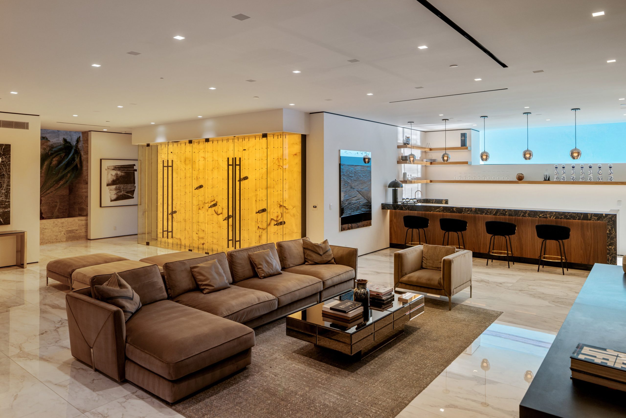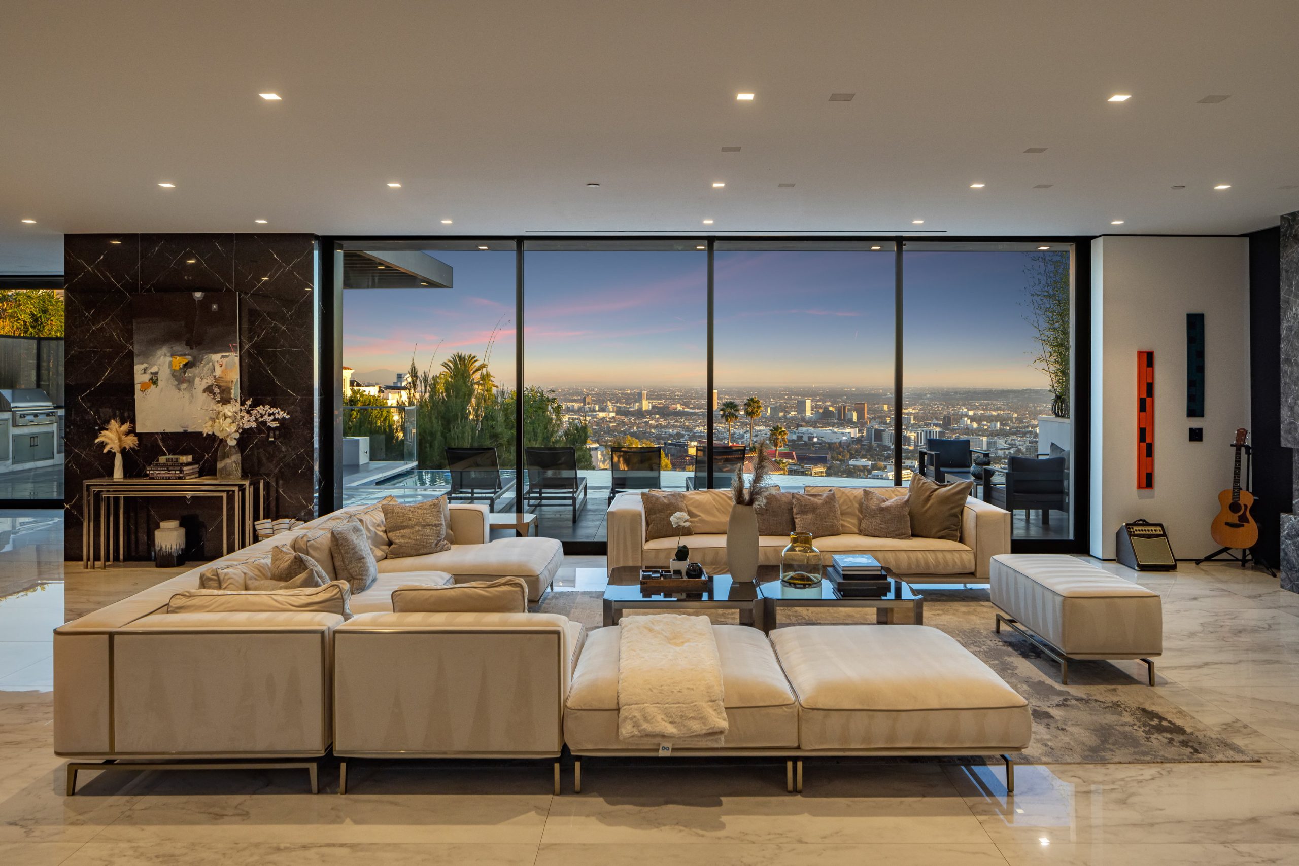 A rare architectural triumph, this estate exudes timeless sophistication and contemporary grace at every turn. From the moment you enter through the grand entry, you are immersed in a private realm of design excellence and tranquil opulence. Perfectly positioned in the prestigious Bird Streets of the Hollywood Hills, this modern showpiece showcases sweeping city and ocean views. Conceived by renowned architect Ameen Ayoub, the residence harmonizes bold modern architecture with inviting warmth achieving a seamless fusion of innovation and livability. Every element reflects masterful attention to detail. The gourmet kitchen is equipped with Miele appliances and refined bespoke finishes. Entertain in style beside the dramatic aquarium bar and infinity-edge pool, or display your collection in the striking honeycomb quartz wine gallery. Additional amenities include a sound-isolated theater, showcase garage, and a fully equipped wellness studio with sauna and steam shower. The primary suite offers an atmosphere of calm sophistication, featuring a statement fireplace, private terrace, dual spa-inspired baths, and a couture-quality dressing room. More than a residence, this property defines a lifestyle an expression of modern artistry, elevated comfort, and the quintessential Los Angeles experience.