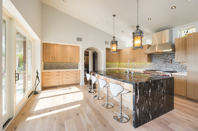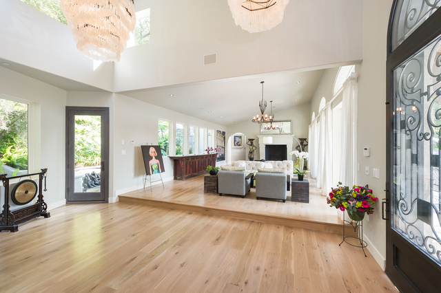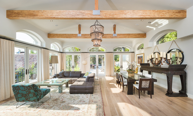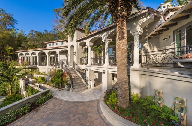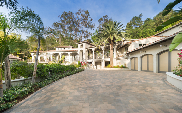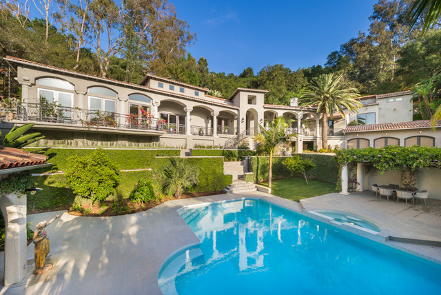 Enter through the private gates of Oak Pass Road in Beverly Hills, to this one of a kind gated Mediterranean compound with a contemporary interior. This lush and tropical private Villa was just completely remodeled by famed Aspen designer Denise Cohen, with the highest quality finishes throughout. Turkish travertine leads to the central 20-foot entry tower accented by custom ironwork. Landscaped gardens, enormous full guesthouse, 2 separate swimming pools, cabana area and 8000 sq ft of balcony space throughout, complete this 5 bed 7 bath estate. Two massive Cleveland Art cascading crystal chandeliers, hand selected white oak flooring, and a Zen outdoor waterfall adds to the ambiance of the home. Vaulted ceilings, sculpted wood-burning fireplace, formal dining room with 20 ft ceilings, contemporary cook's kitchen and a Master Suite with sliding doors leading to a private patio, connect with firewall and master pool and are just some of the amazing aspects of this home.