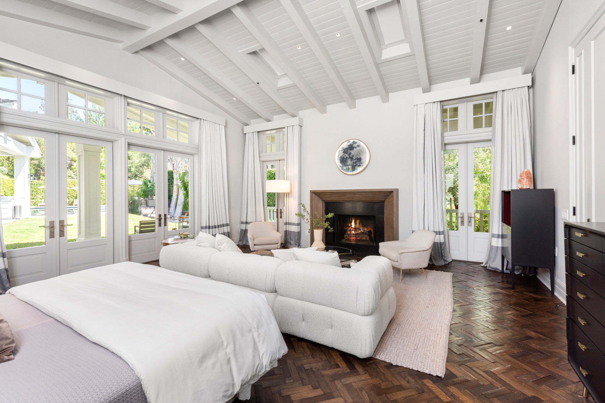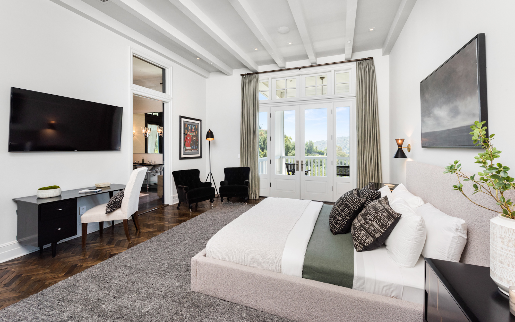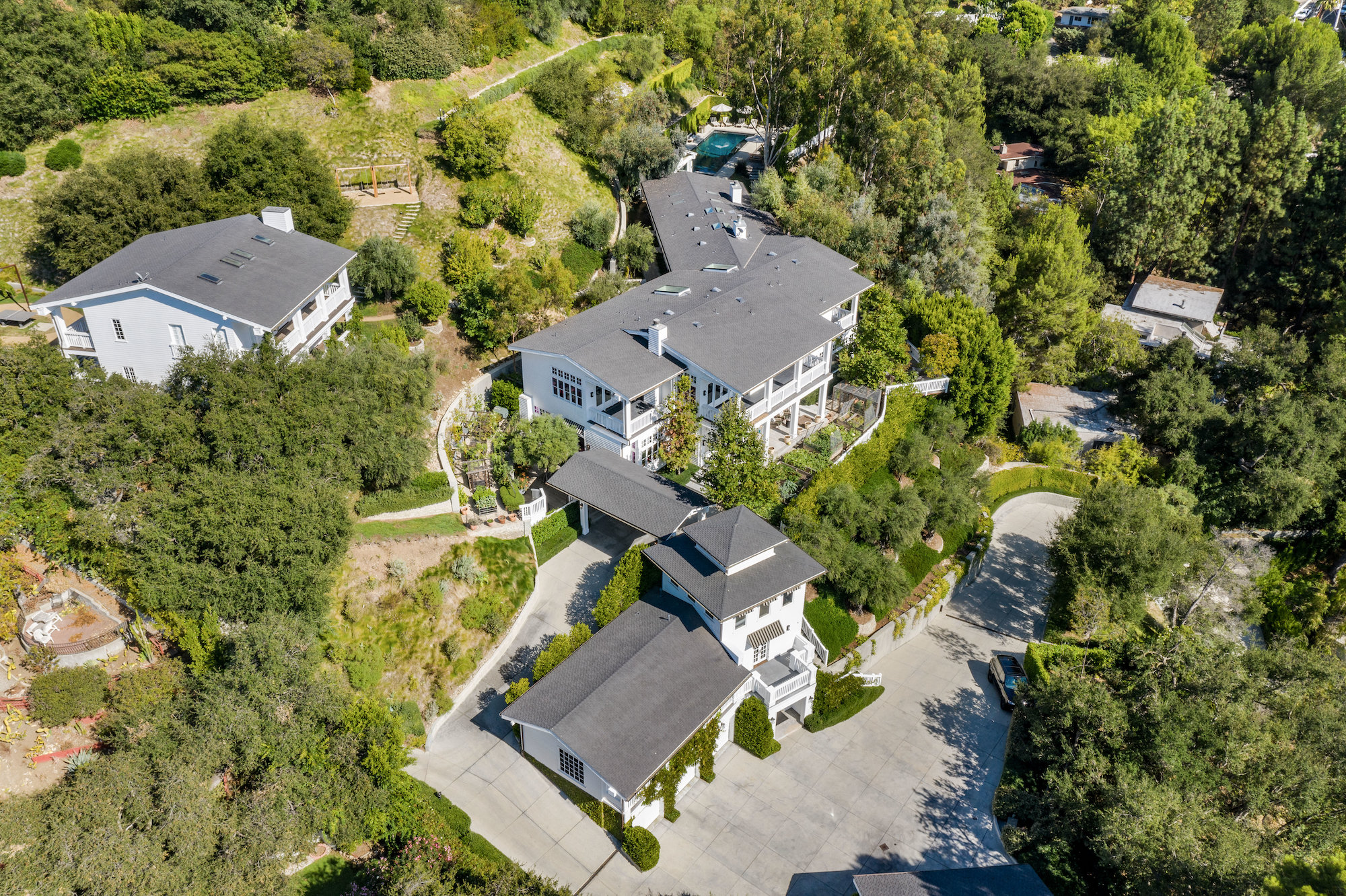 Set behind a beautiful private gate in one of the most sought-after, secluded streets in Beverly Hills sits this iconic compound that is nothing short of a masterpiece. Situated on 2.7 acres and showcasing incomparable grandeur, the gate opens to reveal an elongated driveway lined by tall, abundant greenery, providing the utmost privacy. Showcasing breathtaking mountain views in its entirety, the compound consists of 5 incredible structures, including a main residence, a two-story guest home that is currently used as two separate full recording studios, a five-car garage with elevator access to state of the art movie theater, a security office guest unit and the most incredible home gym and basketball court you will find in a single family residence. The cohesive structures are melded with premier craftsmanship and executed with the finest materials. The main residence features voluminous living spaces with soaring coffered ceilings, herringbone hardwood, a striking stone staircase, and floor to ceiling windows that provide an influx of natural light. The gourmet chef's kitchen includes two oversized islands, top-of-the-line appliances, and a one-of-a-kind wine cellar. Exuding luxury, the primary suite has vaulted beamed ceilings, a fireplace, extravagant dual baths with walk-in closets, and direct access to the backyard. Hosting a custom pergola with BBQ, large pool, spa, and lounge with fire pit, the backyard is an entertainer's dream. Nothing less than perfection, this compound is complete with 4 en-suite bedrooms, 10 bedrooms and 12 bathrooms in total, a full bar, exposed brick, skylights, multiple gardens, and a solar dome. 9779 Oak Pass Rd is truly in a league of its own.