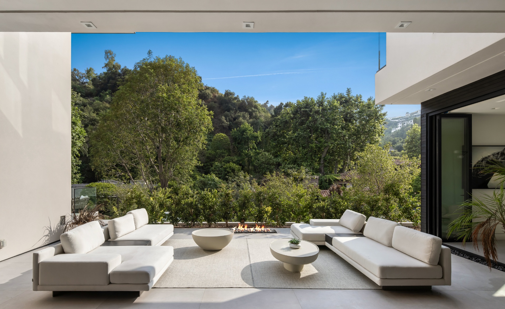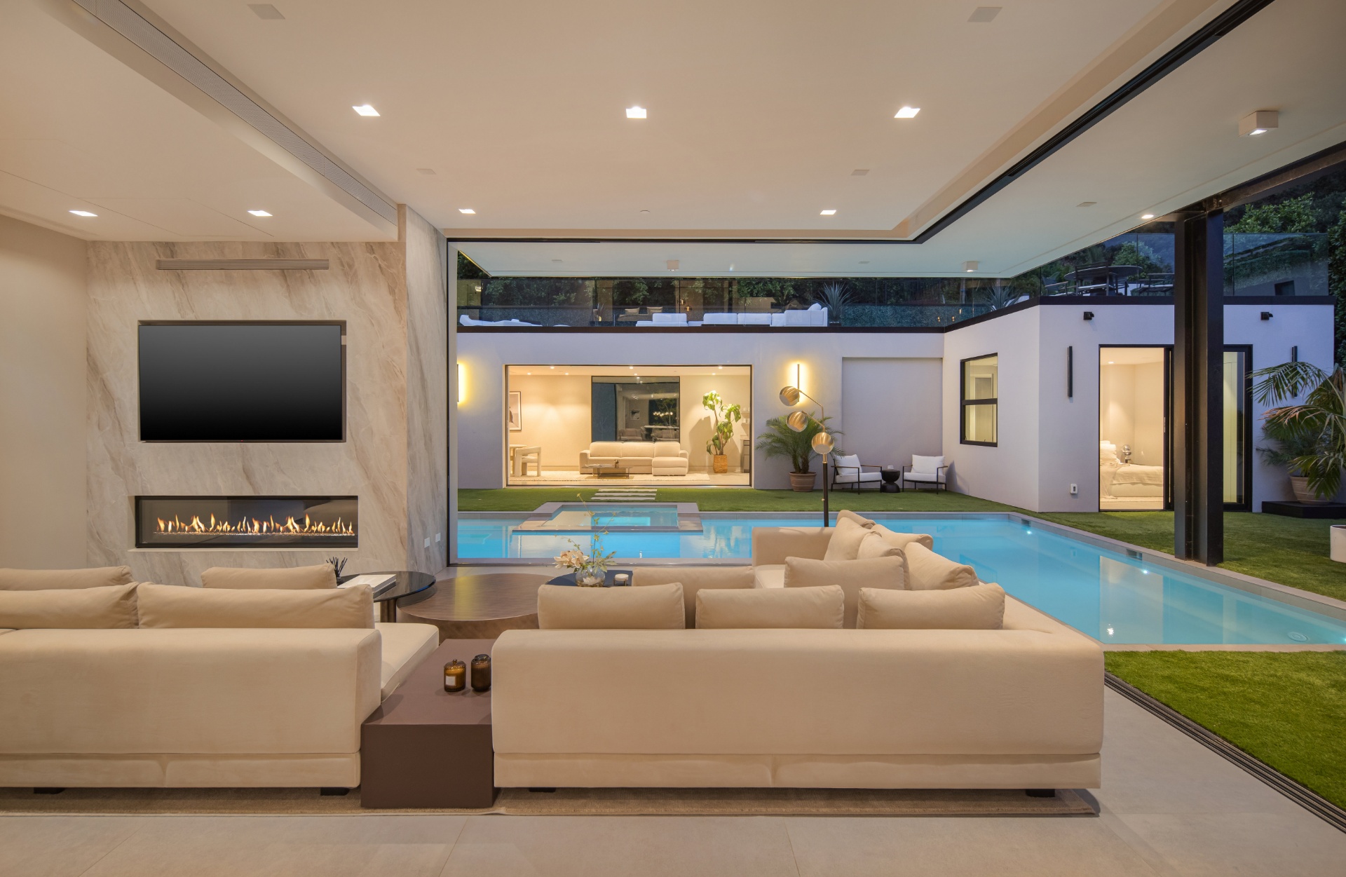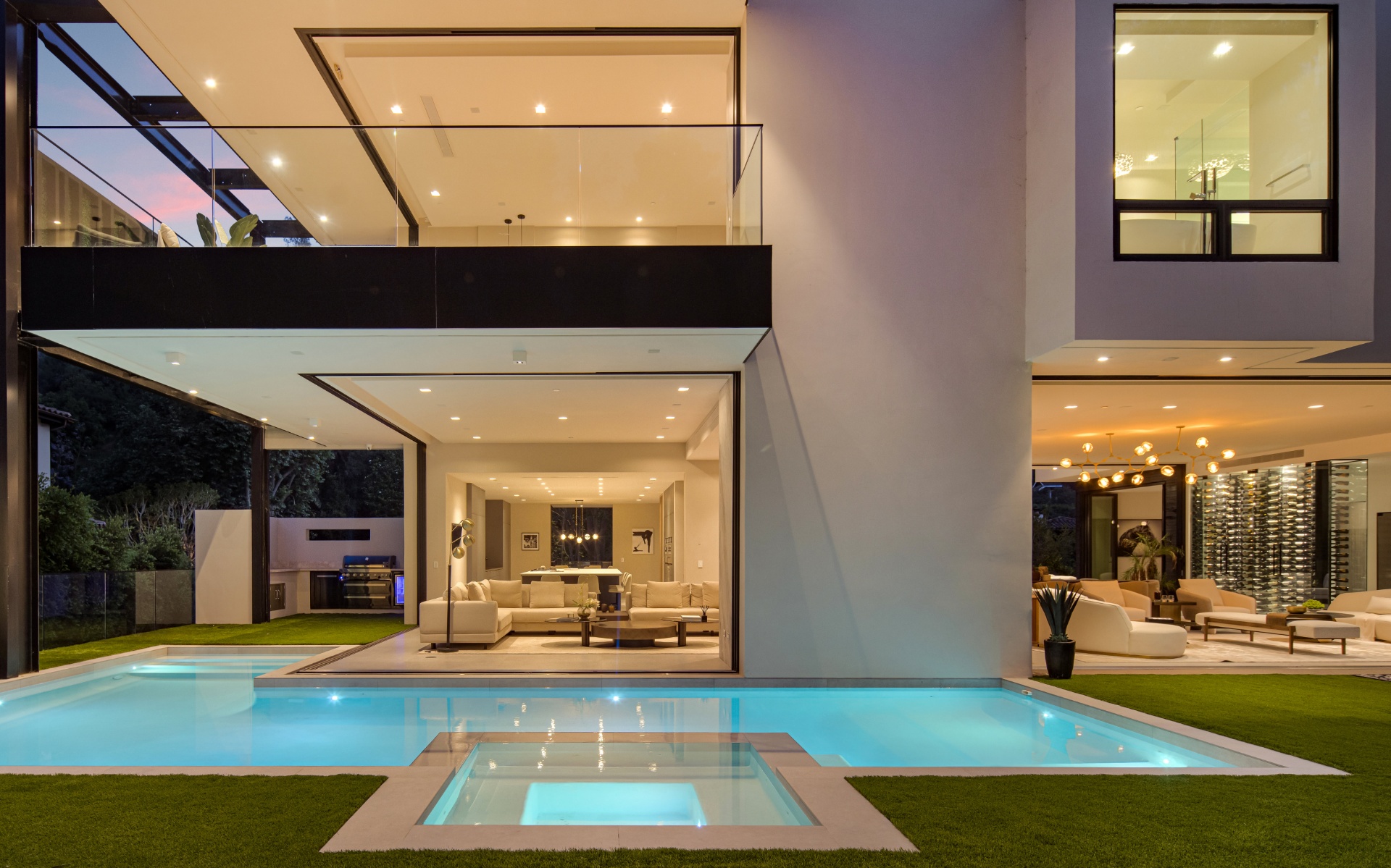 Welcome to 982 Stone Canyon Road, a distinguished modern masterpiece ideally located within moments of the world-renowned Hotel Bel Air. Nestled on a large corner lot, this estate boasts stunning canyon views and offers complete privacy within its fully gated grounds, complemented by parking for 14 cars. The grand glass entry welcomes you to an entertainer's dream. The open floor plan is flooded with natural light and offers a seamless transition to the outdoor living spaces, which include a pool, spa, large lawn, and multiple seating areas. The main level features a grand open floor plan with an indoor/outdoor living and dining room. Adjacent, you'll find a tranquil office that opens up to allow you to enjoy the canyon. Additionally, there is a stunning minimalist kitchen where an oversized island takes center stage, offering a sleek, modern design with top-of-the-line Gaggenau appliances. Upstairs is a haven for relaxation with four bedrooms that offer ample sunlight and picturesque canyon views throughout the day. The spacious primary suite is a sanctuary unto itself, boasting a generously-sized private balcony, marble fireplace, and two oversized walk-in closets designed to accommodate even the most extensive wardrobes. The primary suite is complete with a spa-like bathroom that offers a steam shower, sauna, and canyon views. Three additional bedrooms, all en suite, are also located upstairs. Additionally, the main level has another bedroom which can function as a home gym. As you make your way to the ground level, you will find a very spacious bonus room that can serve as a live-in maid's quarters or a movie theater. The detached guest home features a kitchen, living room, a spacious bedroom, and a rooftop deck, providing flexibility and accommodations for guests or extended family. Additional features of the property include a three-level elevator, all motorized pocket sliding doors, and a Lutron lighting control system. Don't miss the opportunity to experience resort-style living in the heart of Bel Air! Designed by Melanie Marlo.