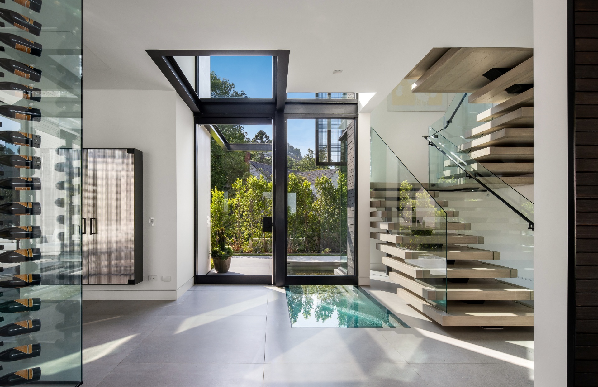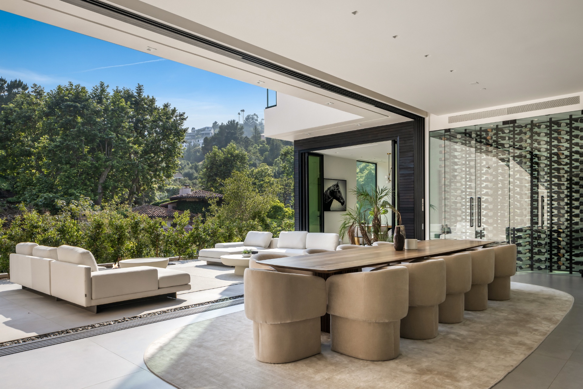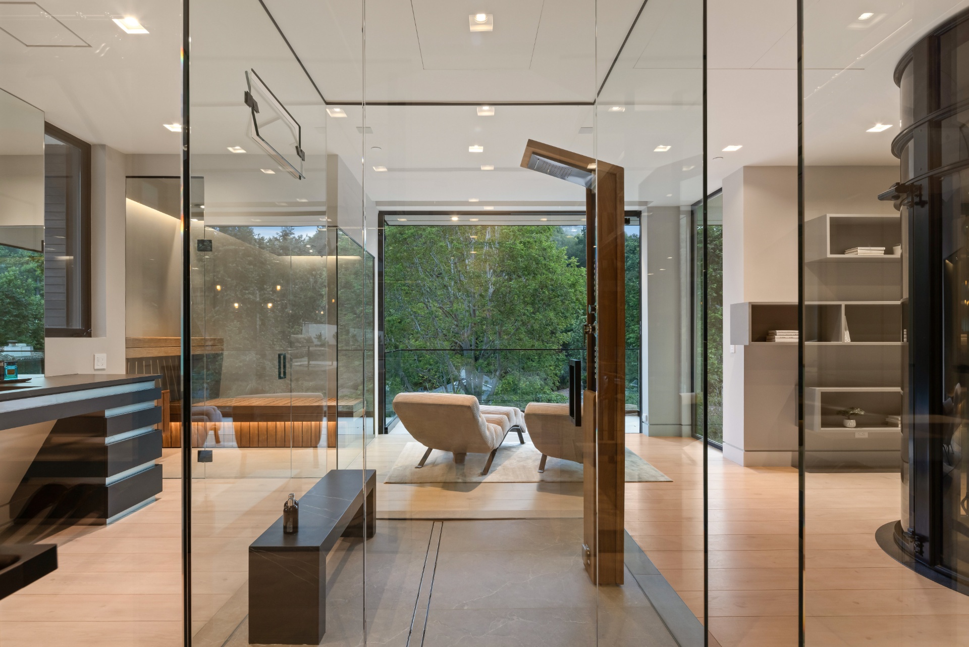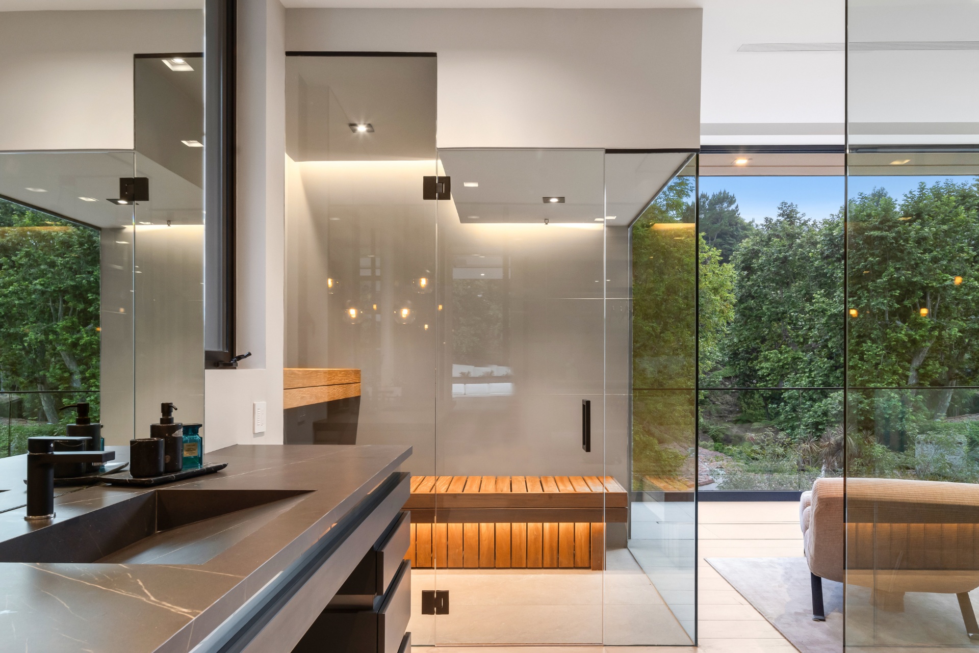 Welcome to 982 Stone Canyon Road, a distinguished modern masterpiece ideally located within moments of the world-renowned Hotel Bel Air. Nestled on a large corner lot, this estate boasts stunning canyon views and offers complete privacy within its fully gated grounds, complemented by parking for 14 cars. The grand glass entry welcomes you to an entertainer's dream. The open floor plan is flooded with natural light and offers a seamless transition to the outdoor living spaces, which include a pool, spa, large lawn, and multiple seating areas. The main level features a grand open floor plan with an indoor/outdoor living and dining room. Adjacent, you'll find a tranquil office that opens up to allow you to enjoy the canyon. Additionally, there is a stunning minimalist kitchen where an oversized island takes center stage, offering a sleek, modern design with top-of-the-line Gaggenau appliances. Upstairs is a haven for relaxation with four bedrooms that offer ample sunlight and picturesque canyon views throughout the day. The spacious primary suite is a sanctuary unto itself, boasting a generously-sized private balcony, marble fireplace, and two oversized walk-in closets designed to accommodate even the most extensive wardrobes. The primary suite is complete with a spa-like bathroom that offers a steam shower, sauna, and canyon views. Three additional bedrooms, all en suite, are also located upstairs. Additionally, the main level has another bedroom which can function as a home gym. As you make your way to the ground level, you will find a very spacious bonus room that can serve as a live-in maid's quarters or a movie theater. The detached guest home features a kitchen, living room, a spacious bedroom, and a rooftop deck, providing flexibility and accommodations for guests or extended family. Additional features of the property include a three-level elevator, all motorized pocket sliding doors, and a Lutron lighting control system. Don't miss the opportunity to experience resort-style living in the heart of Bel Air! Designed by Melanie Marlo.