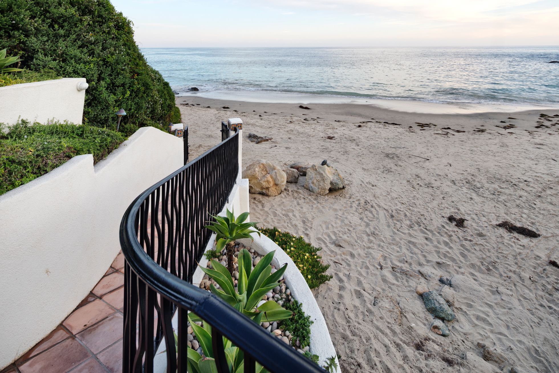 With uncompromising style and a rich history, this legendary oceanfront estate on the northern shore of Laguna Beach displays a thorough update while remaining true to its Early California Mission heritage. Postcard views overlooking Shaw's Cove stretch across the horizon to capture mesmerizing sunsets, breaking waves, the evening lights of Laguna Beach and the dramatic headlands of Dana Point. The multi-level residence, formerly home to one of Hollywood's leading actresses, is terraced down a bluff and offers direct access to the beach below, with numerous decks and balconies offering outdoor enjoyment above the sea, and a spacious front courtyard with mature tropical landscaping and stone decking for private entertaining. Tranquil interior spaces extend 4,041sf and feature a living room with fireplace and terrace access, a dining room with ornate custom ceiling, 4 bedrooms, 6 bathrooms, an office with a bay window and built-in cabinetry, and a top-level bonus room.