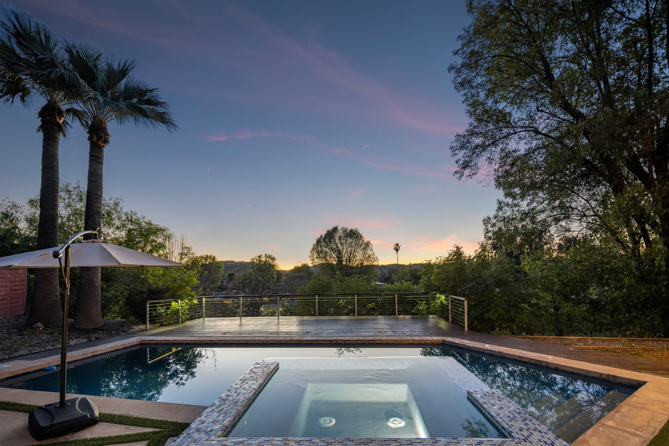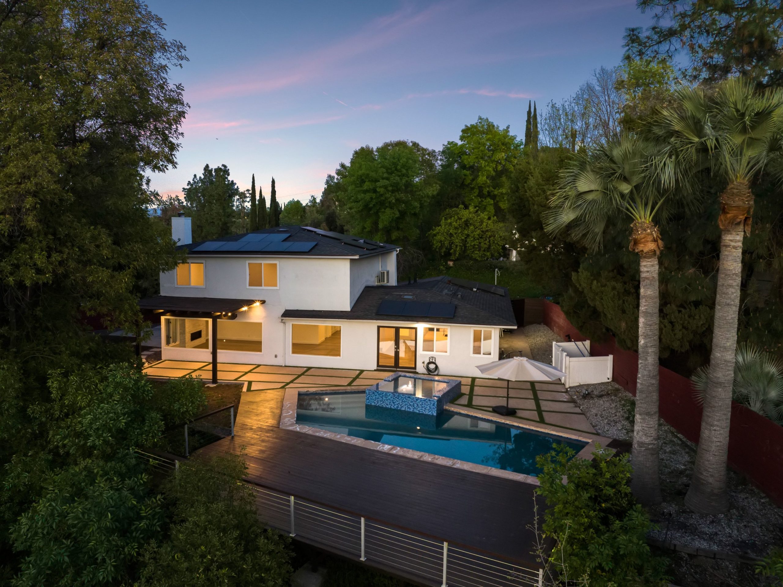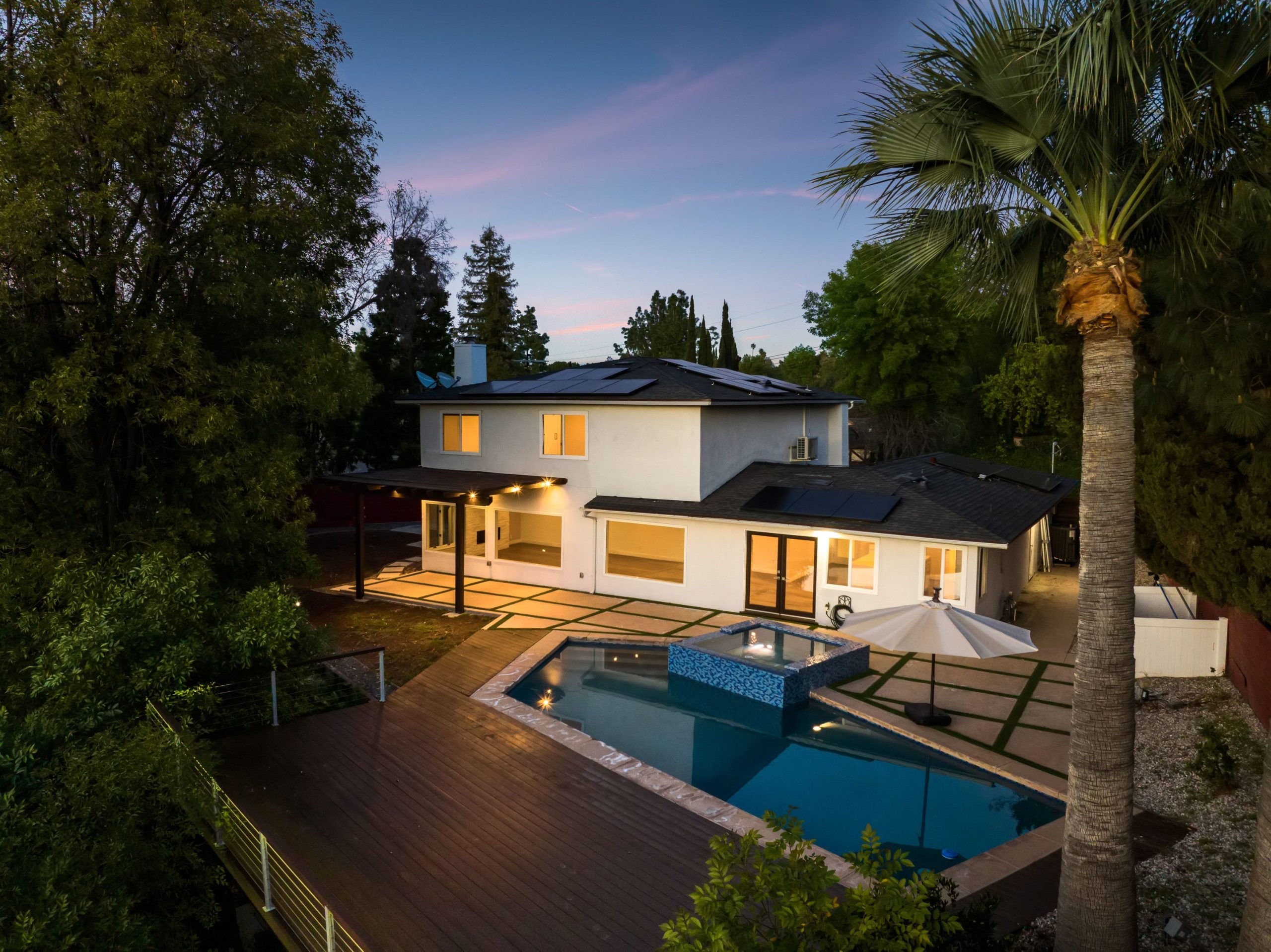 Nestled in the heart of Woodland Hills and located within the award-winning El Camino and Calabasas school districts, this modern two-story home offers 4 bedrooms, 4 bathrooms, and 2,748 square feet of thoughtfully designed living space on a quiet street. A grand double-door entry opens to wood flooring and a main-level en-suite bedroom, ideal for guests or a home office. The bright living and dining areas feature large picture windows overlooking the pool, creating a seamless indoor-outdoor feel. Upstairs, the spacious primary suite offers multiple walk-in closets, a double vanity, and abundant natural light, with two additional bedrooms providing flexibility. The upgraded backyard is an entertainer's retreat with a heated pool and spa, expansive deck space for lounging and dining, a grassy area, and a side yard basketball hoopperfect for enjoying the best of Southern California living. Energy-efficient upgrades include newly installed solar with minimal electricity costs, a newer AC system, and a 2-car garage equipped with a 220V EV charger, along with a full Vivint security system.