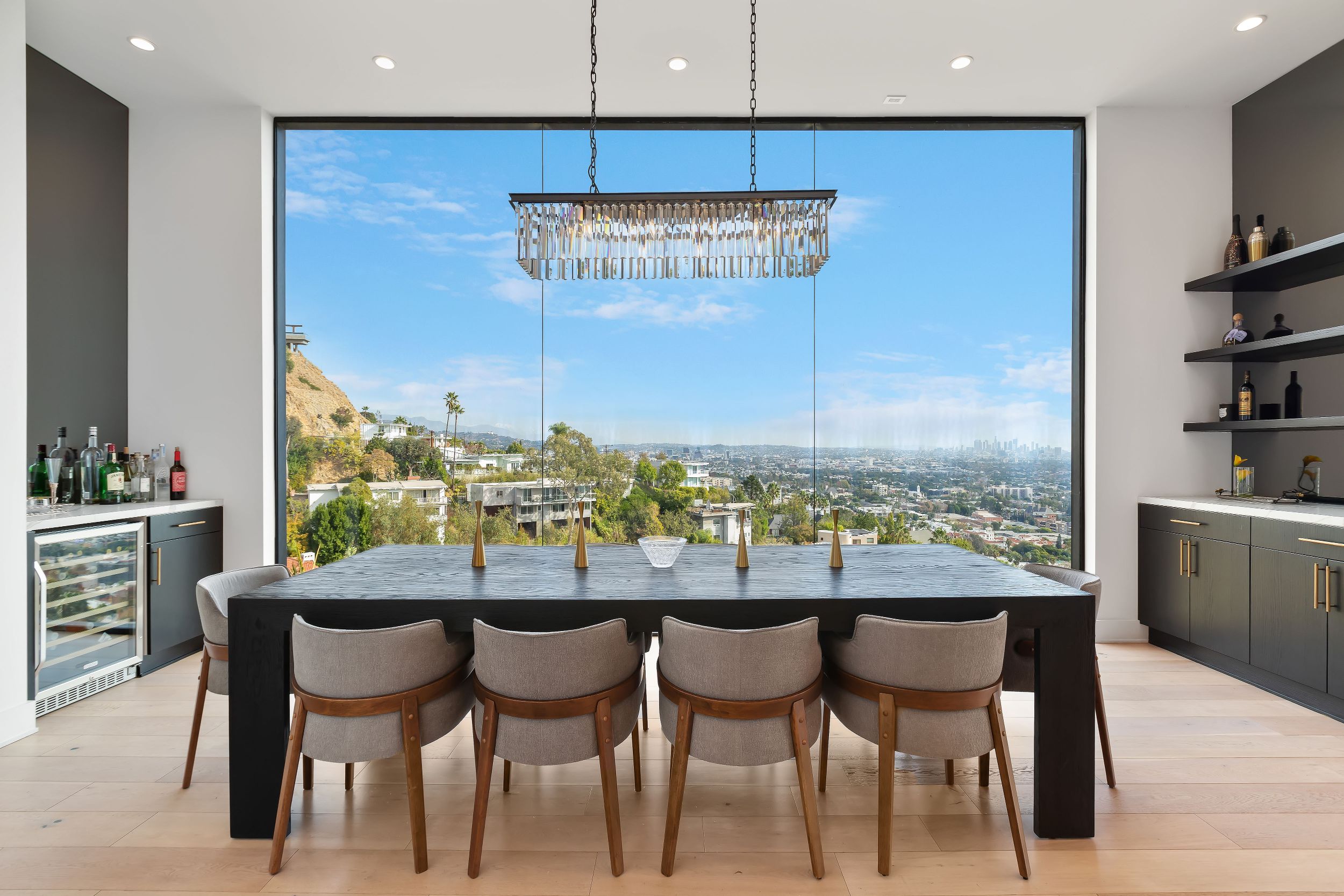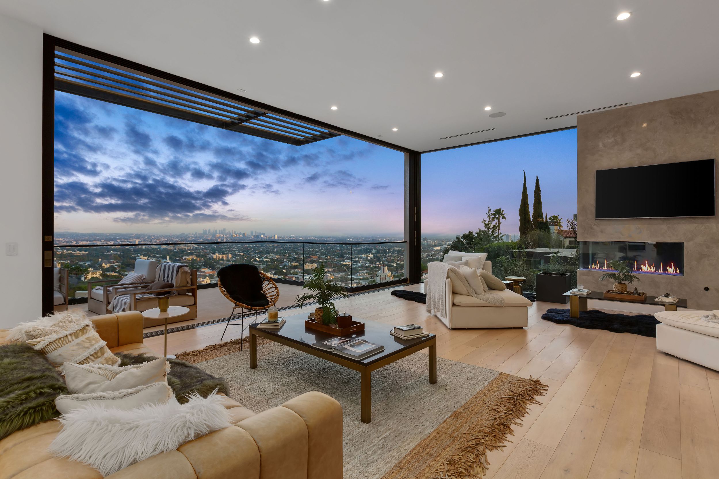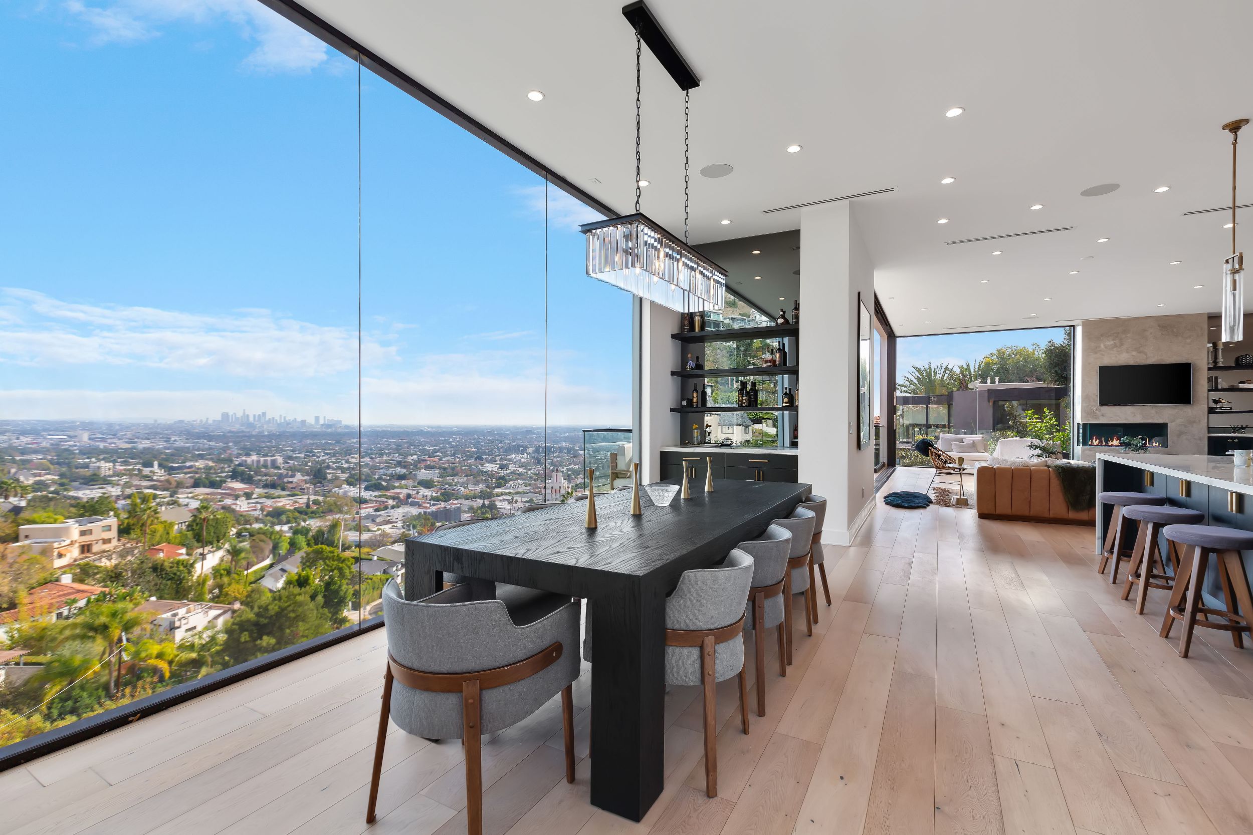 Set in the Hollywood Hills showcasing unmatched explosive jetliner views, 8428 Carlton Way is the pinnacle of luxury living. Featuring first class amenities and walls of glass that vanish throughout, the compound boasts 4 bedrooms, 6 bathrooms, a theater room, bonus room, temperature-controlled wine cellar and bar. The chefs kitchen outfitted with Calacatta Marble and top of the line appliances flows directly into the dining area set just before a wall of glass framing the Los Angeles skyline. The large master retreat with breathtaking views from every vantage point is comprised of a private balcony, fireplace, walk in closet and spa like bathroom. Hosting a dramatic infinity edge pool, spa, fire pit and lounge space, the lower level serves as both an entertainers paradise and a private oasis. Offering opulence, security and convenience, this home is a true trophy.