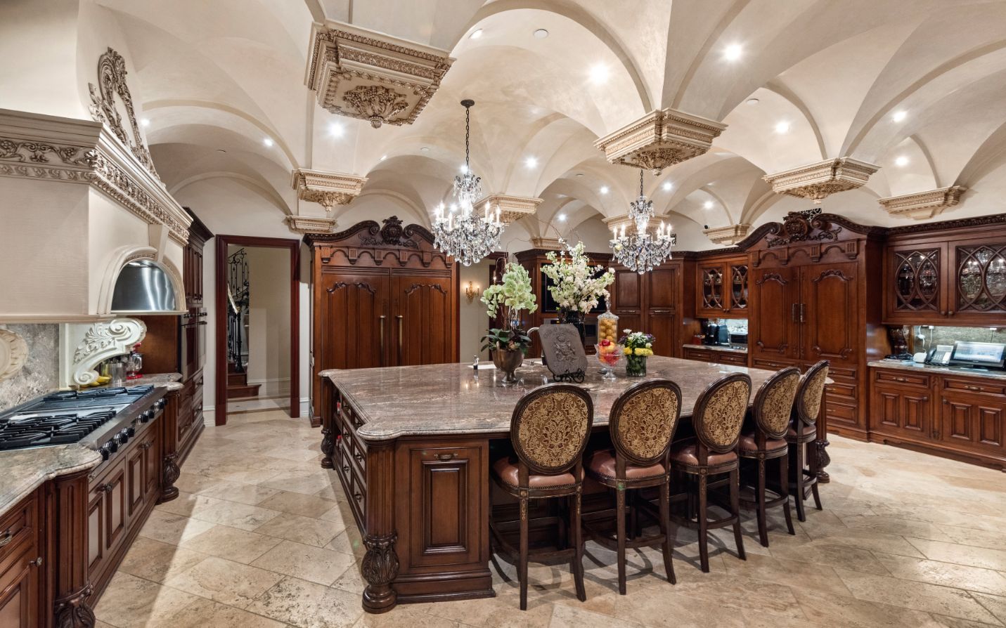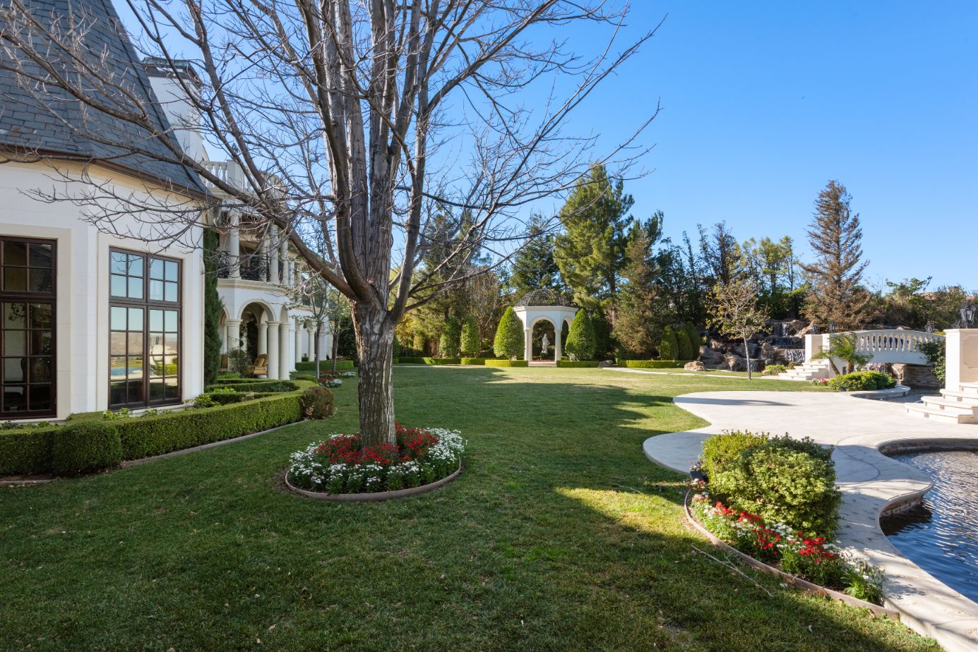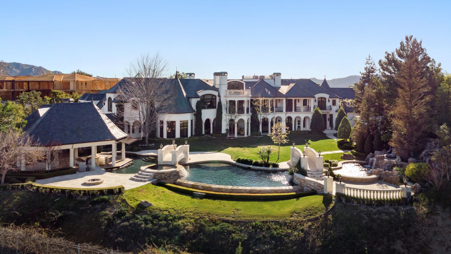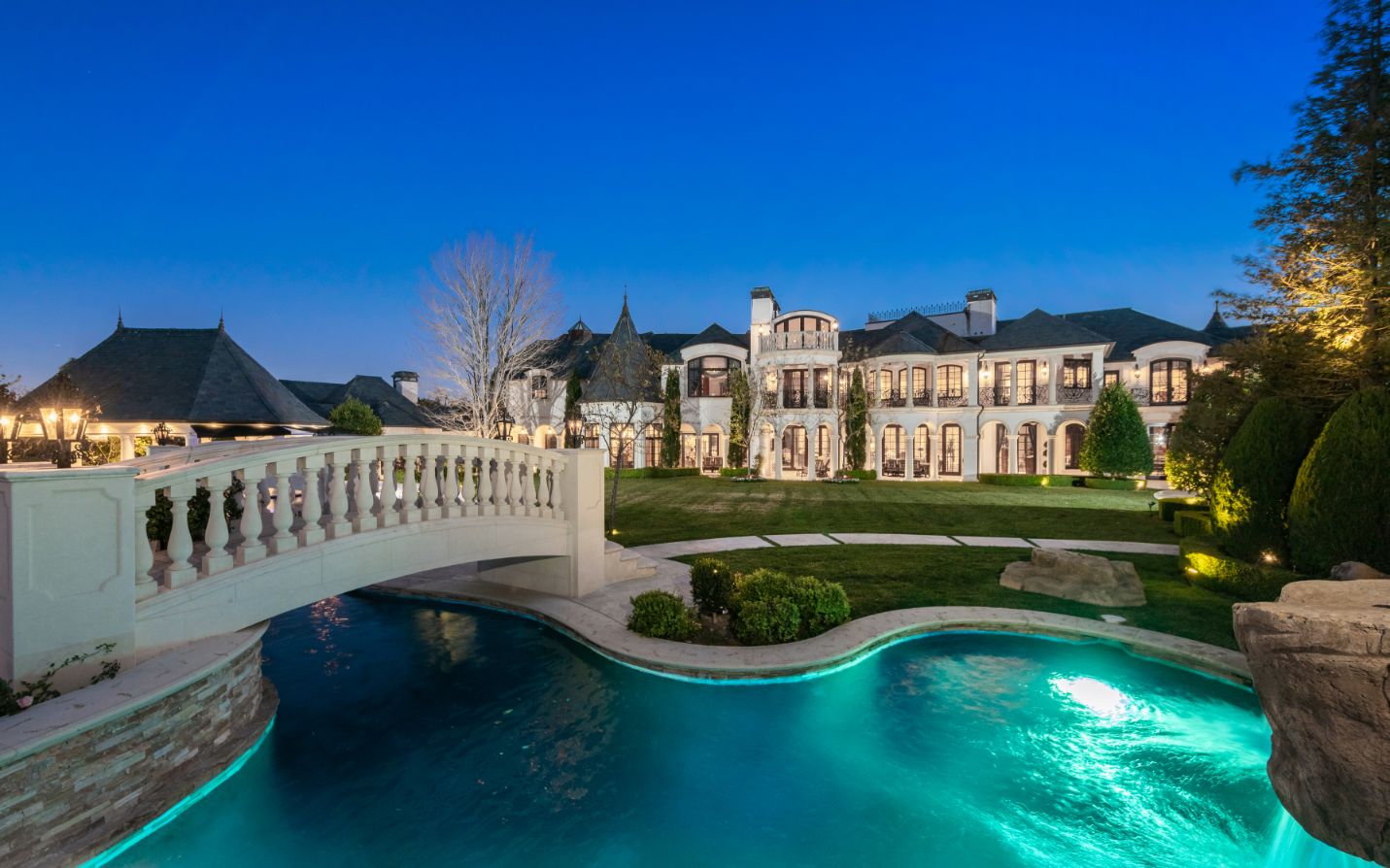 string(1556) "Introducing a world-class French Chateau showcasing the epitome of luxury living boasting ~17,000 square feet of architectural flourishes. Enter through the massive front doors into the dramatic 2-story foyer with a dome ceiling, breathtaking chandelier, stone floors, and a floating double staircase. Offering an unmatched living experience, the Chateau features 7 bedrooms, 10 bathrooms, several beautiful living rooms, formal and informal dining rooms a temperature-controlled wine room, theatre, wet bar, library, office, gym, game room, massage room, loft, and an elevator. A Groin Vault Ceiling and stone floors encapsulate the chef's kitchen outfitted with top-of-the-line stainless steel appliances and a large stone island. Distinguished features include exquisite hand-built French Chandeliers, soaring ceilings, hand-carved fireplaces, custom woodwork, limestone floors, solid mahogany doors and surround sound. The Master Suite is complete with a fireplace, sitting room, two massive walk-in closets, a steam shower, sauna, and two balconies showcasing views of the immaculate grounds and beyond. Breathtaking gardens with fruit trees and rose bushes surround the guest house, massive 110' Pebble Tec infinity-edge pool and spa with several water features, two bridges, fountain, patio areas with space heaters, fire pit, wood-burning fireplace, and a BBQ pavilion. Fully secured and operated by Crestron and Lutron Smart Systems, the home elevates the art of living and entertaining. Set behind gates, the property has garage space for 6 cars."